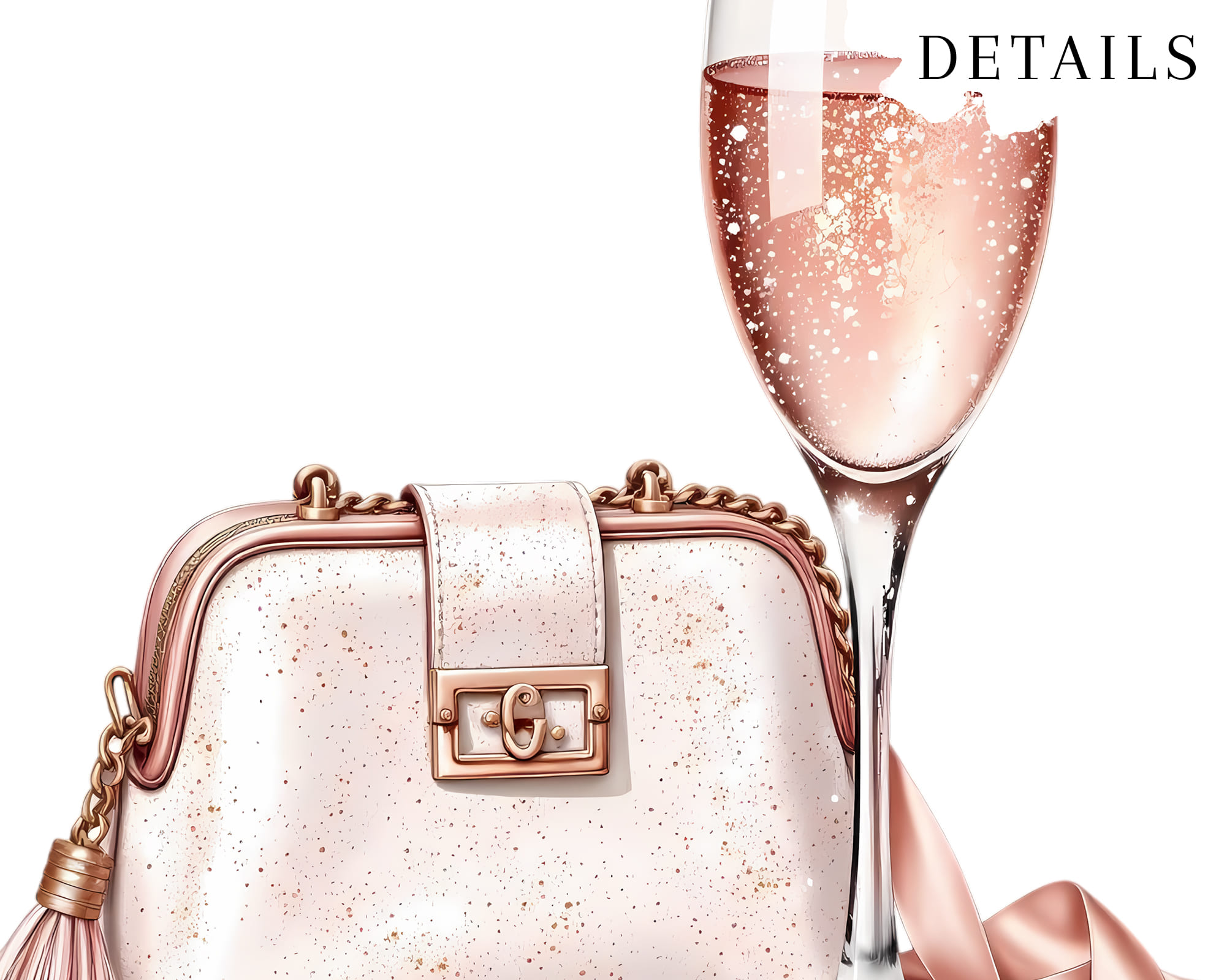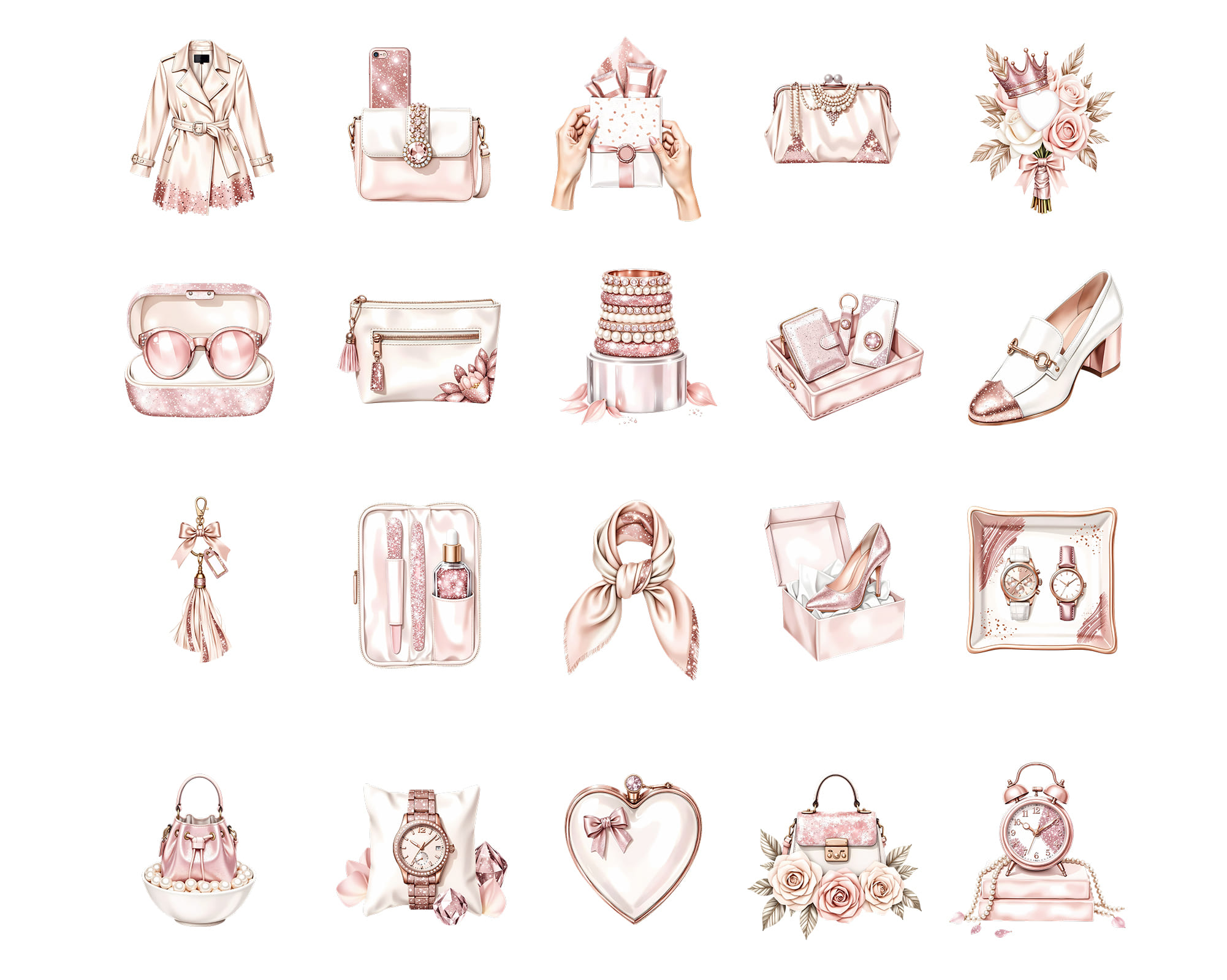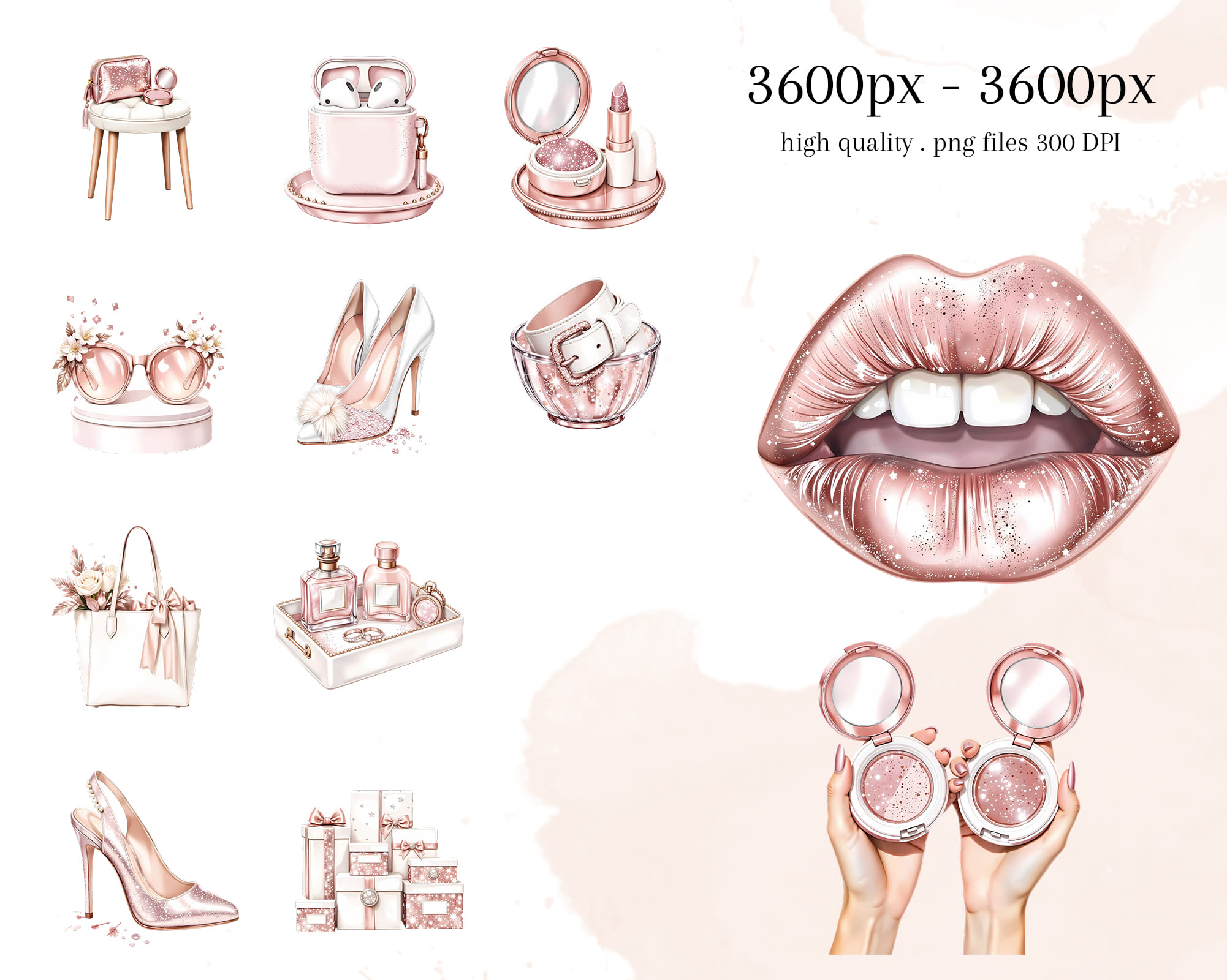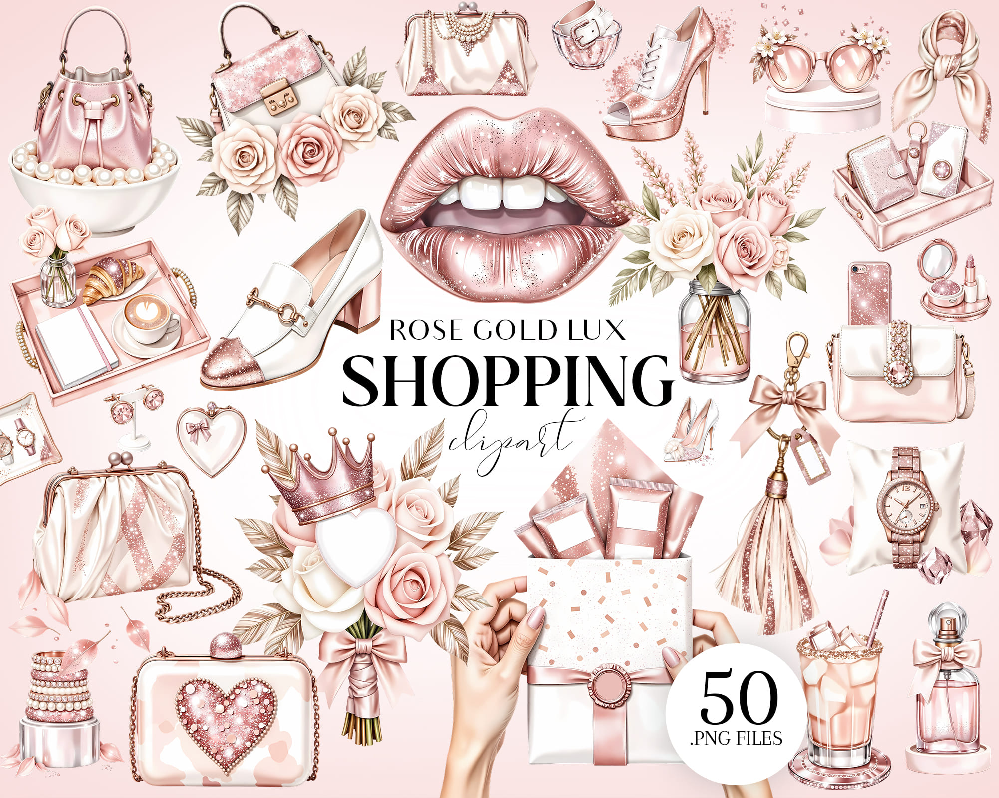 Add a touch of elegance to your creative projects with this Rose Gold Luxury Shopping Clipart Set. A shimmering collection of high-fashion watercolor elements — handbags, perfume, makeup, heels, champagne, and chic accessories — all in soft rose gold tones.