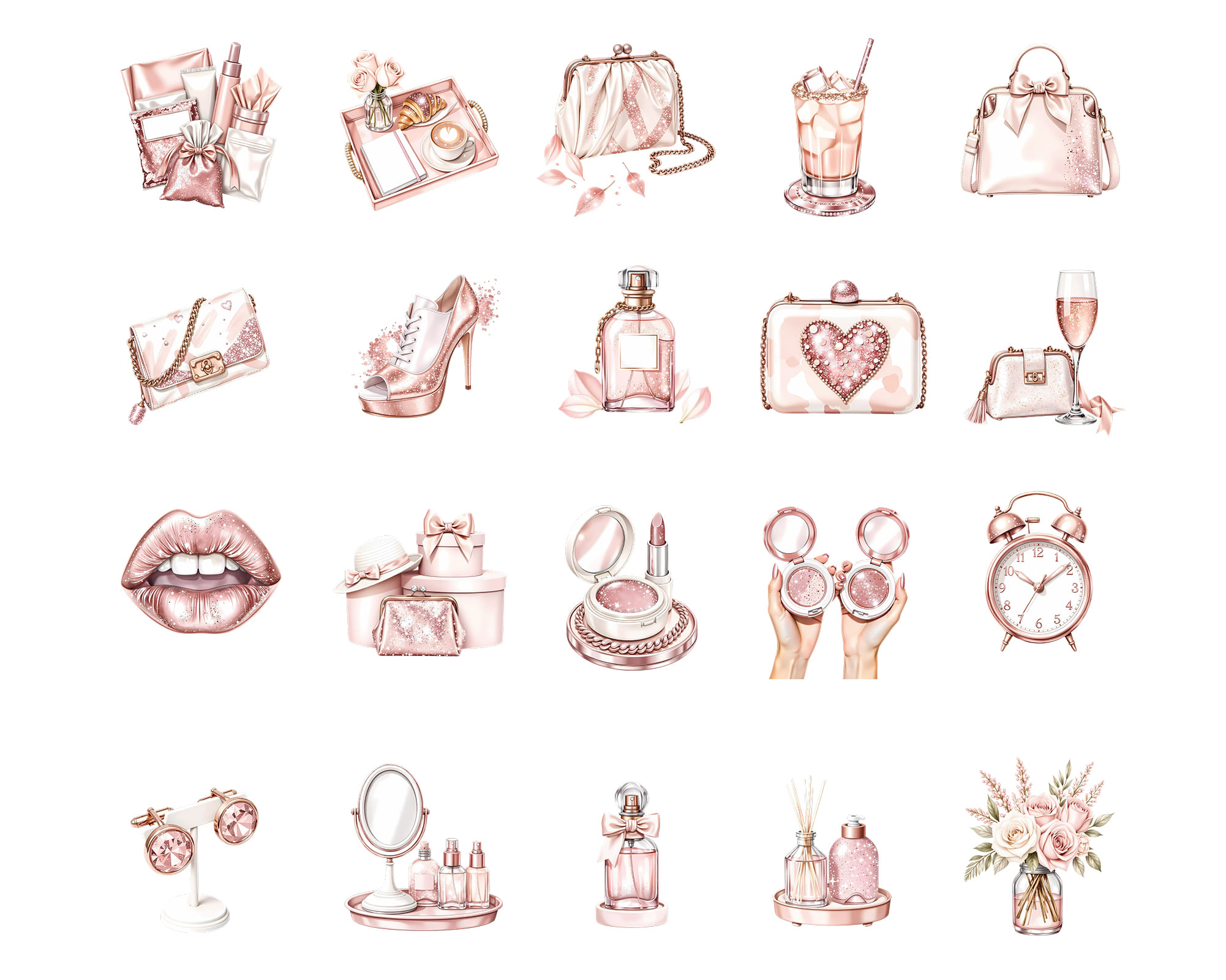 Elements: handbags, shoes, perfume, lips, drinks, clock, heart purse, and beauty essentials