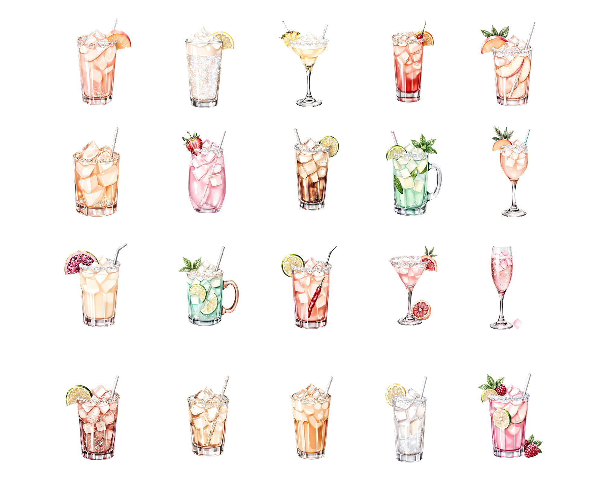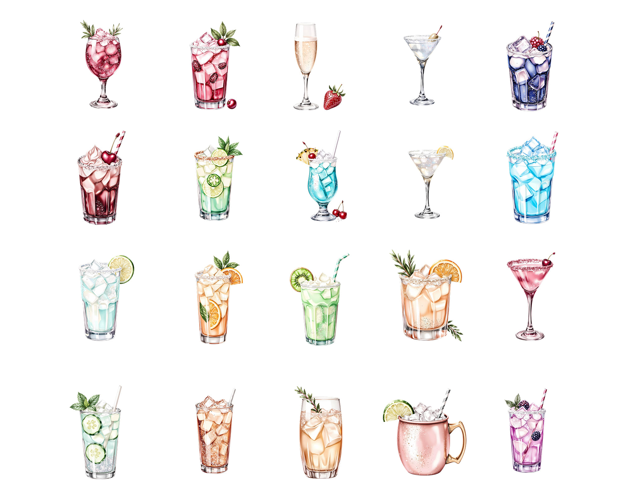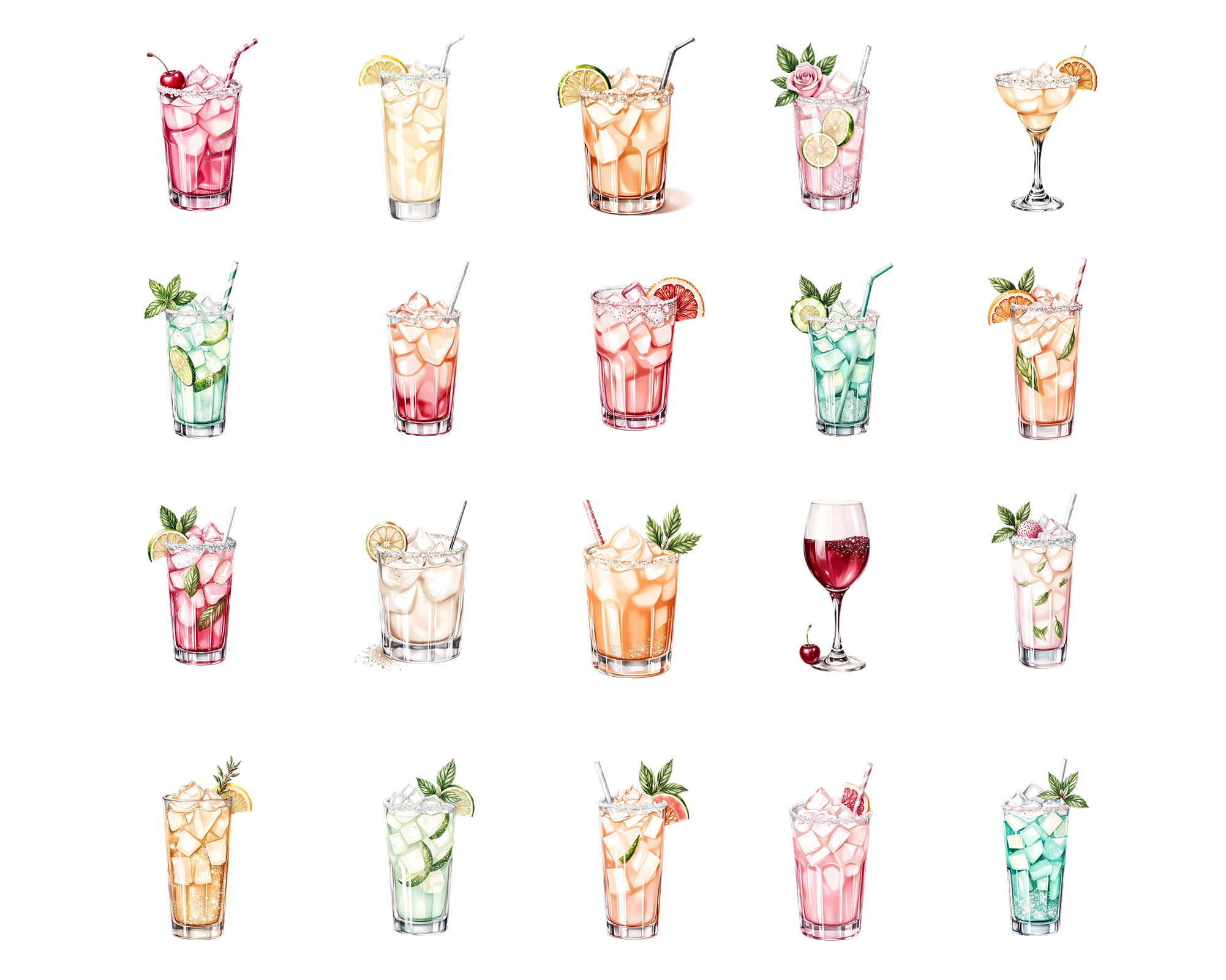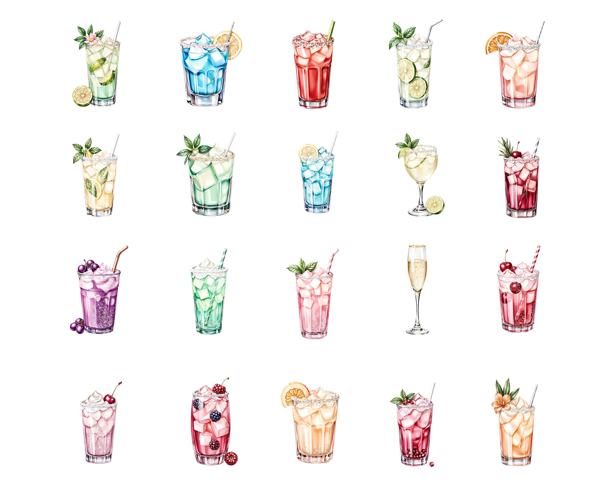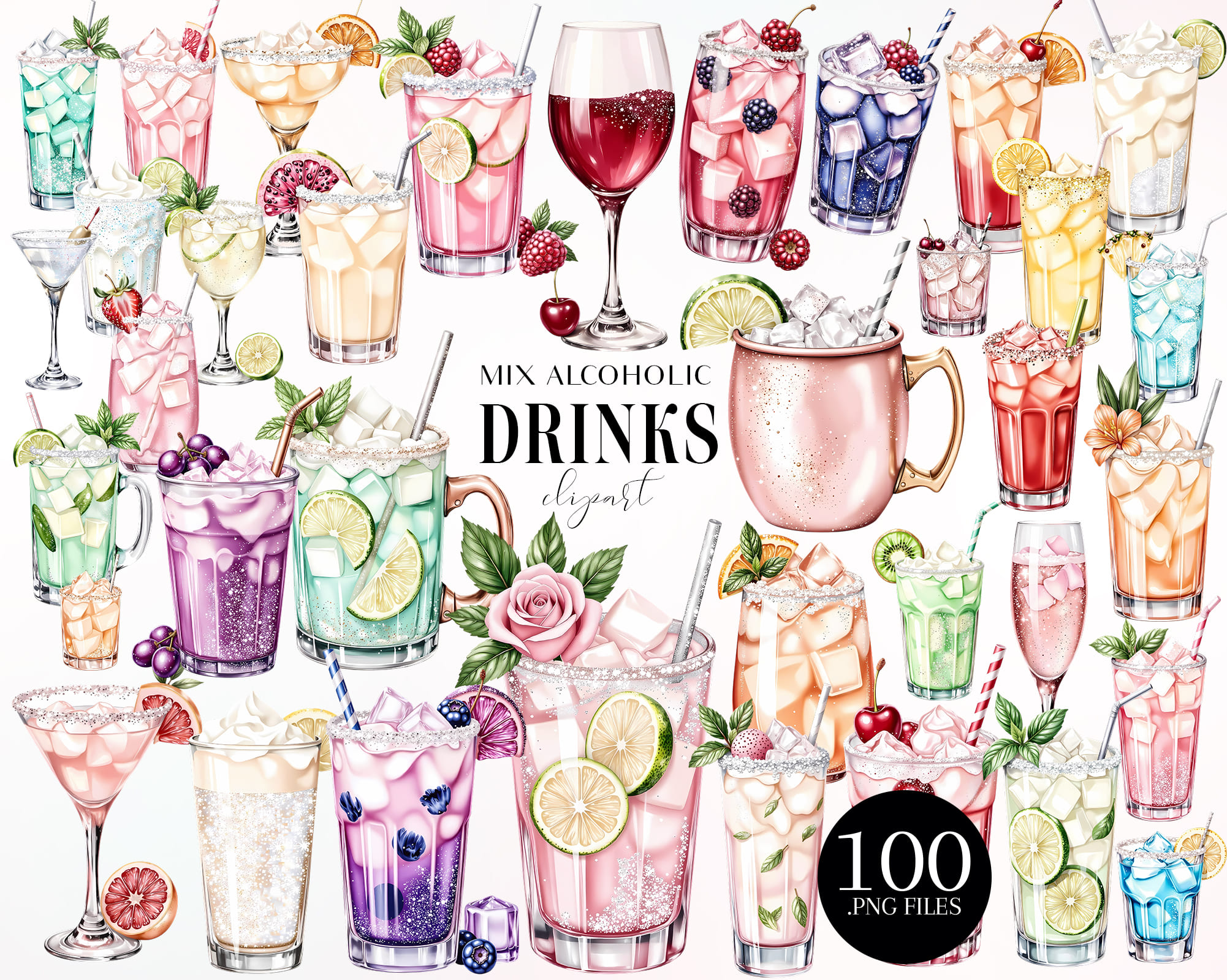 A versatile set of 100 PNG alcoholic drinks including cocktails, iced beverages, fruity mixes, mojito-style drinks, tall glasses, berry drinks, citrus accents, and sparkling textures. Ideal for restaurants, bars, branding, recipe cards, sticker sets, and digital planners.
