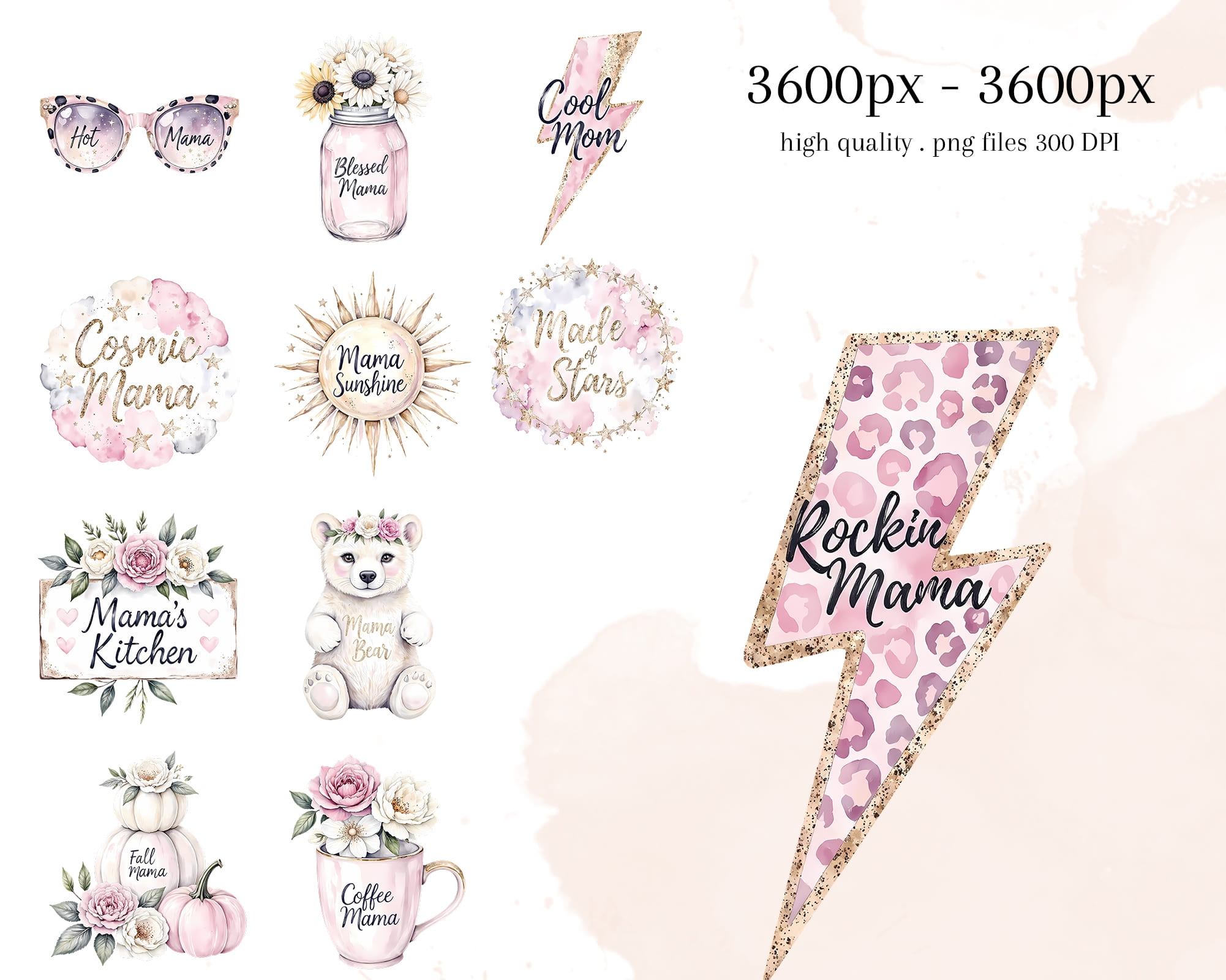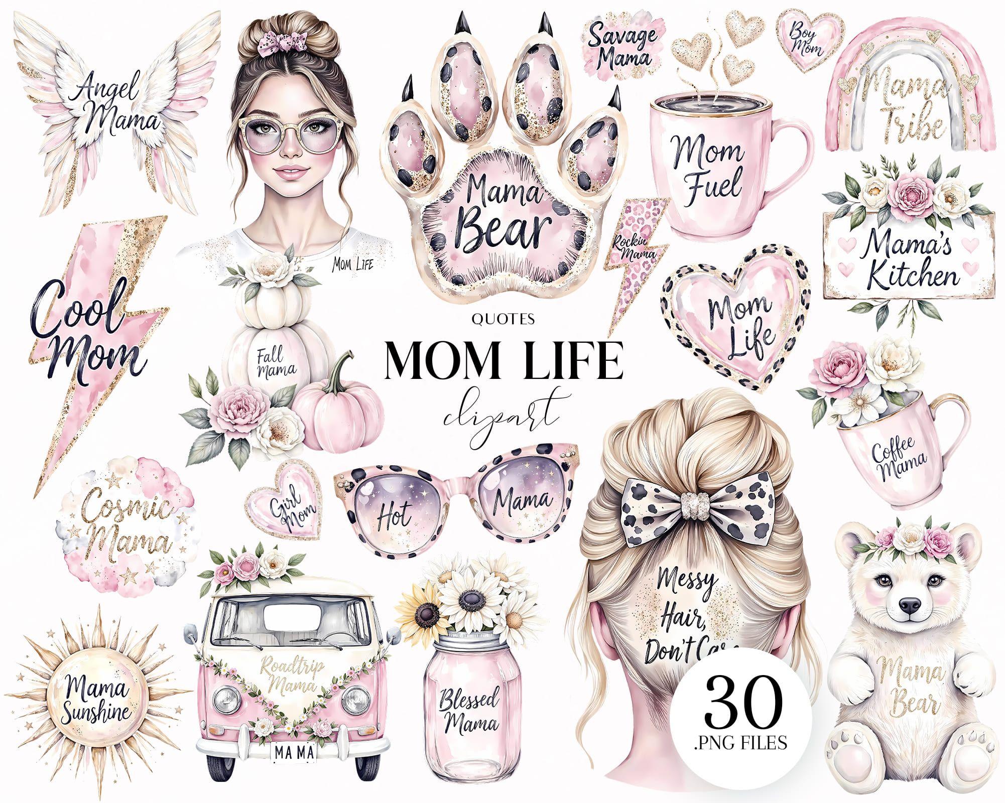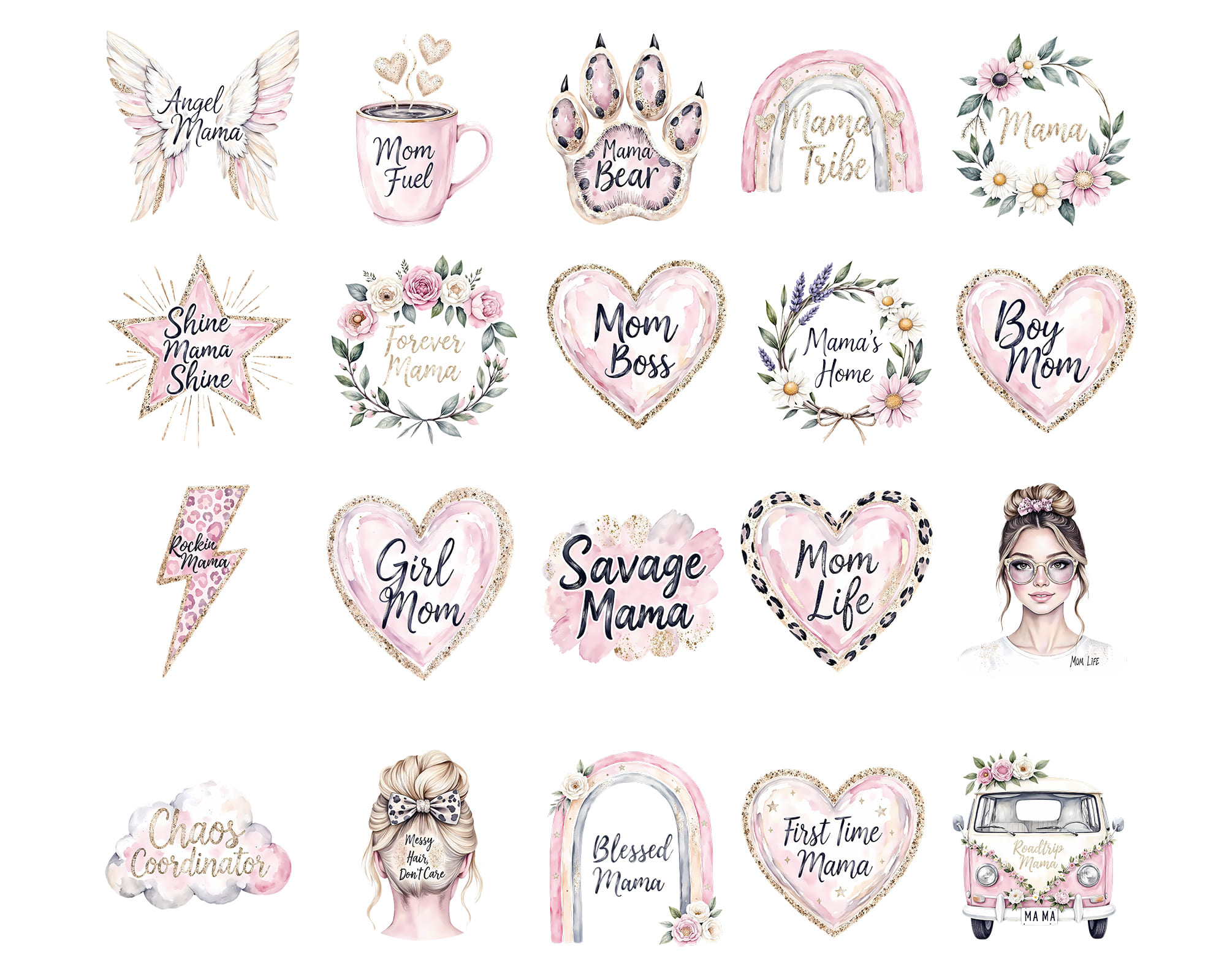 Celebrate motherhood with this pastel Mom Life clipart set! Includes mama bear paw, rainbow, coffee mugs, floral frames, quotes like Mom Boss and Forever Mama. Perfect for Mother’s Day cards, planners, sublimation, scrapbooking, and gifts. Includes 30 PNG files with transparent backgrounds.