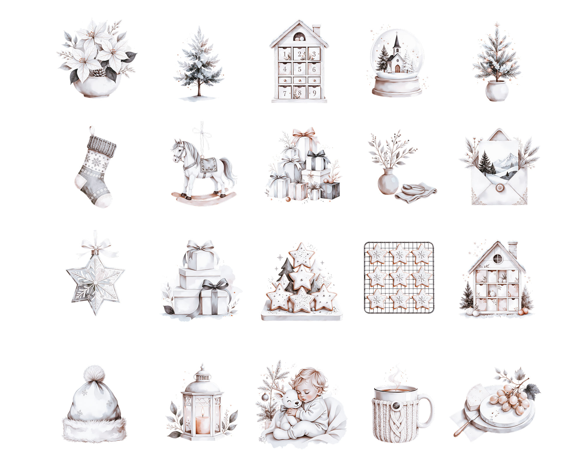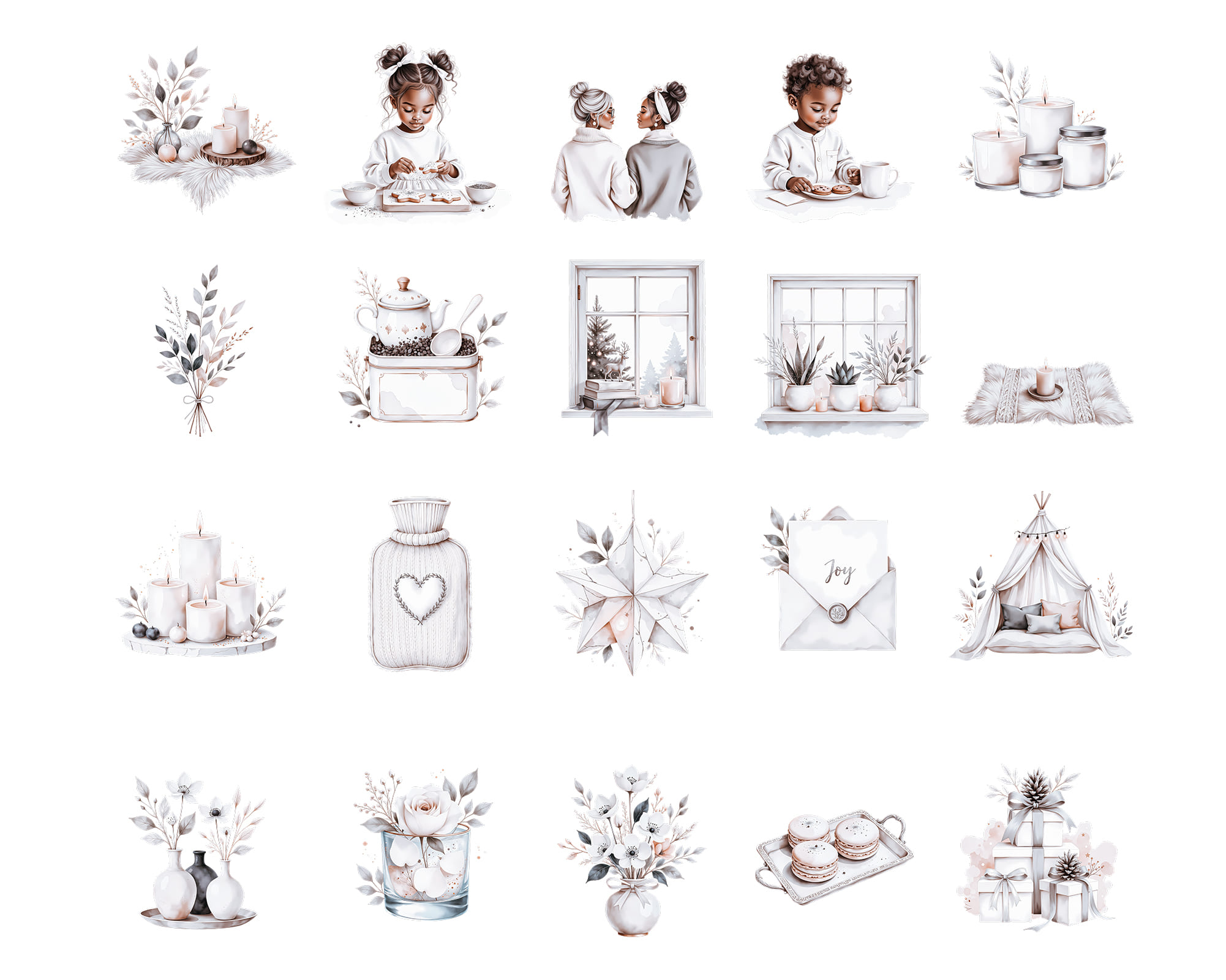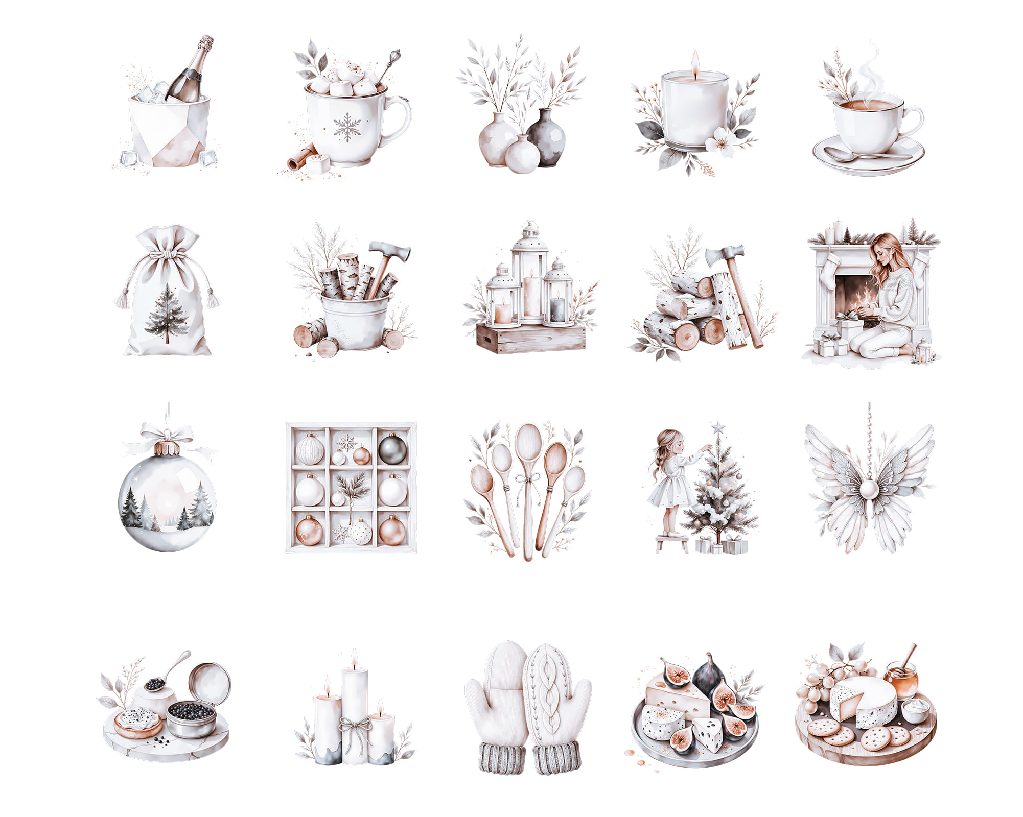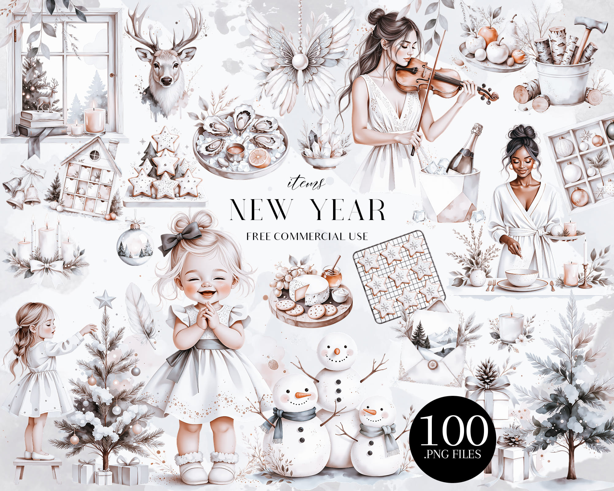 A warm New Year clipart collection featuring 100 PNG illustrations with cozy winter details. This set includes kids, snowmen, candles, cookies, stars, trees, window scenes, deer, champagne, wreaths, bowls, trays and festive home decor perfect for seasonal designs. Ideal for cards, planners, invitations, scrapbooking, recipe cards, wall art and printable decor. All graphics come as high-quality transparent PNG files.