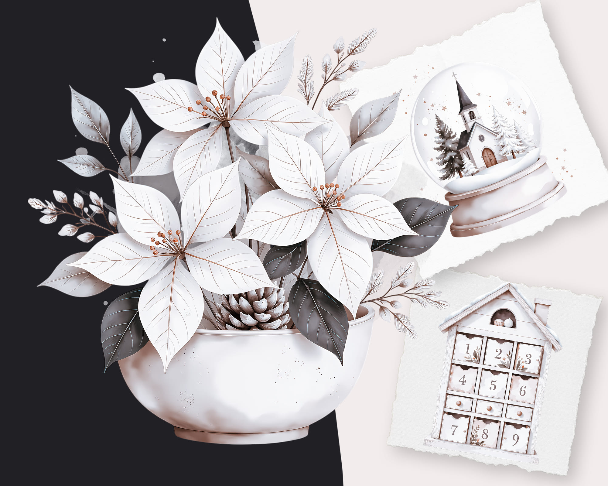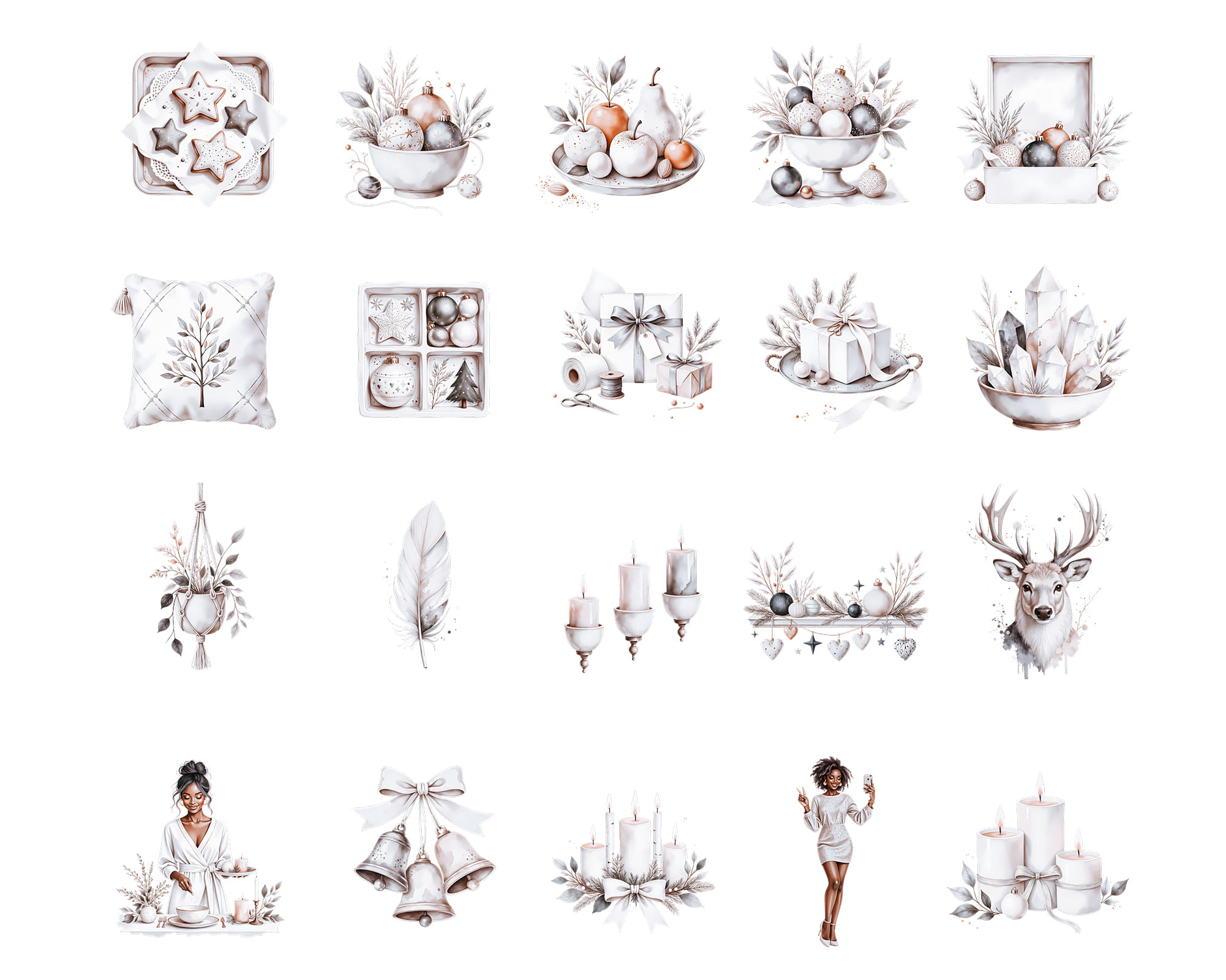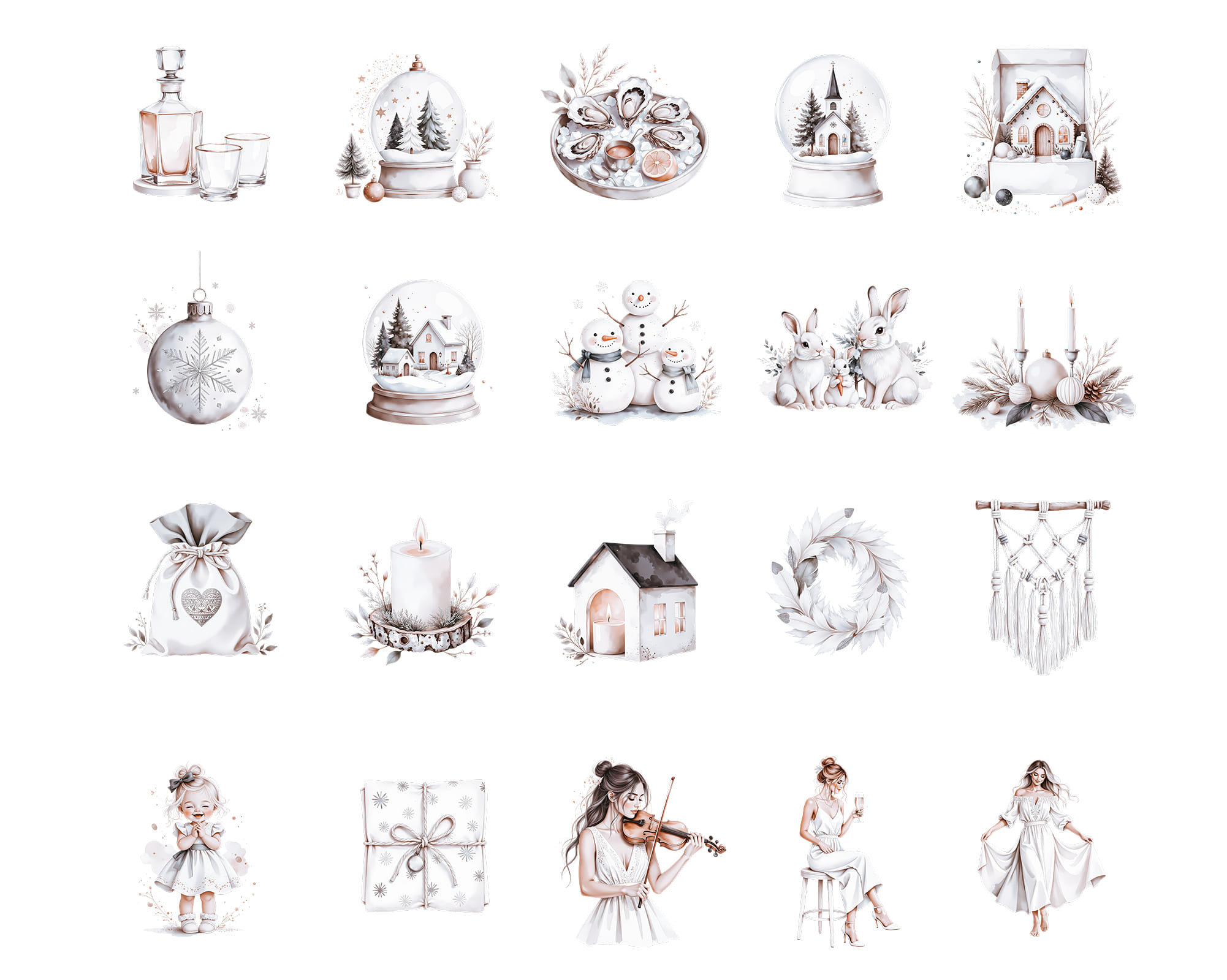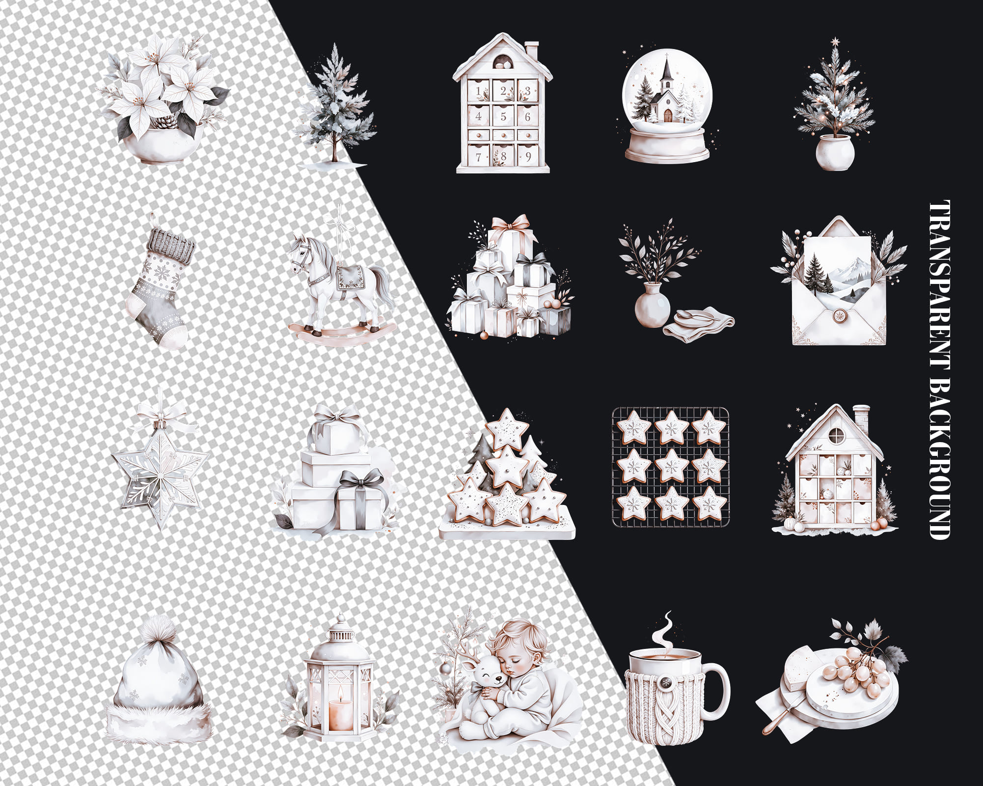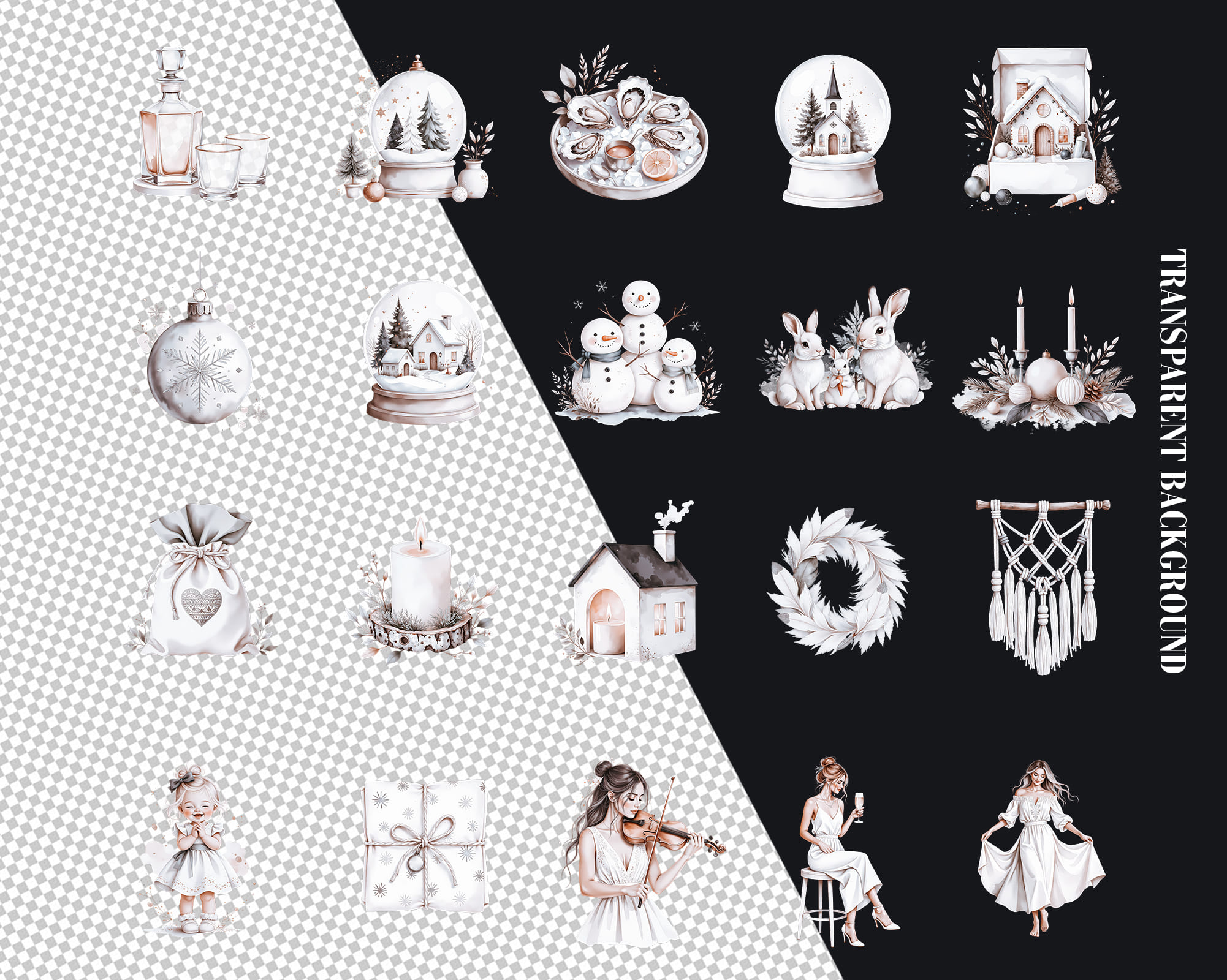 A warm New Year clipart collection featuring 100 PNG illustrations with cozy winter details. This set includes kids, snowmen, candles, cookies, stars, trees, window scenes, deer, champagne, wreaths, bowls, trays and festive home decor perfect for seasonal designs. Ideal for cards, planners, invitations, scrapbooking, recipe cards, wall art and printable decor. All graphics come as high-quality transparent PNG files.