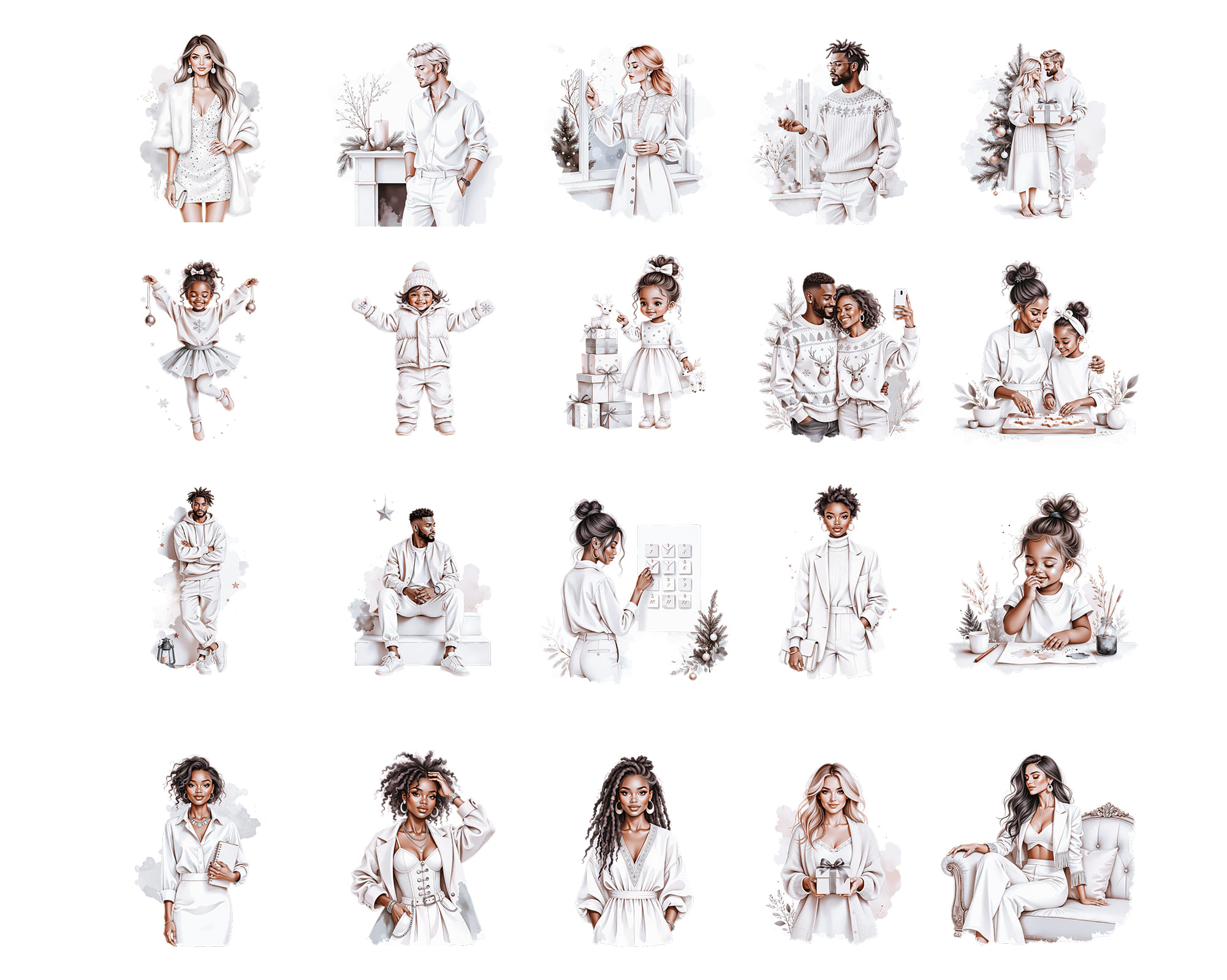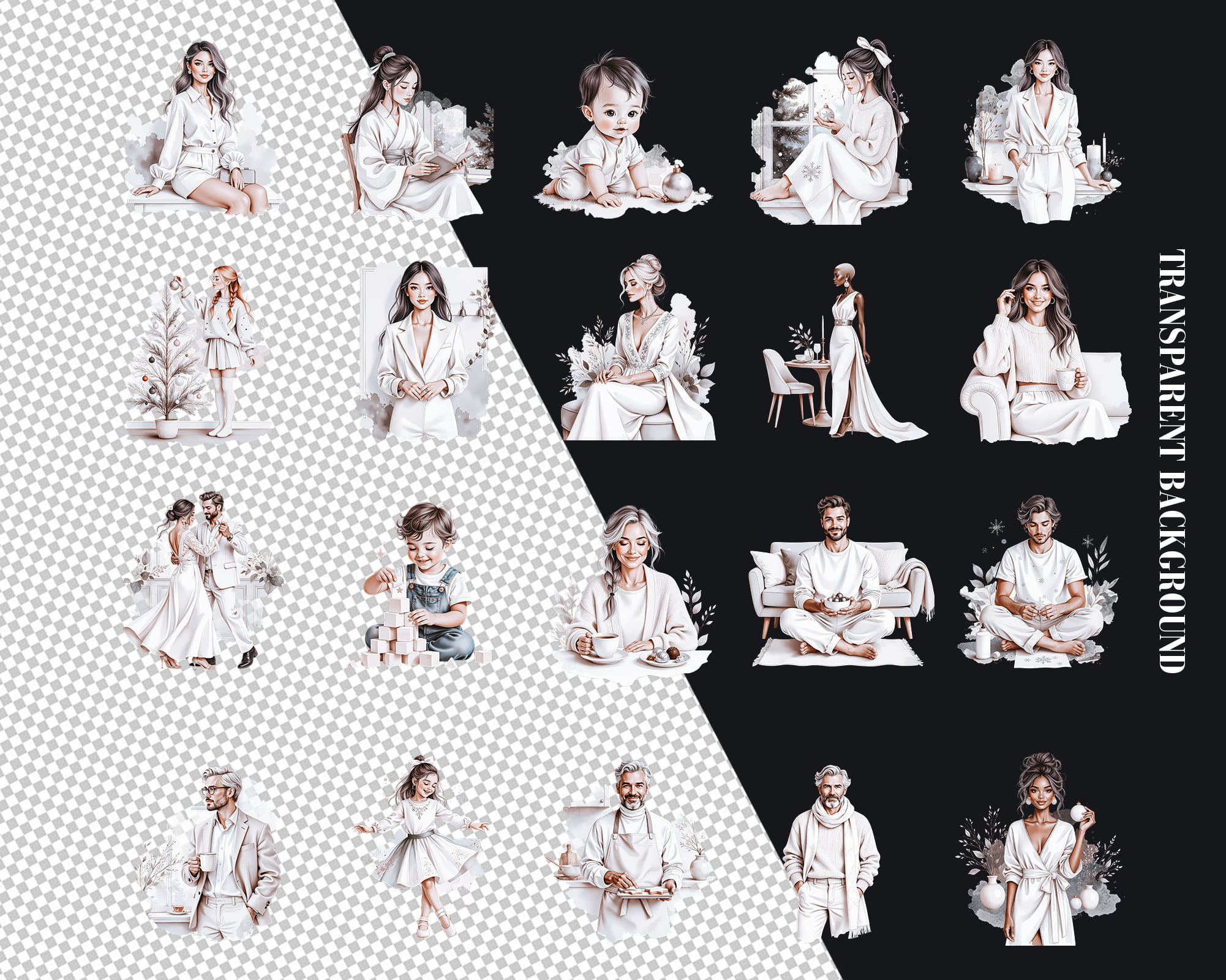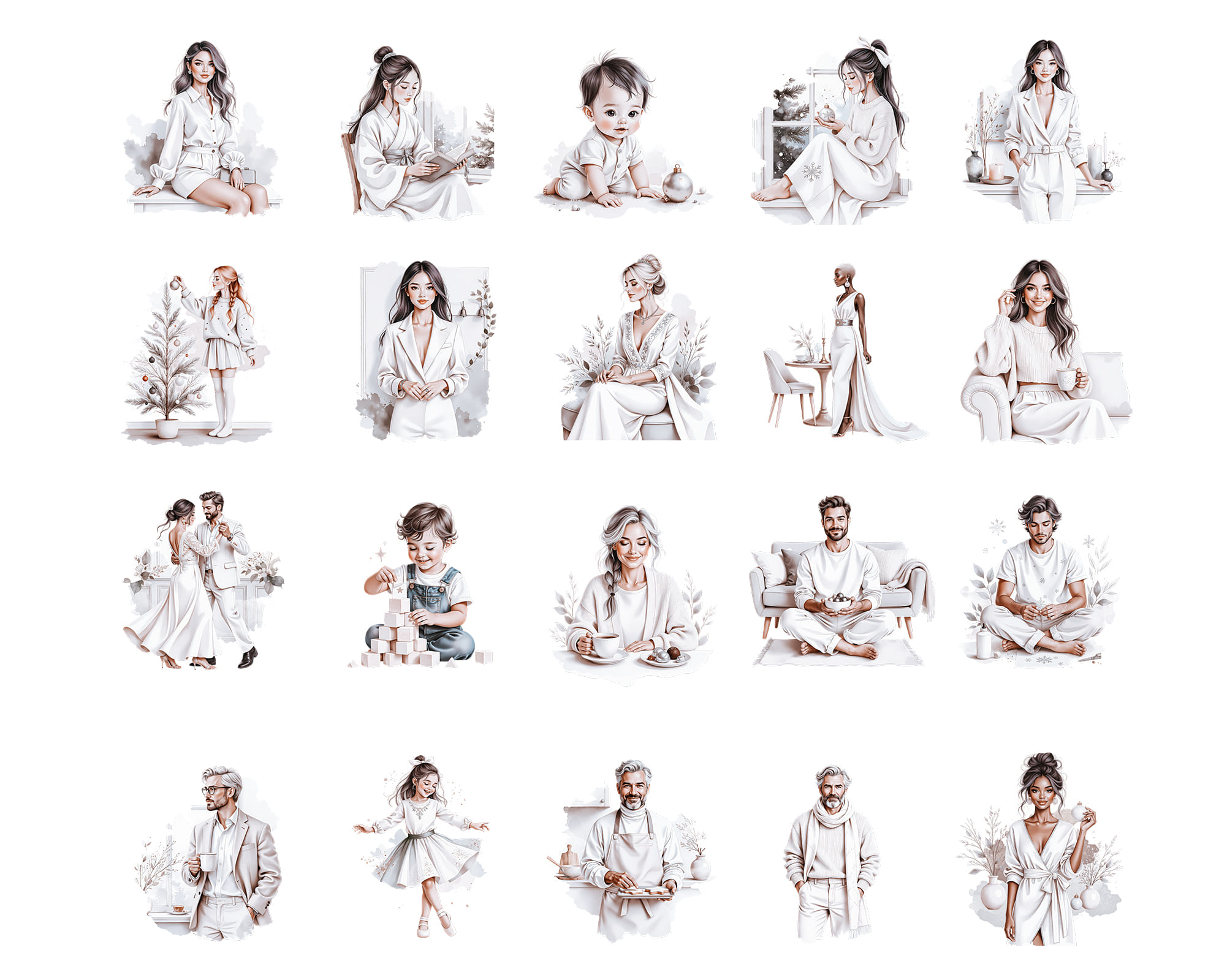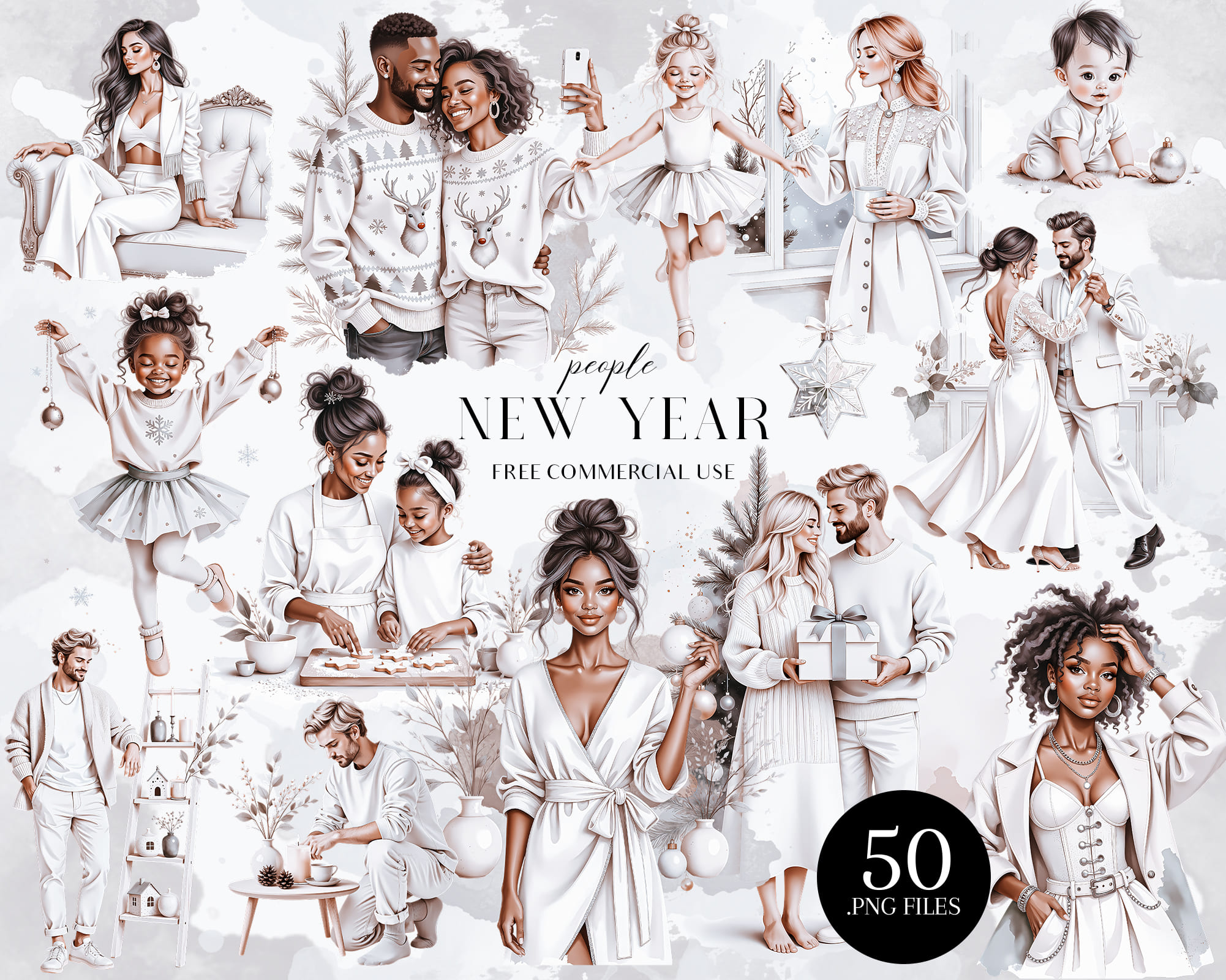 A cozy New Year People clipart collection featuring 50 PNG illustrations in soft winter tones. This set includes couples, families, kids, dancers, portrait girls, gifts, trees and festive home scenes perfect for New Year and holiday projects. Ideal for greeting cards, planners, stickers, invitations, social media, scrapbooking and printable decor. All graphics come as high-quality transparent PNG files.