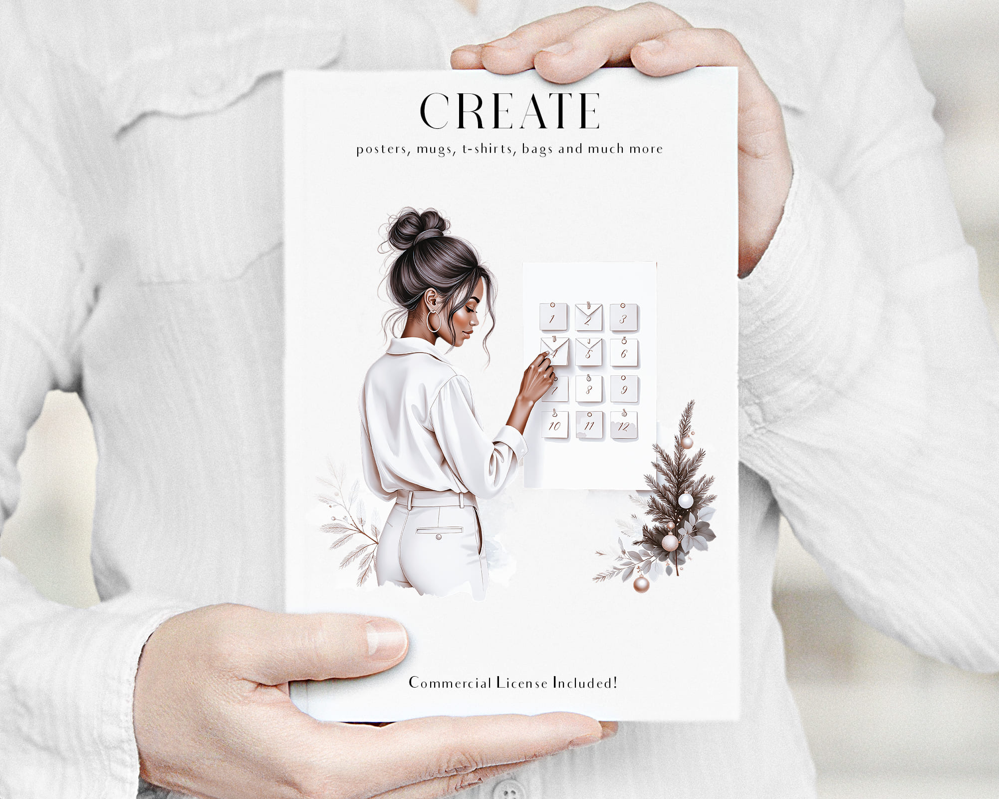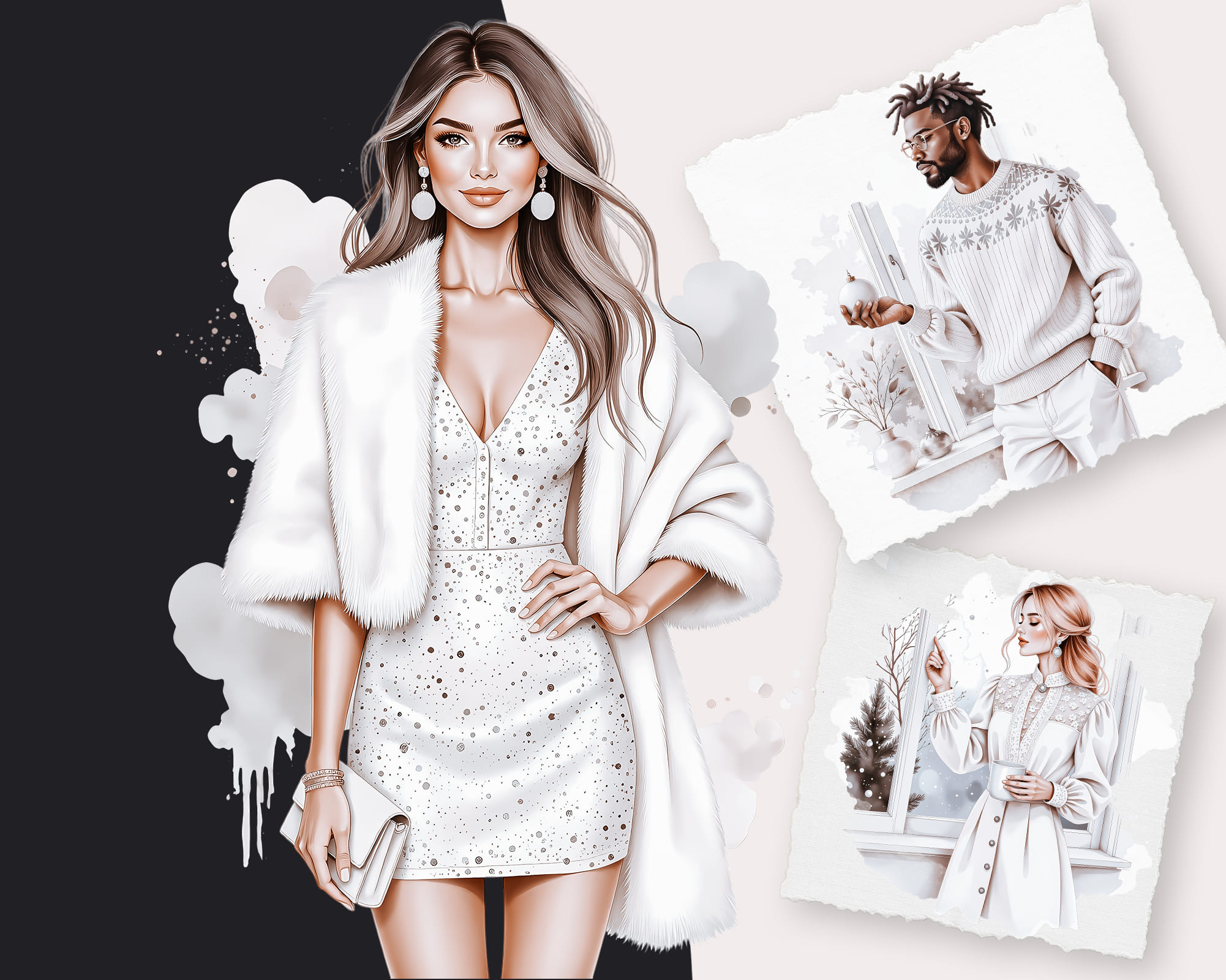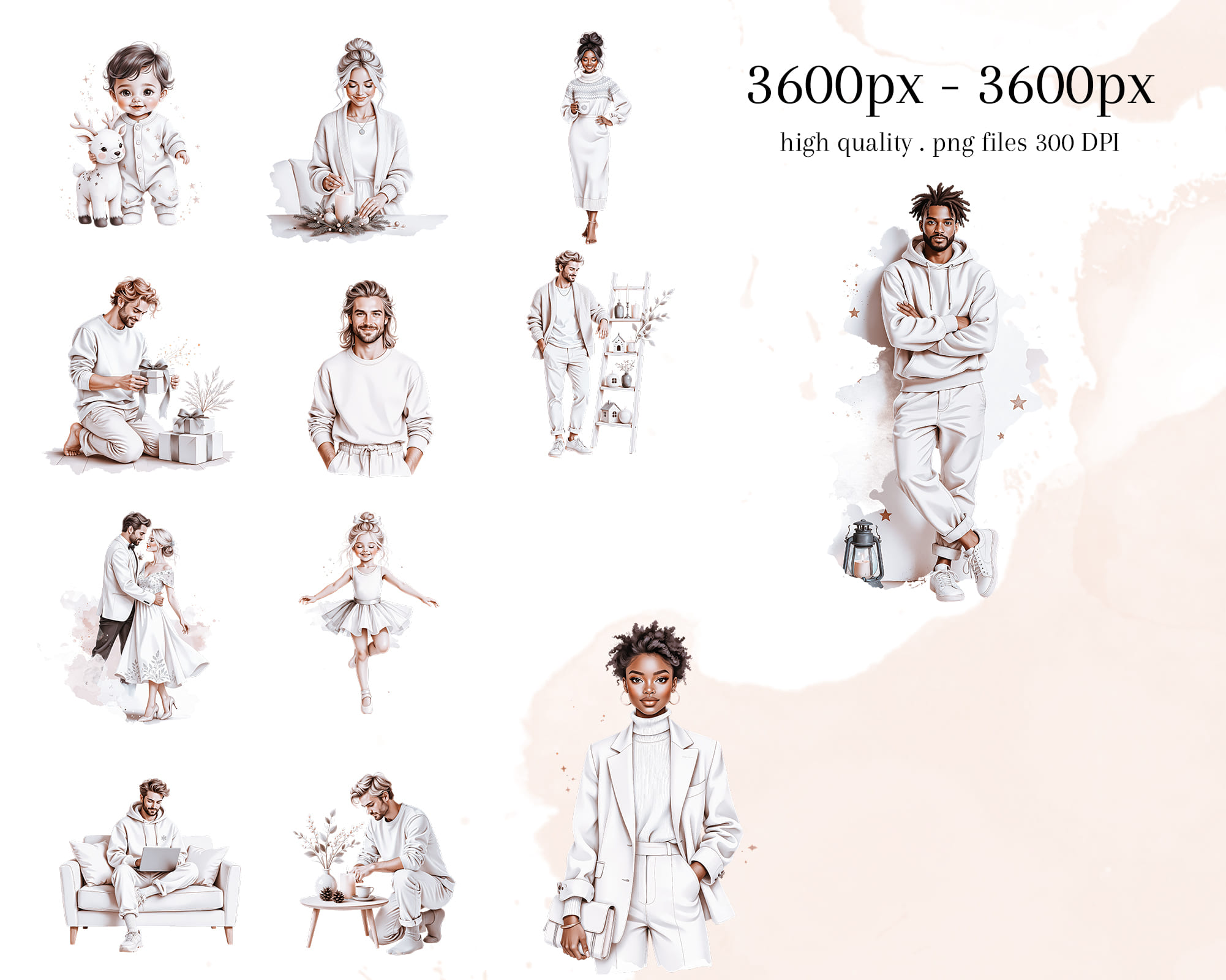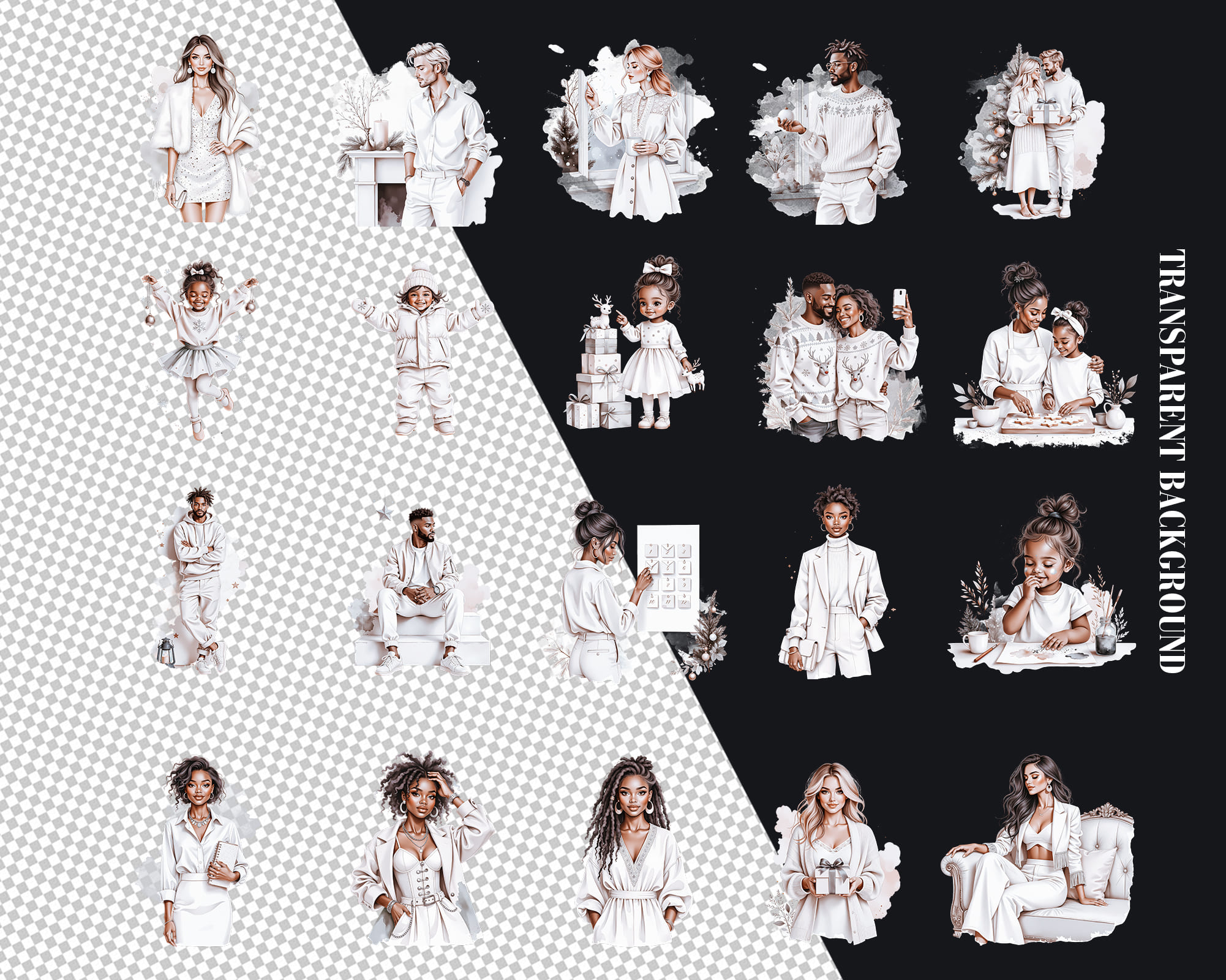 A cozy New Year People clipart collection featuring 50 PNG illustrations in soft winter tones. This set includes couples, families, kids, dancers, portrait girls, gifts, trees and festive home scenes perfect for New Year and holiday projects. Ideal for greeting cards, planners, stickers, invitations, social media, scrapbooking and printable decor. All graphics come as high-quality transparent PNG files.