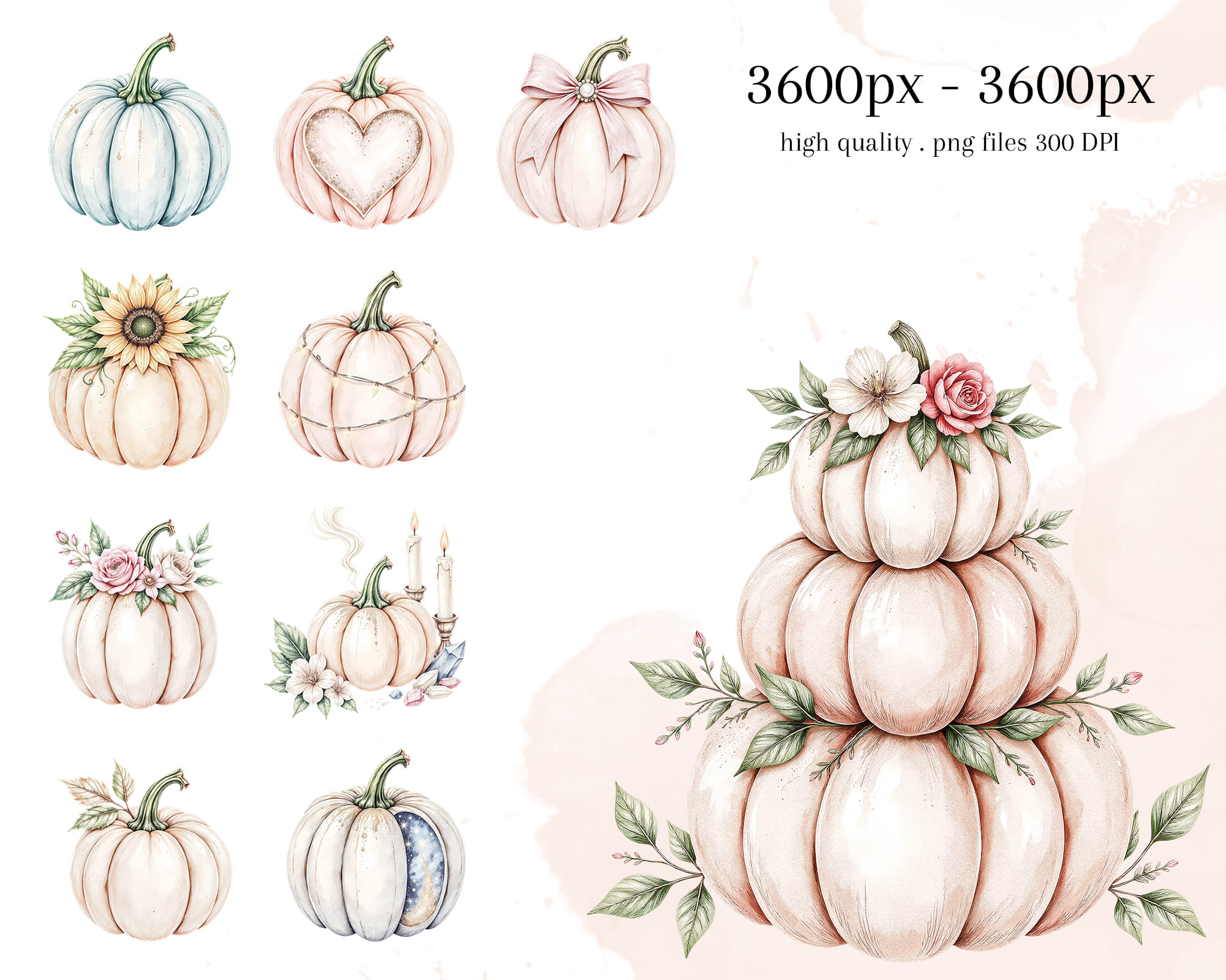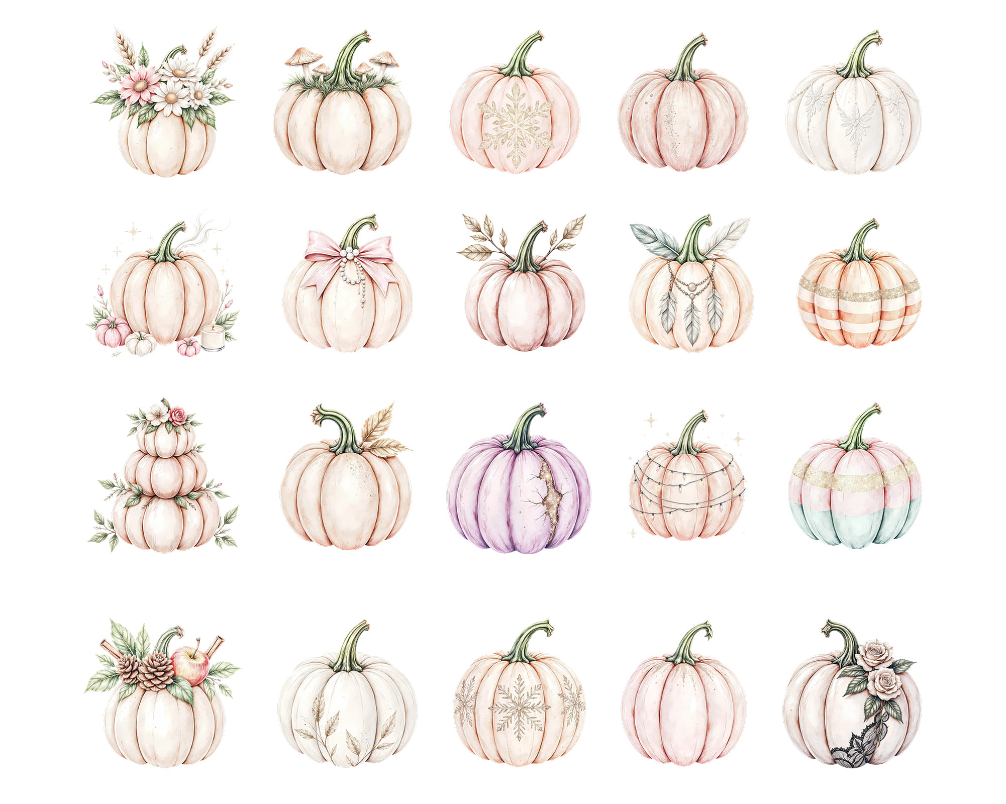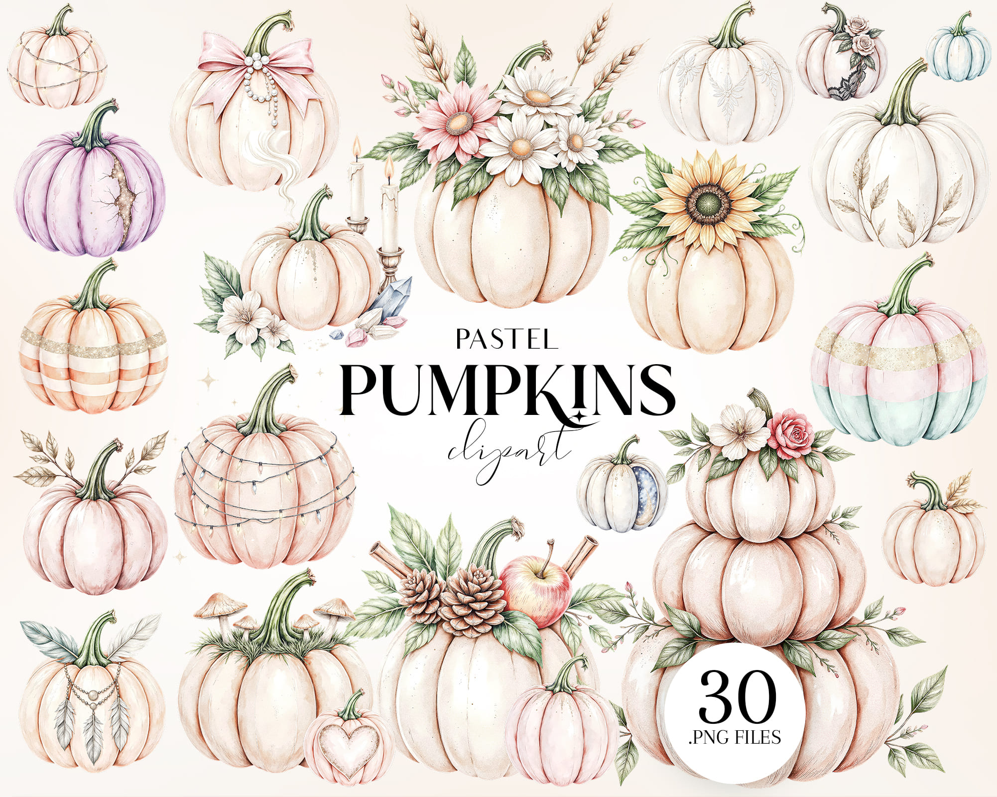 Pastel Pumpkins Clipart is a collection of 30 soft-toned vintage style pumpkins in PNG format. Each file is high resolution (300 DPI) with transparent background, approx. 3600×3600 px.