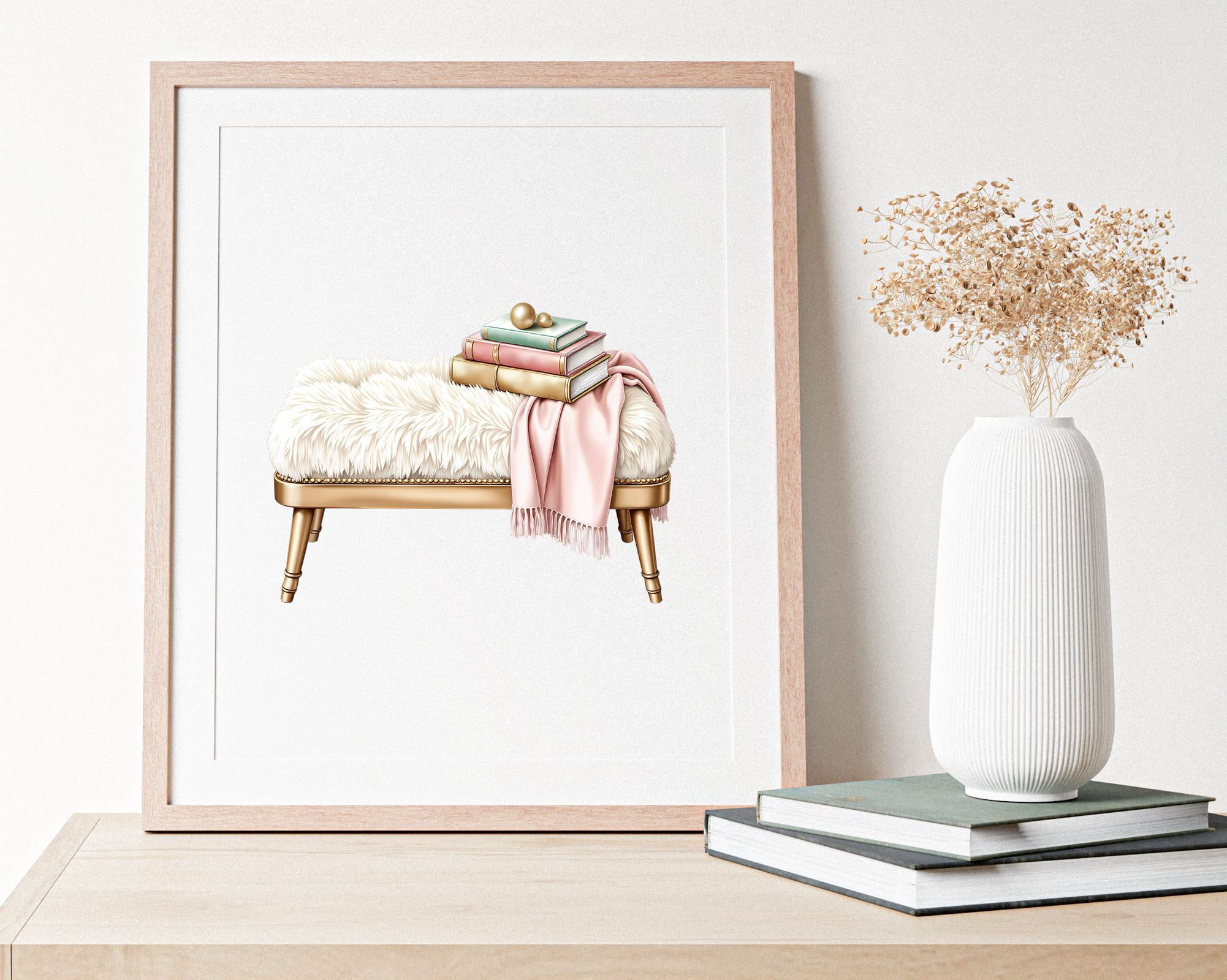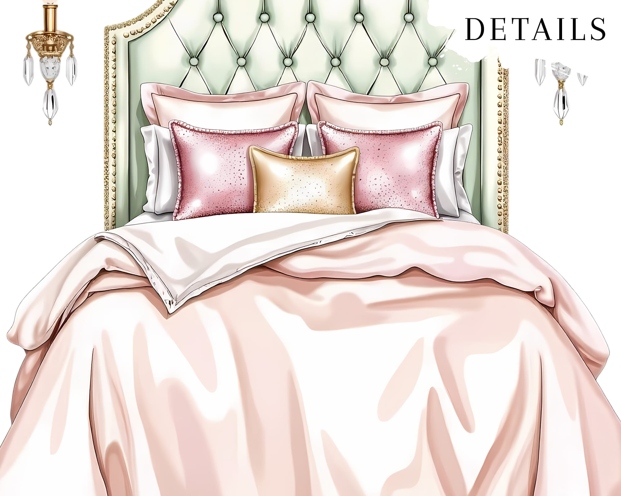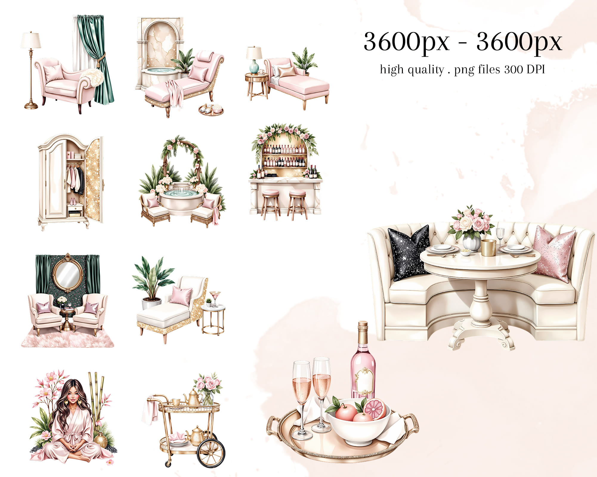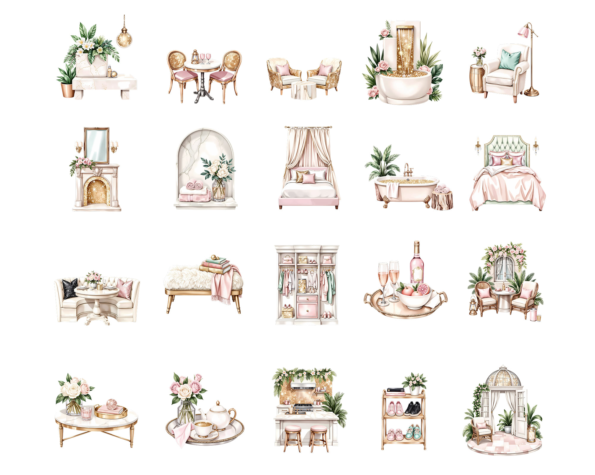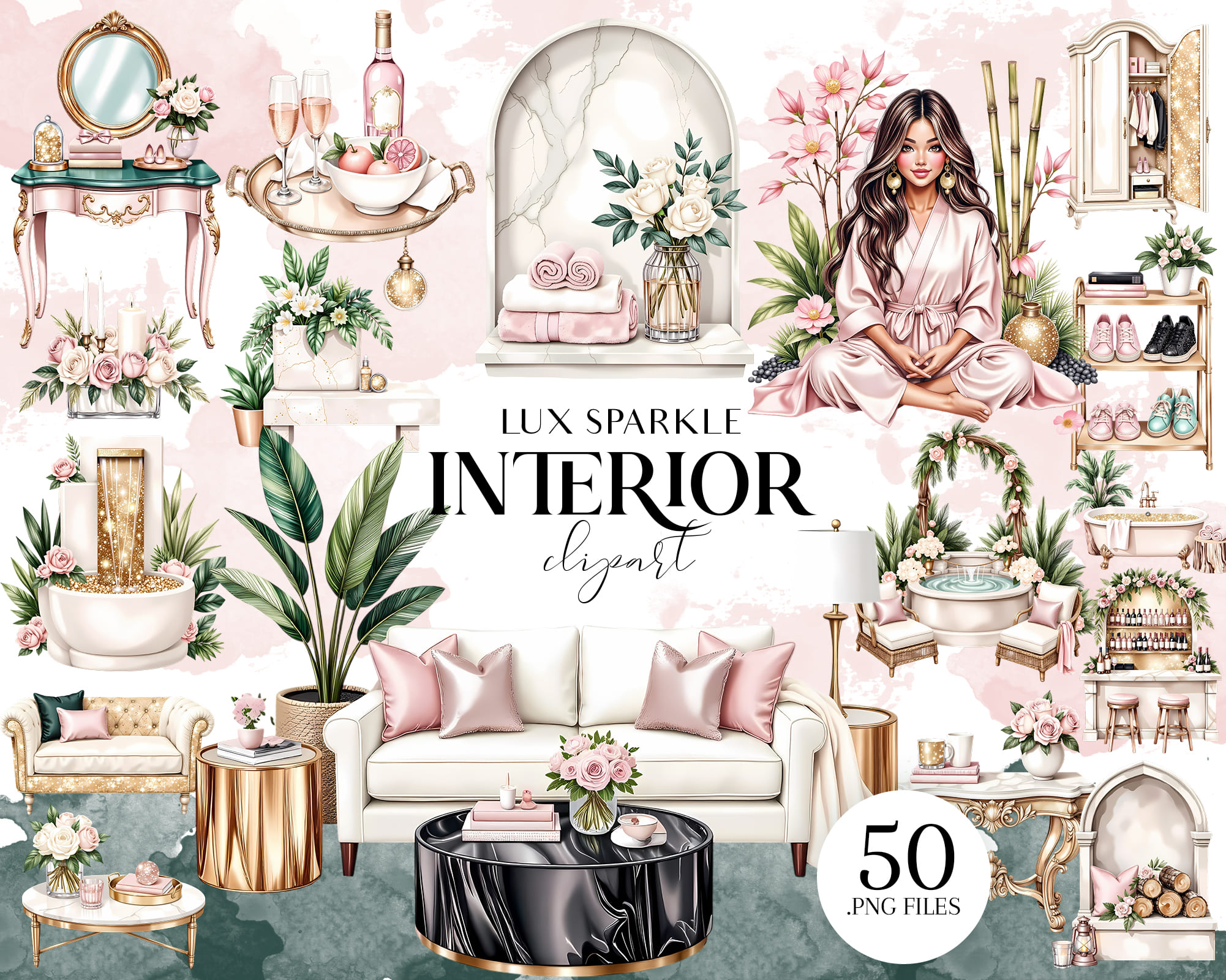 Bring sophistication to your designs with this Pink and Gold Lux Interior Clipart collection 🌷. Perfect for digital planners, cards, branding, or cozy home illustrations. Includes 50 PNG files with transparent backgrounds.