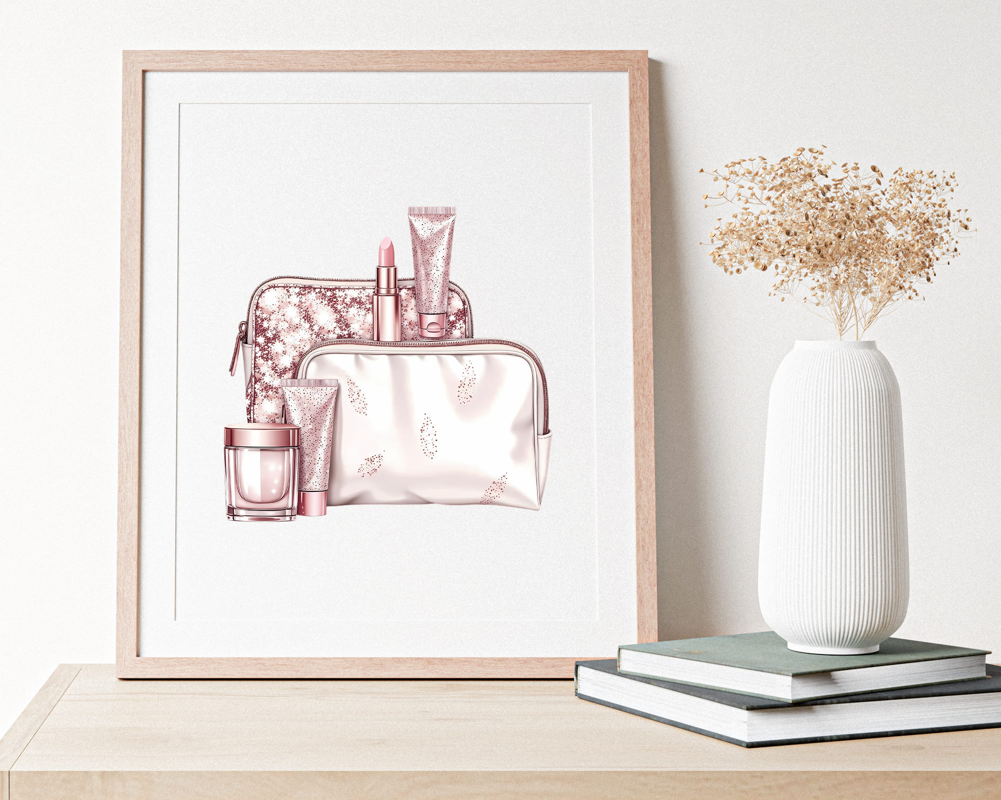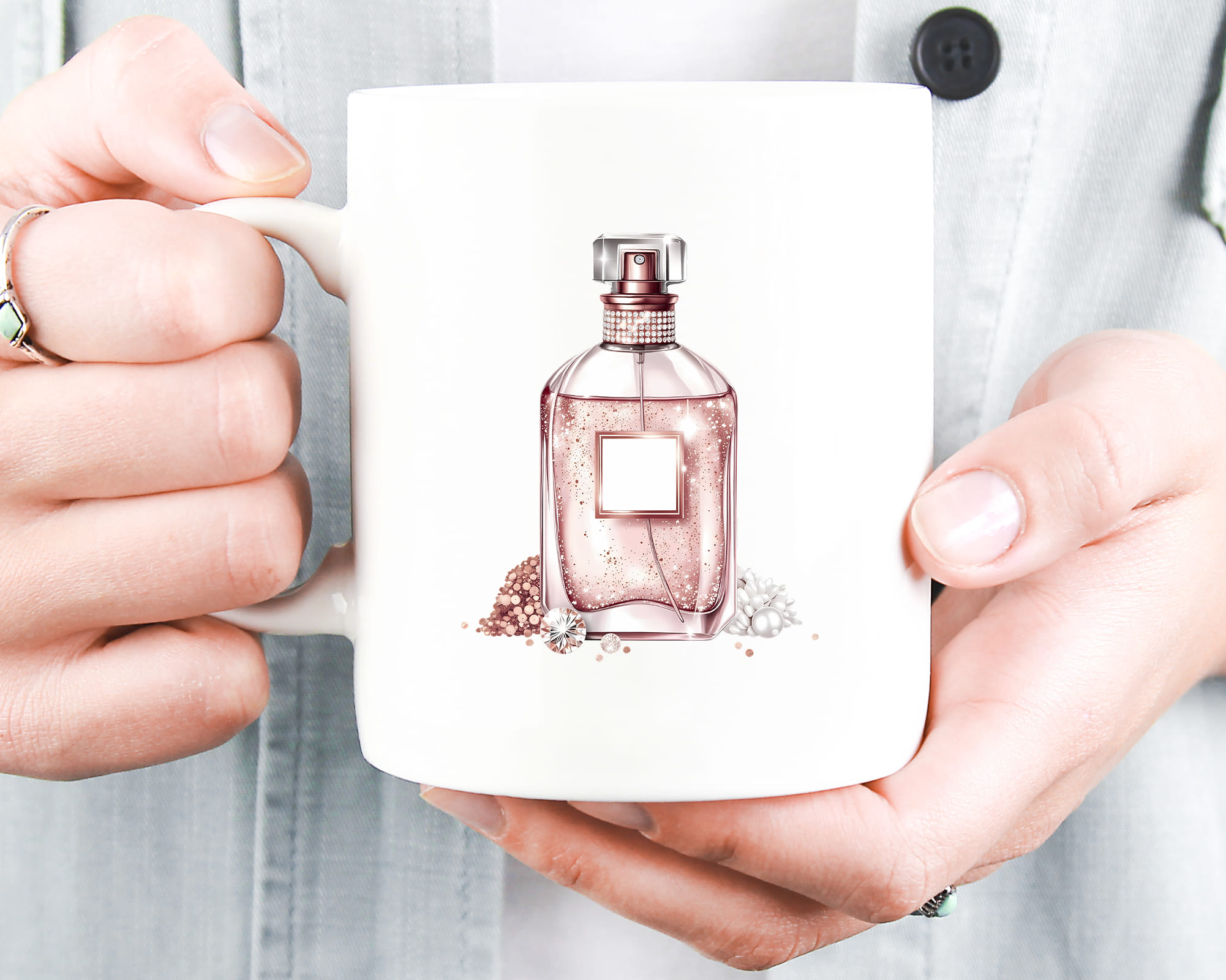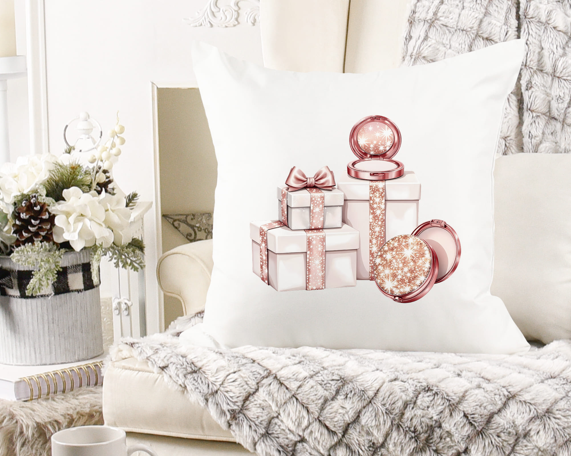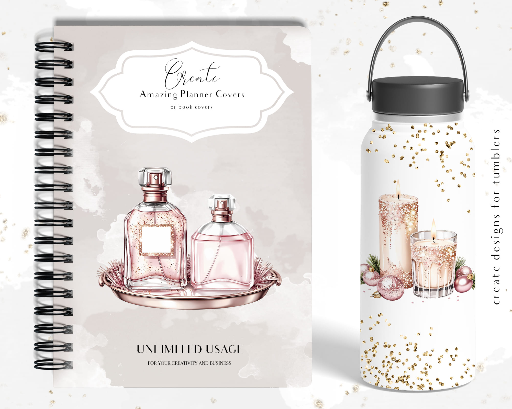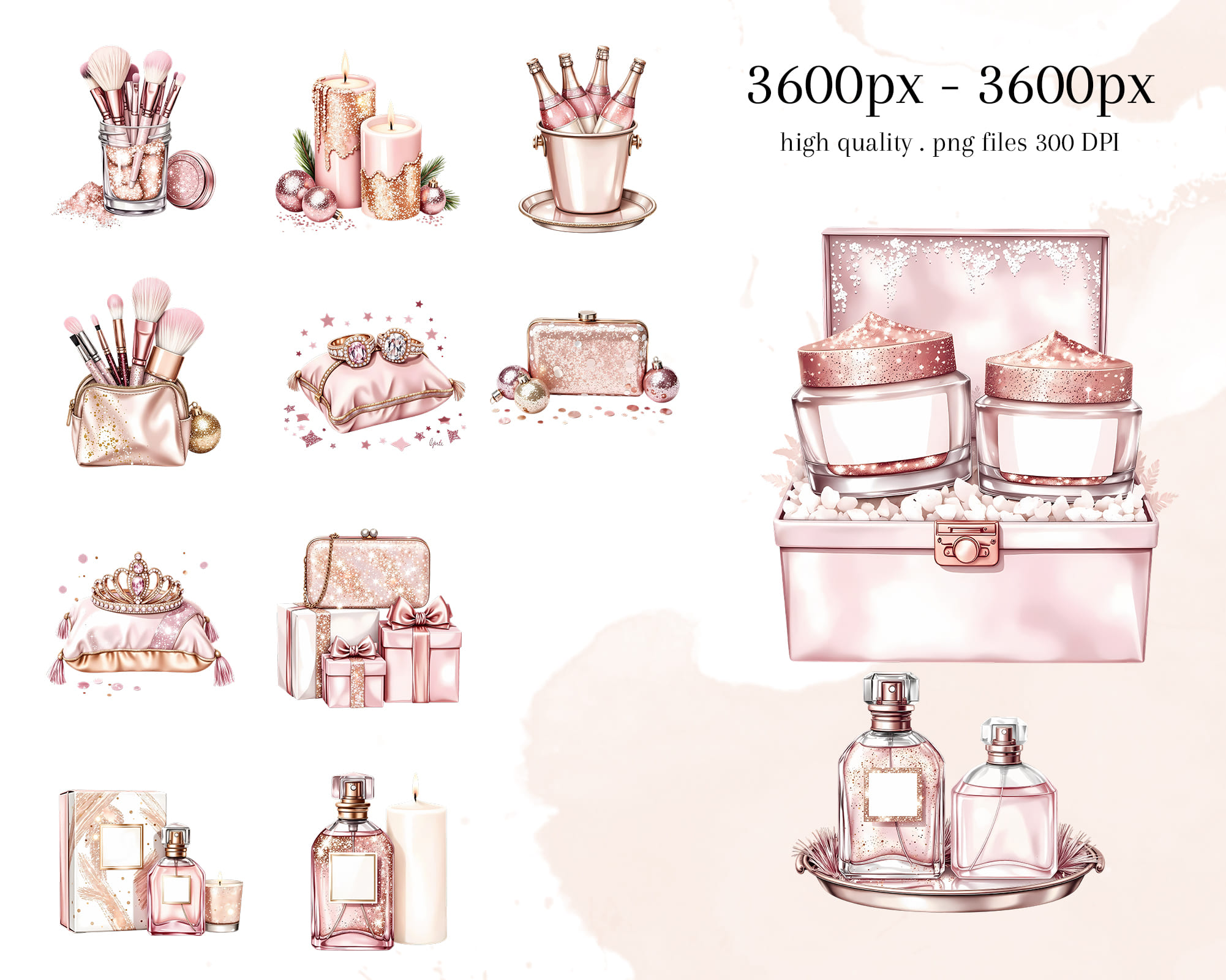 Elements: champagne bottles, perfume, gift boxes, bags, makeup brushes, candles, and luxury accessories