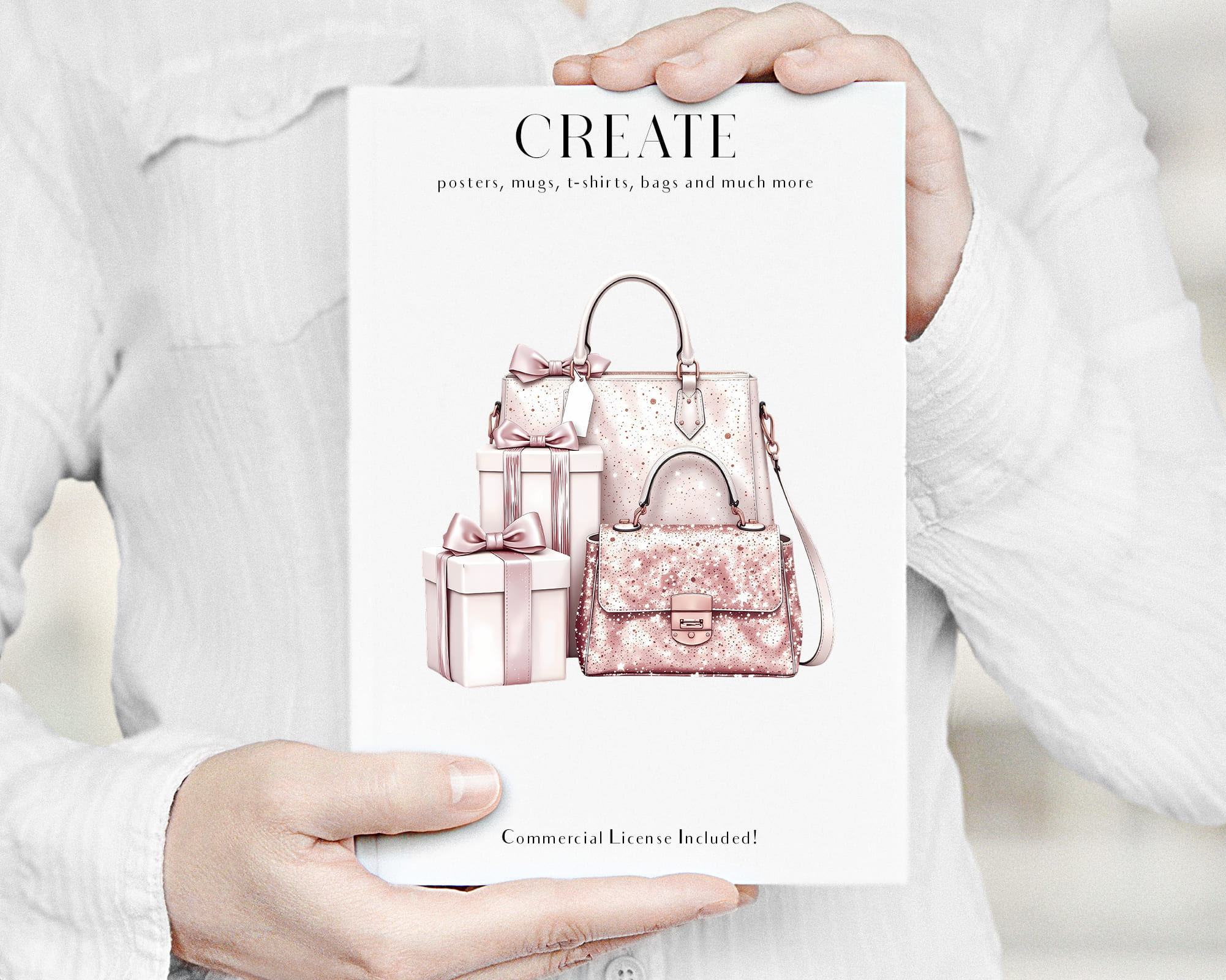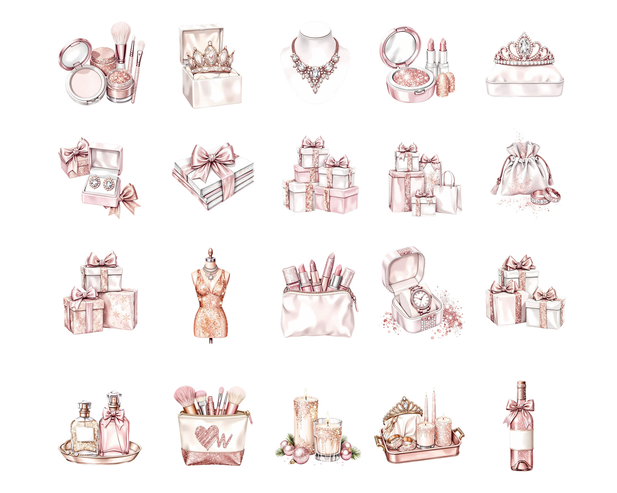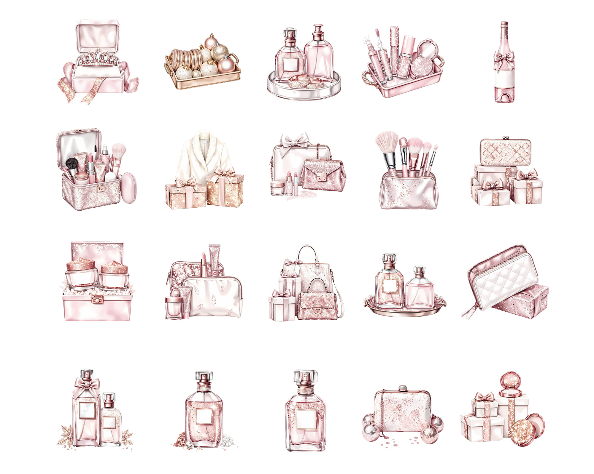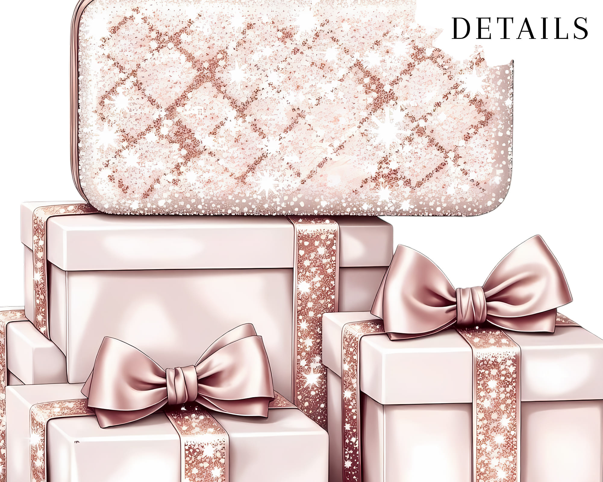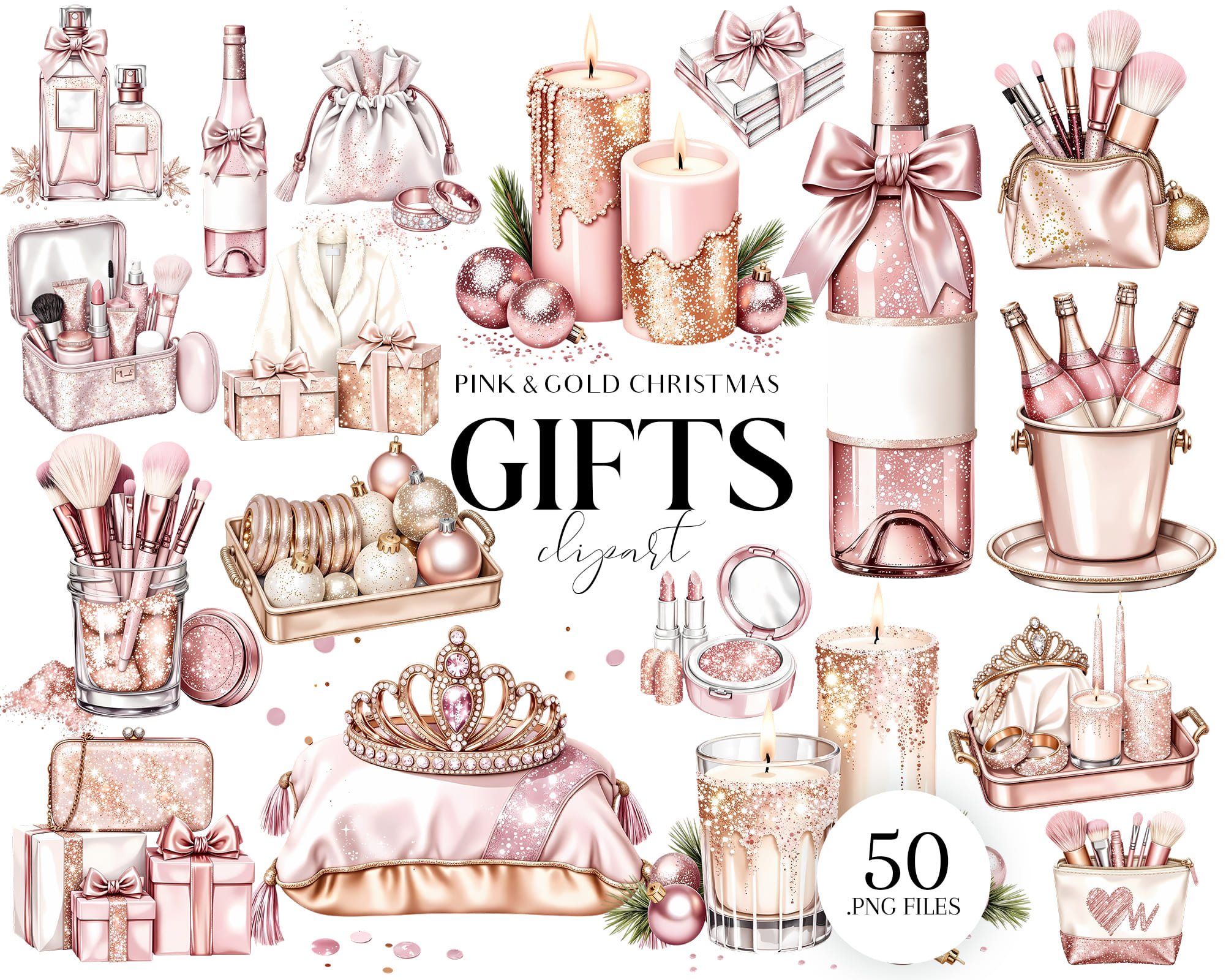 Celebrate the holidays in style with this Pink & Gold Luxury Gifts Clipart Set. Soft blush pink meets shimmering gold for a glamorous look — perfect for branding, packaging, or elegant seasonal art.