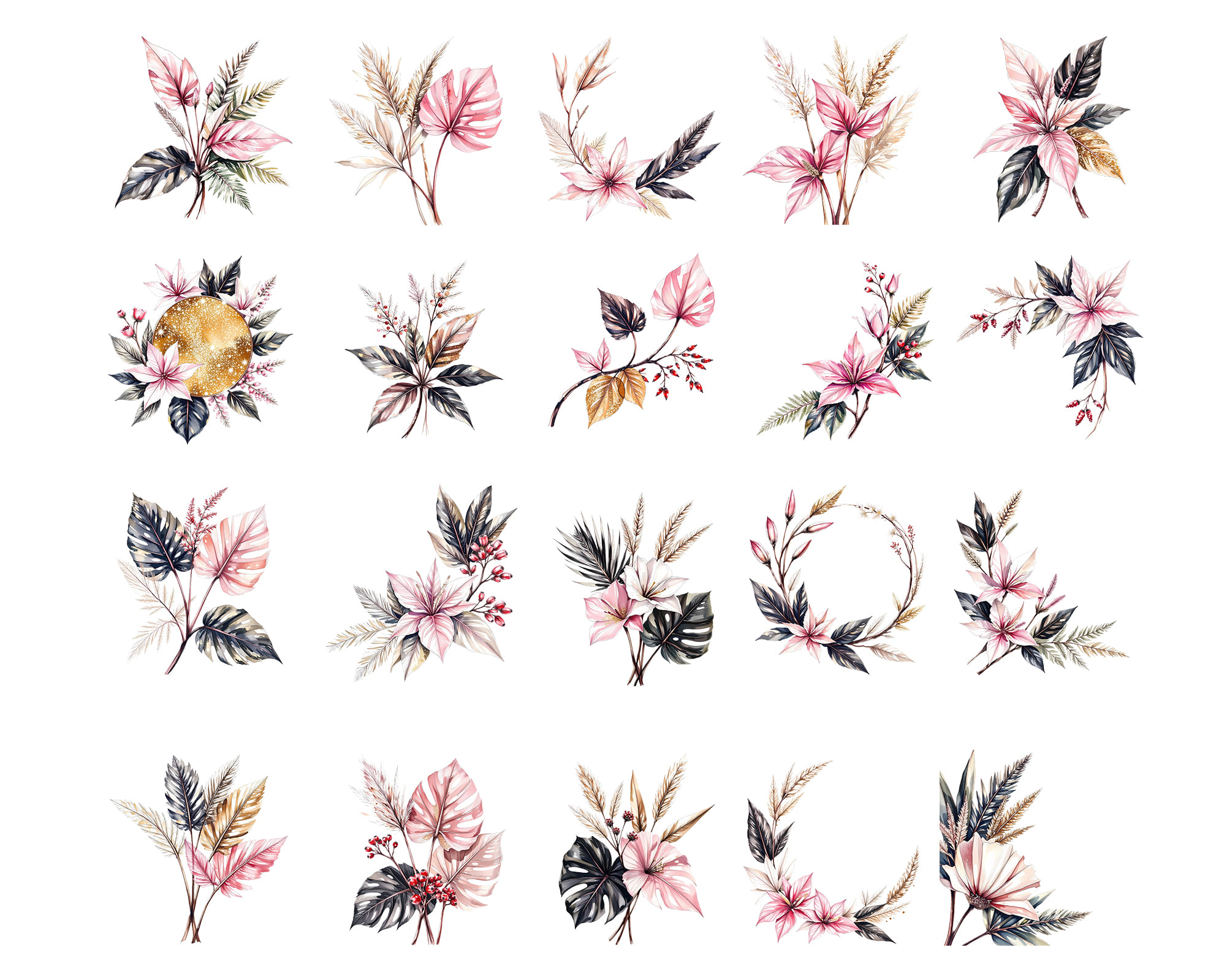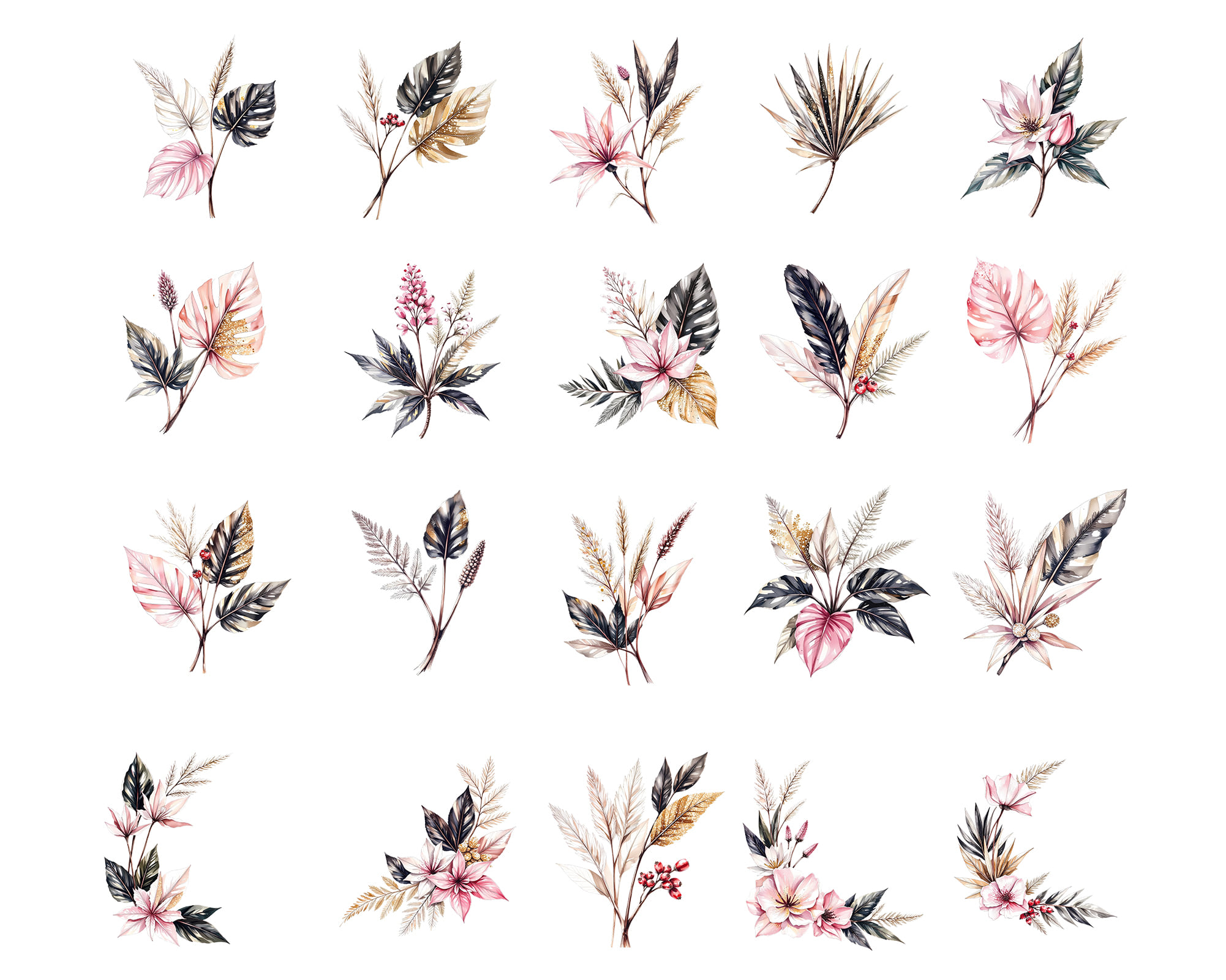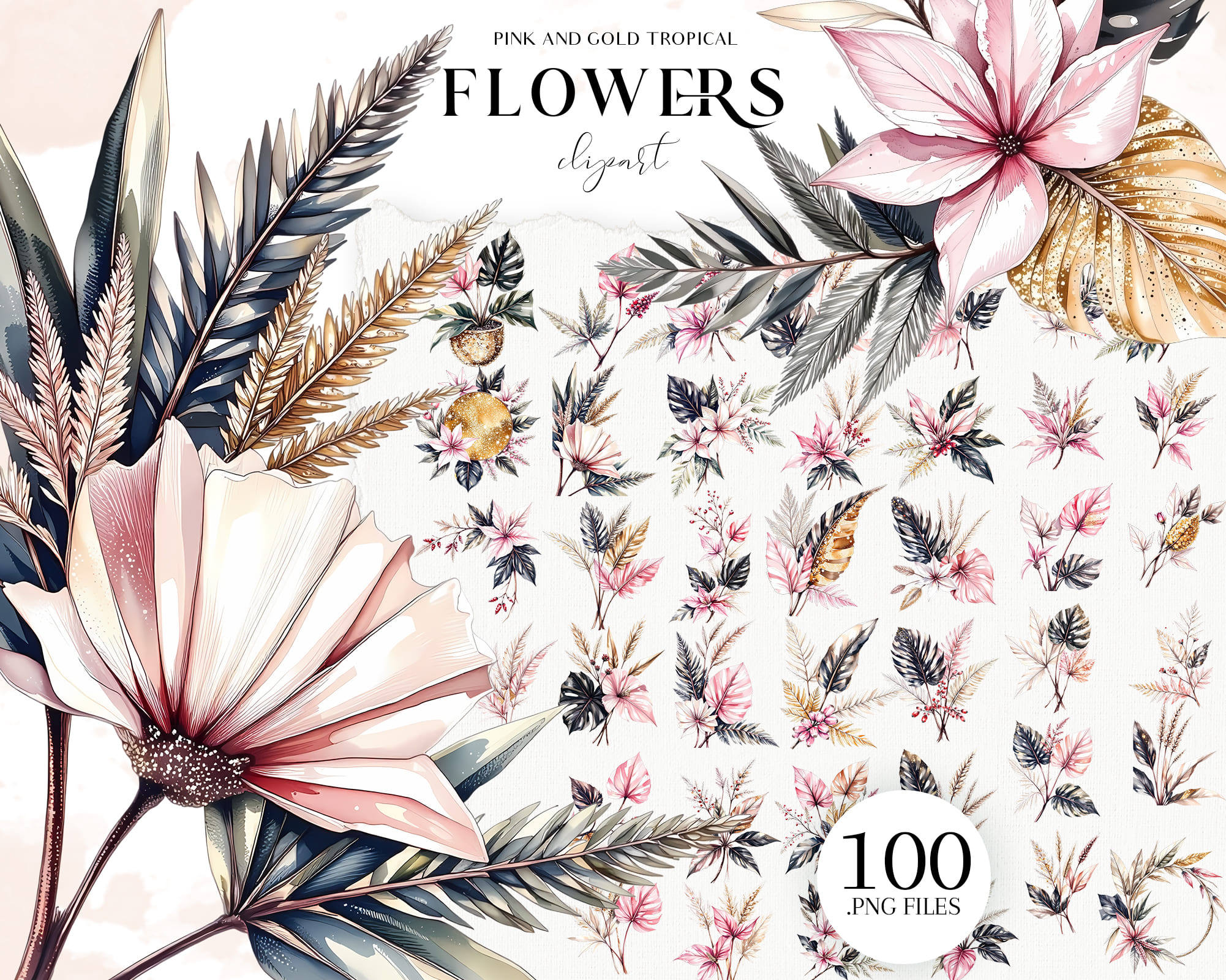 A glamorous collection of 100 PNG pink-gold tropical florals, leaves and decorative botanical accents for exotic stationery and elegant designs.