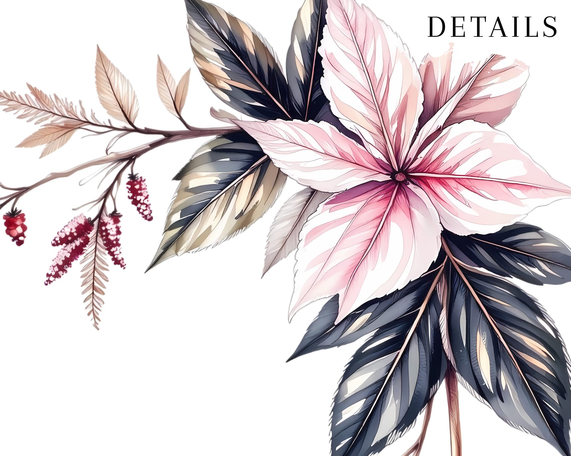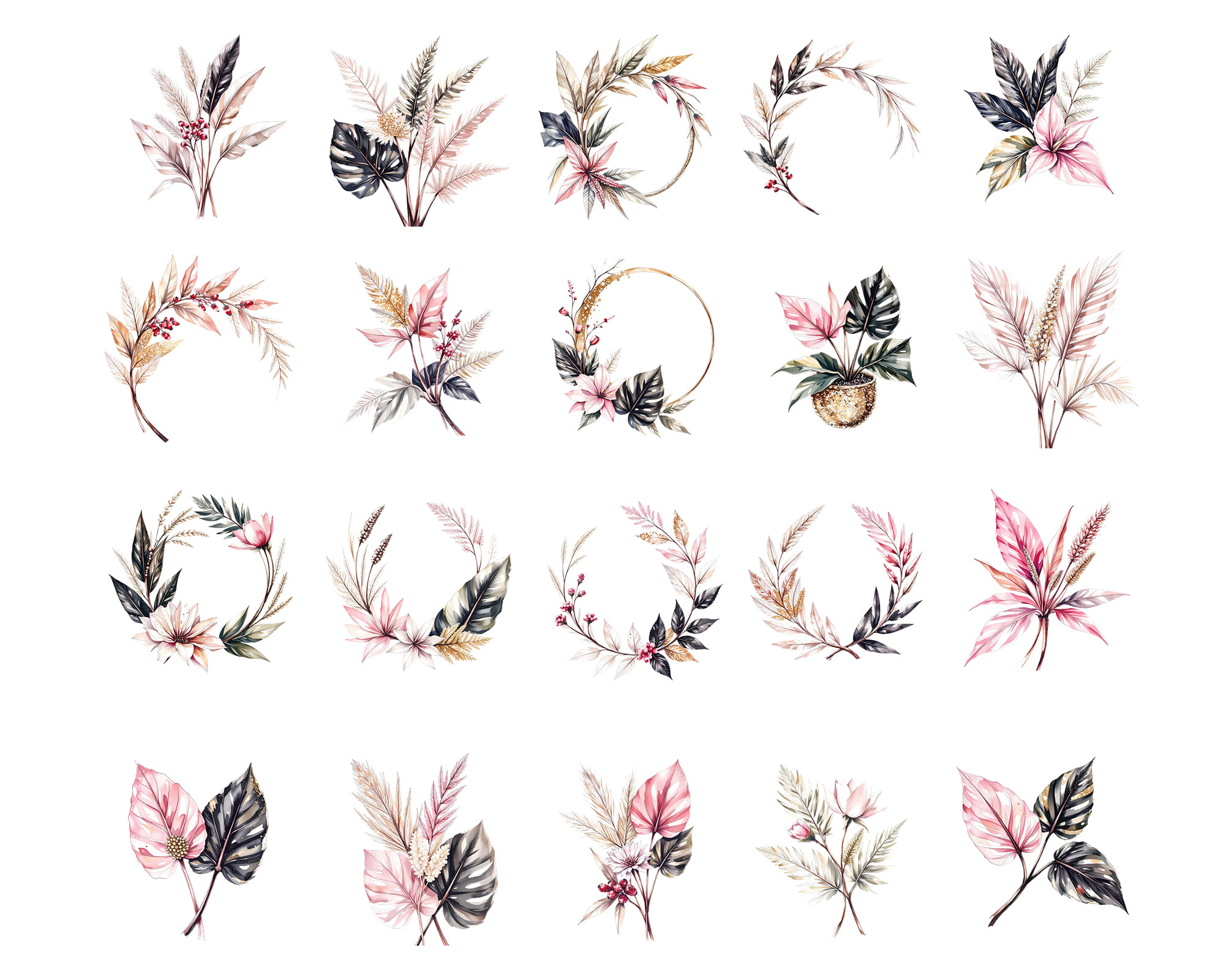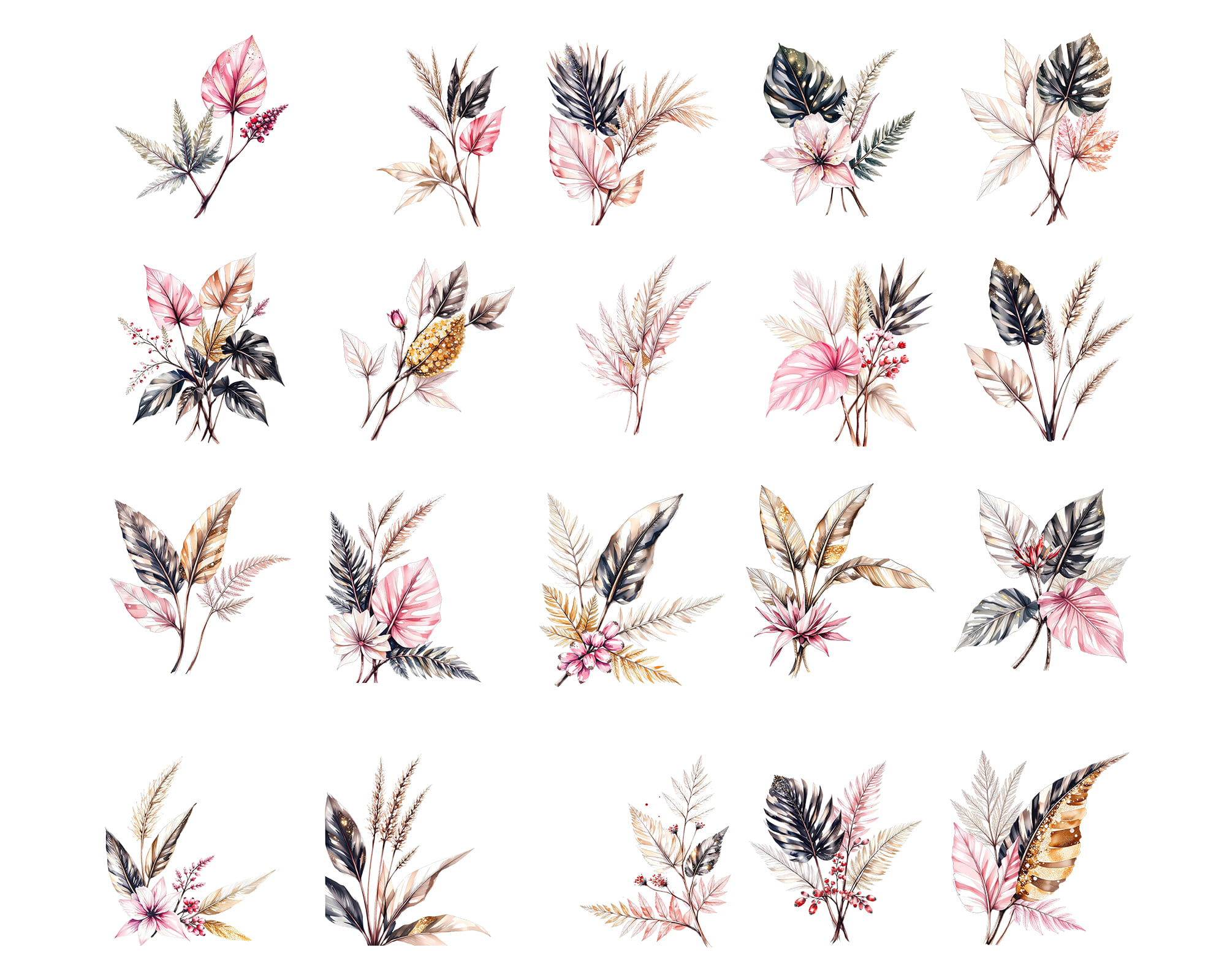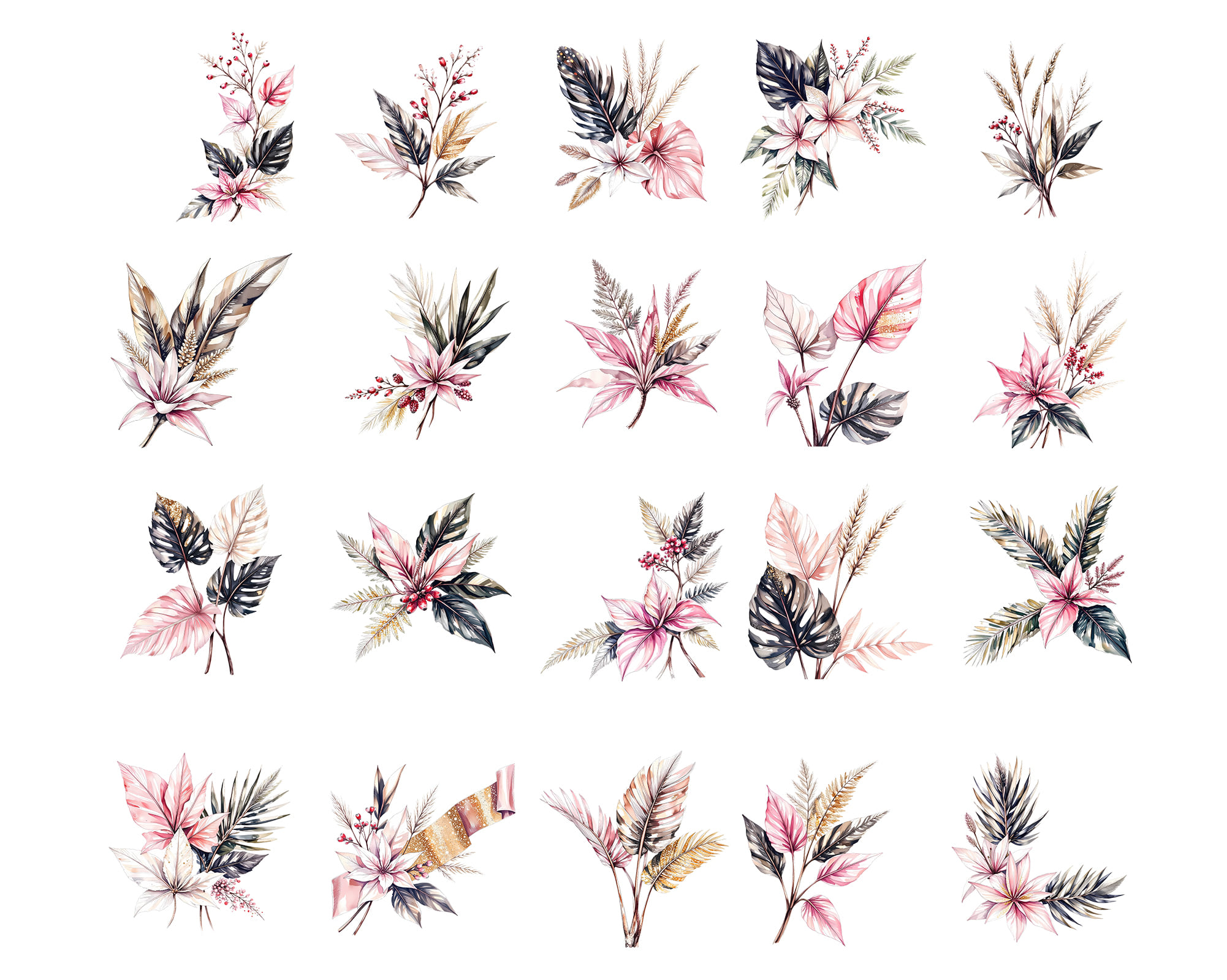 100 PNG elements — tropical blooms, golden leaves, palm fronds, pink foliage, glitter accents, botanical arrangements.