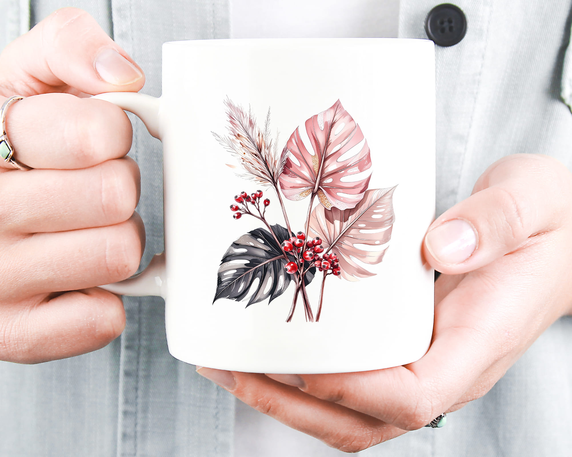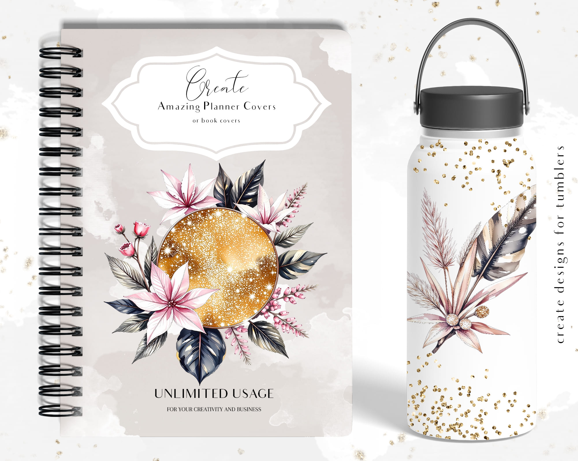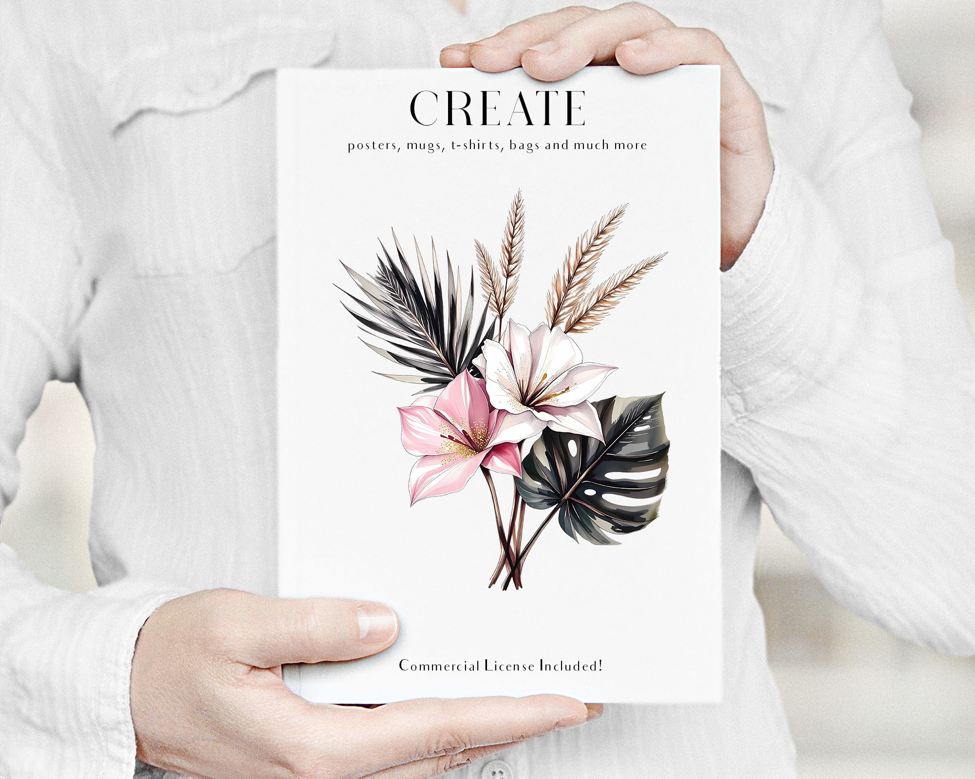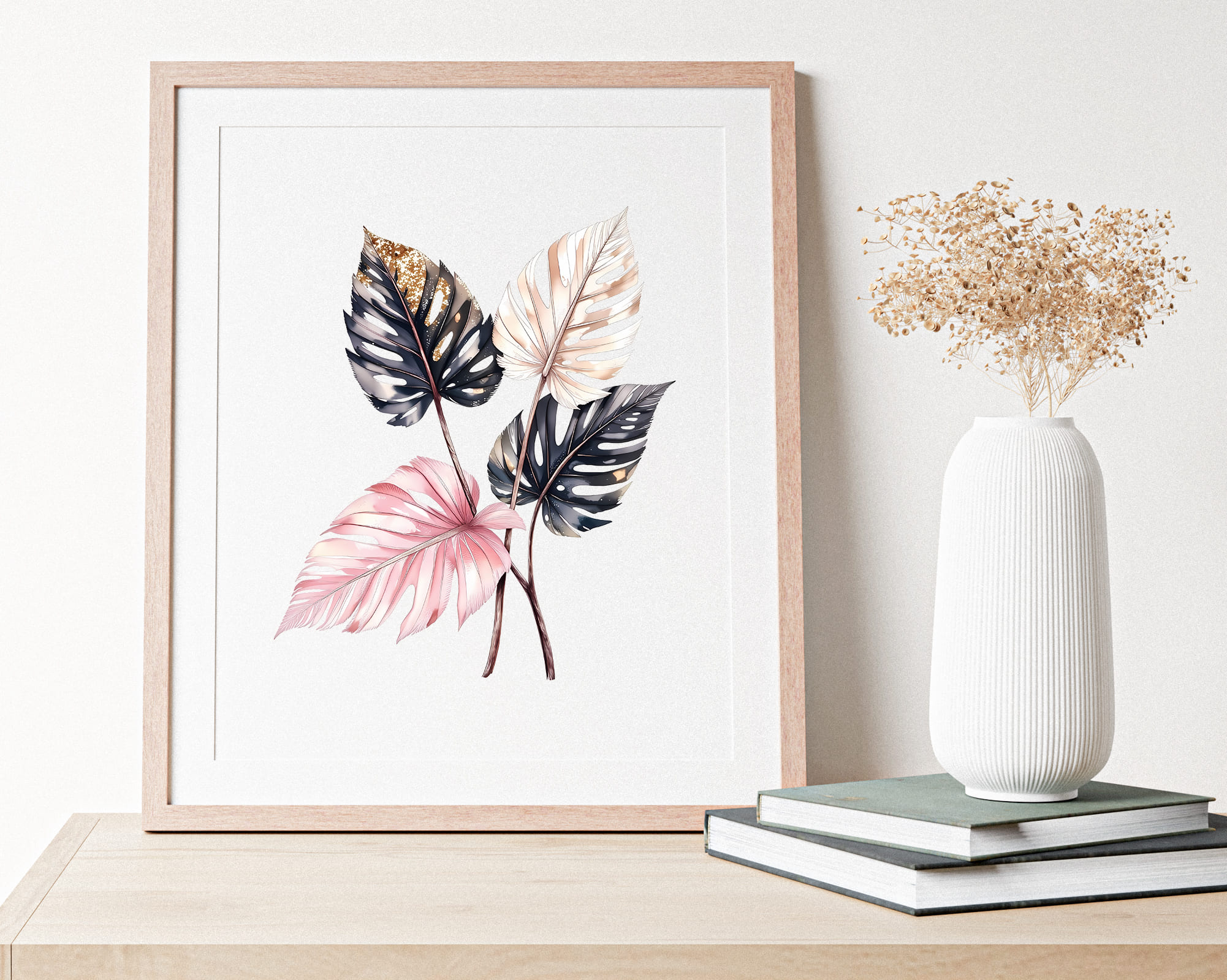 100 PNG elements — tropical blooms, golden leaves, palm fronds, pink foliage, glitter accents, botanical arrangements.