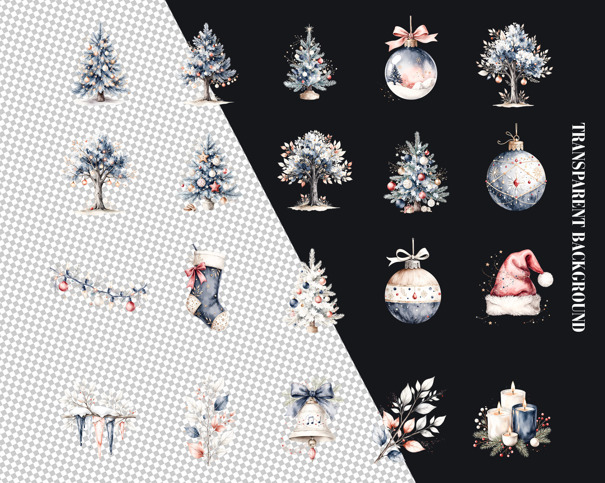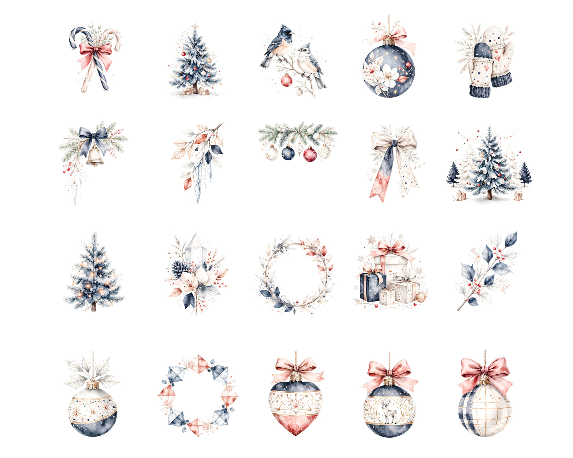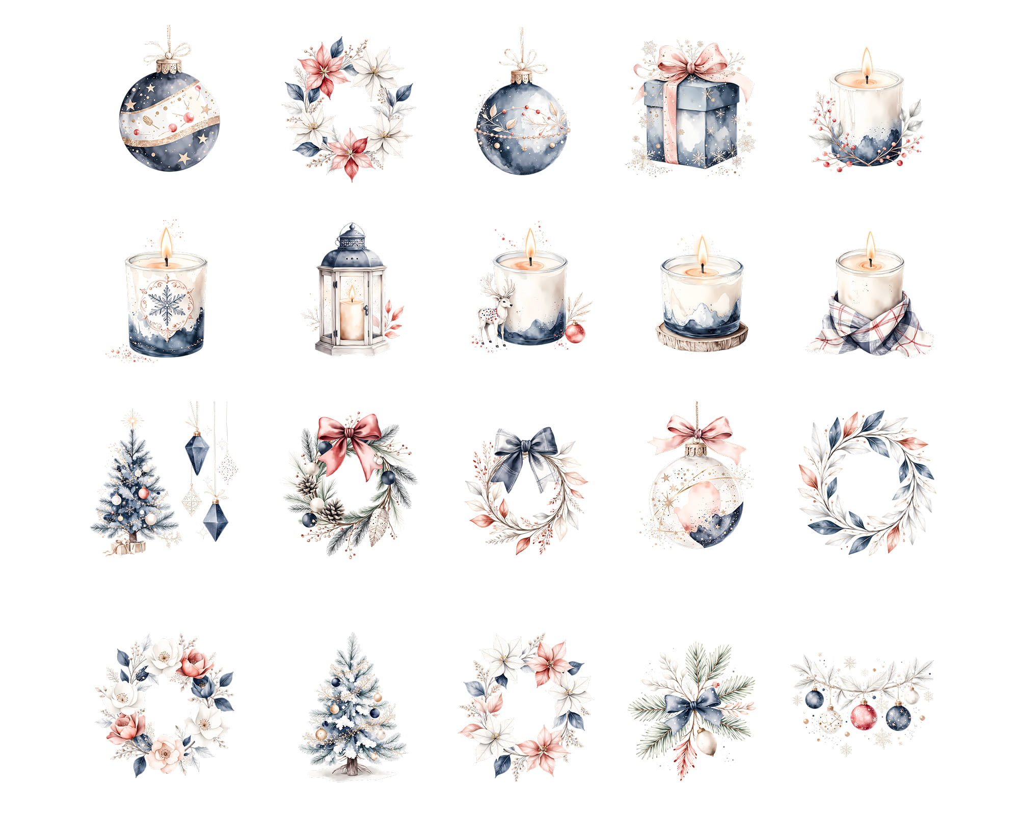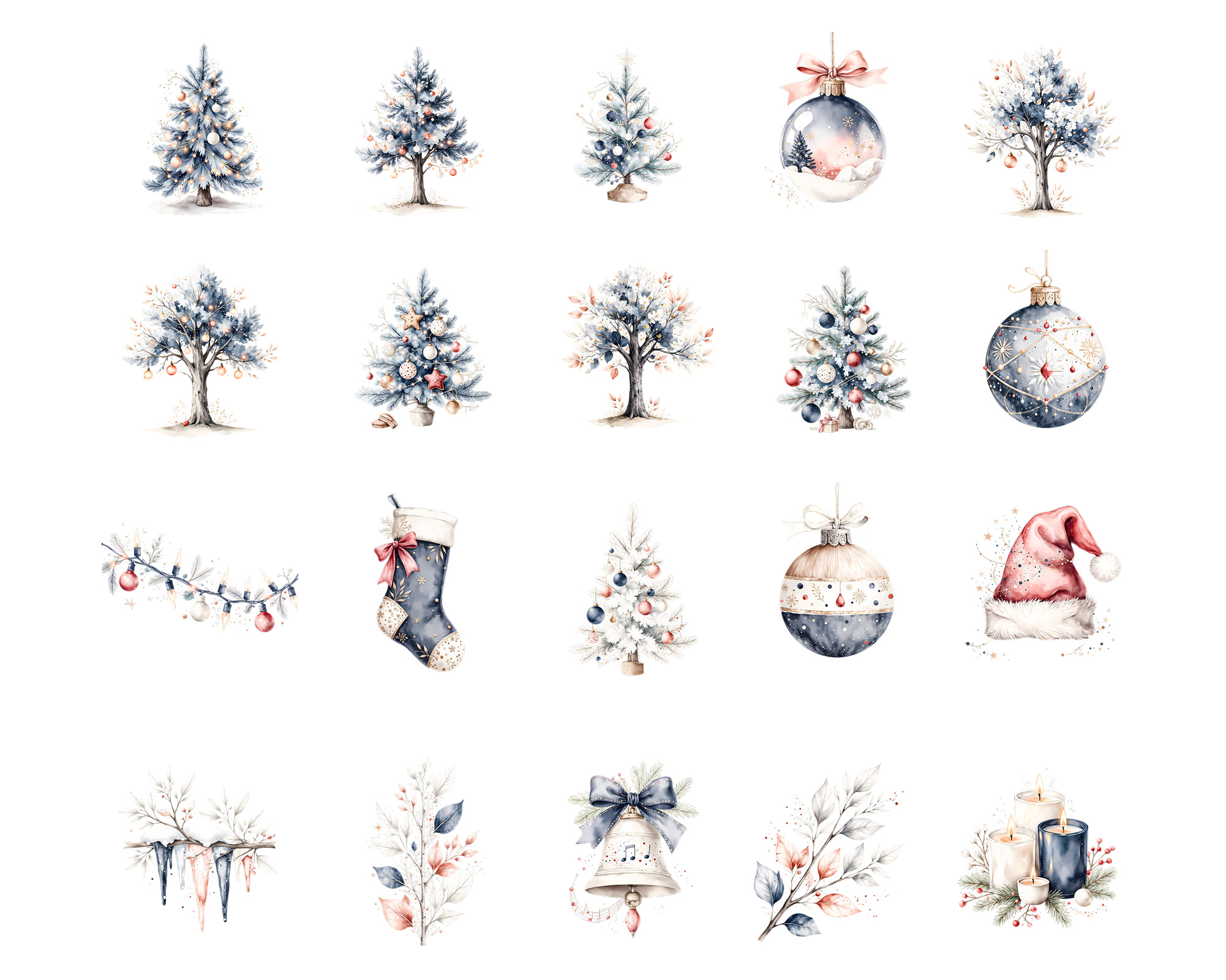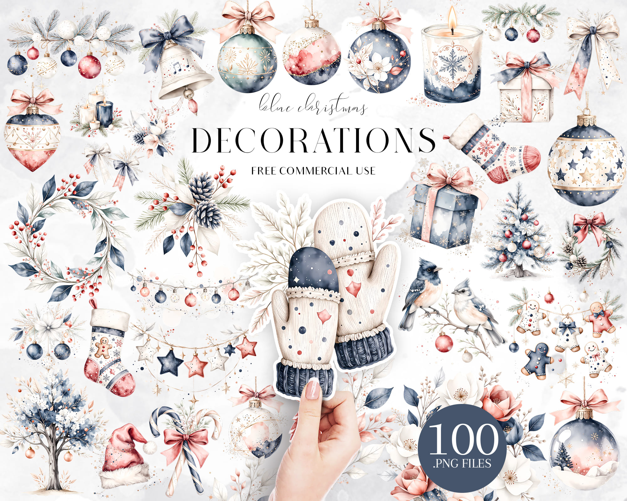 A cozy Blue Christmas Decorations clipart collection featuring 100 PNG illustrations in soft winter tones. This set includes ornaments, stockings, mittens, candles, gifts, wreaths, birds, gingerbread, candy canes, trees, and festive florals perfect for elegant holiday projects. Ideal for Christmas cards, gift tags, planners, stickers, wrapping paper, and printable decor. All graphics come as high-quality transparent PNG files.