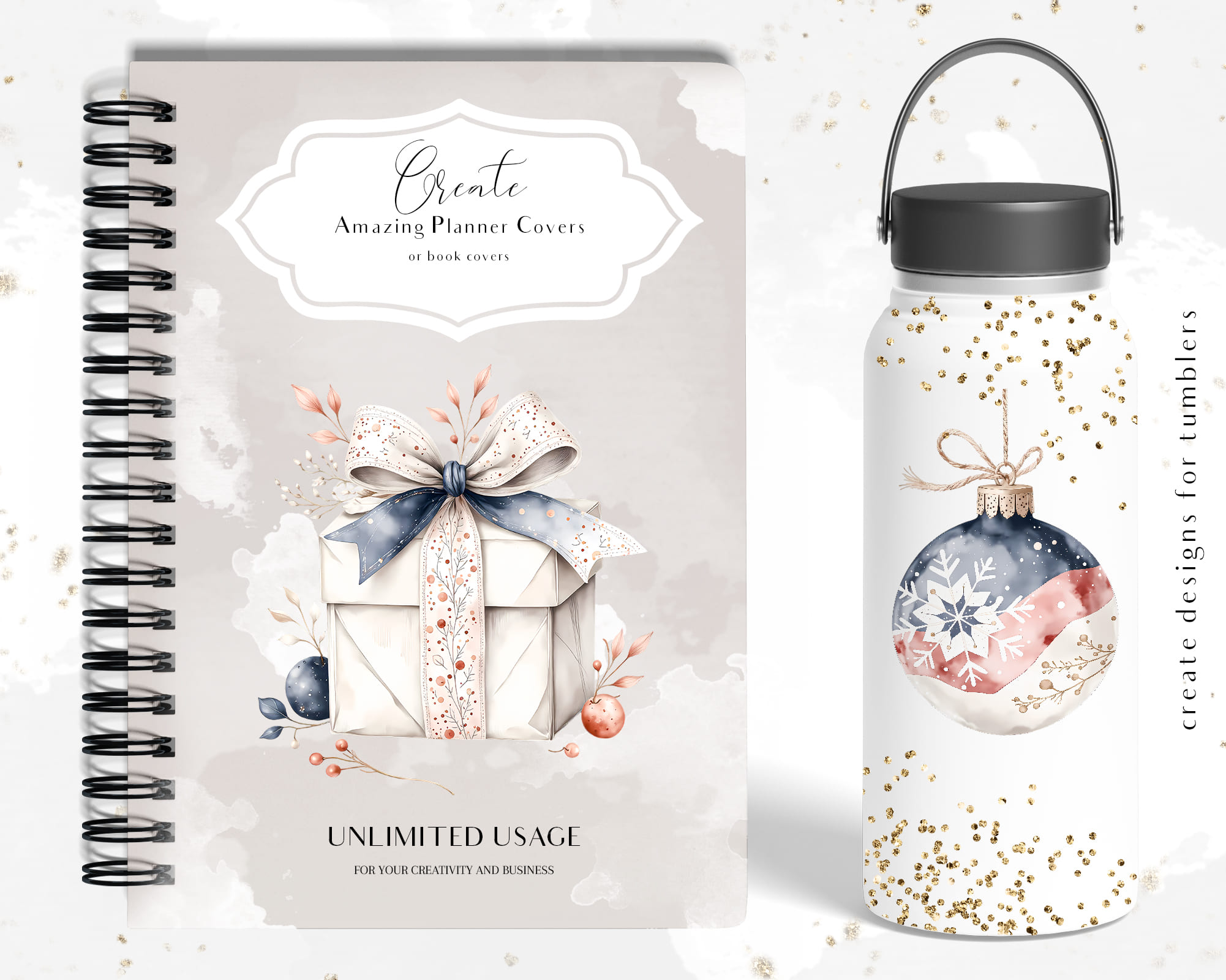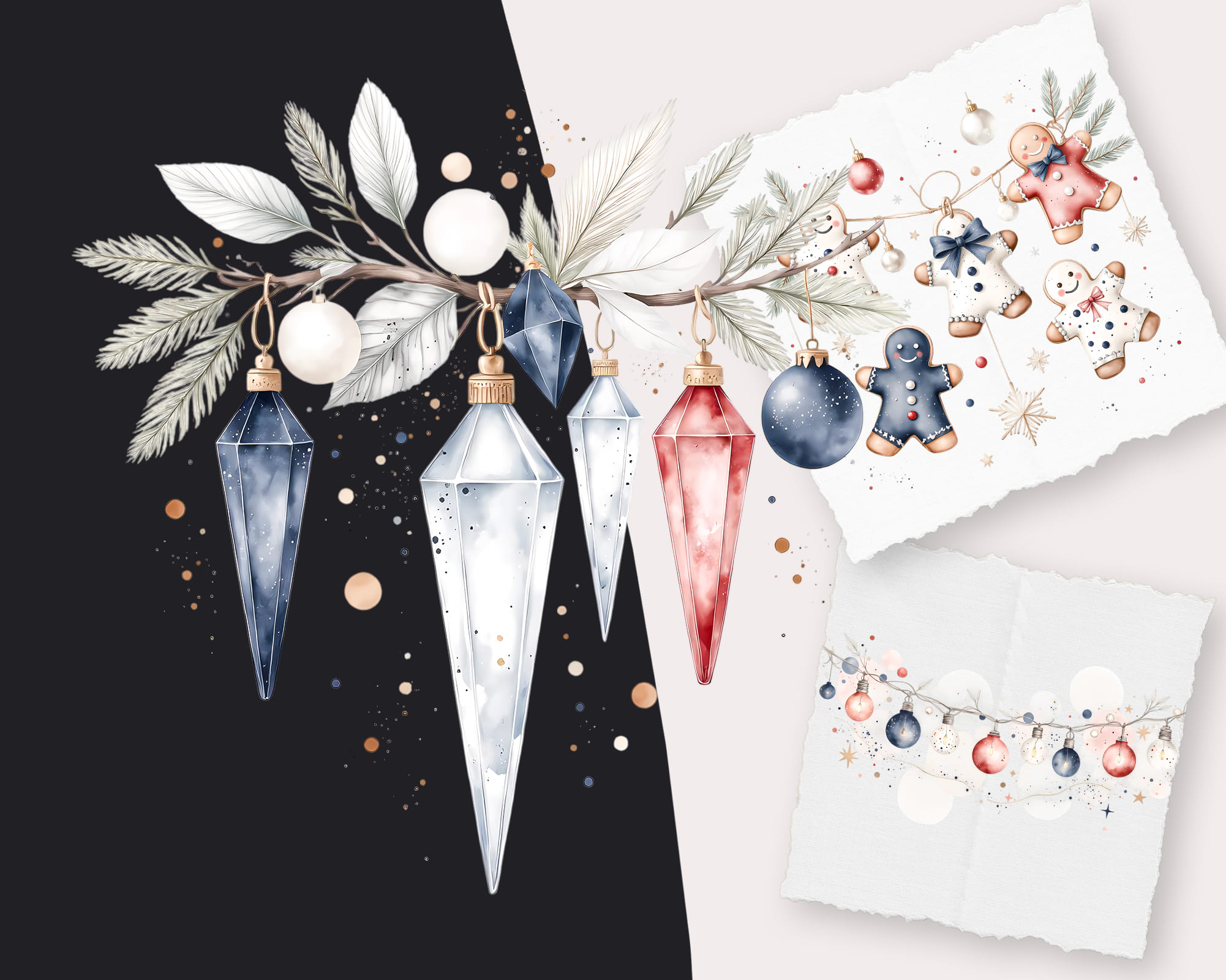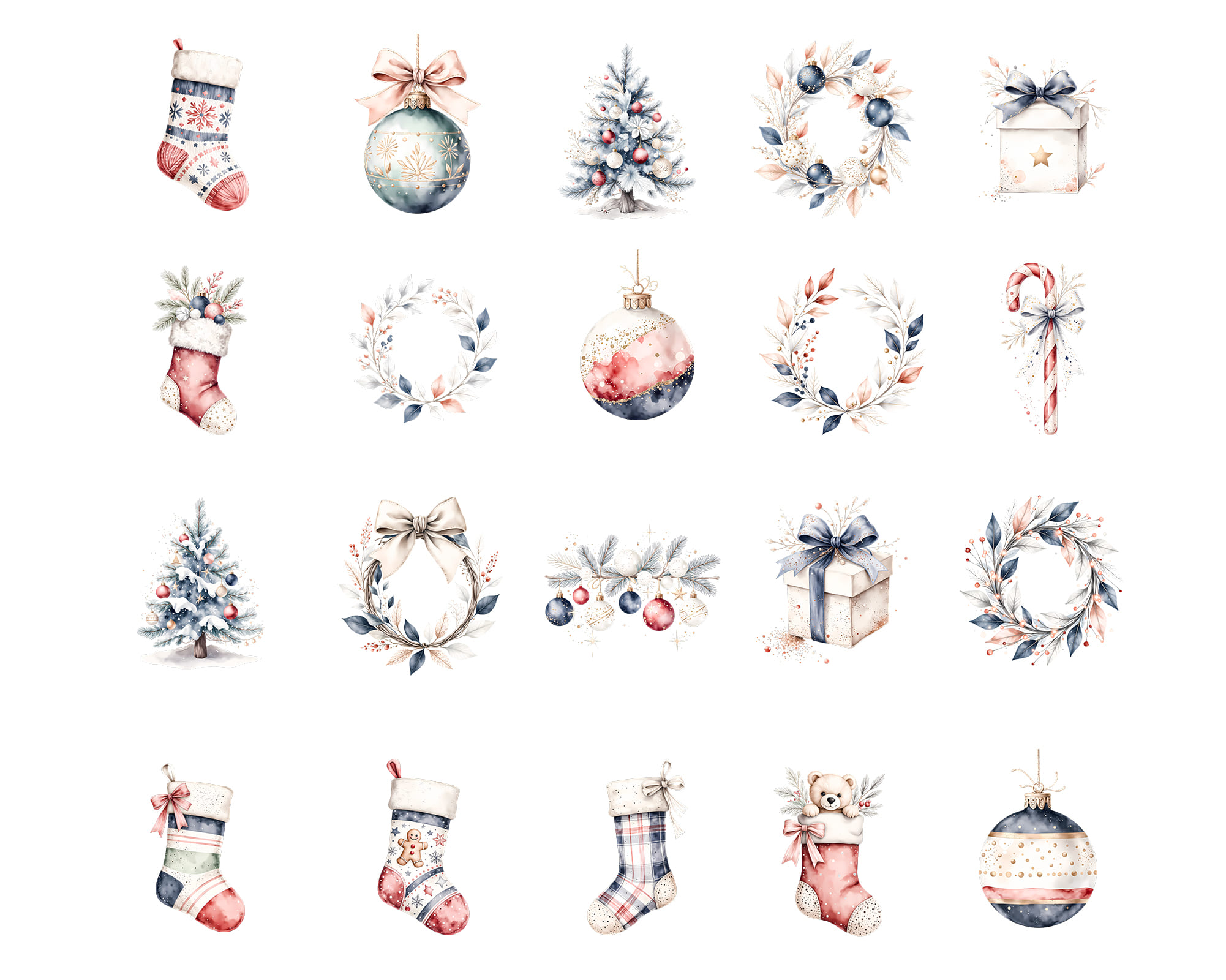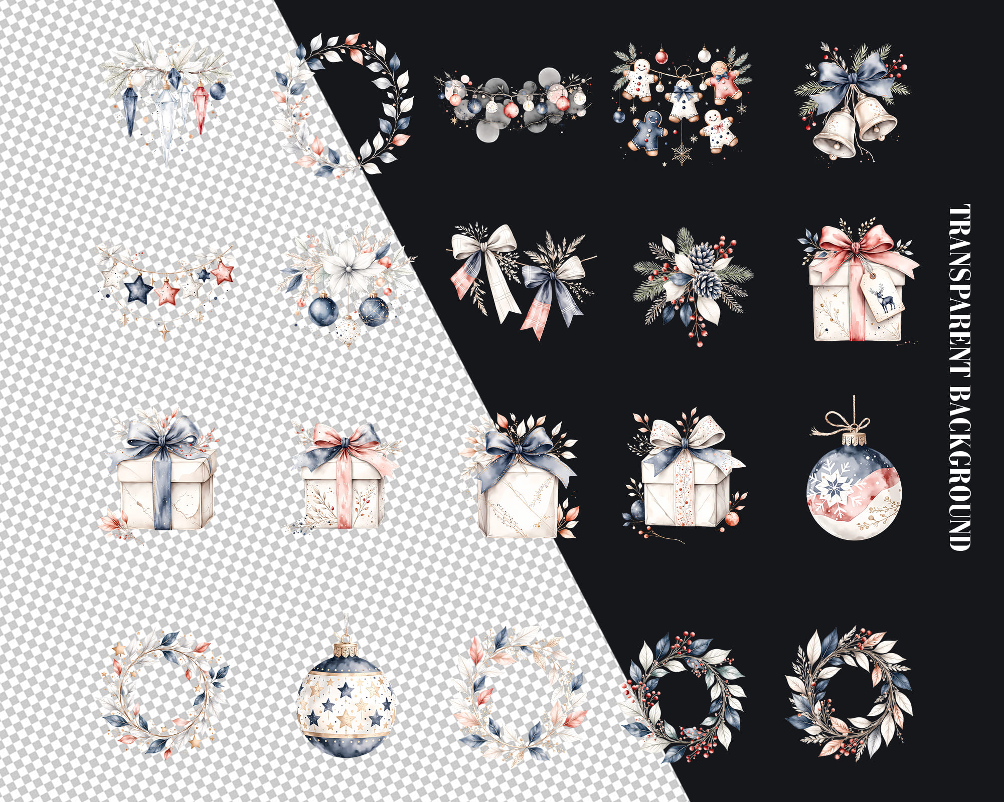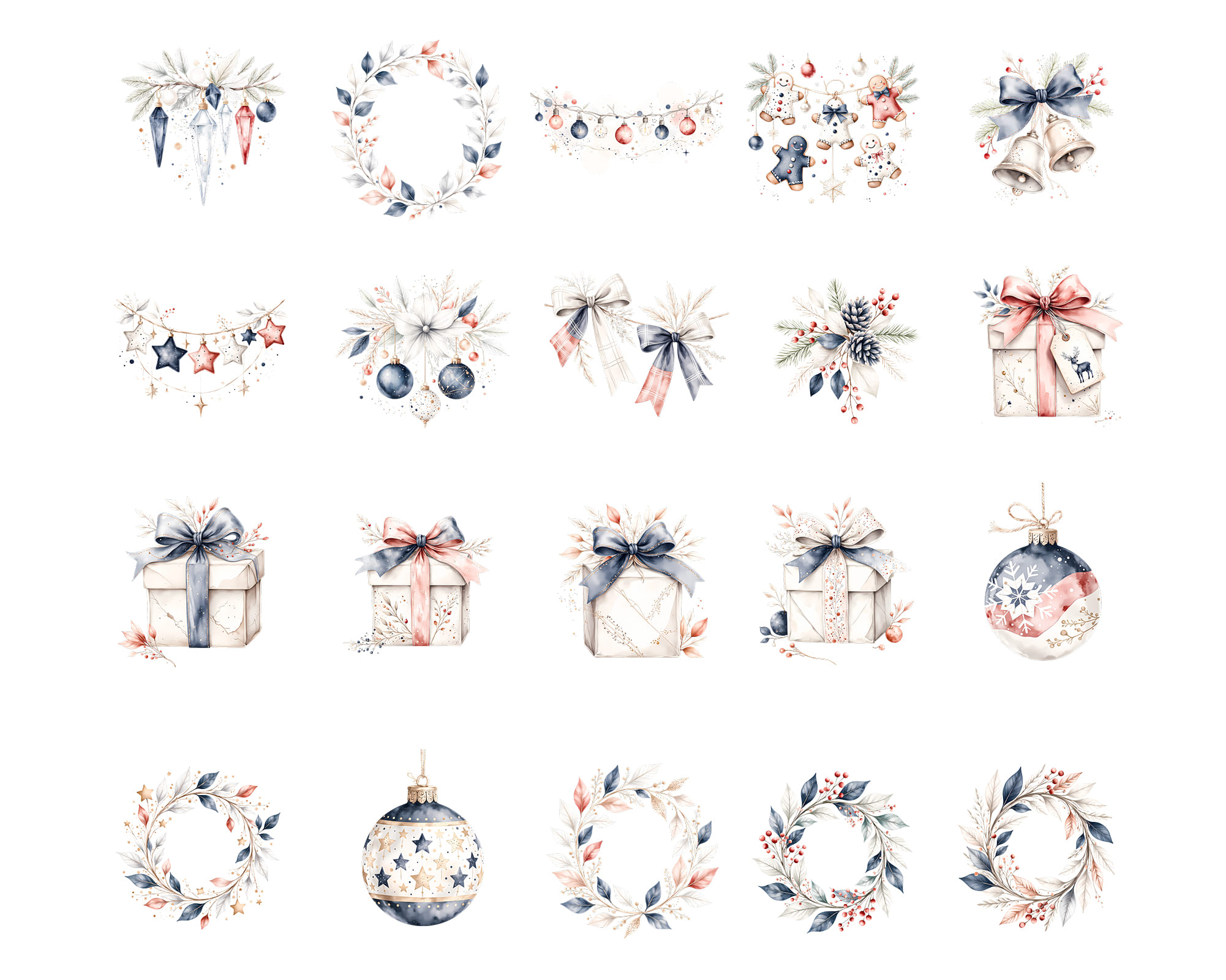 A cozy Blue Christmas Decorations clipart collection featuring 100 PNG illustrations in soft winter tones. This set includes ornaments, stockings, mittens, candles, gifts, wreaths, birds, gingerbread, candy canes, trees, and festive florals perfect for elegant holiday projects. Ideal for Christmas cards, gift tags, planners, stickers, wrapping paper, and printable decor. All graphics come as high-quality transparent PNG files.
