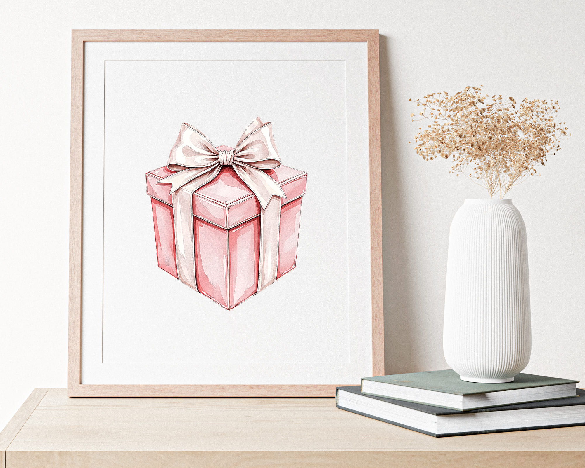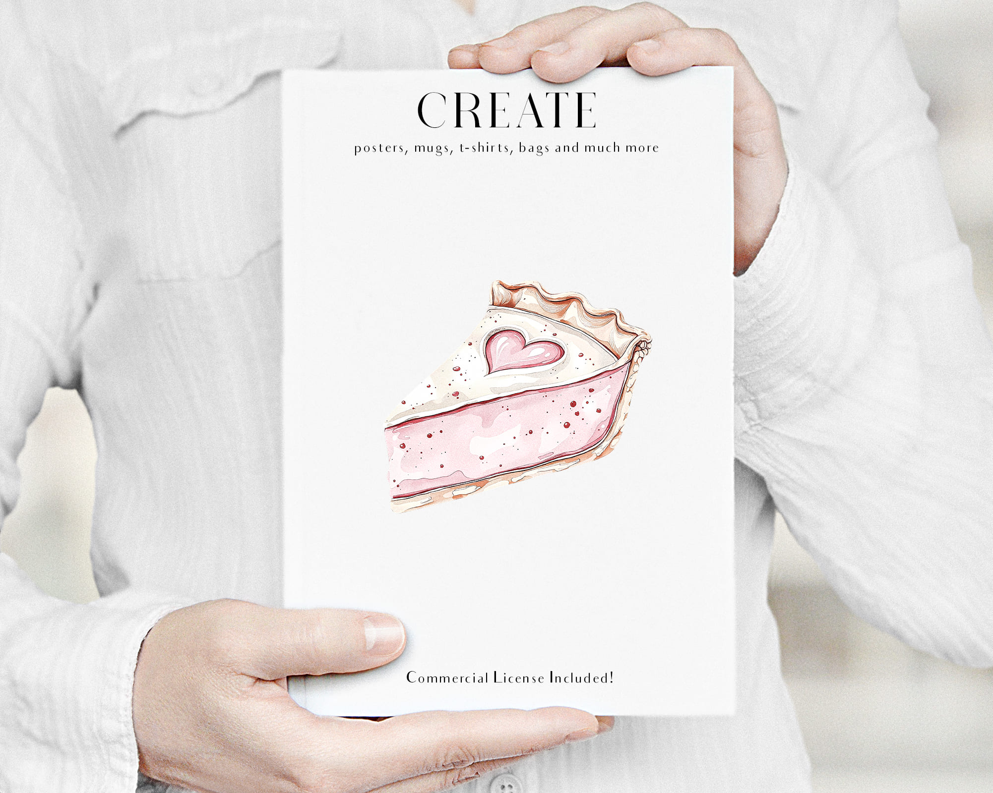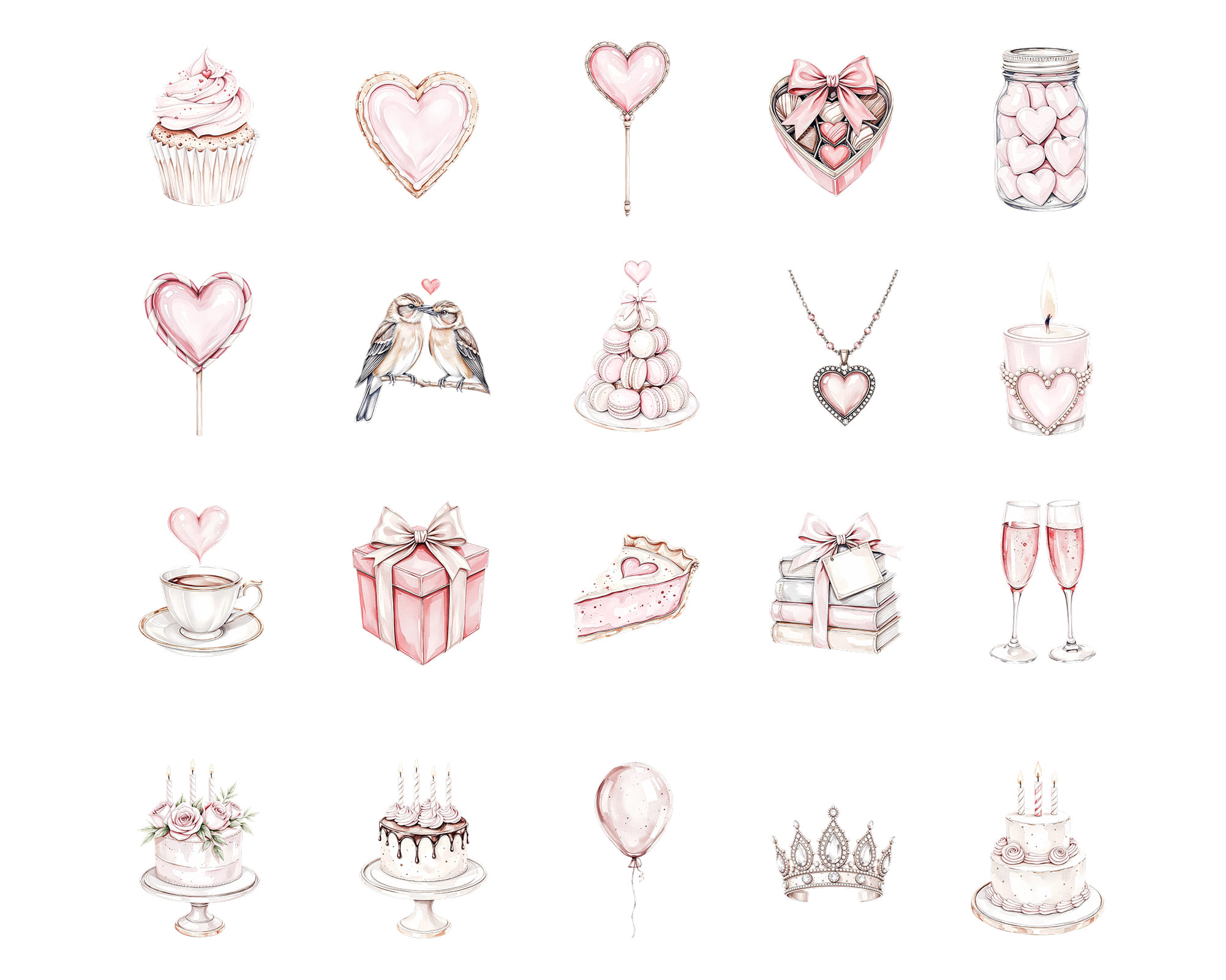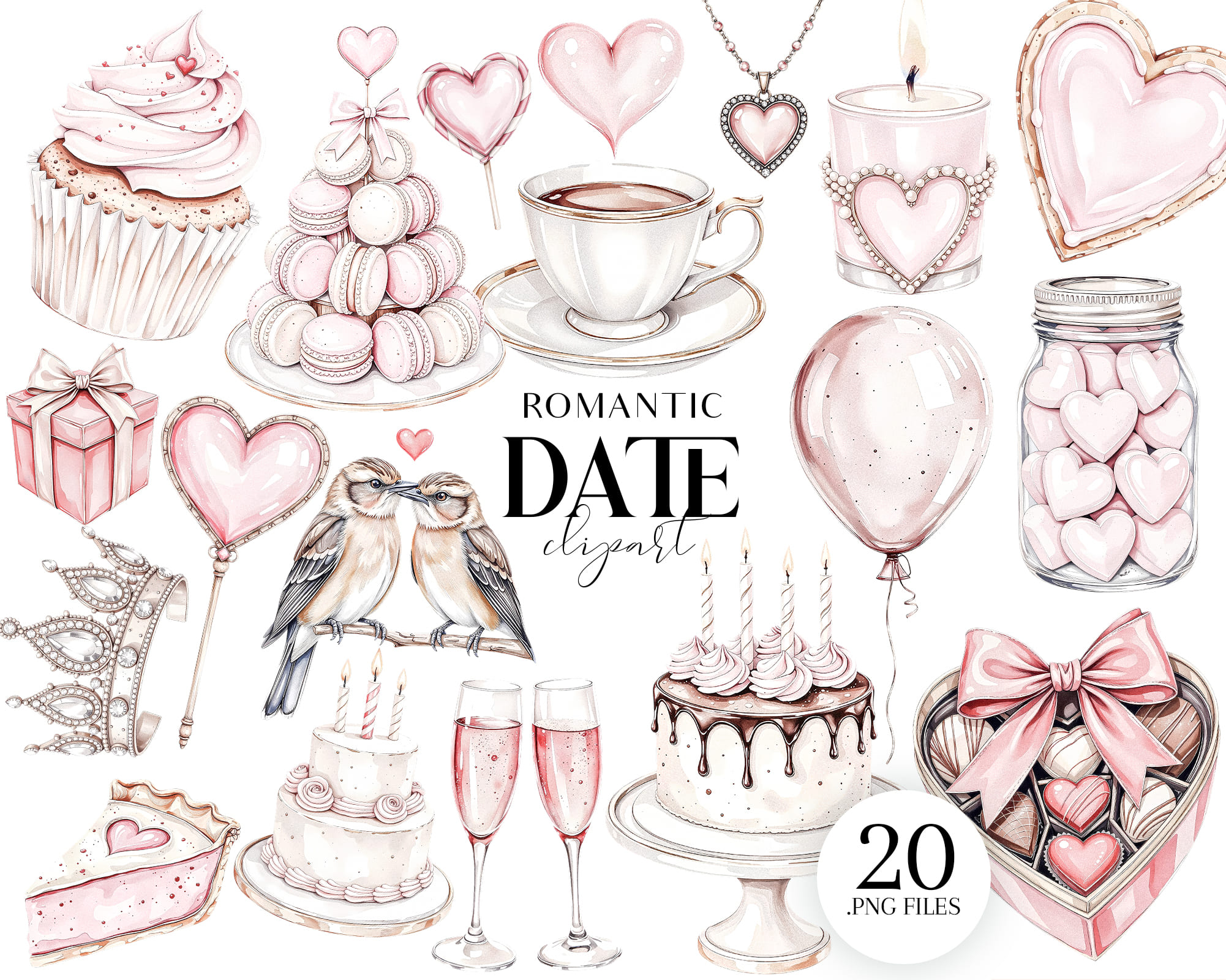 Romantic Date Clipart features 20 sweet PNG illustrations: cakes, cupcakes, heart-shaped gifts, love birds, necklaces, and candies. Transparent background, 300 DPI.