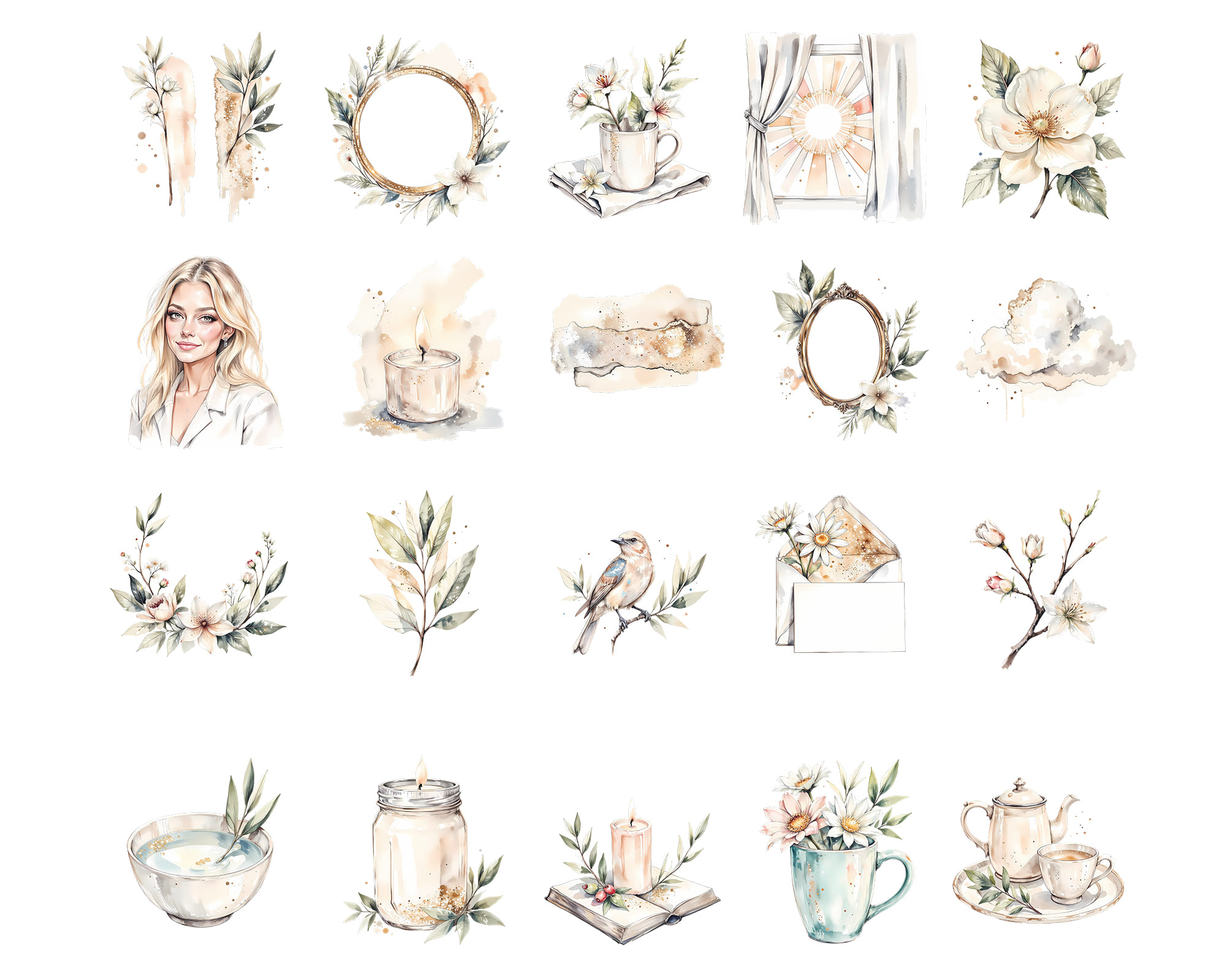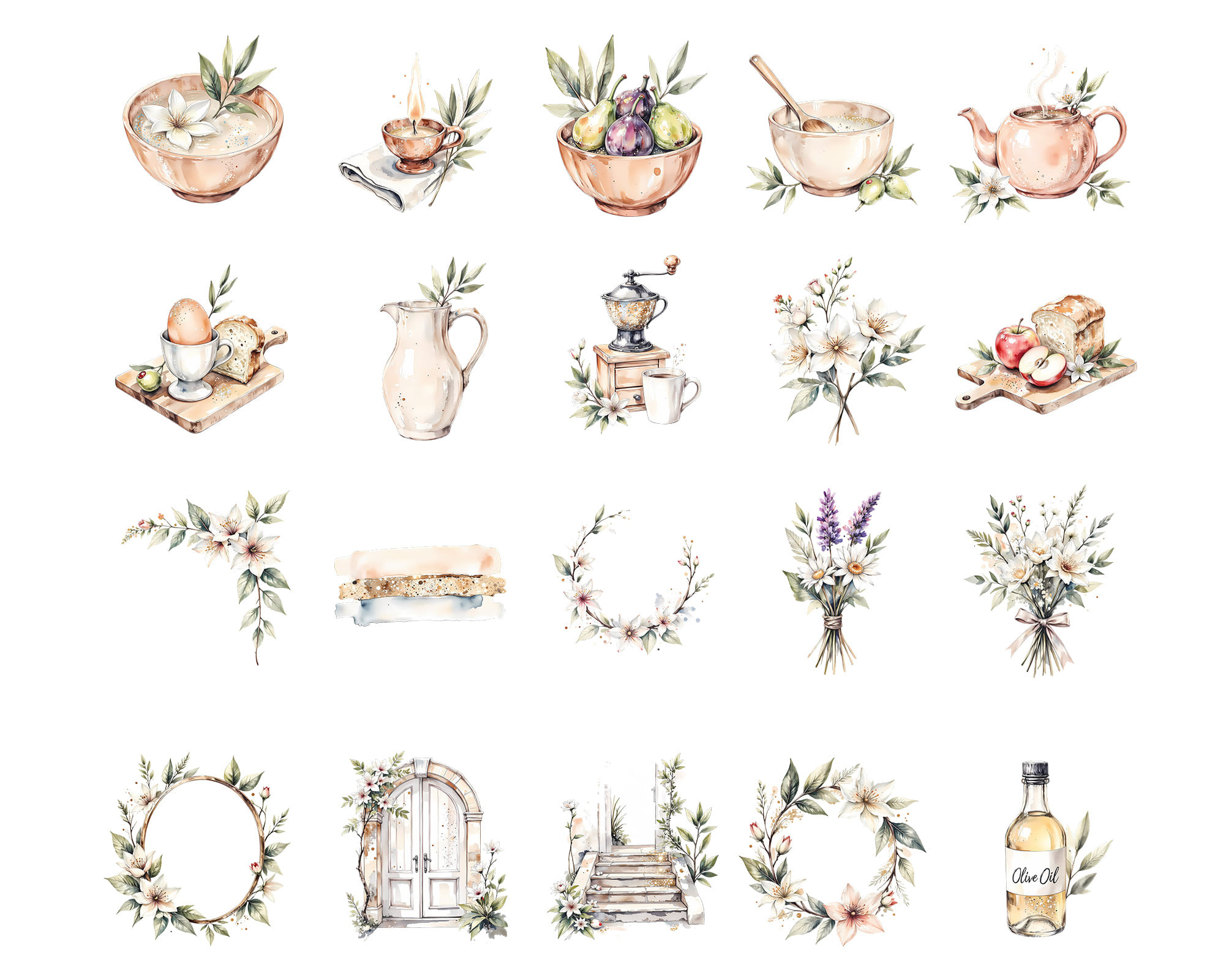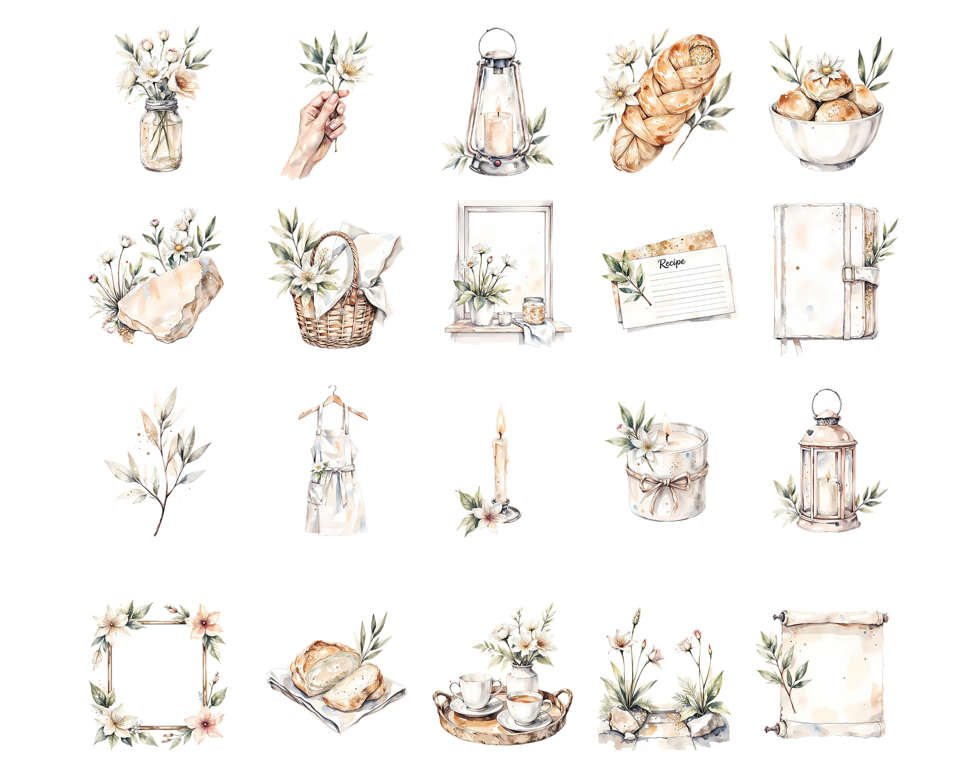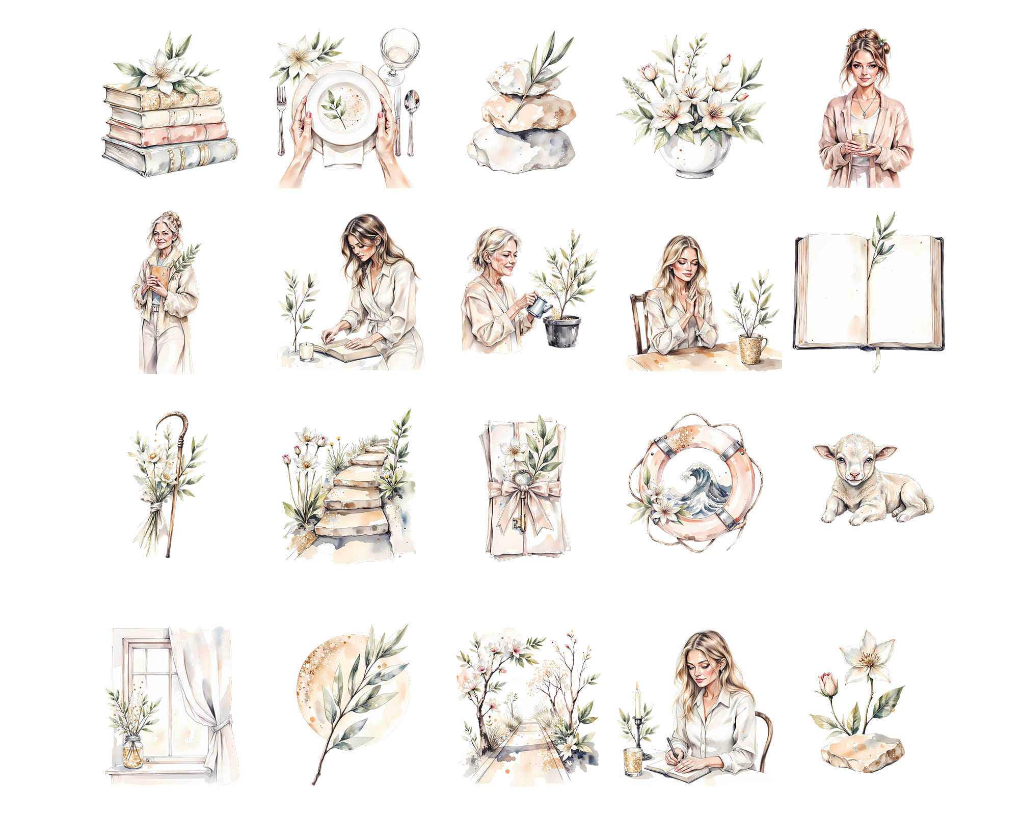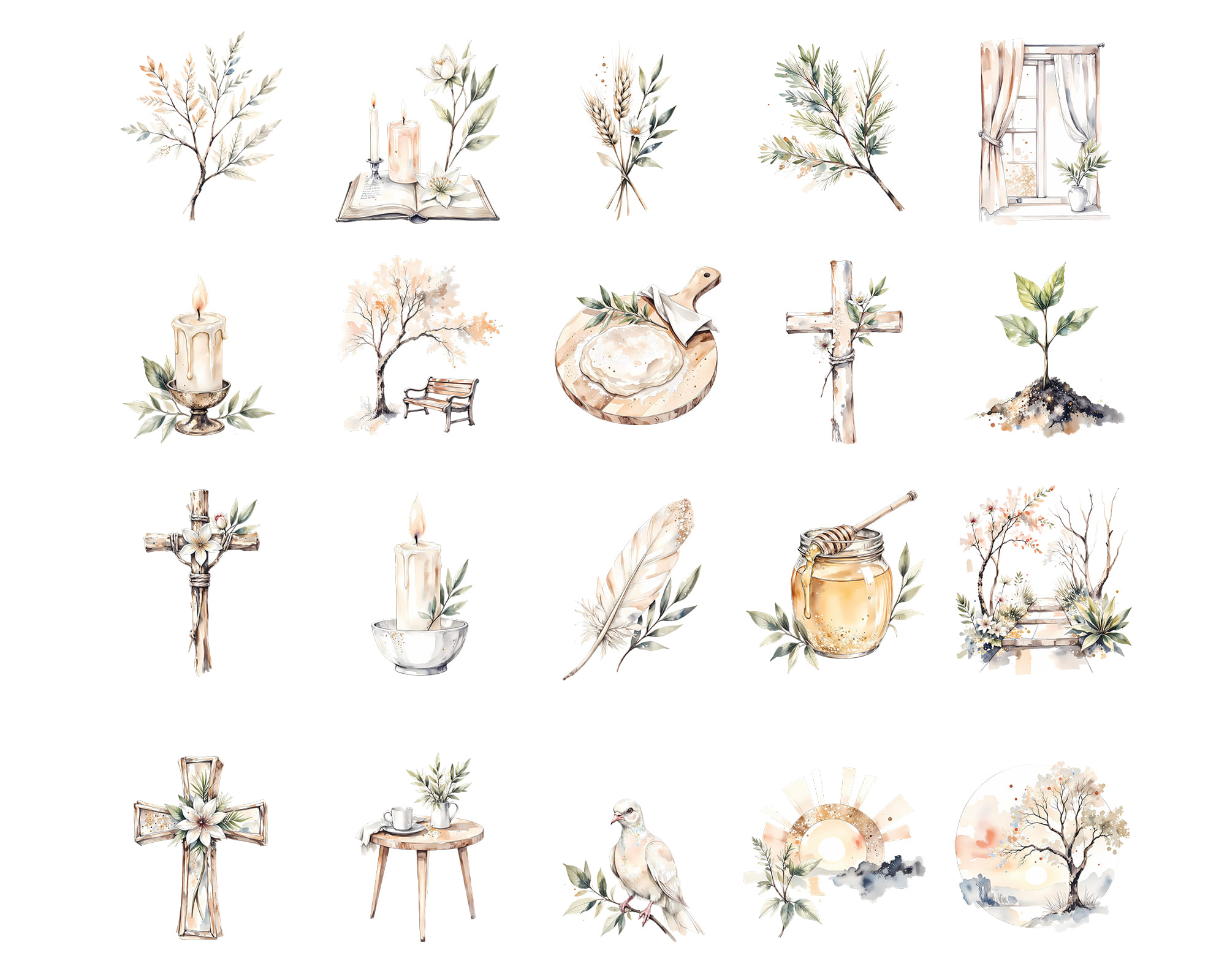 A peaceful 100-piece Christian clipart set in rustic watercolor tones. Includes praying women, olive branches, candles, crosses, lambs, windows, florals, sunlight symbols, doves, bread, olive oil, and biblical decorative elements. Perfect for Bible journaling, Sunday school printables, church projects, posters, devotionals, and inspirational art.