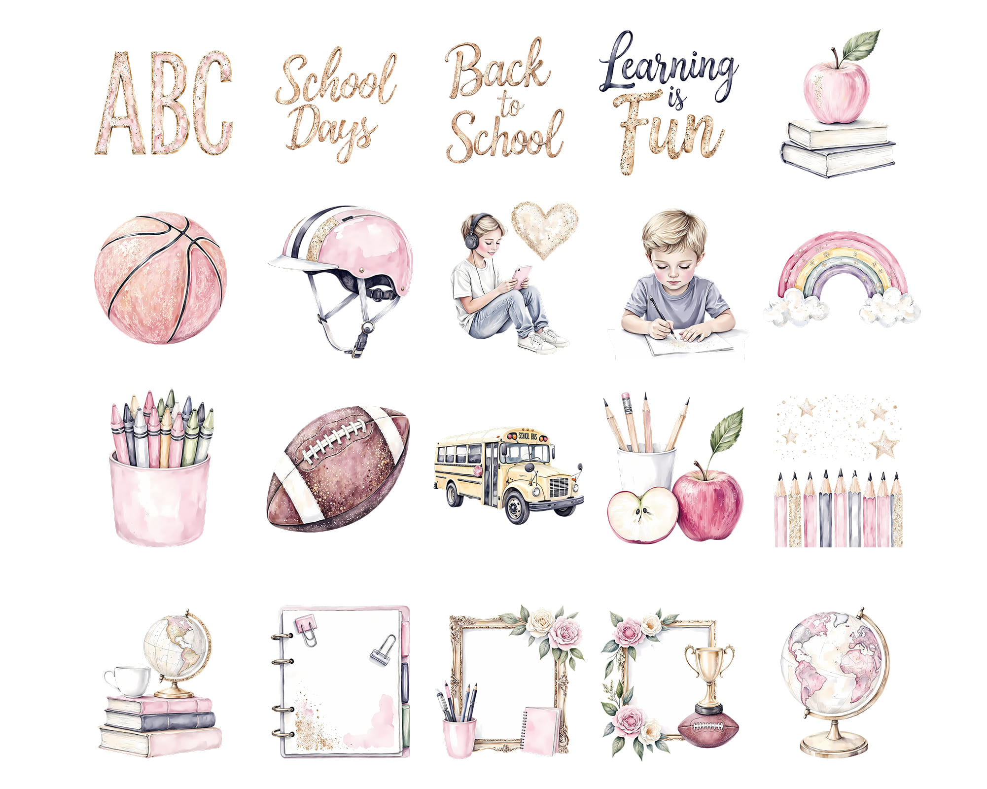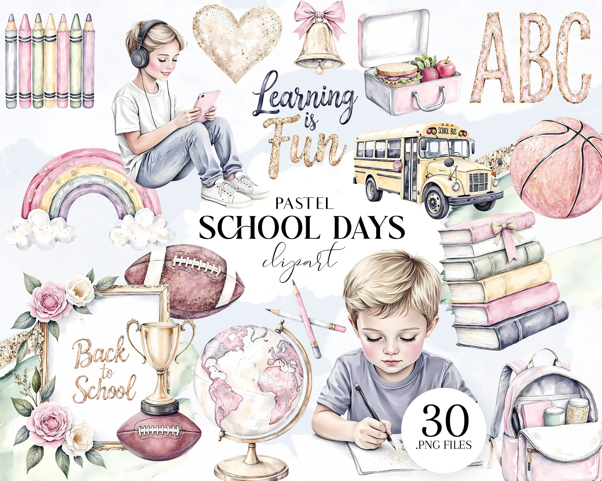 Bring school memories to life with this pastel clipart set! Featuring adorable kids studying, ABC letters, books, helmets, and fun school quotes, this bundle is perfect for teacher resources, classroom decor, scrapbooking, planners, and back-to-school crafts. Includes 30 high-quality PNG files with transparent background for easy use in any project.