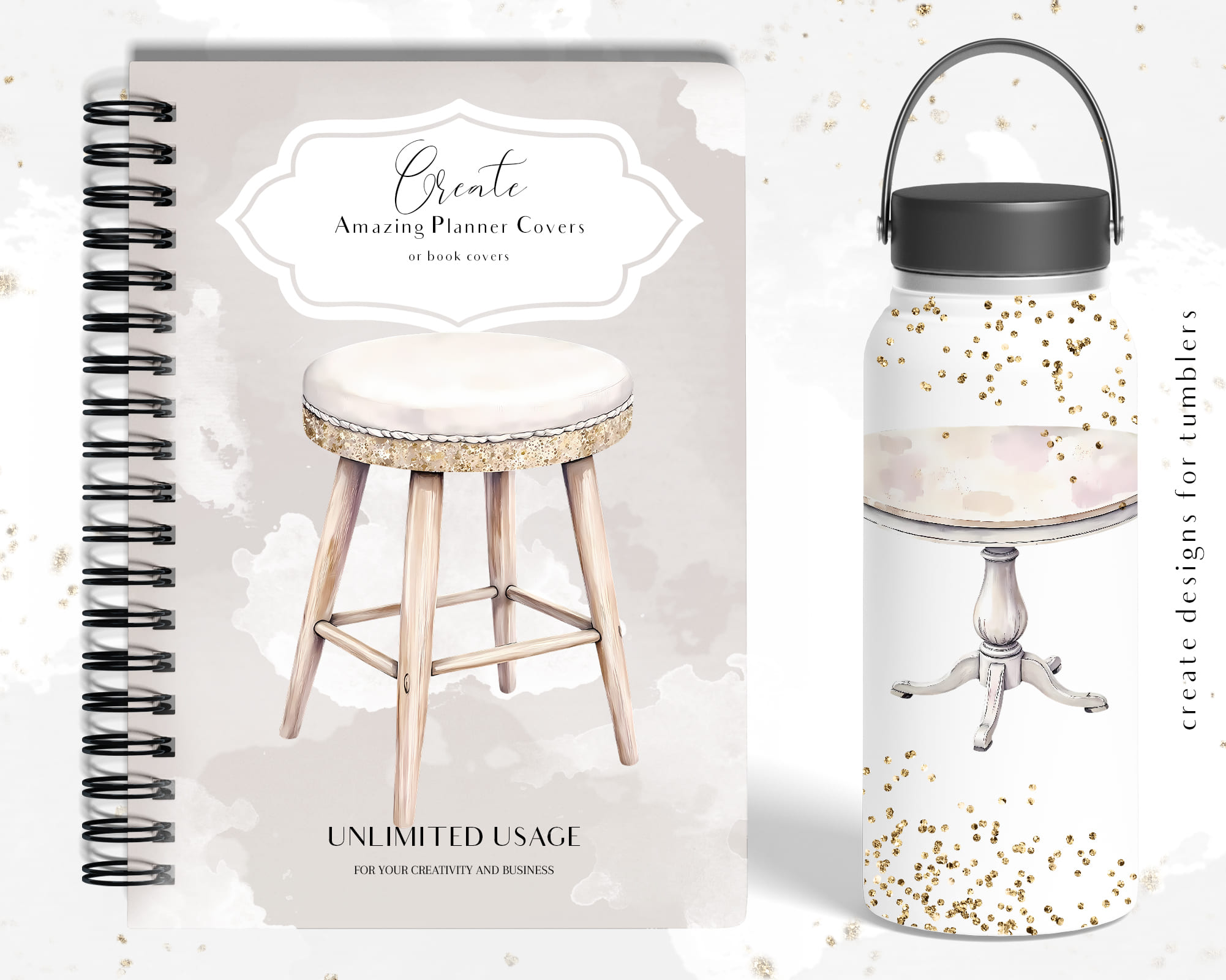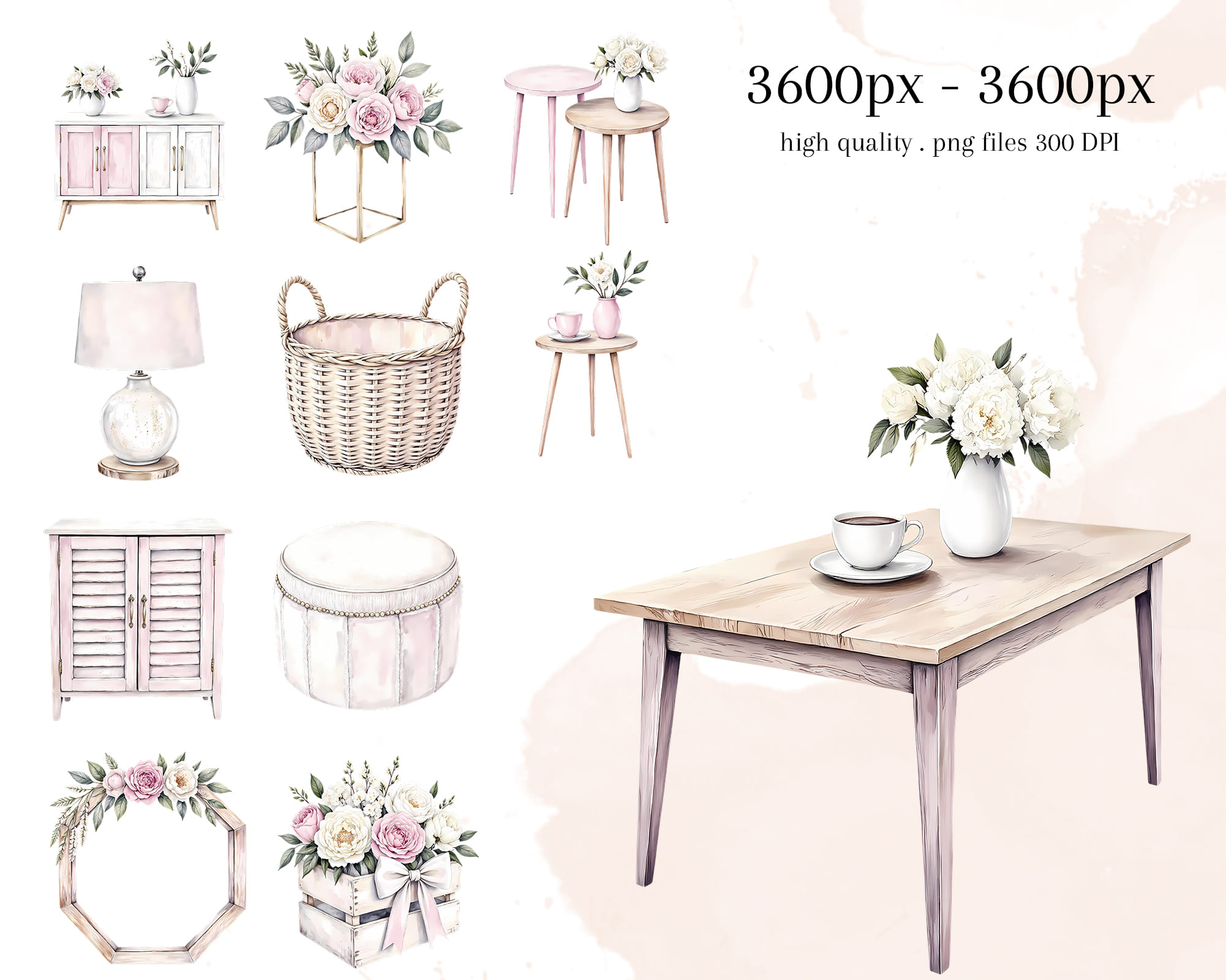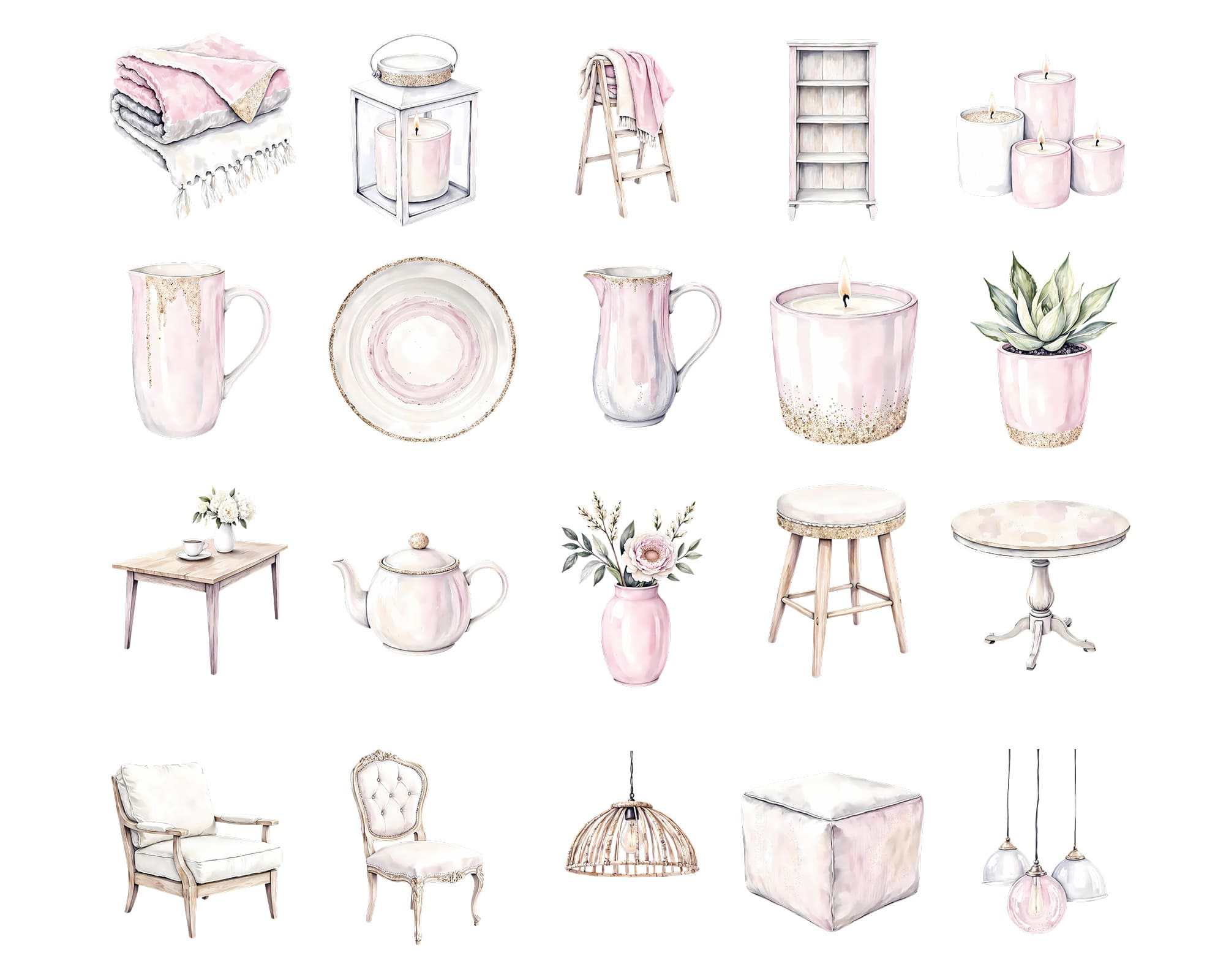 Cozy Shabby Chic Home clipart set with vintage furniture, candles, blankets, vases, plates, shelves, and decorative details. Perfect for interior design projects, home decor planners, scrapbooking, wedding stationery, and DIY crafts. Includes 30 PNG files with transparent backgrounds.