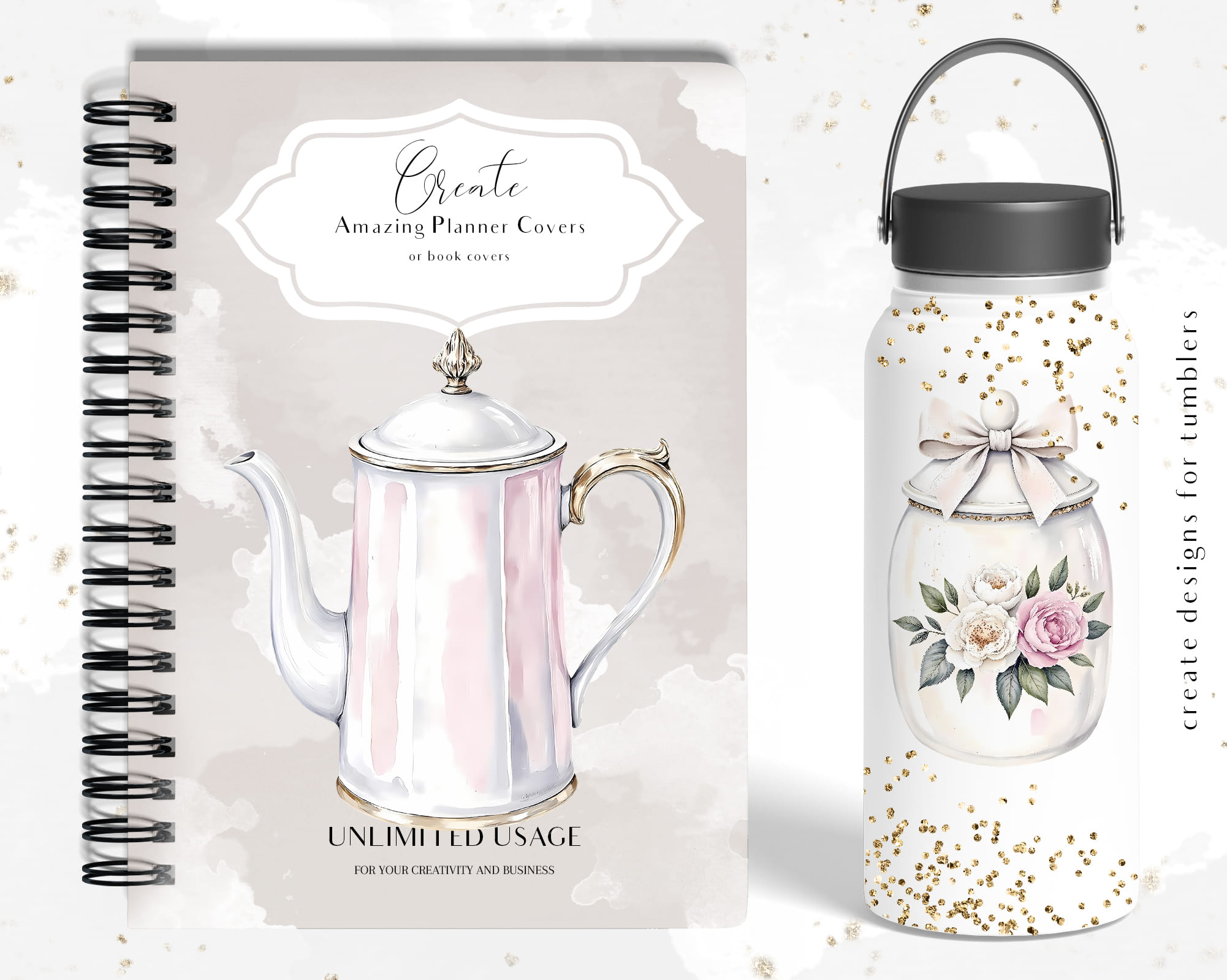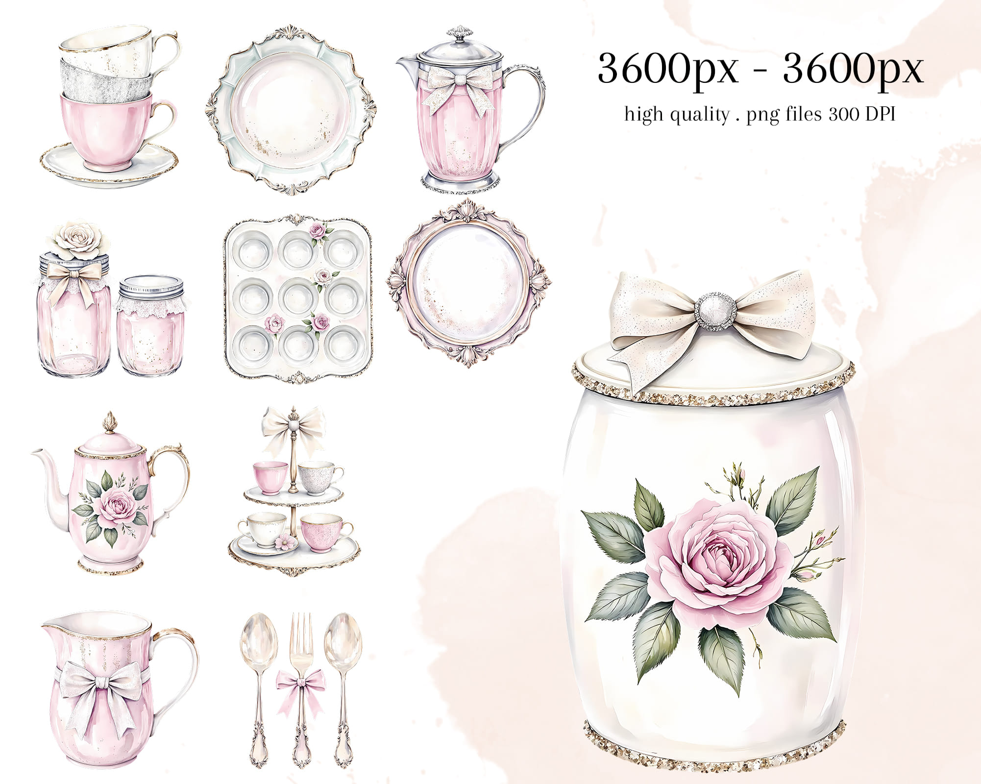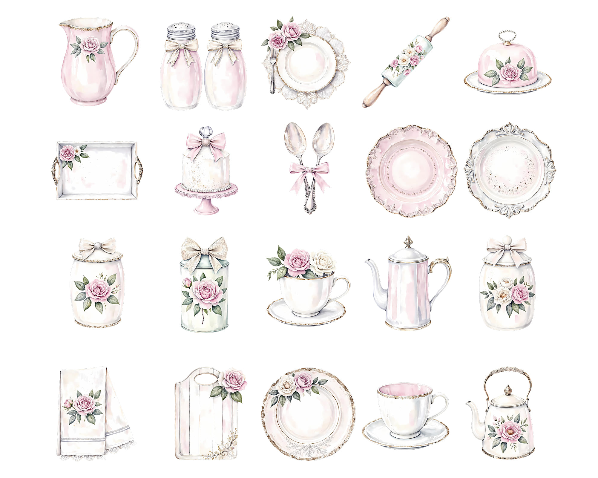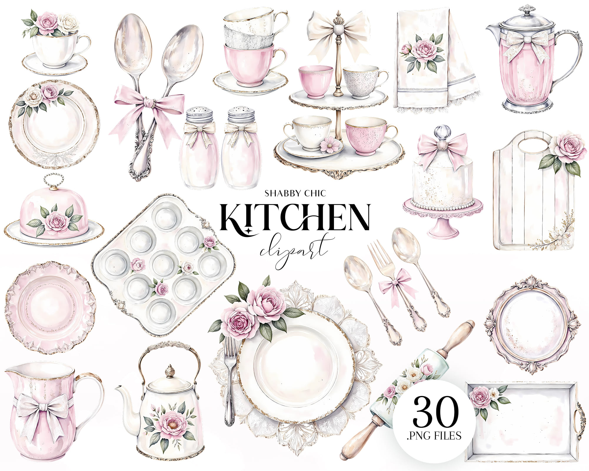 Beautiful pastel Shabby Chic Kitchen clipart set with plates, teapots, pitchers, spoons, cakes, salt shakers, rolling pin, and floral accents. Perfect for kitchen decor, recipe cards, planners, scrapbooking, and farmhouse crafts. Includes 30 PNG files with transparent backgrounds.
