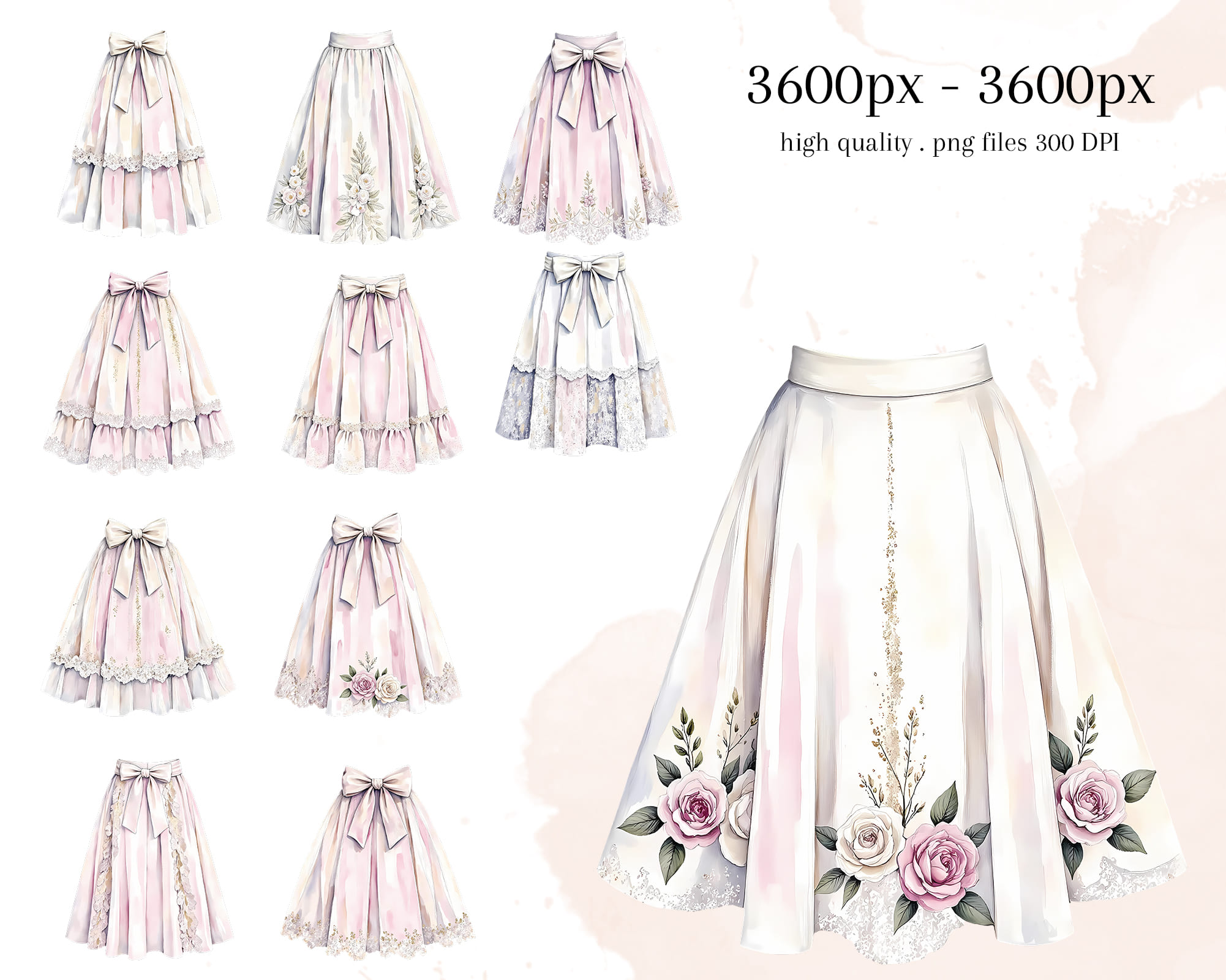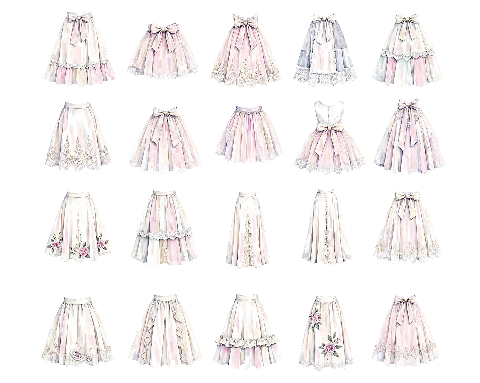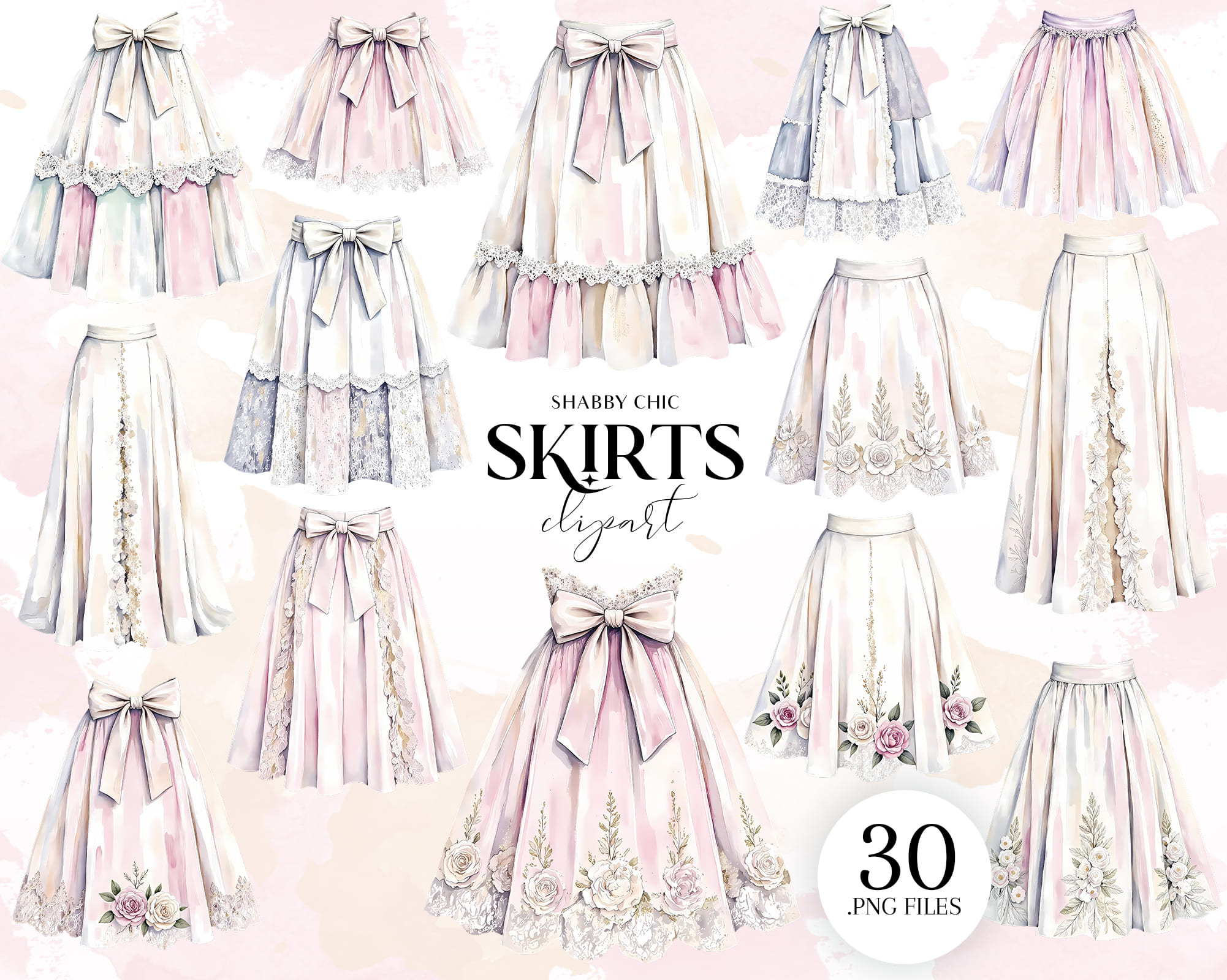 Romantic pastel Shabby Chic Skirts clipart set featuring vintage skirts, dresses, lace, bows, and floral designs. Perfect for fashion projects, scrapbooking, sewing crafts, wedding stationery, and DIY decor. Includes 30 PNG files with transparent backgrounds.