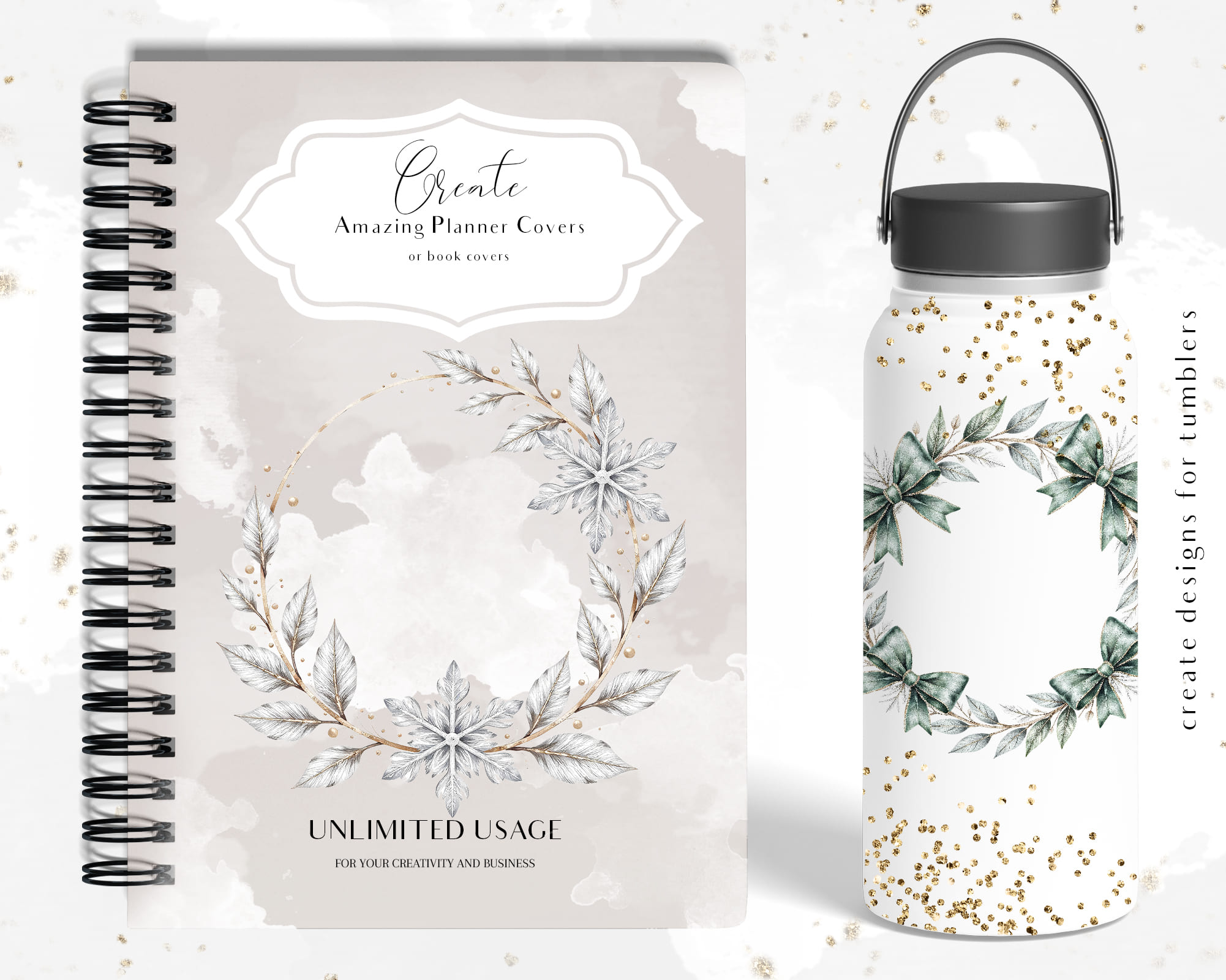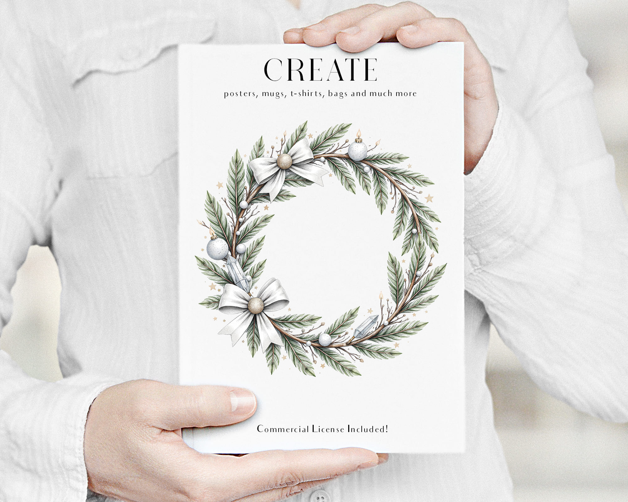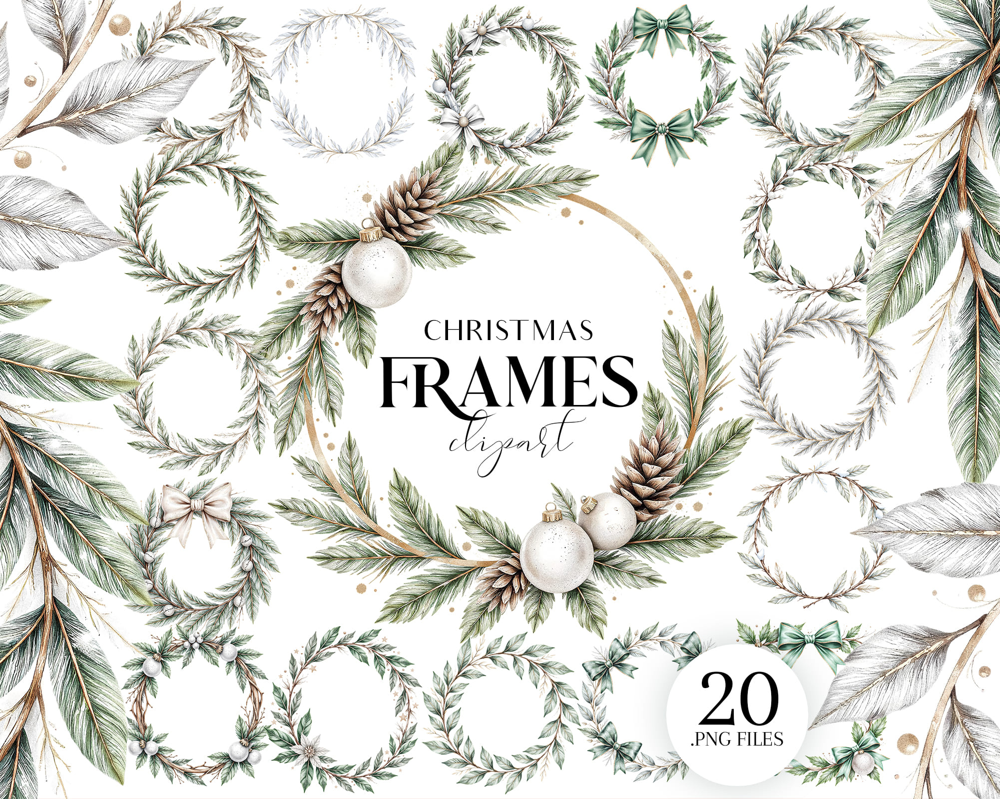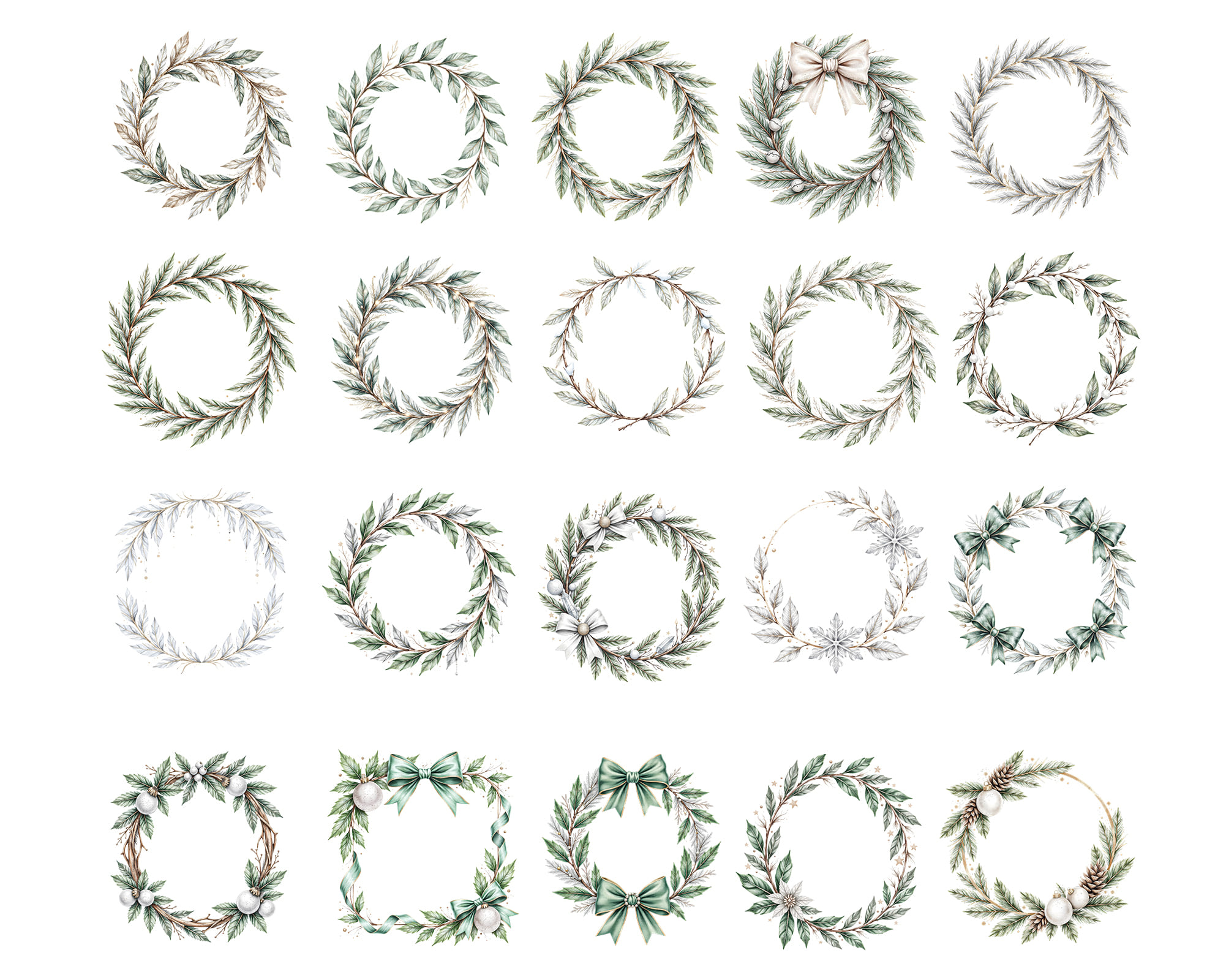 Christmas Frames Clipart set includes 20 unique silver and ornament wreath designs in PNG format. All images are high resolution (300 DPI) with transparent backgrounds, ready to use for digital or print projects.