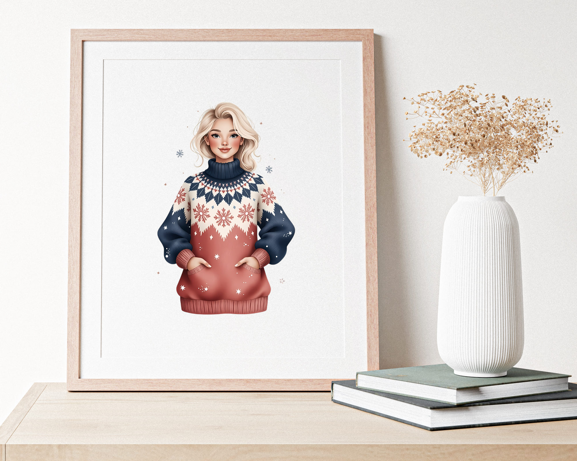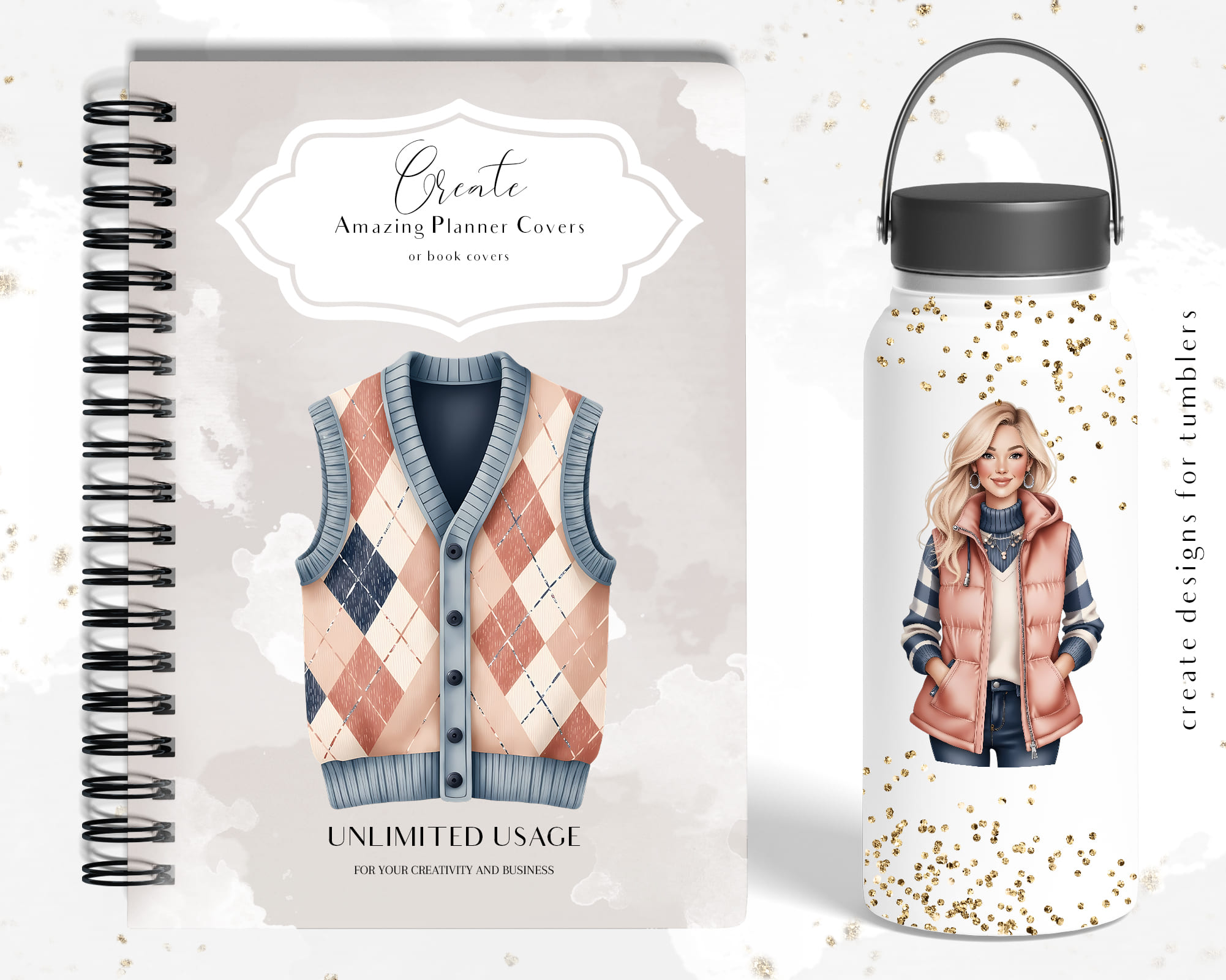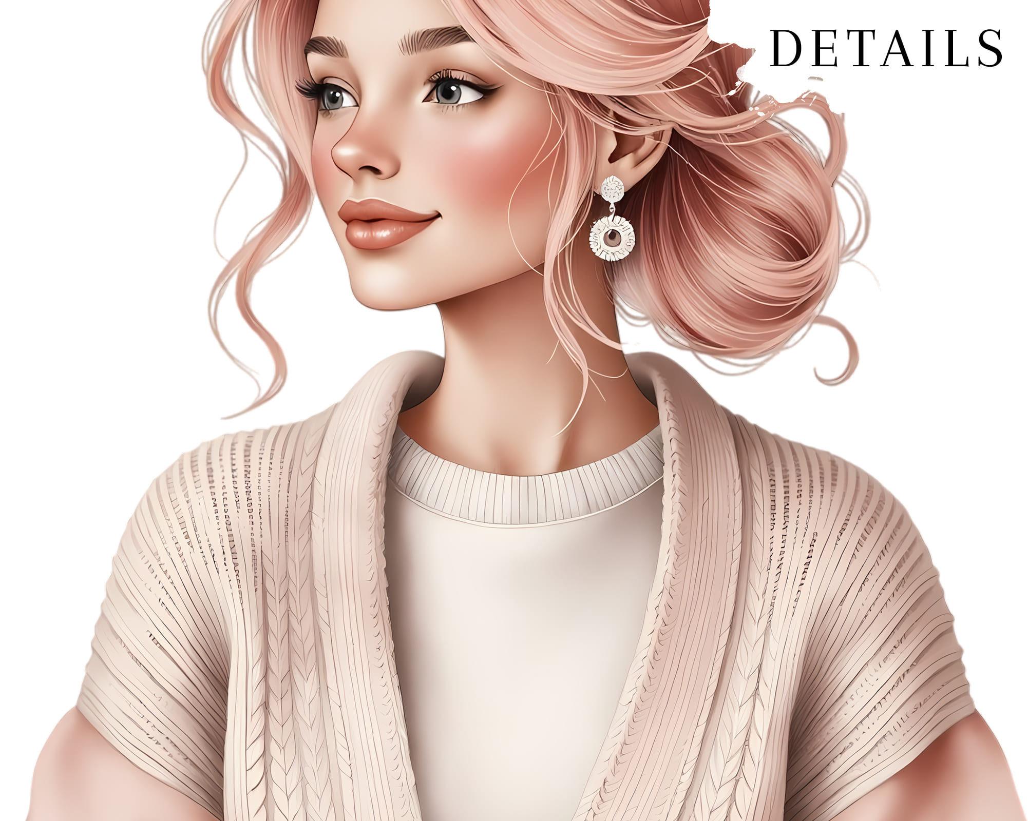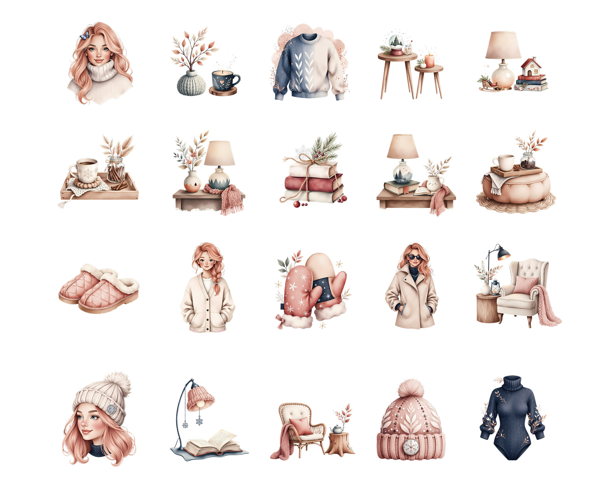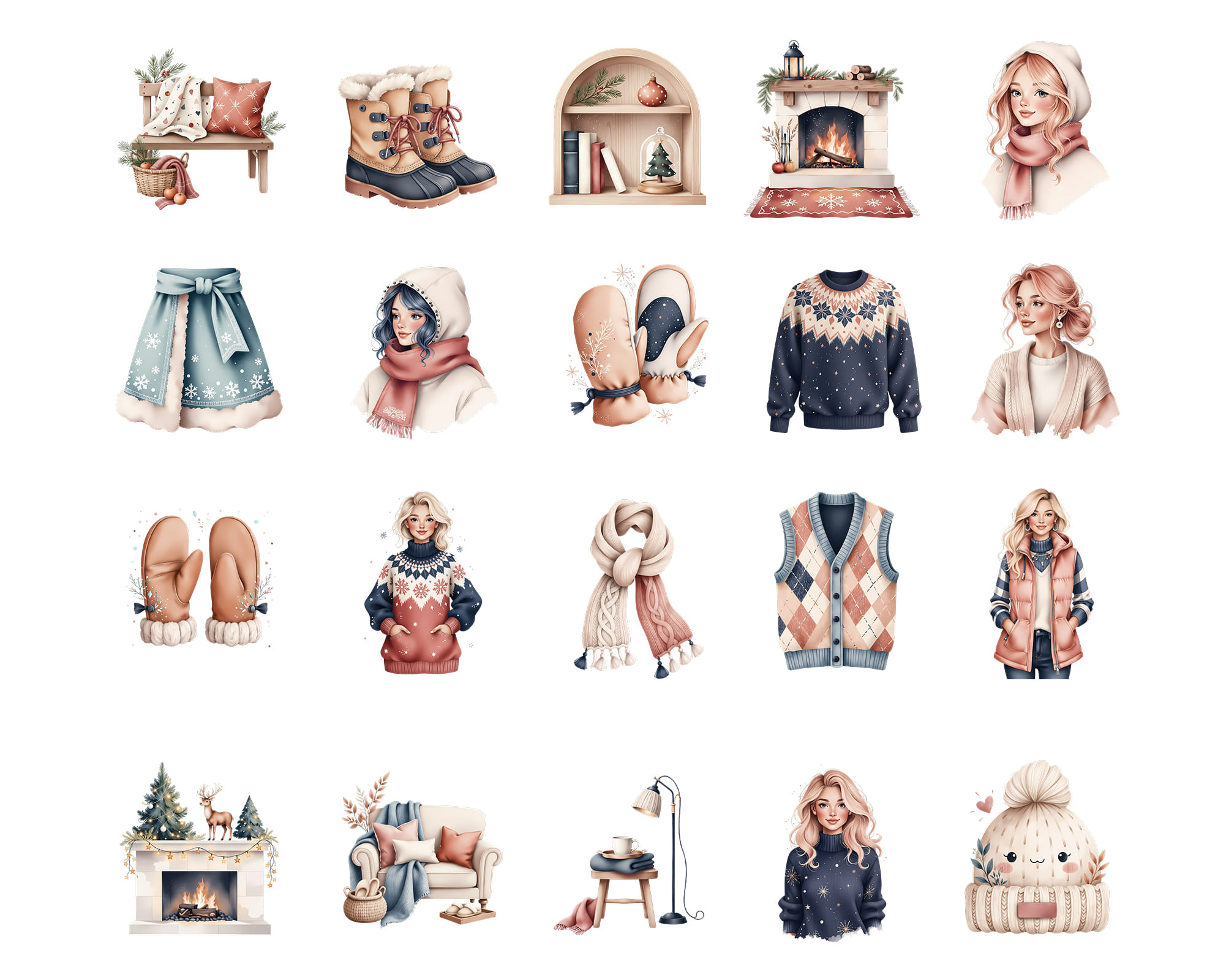 A soft and elegant Dreamy Winter clipart set featuring 50 warm seasonal PNG illustrations. Includes cozy winter girls, sweaters, hats, dresses, boots, gloves, scarves, candles, frames, decorations, and cottage-style home accents. Perfect for winter fashion projects, planners, stickers, sublimation designs, printable art, scrapbooking, and holiday branding. All graphics come as high-resolution transparent PNG files.