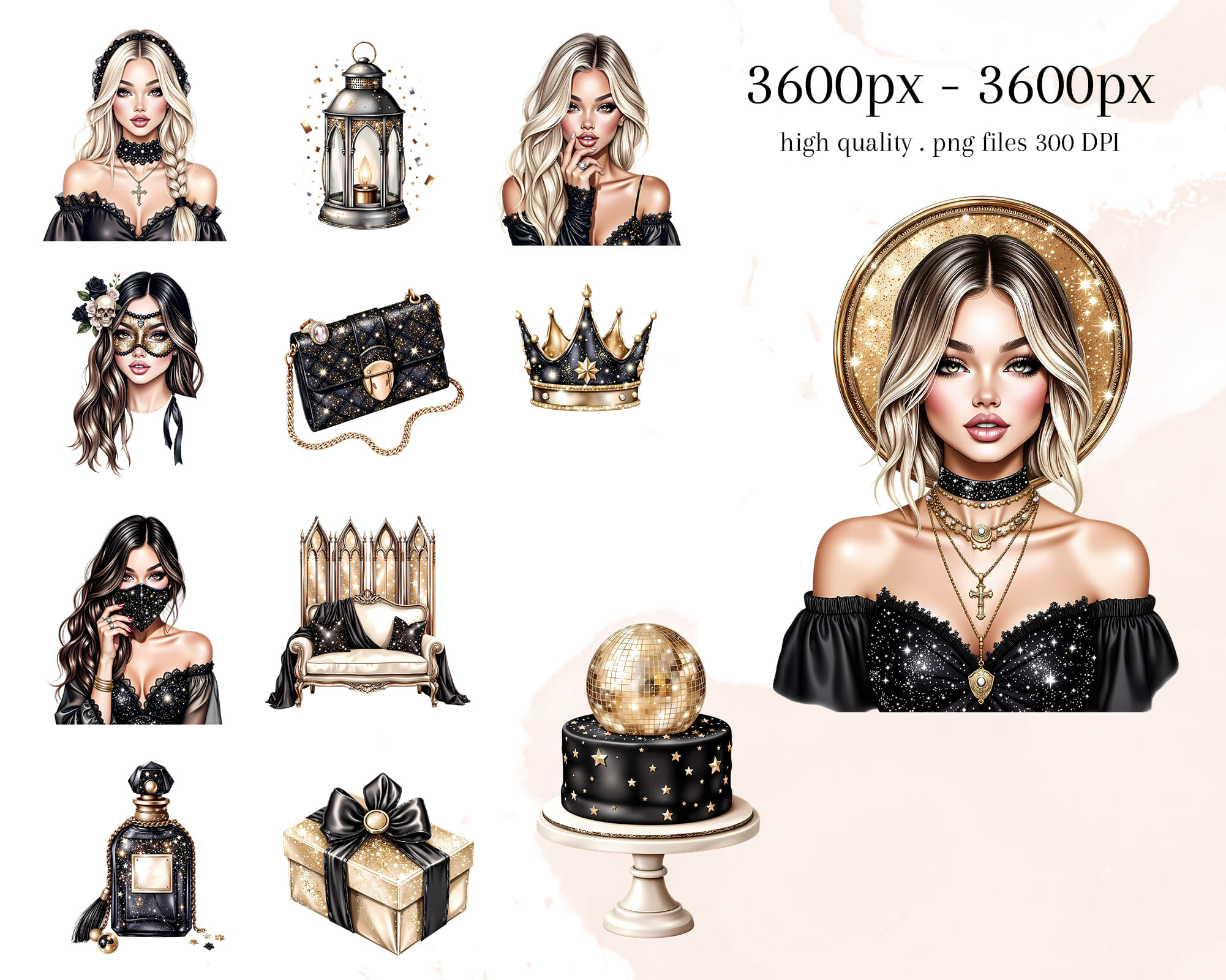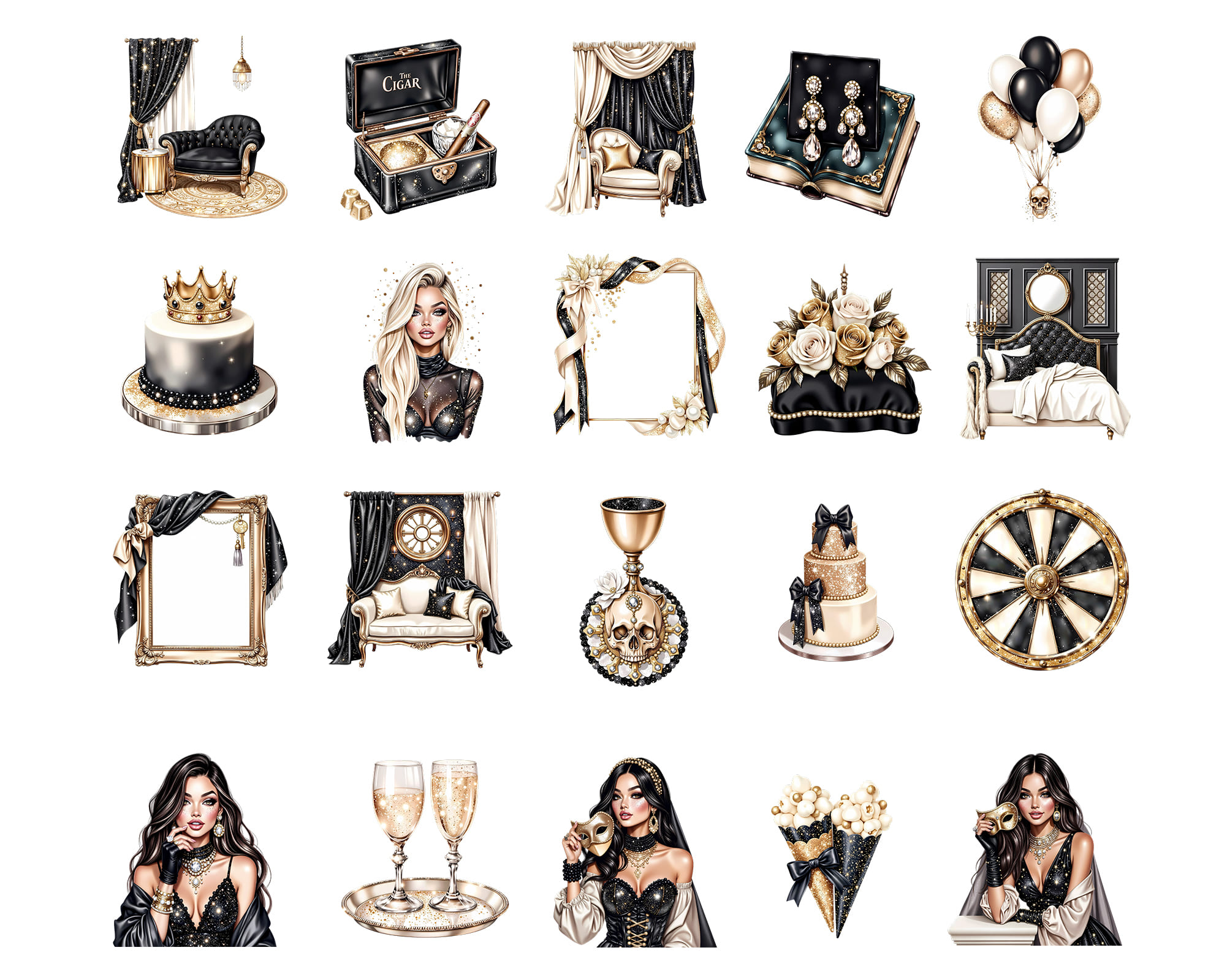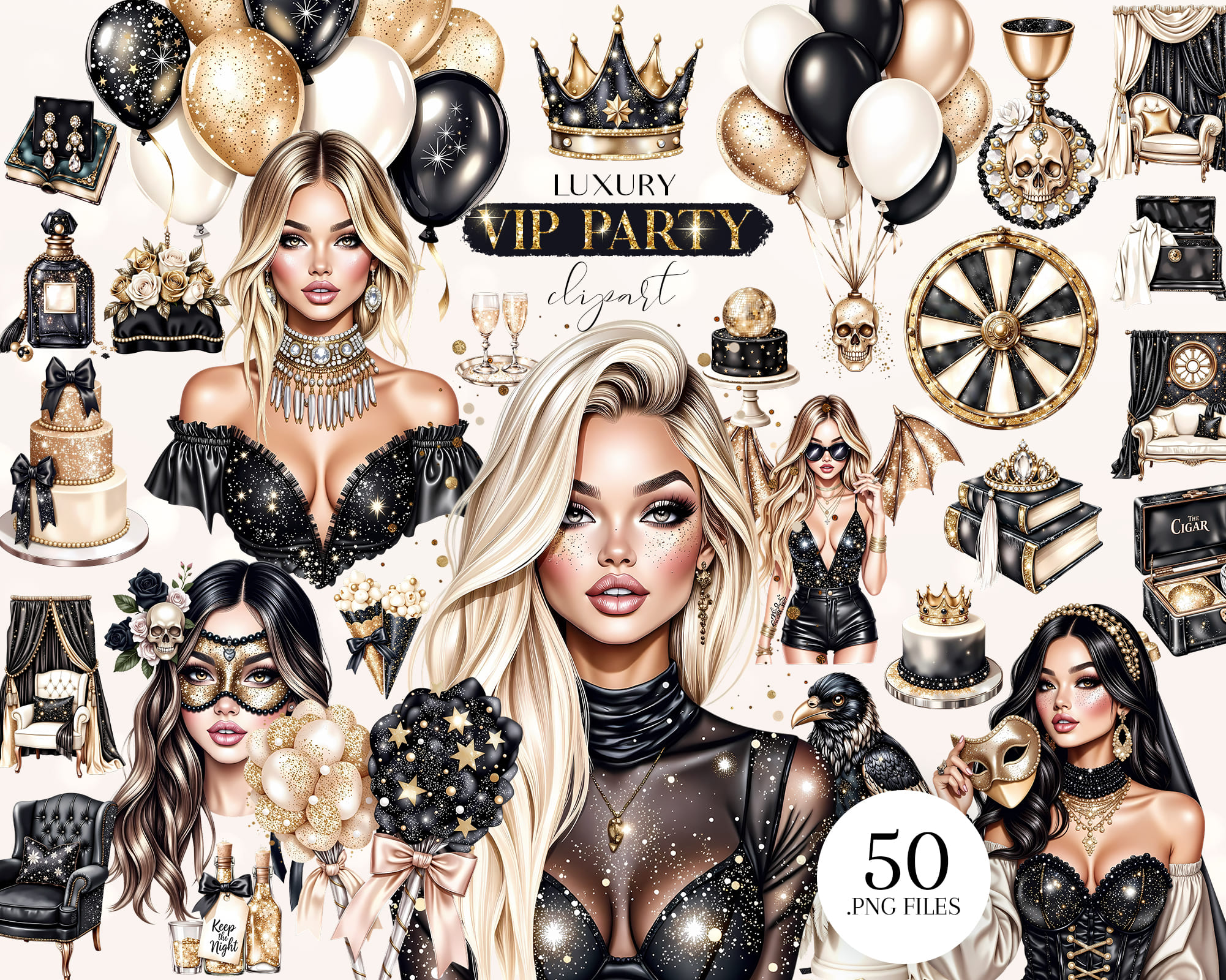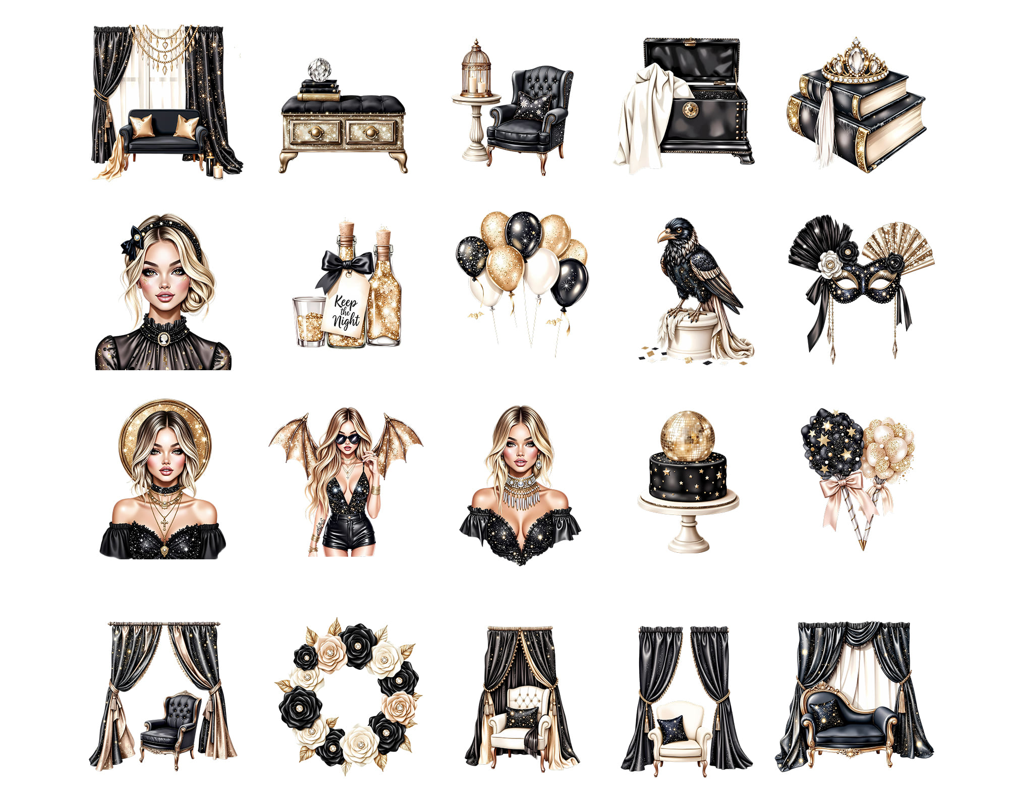 Celebrate in style with the Sparkle Gothic VIP Party Clipart 🥂. Perfect for elegant party scenes, invitations, branding, and chic gothic themes. Includes 50 PNG files with transparent backgrounds.