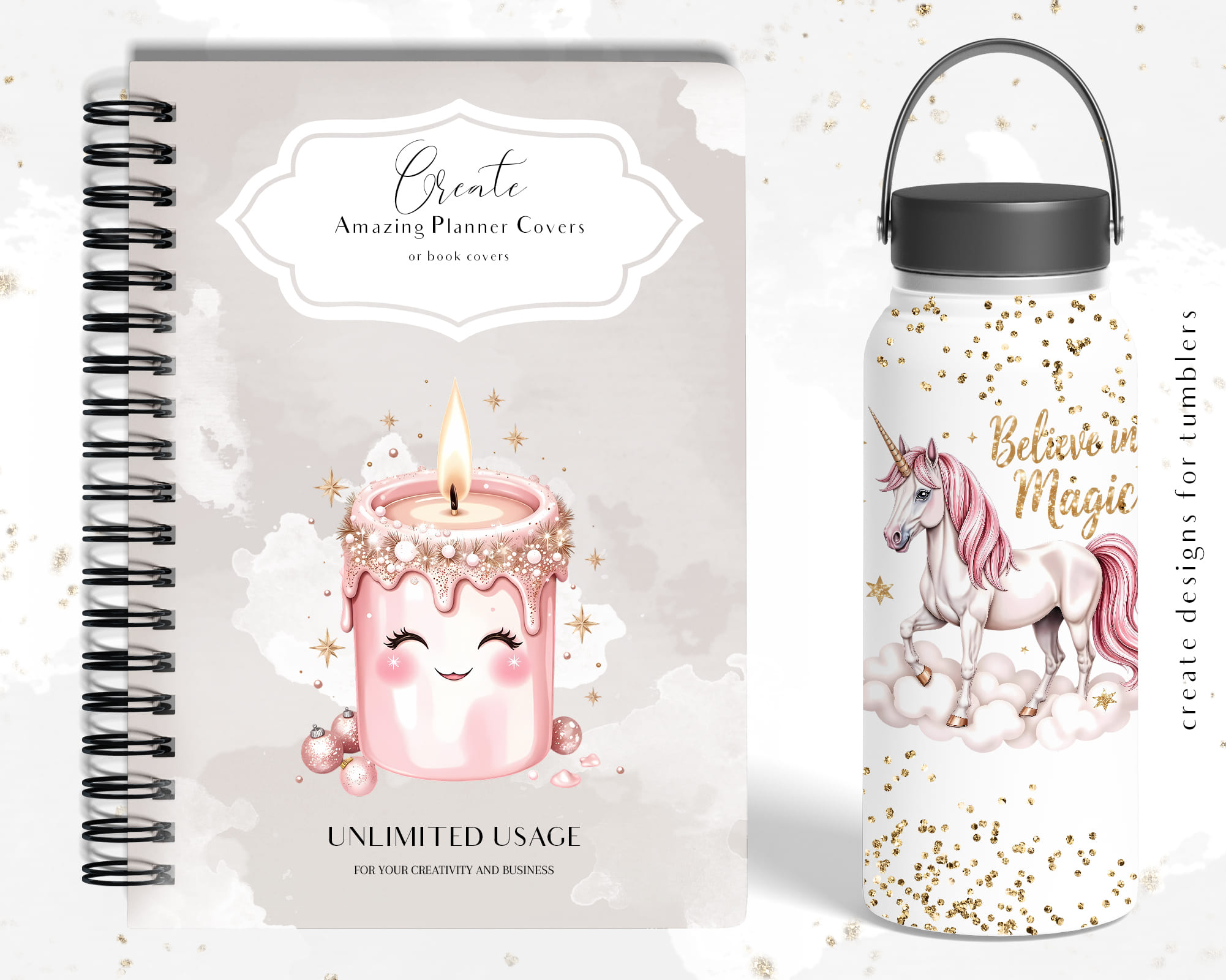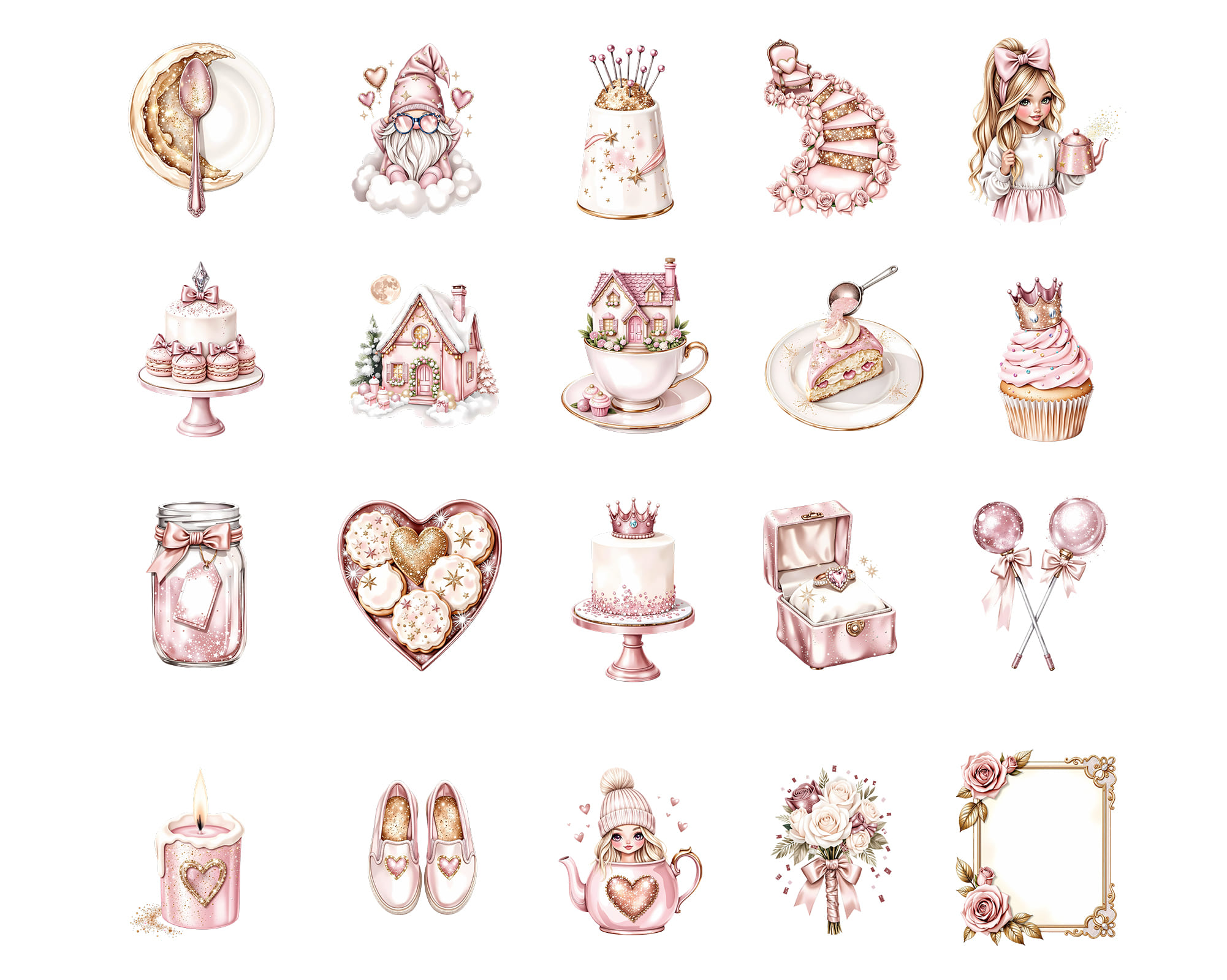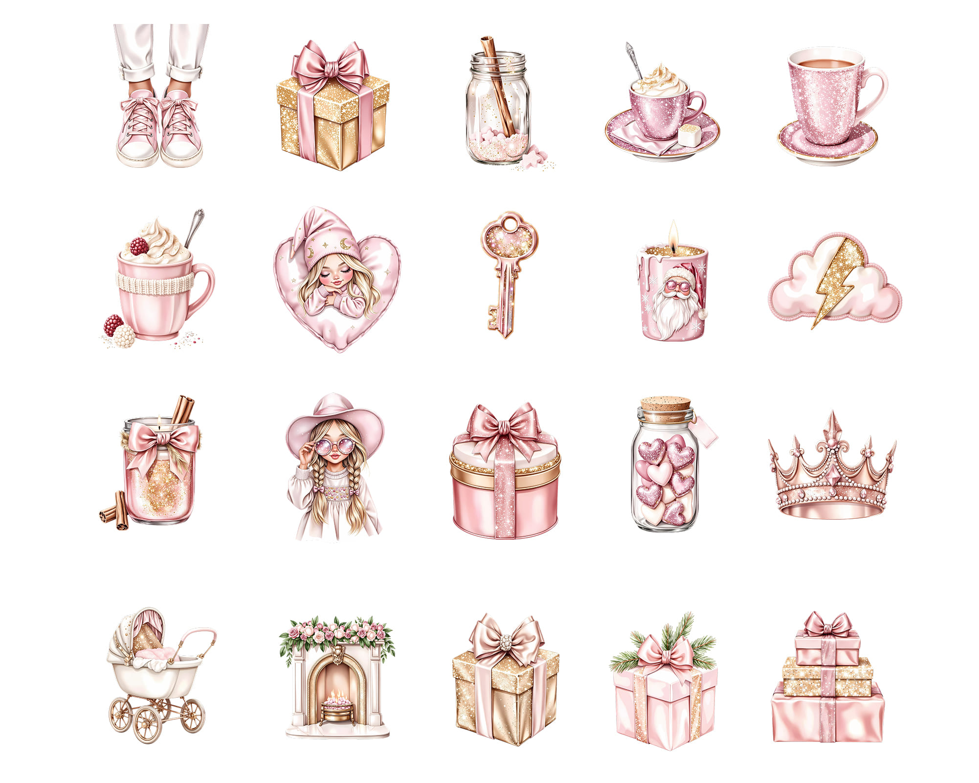 Step into a whimsical pastel world with this feminine Sparkle Pink Dreams clipart set. Includes magical girls, cozy winter fashion, cupcakes, candy, hearts, flowers, unicorns, cottage houses, stars, gifts, sweet treats, stationery accents, and glitter details. Everything is crafted in a dreamy pink palette perfect for soft and aesthetic designs.