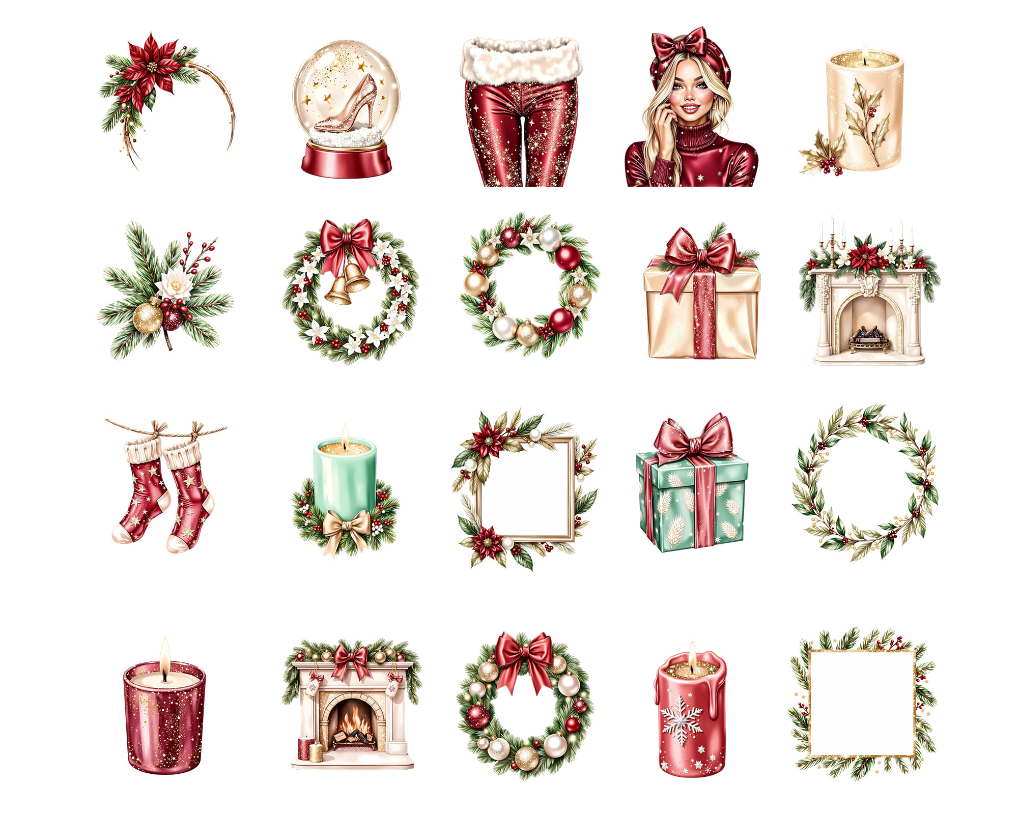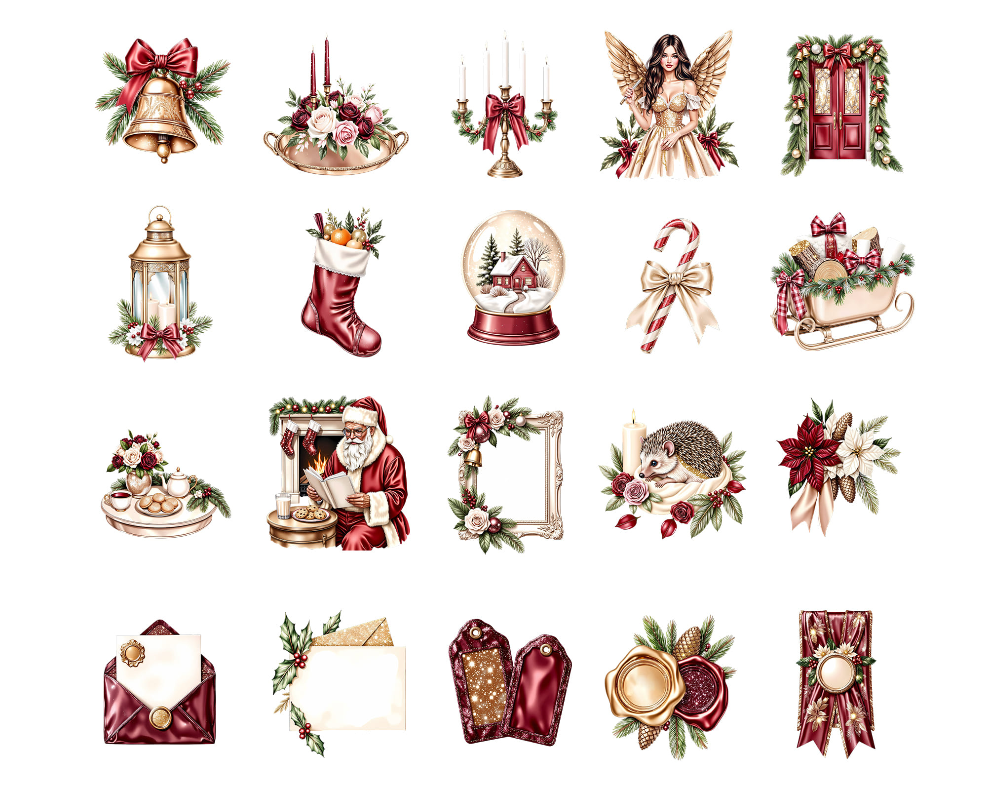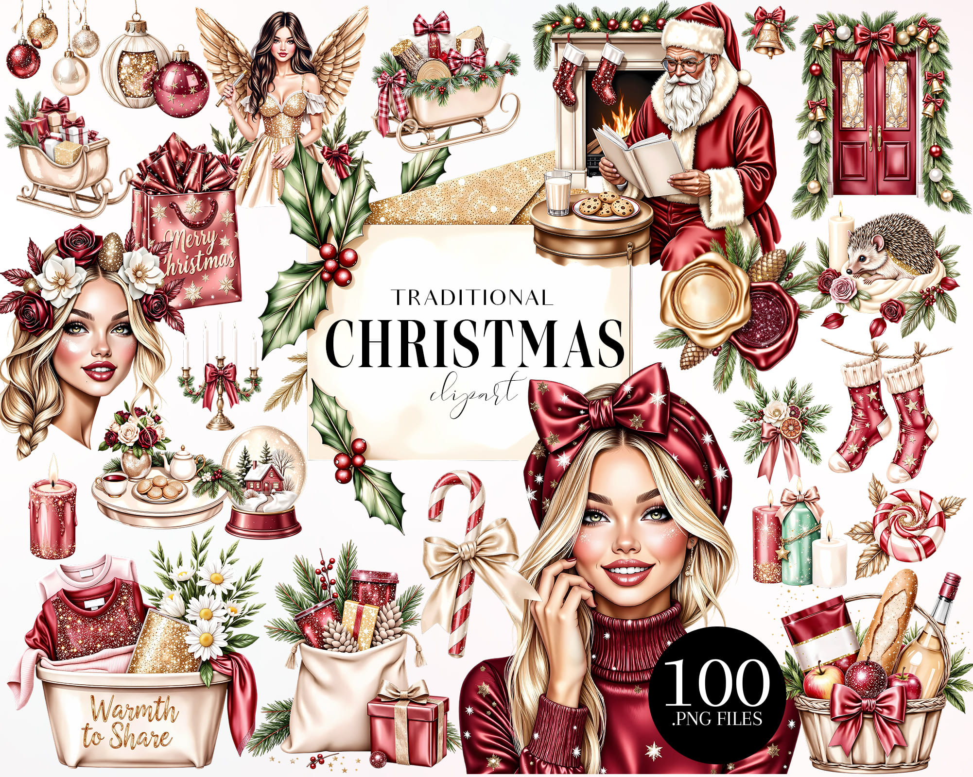 A festive 100-piece clipart collection in a classic Christmas style. Includes Santa, angels, ornaments, holly, gifts, candles, florals, cozy fireplace elements, stockings, candy canes, and elegant holiday décor. Perfect for cards, planners, stickers, posters, scrapbooking, and festive branding.
