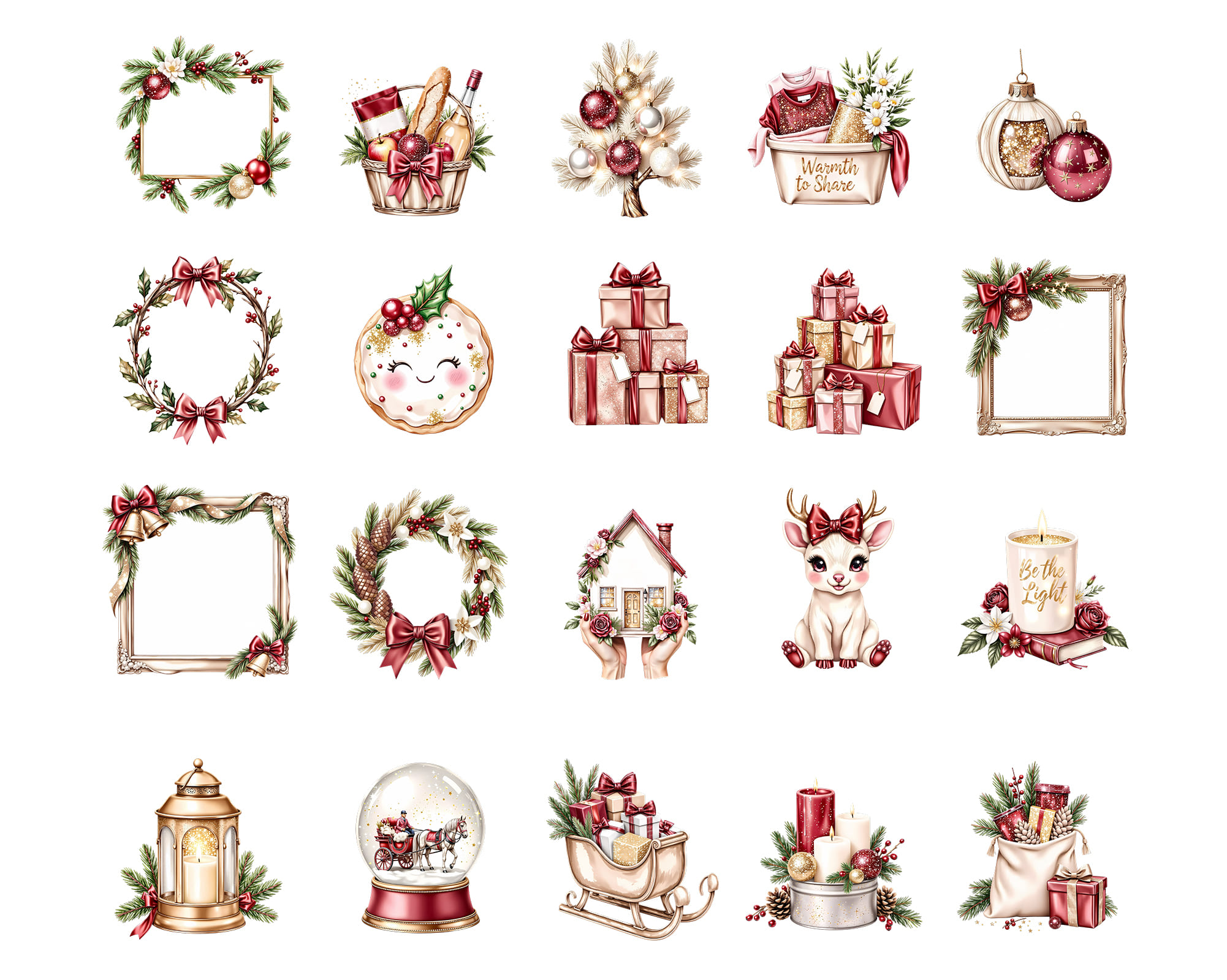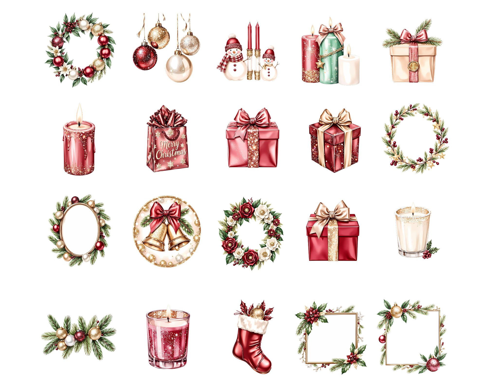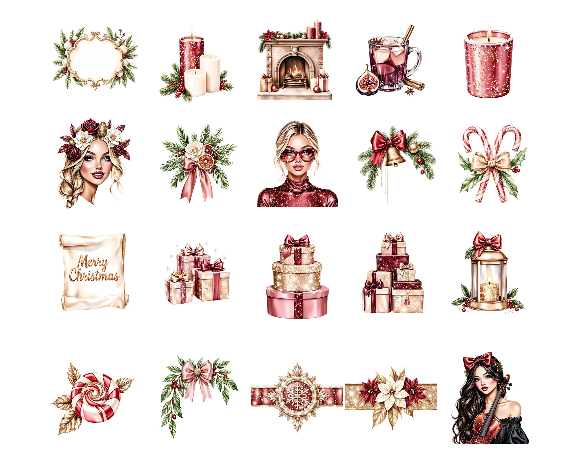 A festive 100-piece clipart collection in a classic Christmas style. Includes Santa, angels, ornaments, holly, gifts, candles, florals, cozy fireplace elements, stockings, candy canes, and elegant holiday décor. Perfect for cards, planners, stickers, posters, scrapbooking, and festive branding.