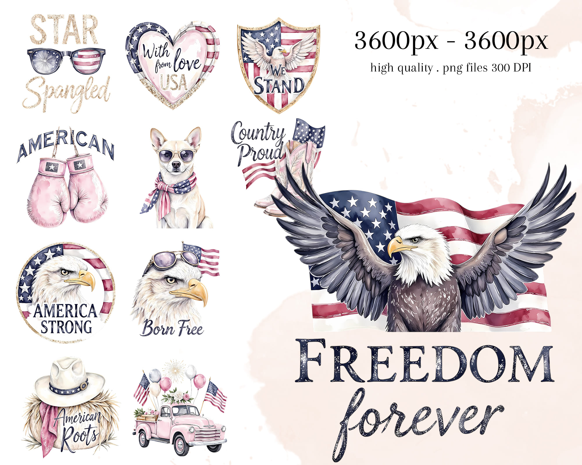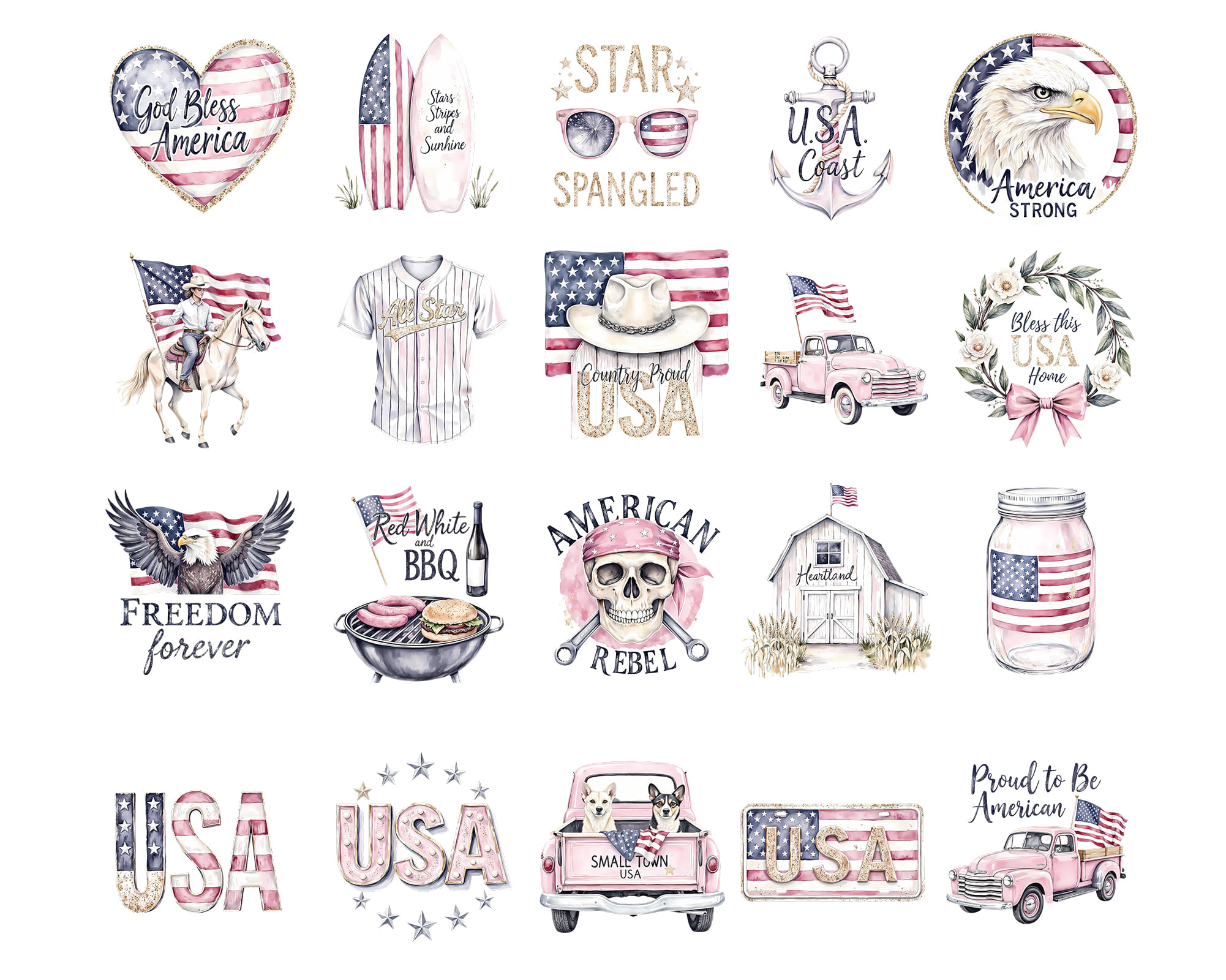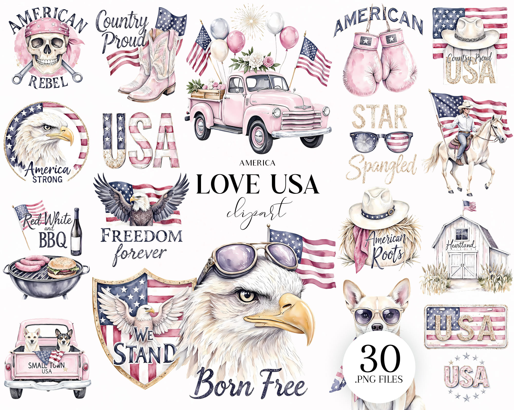 Celebrate freedom with this patriotic Love USA clipart set! Includes bald eagle, flags, vintage truck, cowboy hat, surfboards, anchors, sunglasses, and quotes like Born Free and God Bless America. Perfect for 4th of July crafts, T-shirts, mugs, planners, and party decor. Includes 30 PNG files with transparent backgrounds.