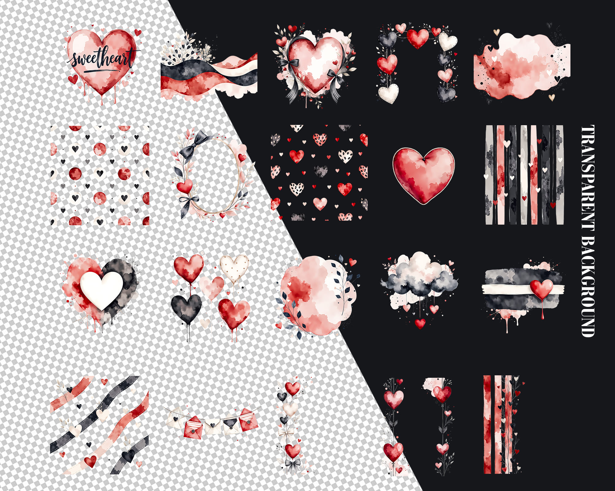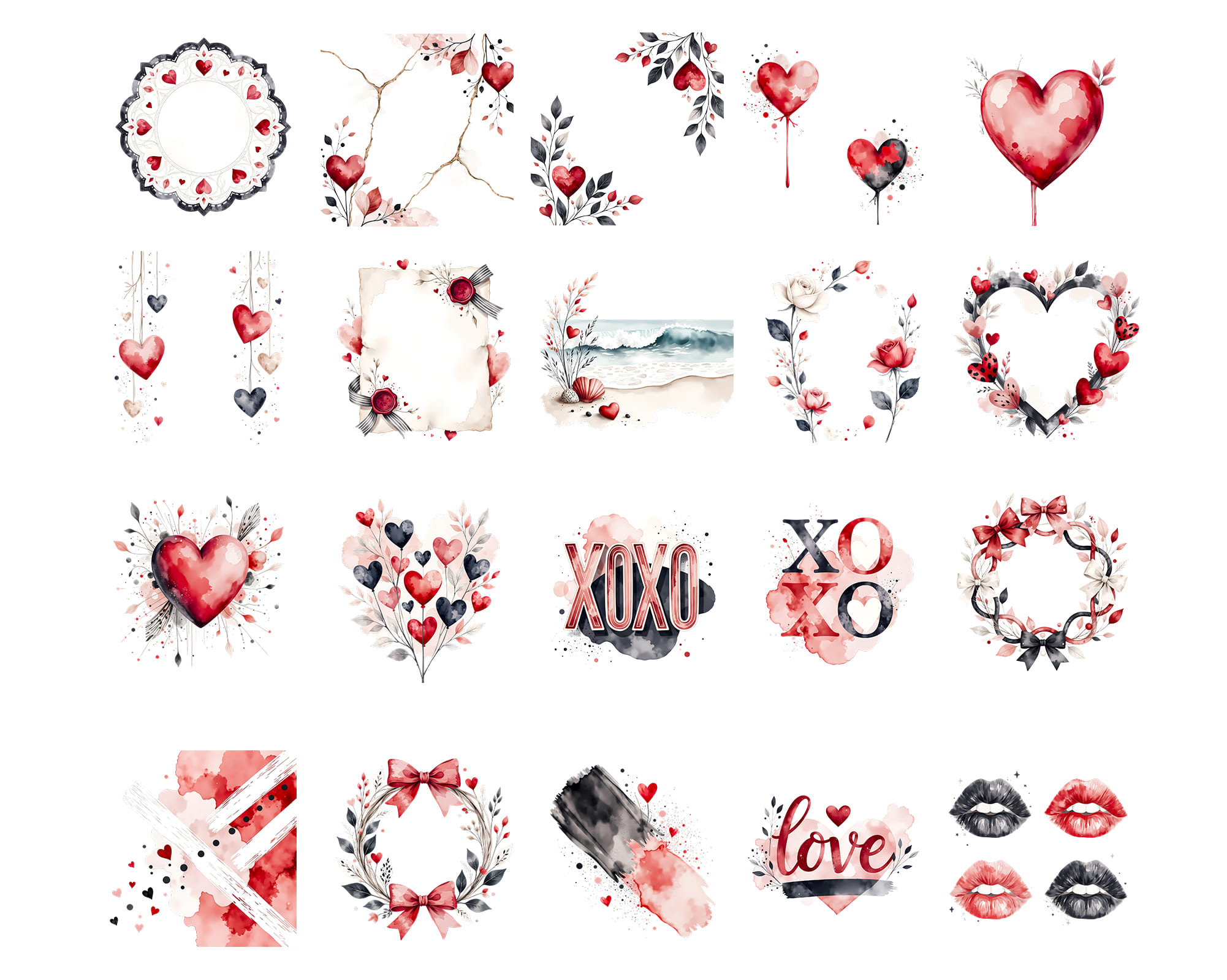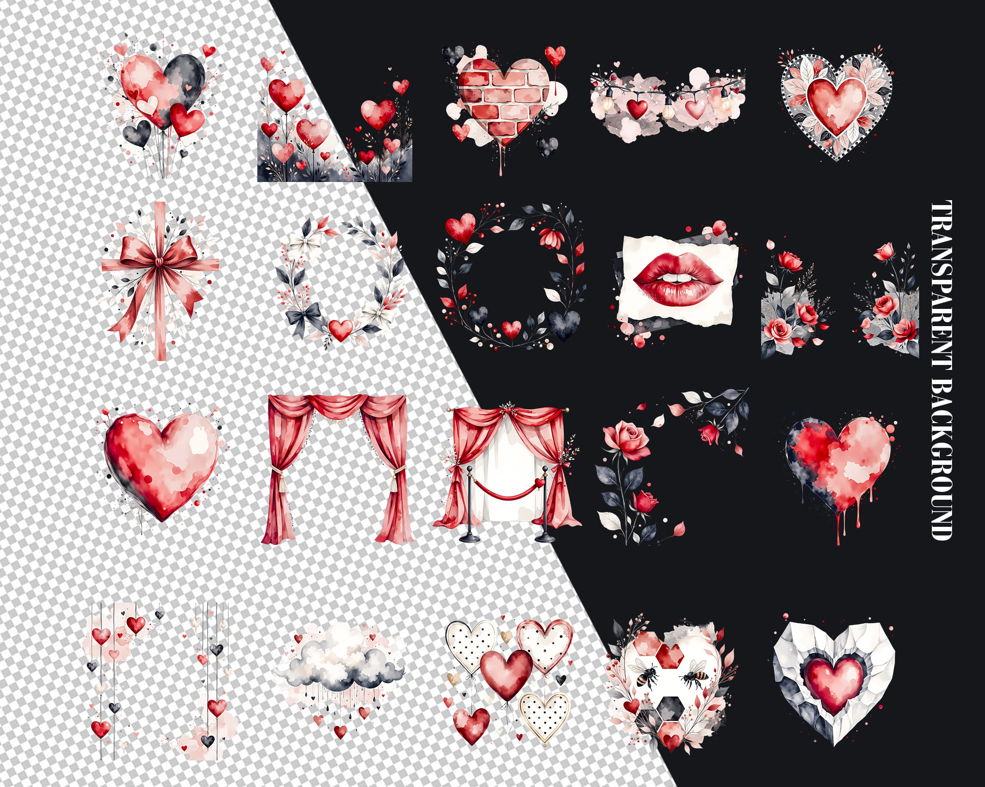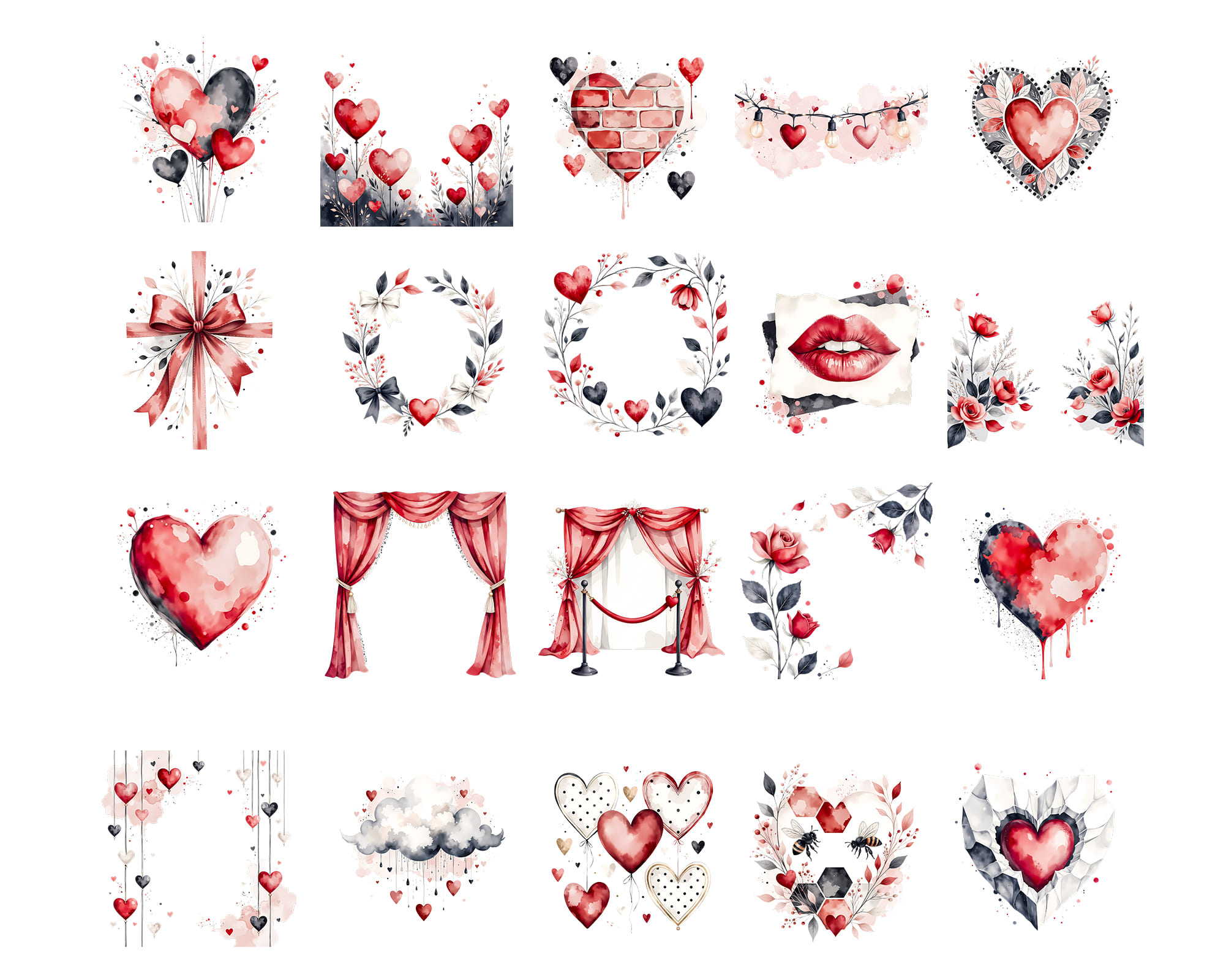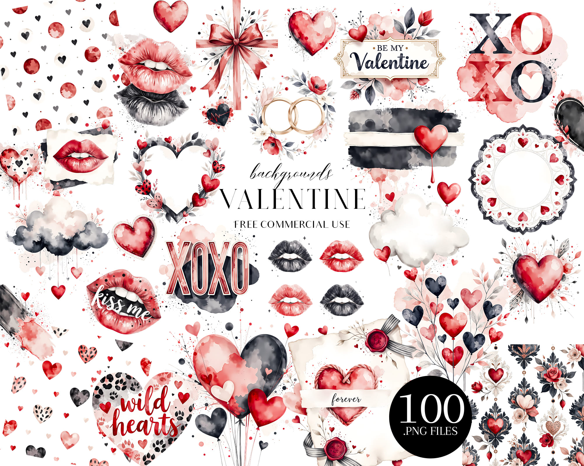 A bold Valentine Backgrounds clipart collection featuring 100 PNG illustrations in red, pink and black tones. This set includes hearts, lips, balloons, clouds, frames, patterns, lettering, wreaths, confetti and splashes perfect for love-themed designs. Ideal for Valentine cards, party printables, sublimation, planners, stickers, scrapbooking and social media graphics. All graphics come as high-quality transparent PNG files.