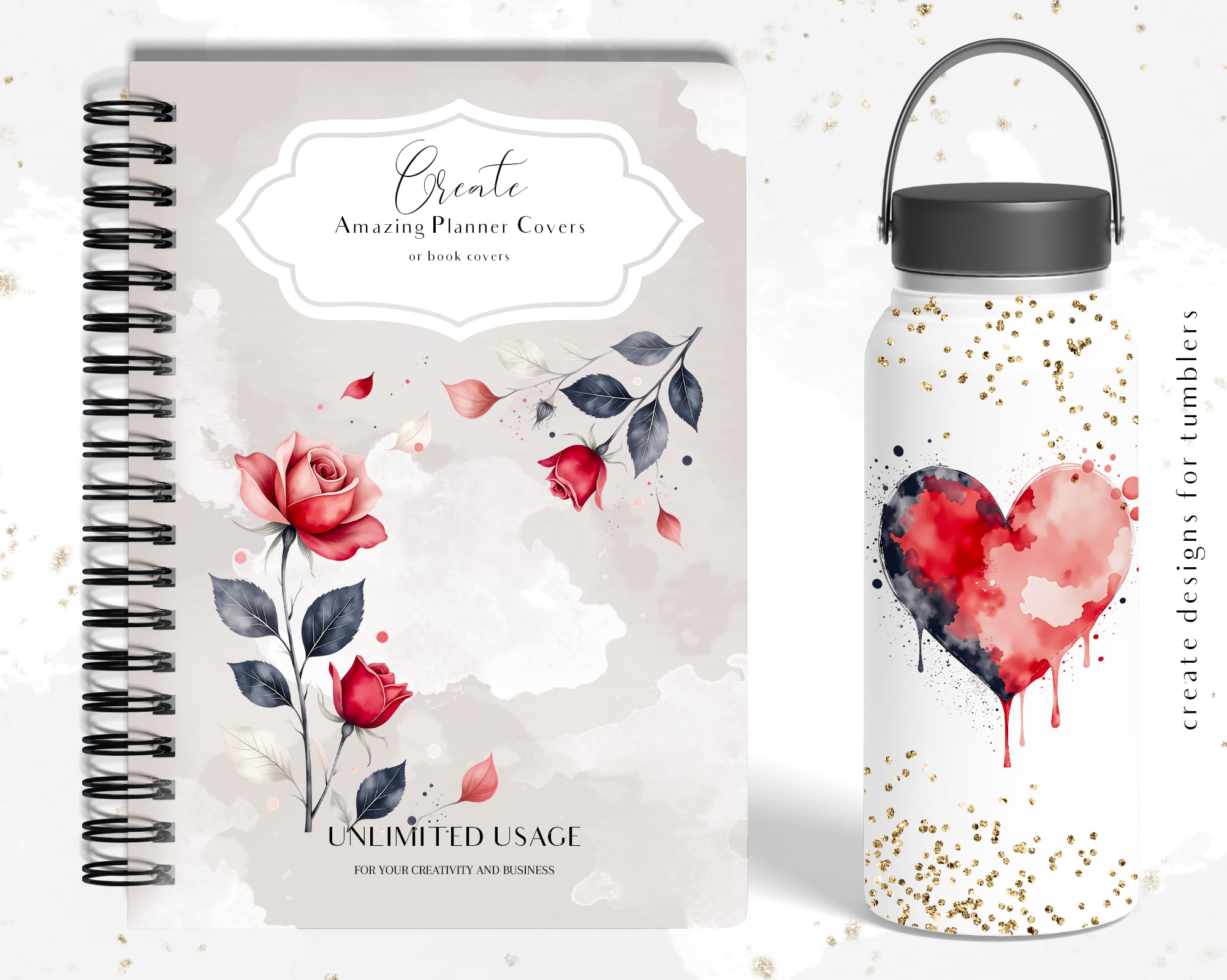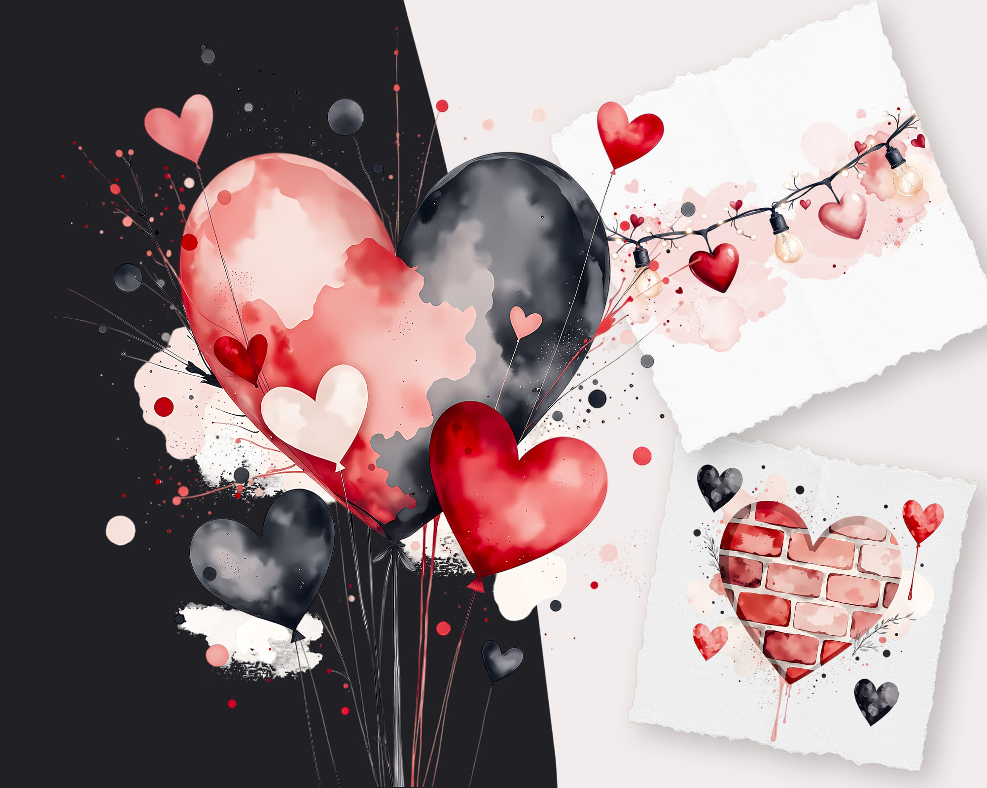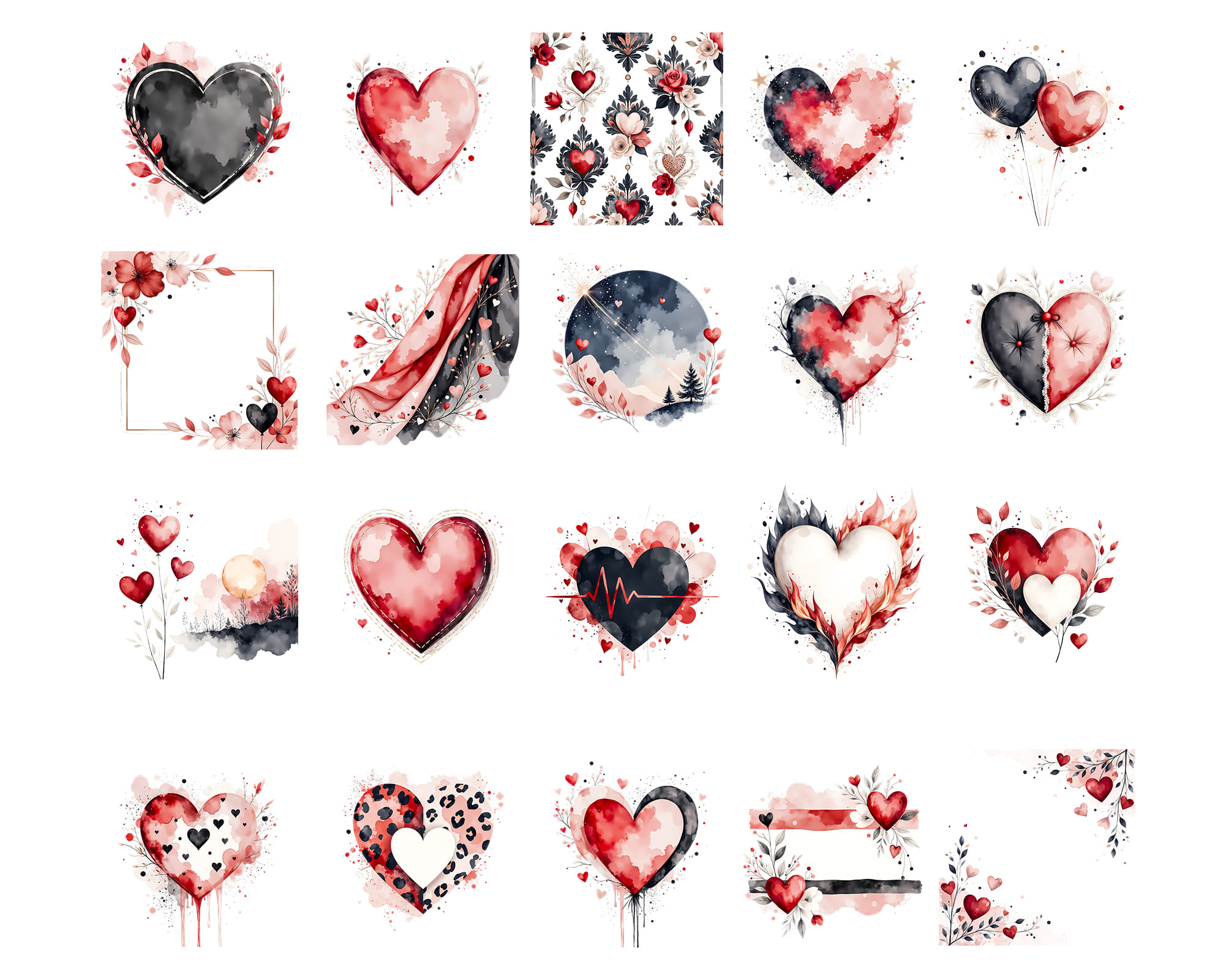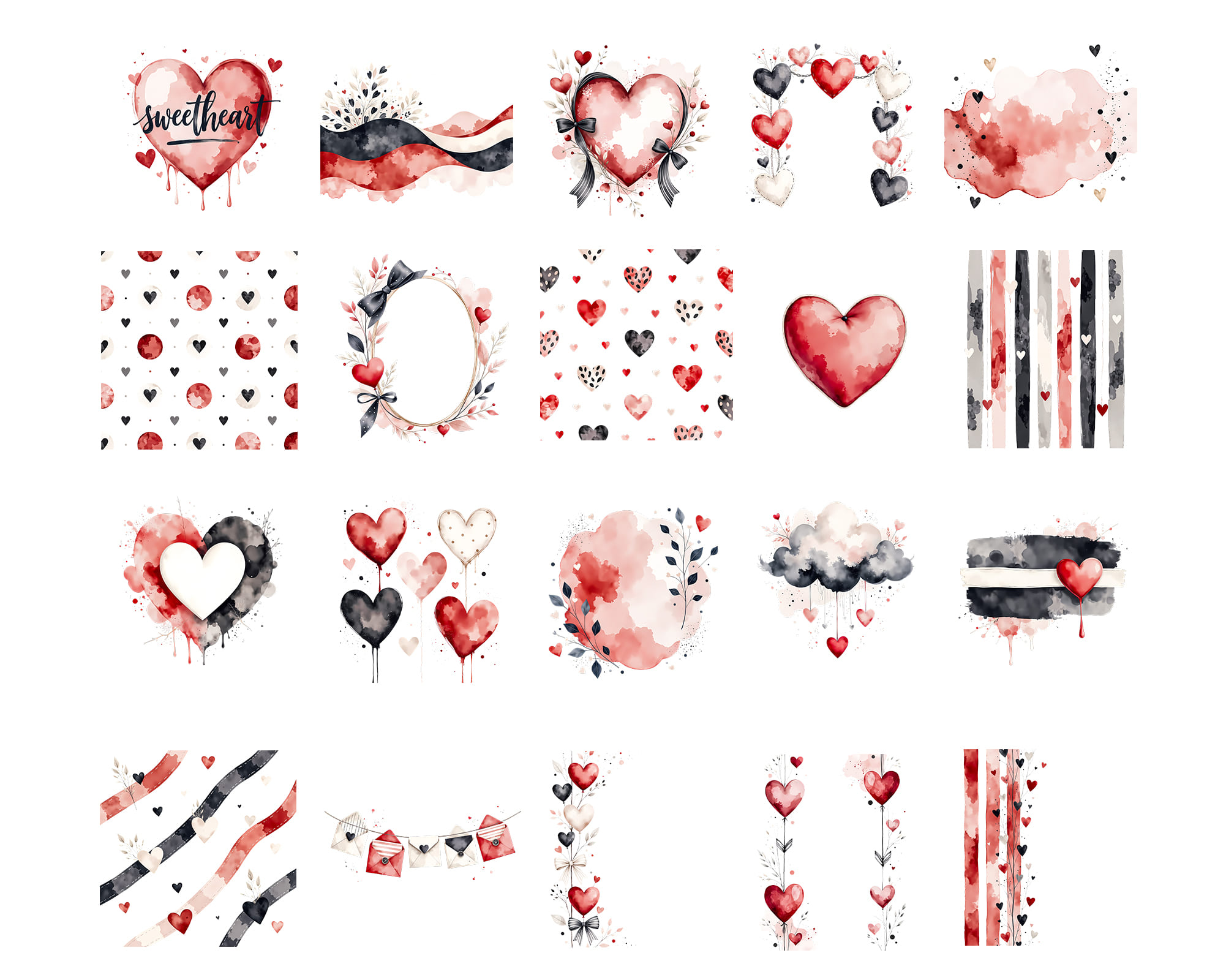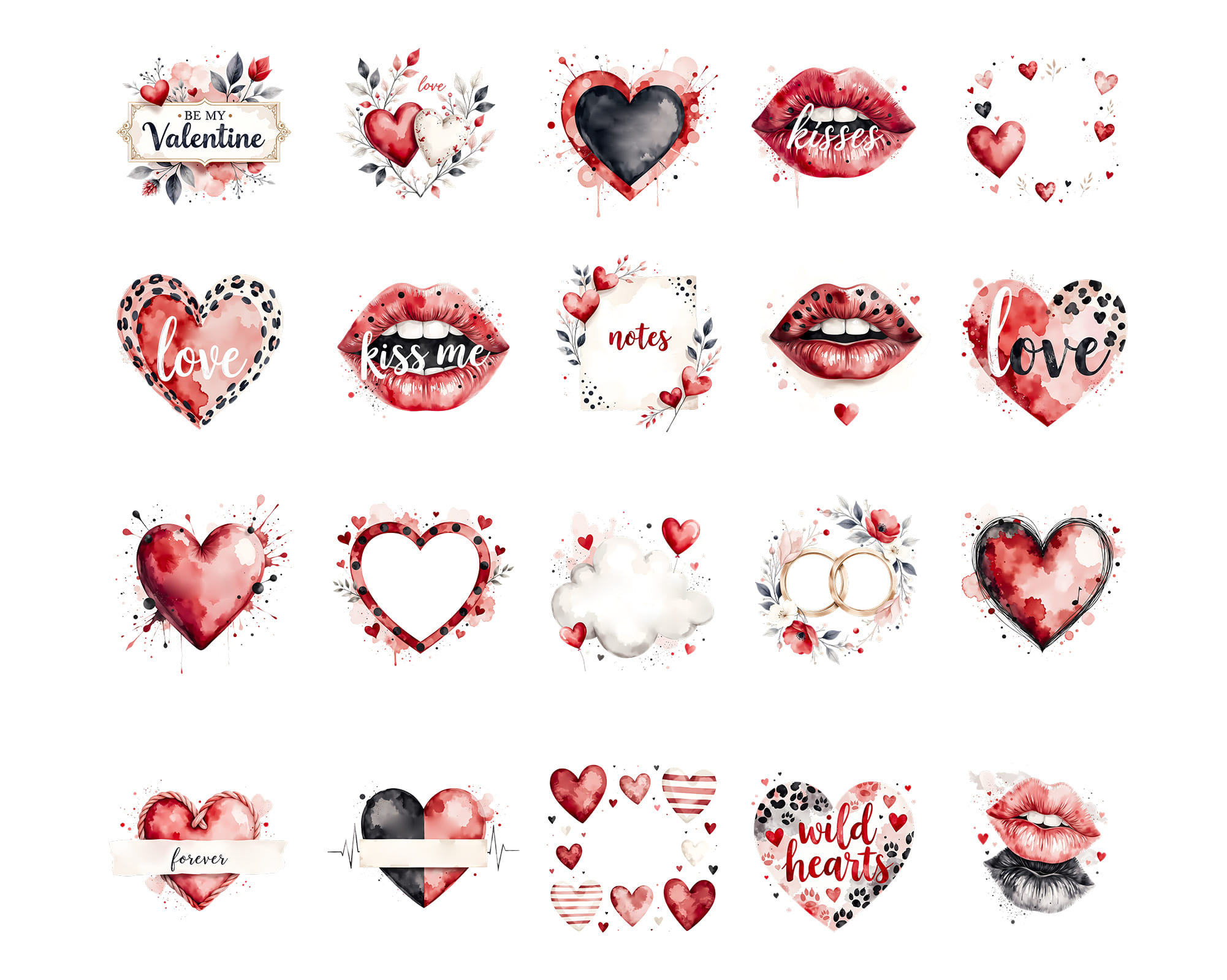 A bold Valentine Backgrounds clipart collection featuring 100 PNG illustrations in red, pink and black tones. This set includes hearts, lips, balloons, clouds, frames, patterns, lettering, wreaths, confetti and splashes perfect for love-themed designs. Ideal for Valentine cards, party printables, sublimation, planners, stickers, scrapbooking and social media graphics. All graphics come as high-quality transparent PNG files.