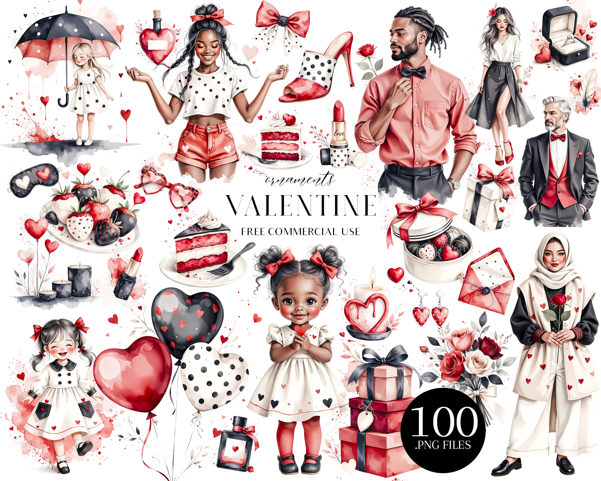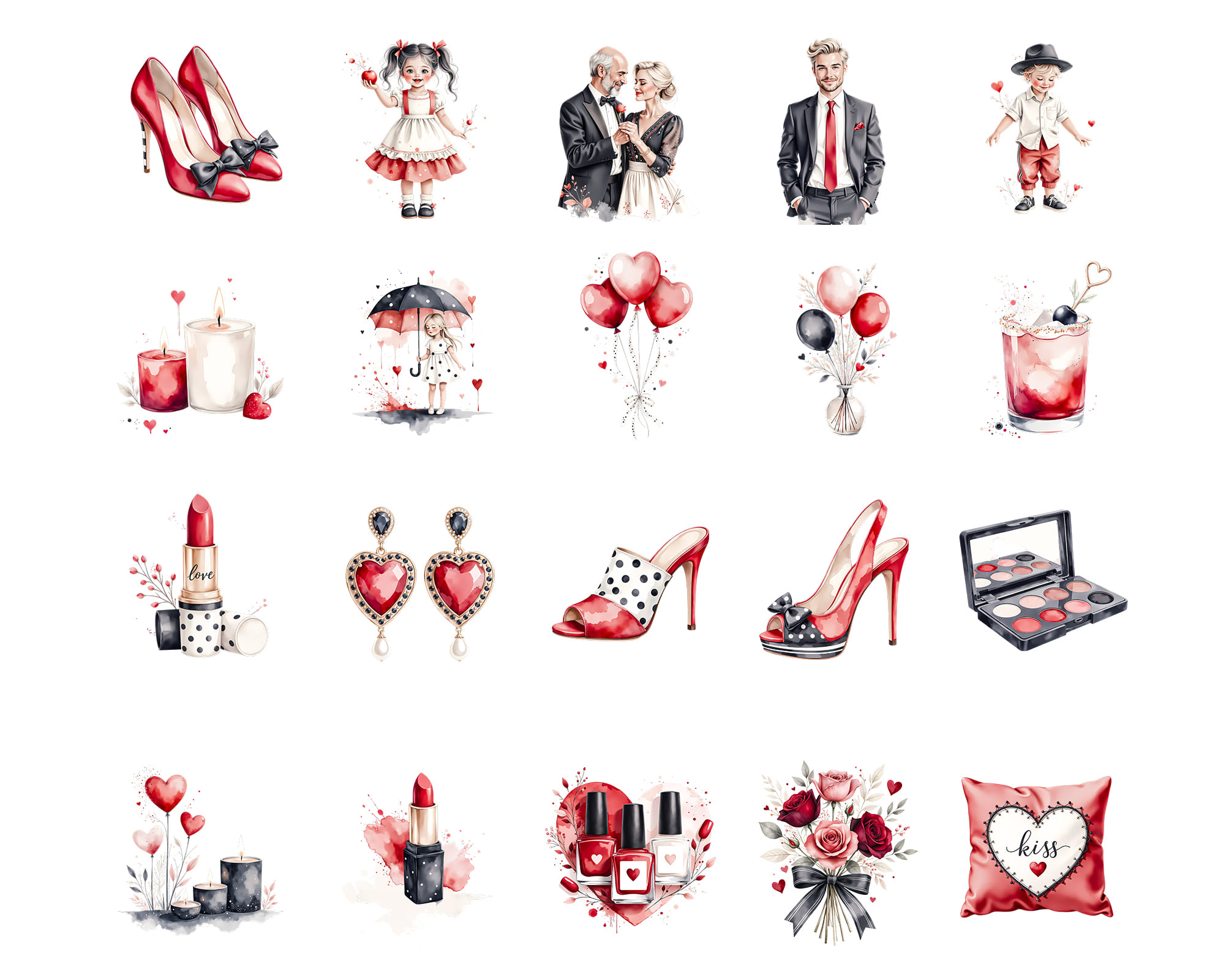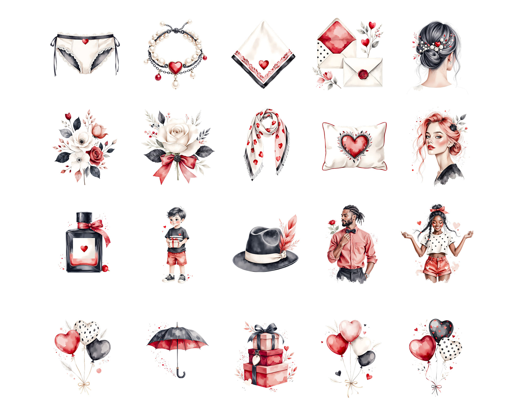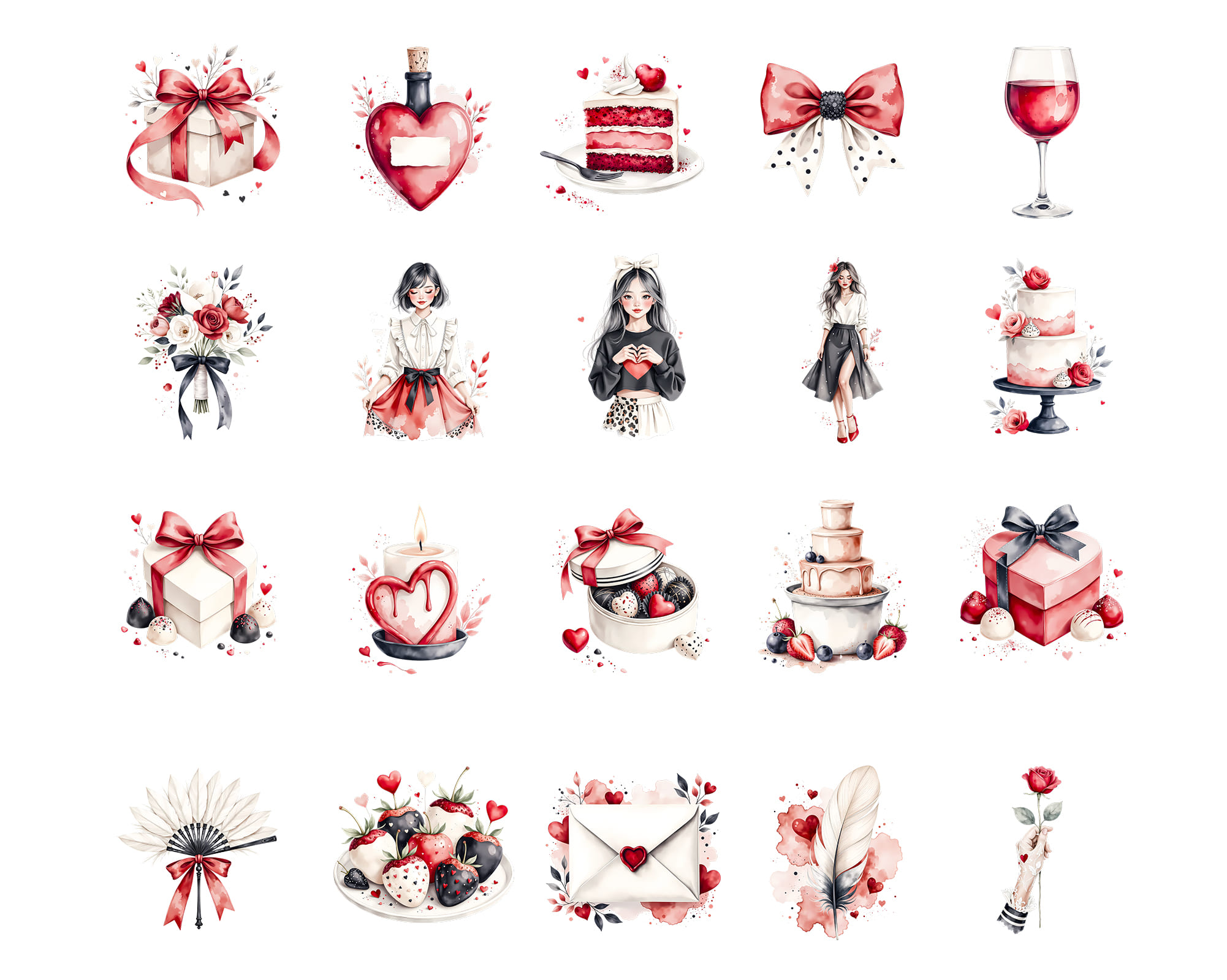 A cute Valentine Ornaments clipart collection featuring 100 PNG illustrations full of love and sweetness. This set includes kids, adults, balloons, hearts, cakes, strawberries, candles, gifts, envelopes, flowers and decorative elements perfect for romantic projects. Ideal for Valentine cards, party printables, planners, stickers, scrapbooking, invitations and printable decor. All graphics come as high-quality transparent PNG files.