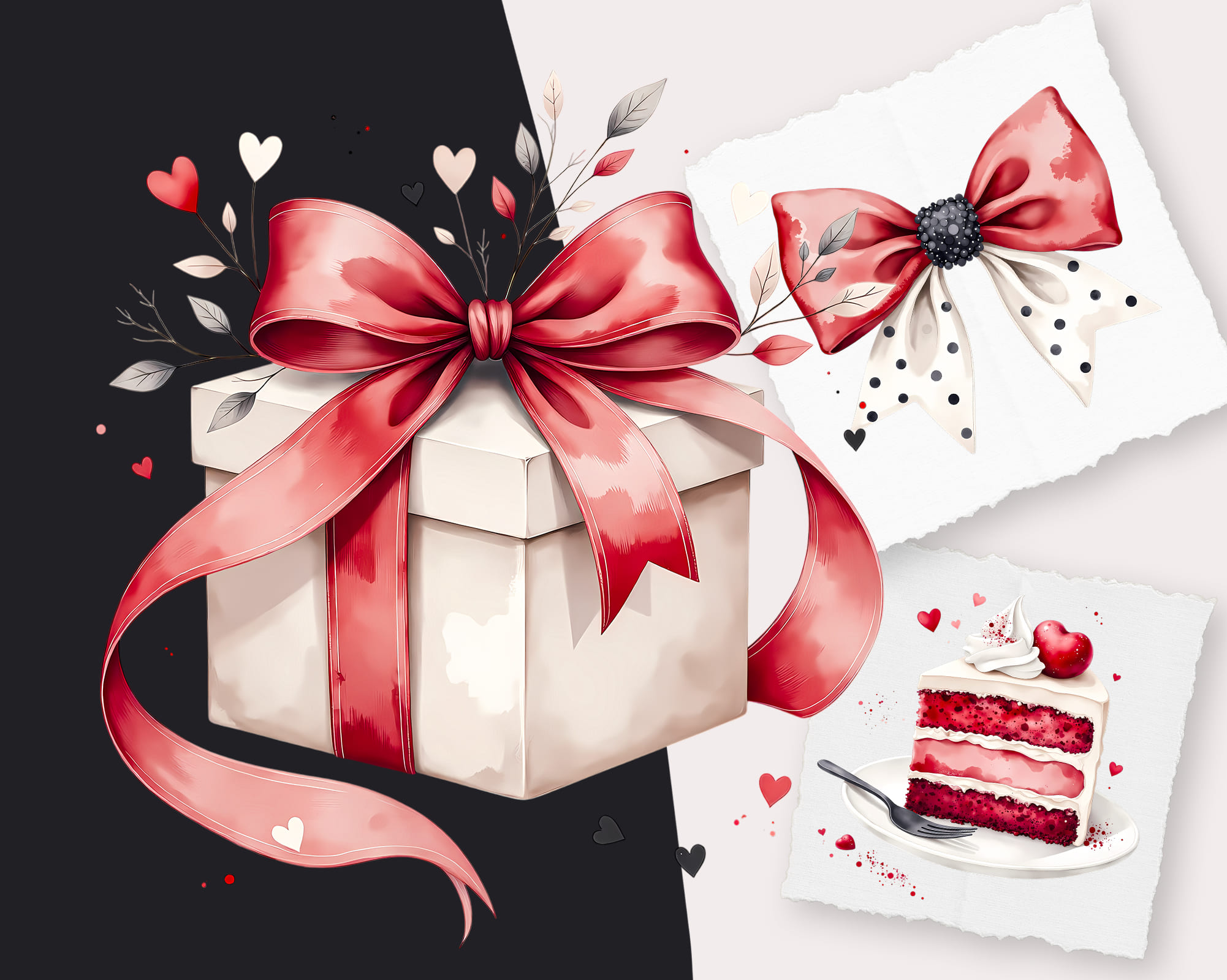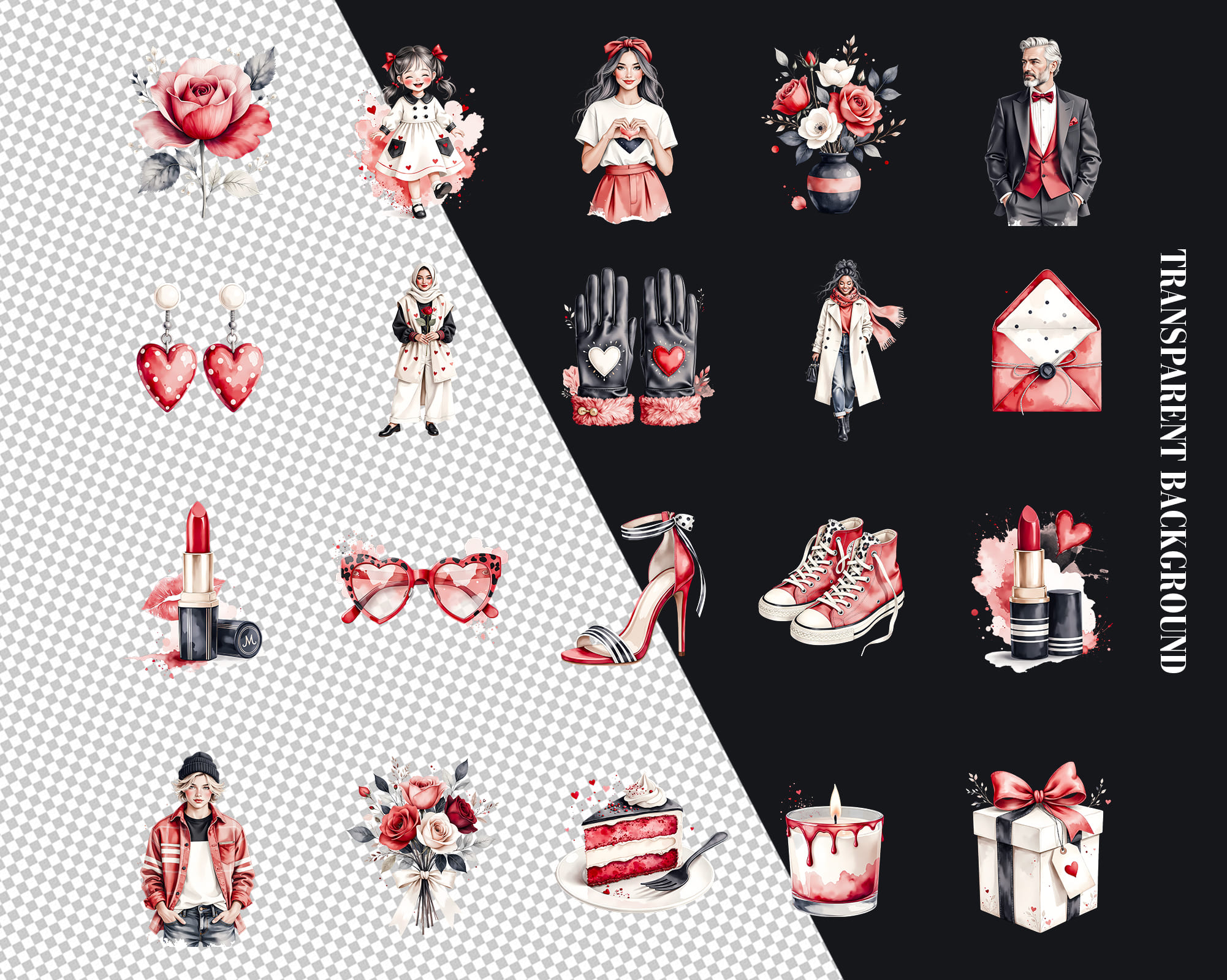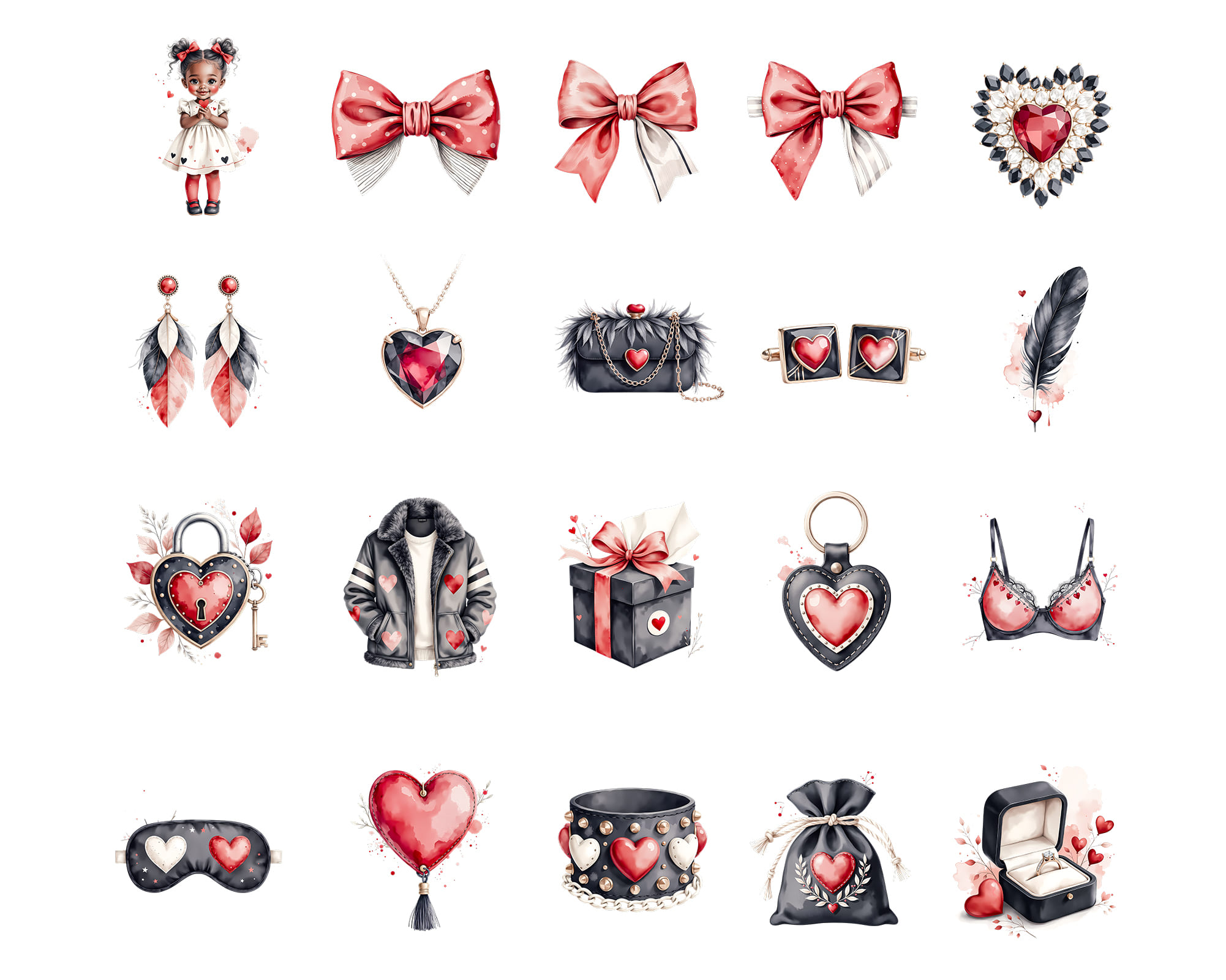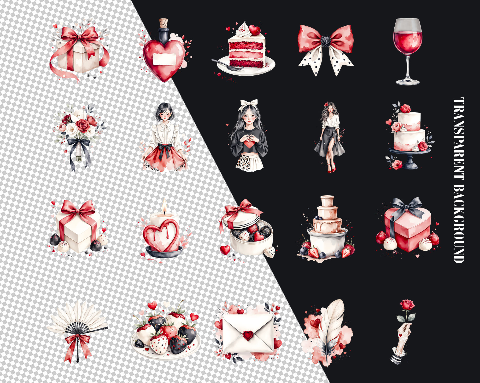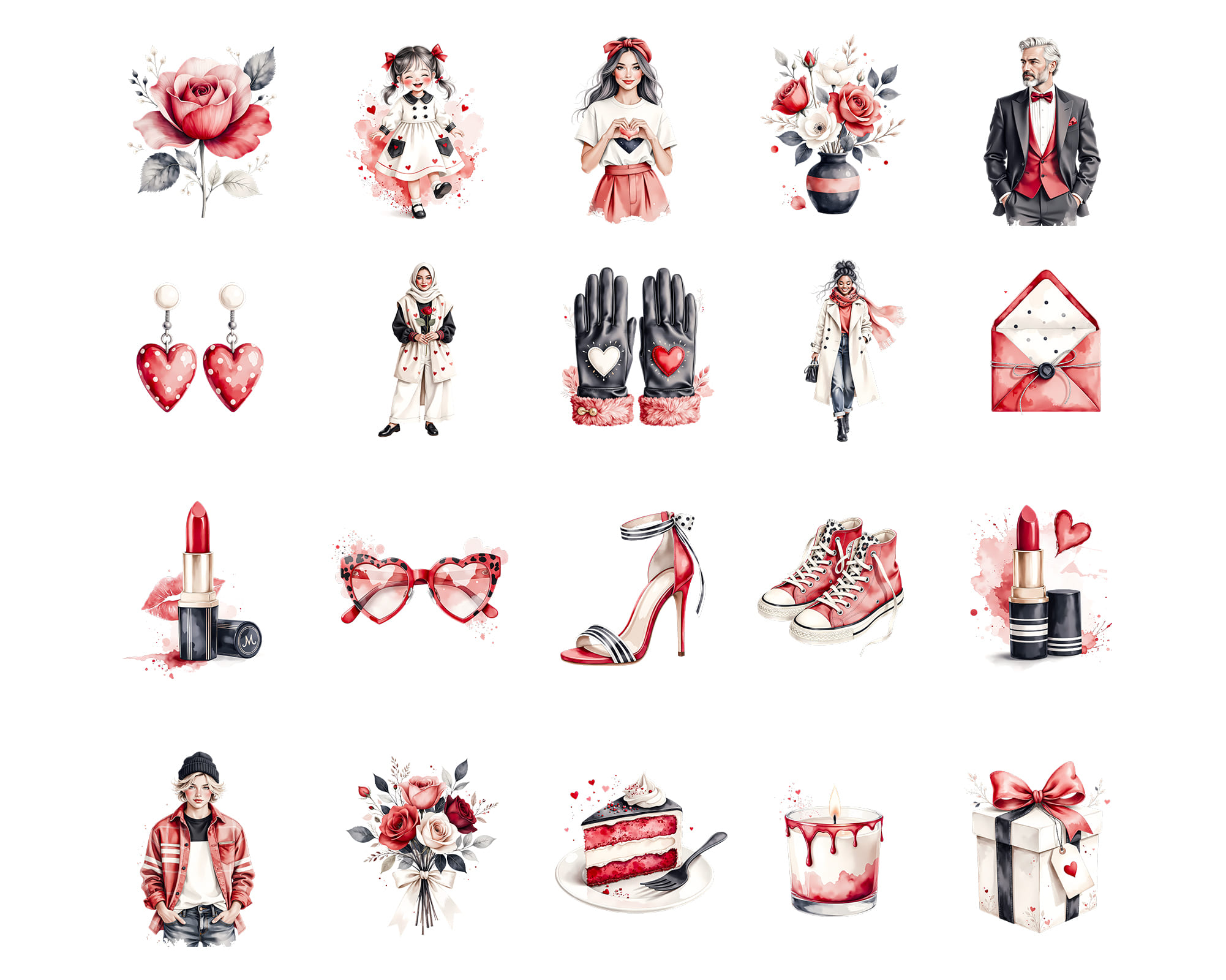 A cute Valentine Ornaments clipart collection featuring 100 PNG illustrations full of love and sweetness. This set includes kids, adults, balloons, hearts, cakes, strawberries, candles, gifts, envelopes, flowers and decorative elements perfect for romantic projects. Ideal for Valentine cards, party printables, planners, stickers, scrapbooking, invitations and printable decor. All graphics come as high-quality transparent PNG files.