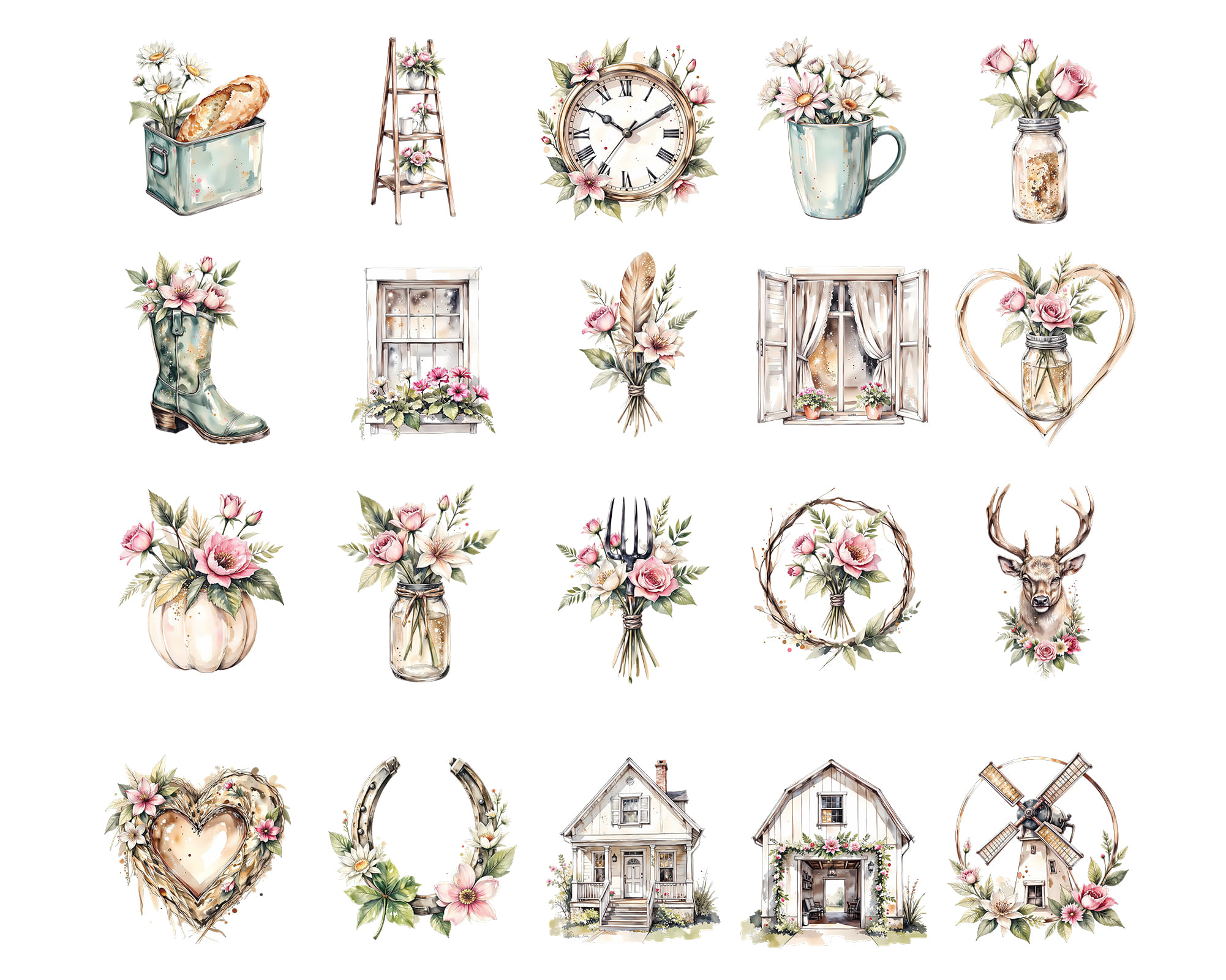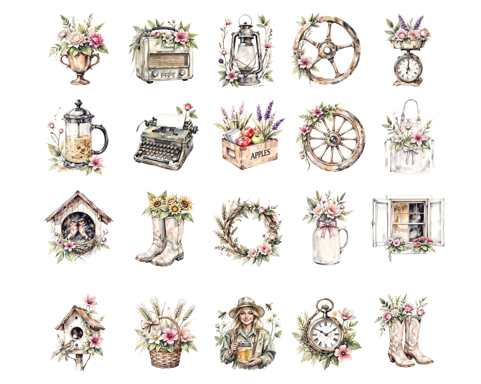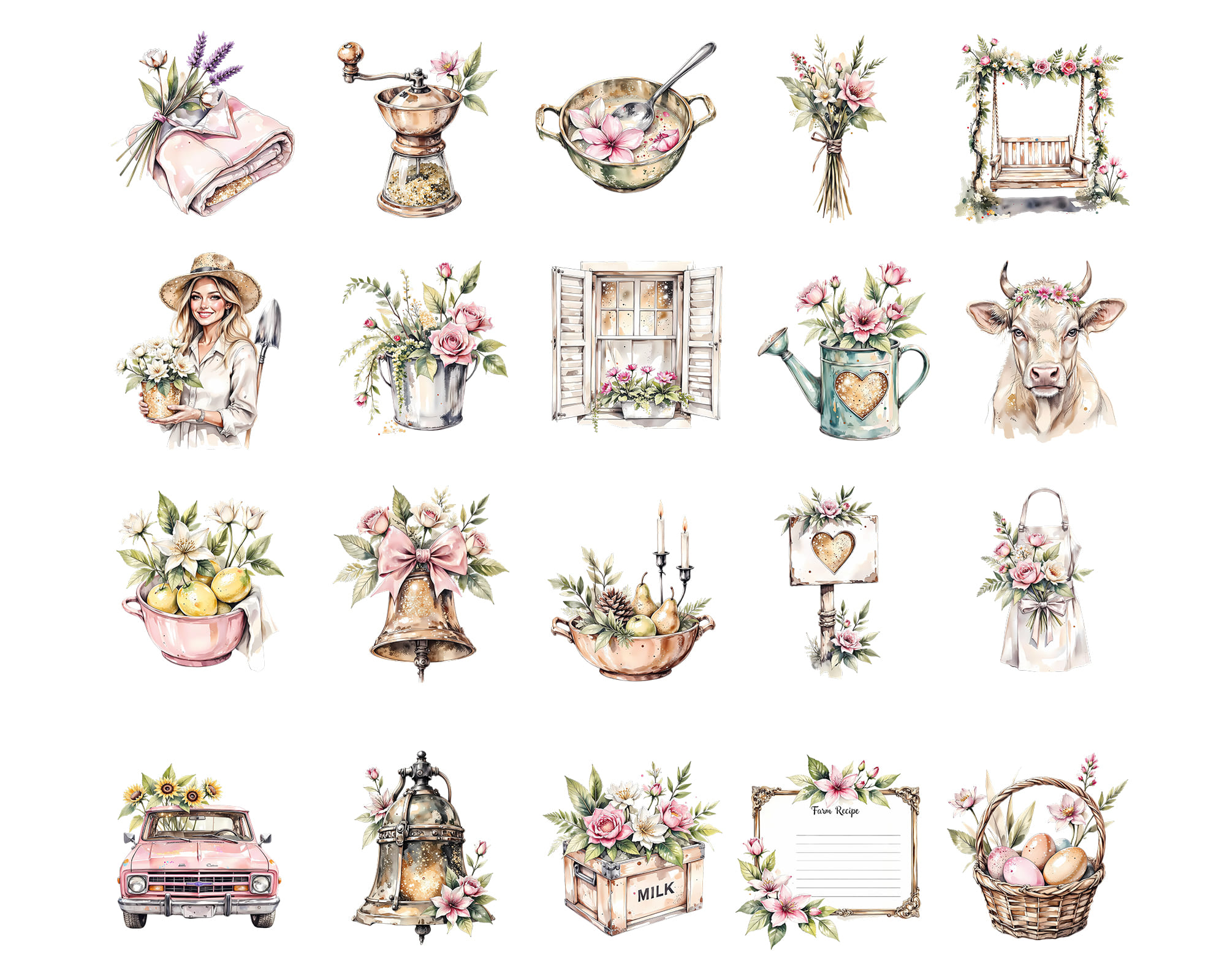 A bright and charming set of 100 PNG illustrations inspired by country living and sunny farmhouse aesthetics. Includes farm girl characters, flowers, bees, barns, boots, vintage trucks, garden tools, animals, and rustic décor — perfect for planners, journaling, posters, branding, and craft projects.
