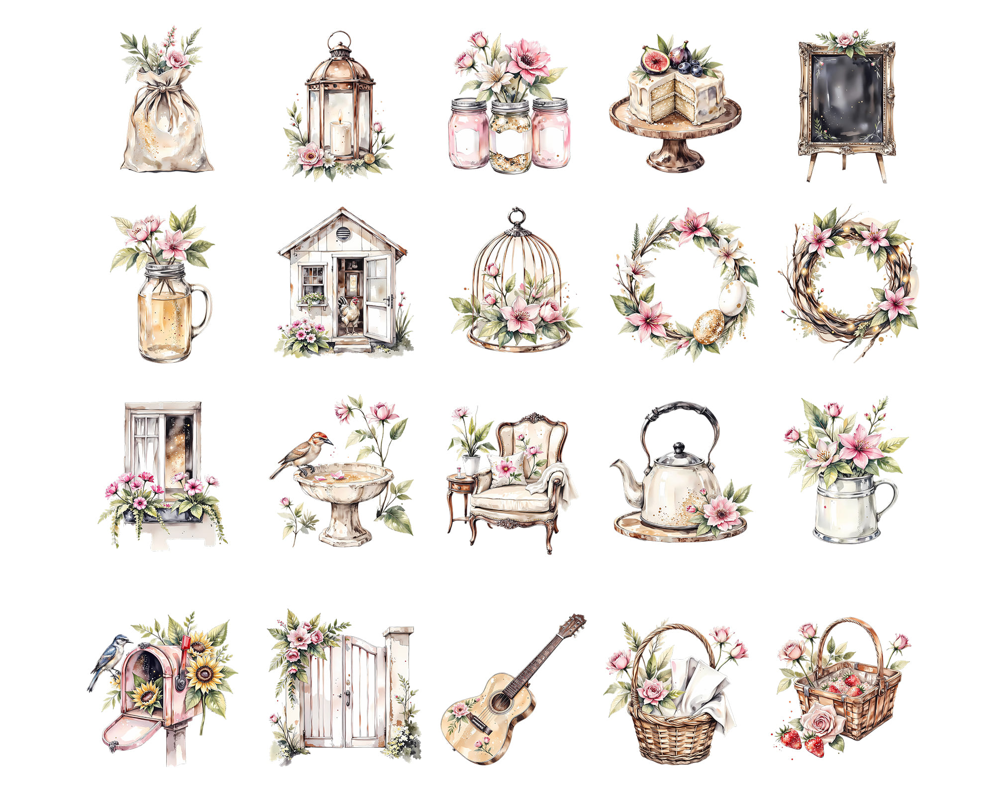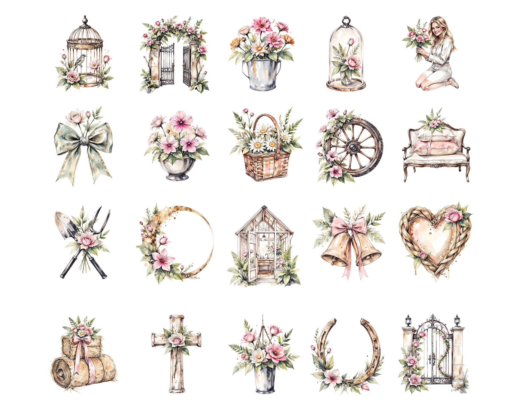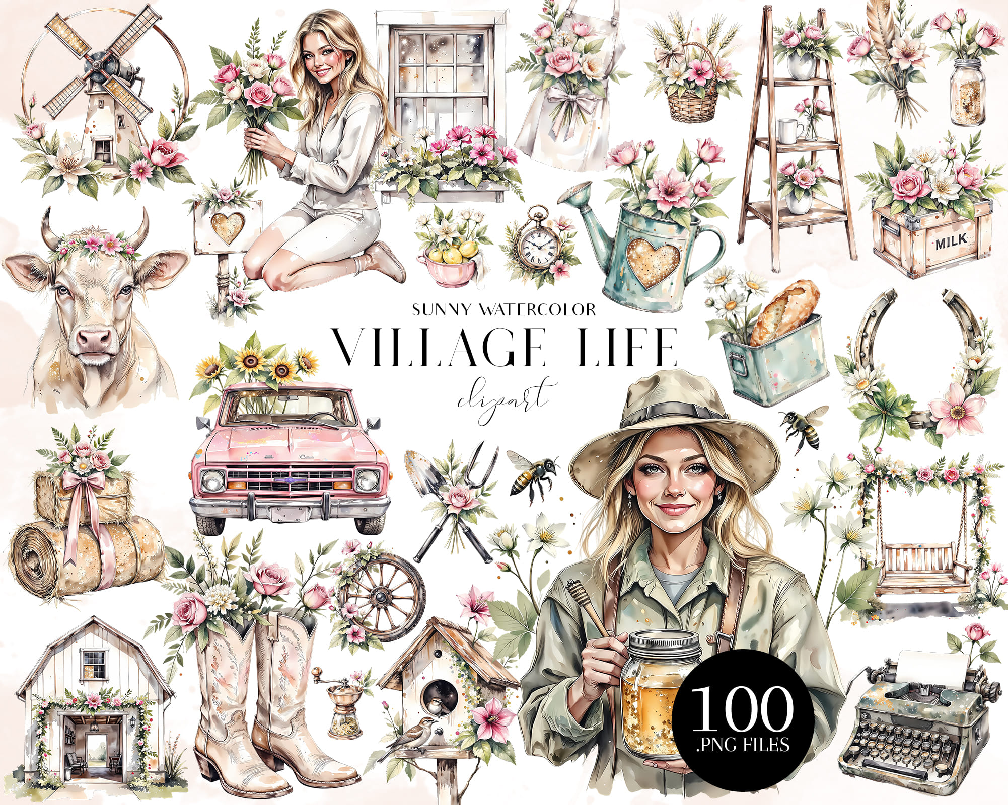 A bright and charming set of 100 PNG illustrations inspired by country living and sunny farmhouse aesthetics. Includes farm girl characters, flowers, bees, barns, boots, vintage trucks, garden tools, animals, and rustic décor — perfect for planners, journaling, posters, branding, and craft projects.