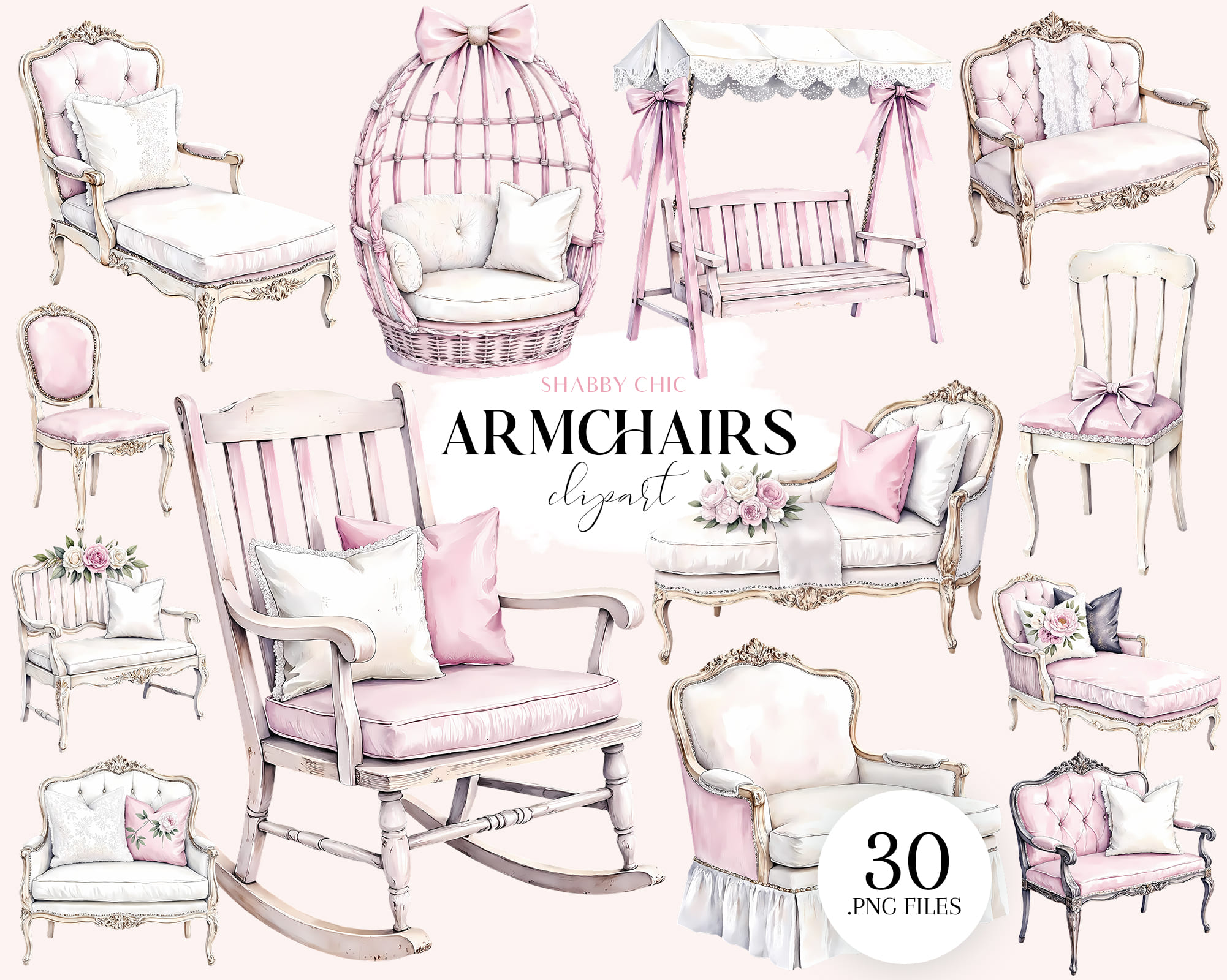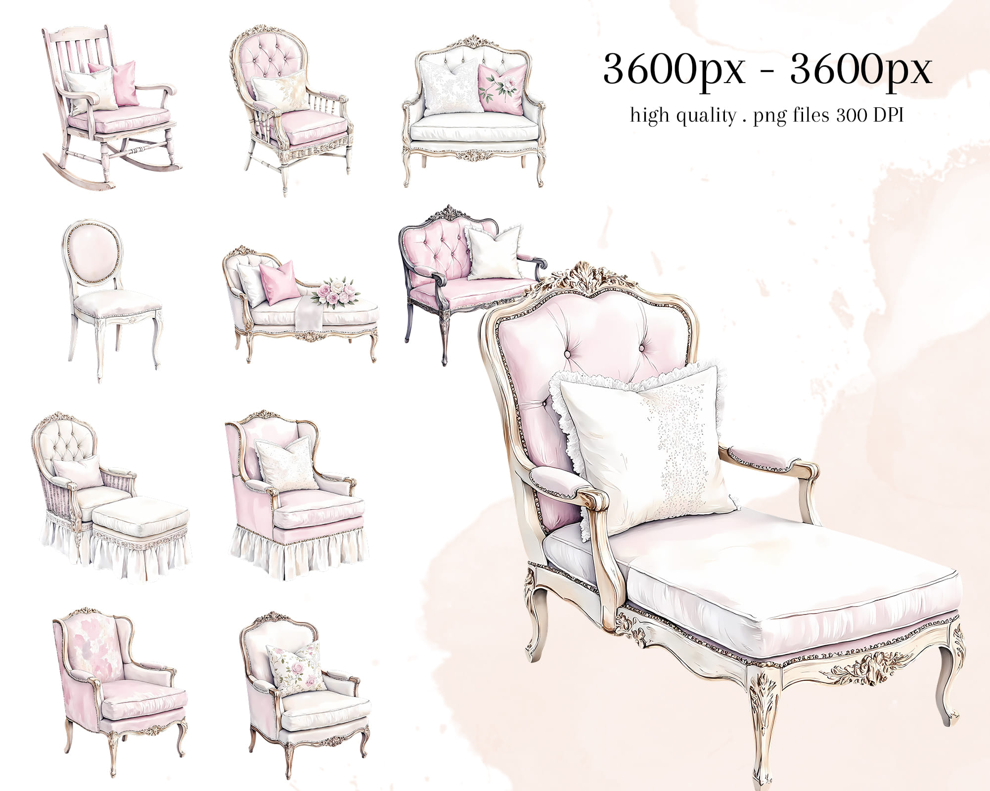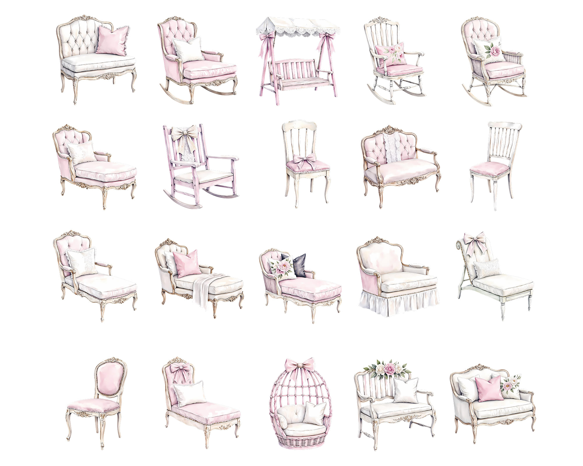 Bring a cozy vintage touch to your creative projects with this Pastel Armchairs Clipart Collection. Each chair is delicately painted with floral cushions, lace details, and romantic pastel tones — perfect for elegant interiors, journaling, or feminine design themes.