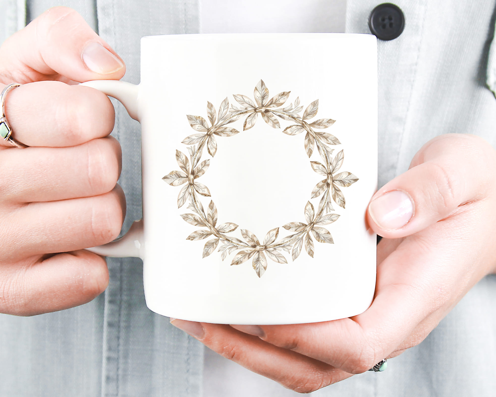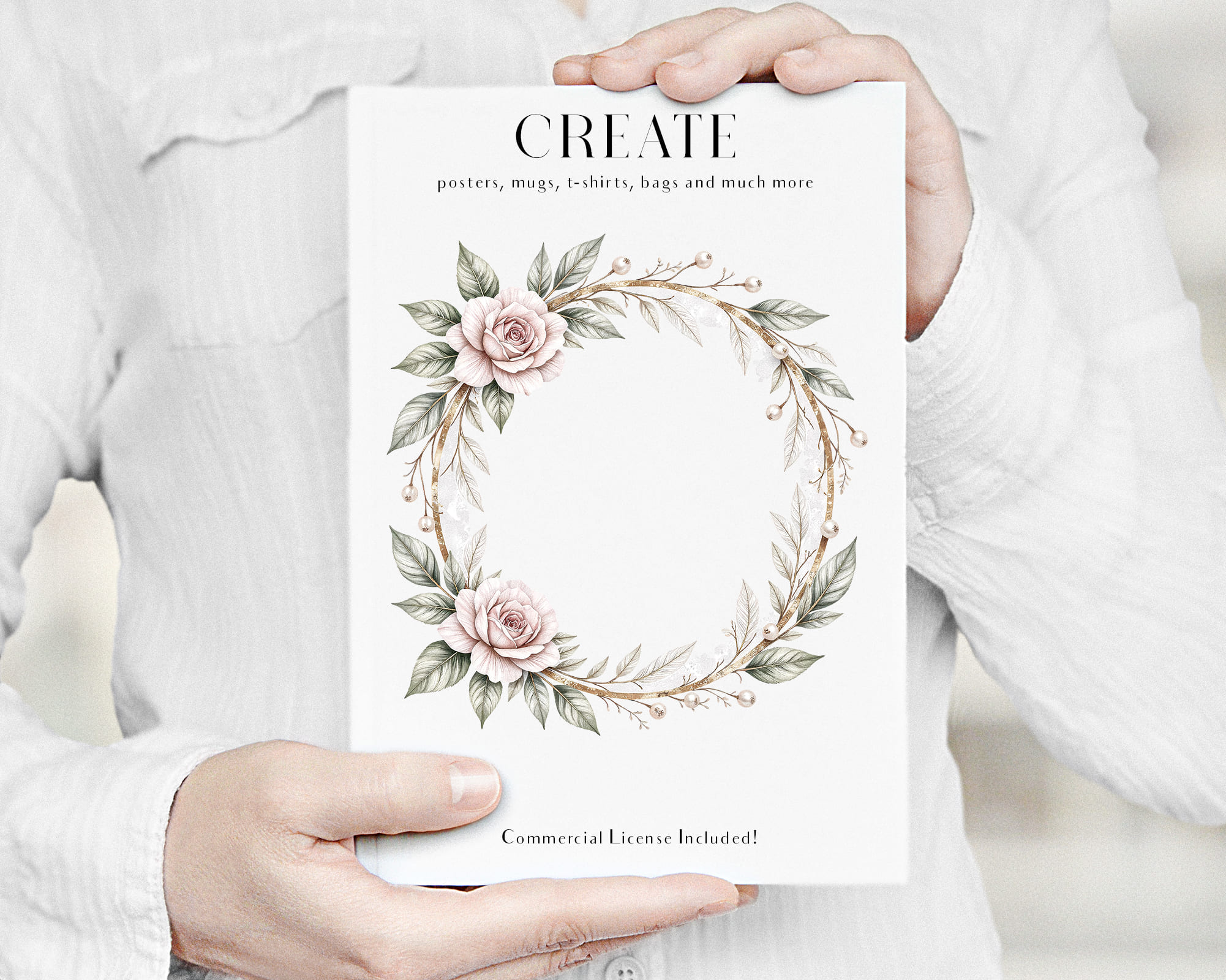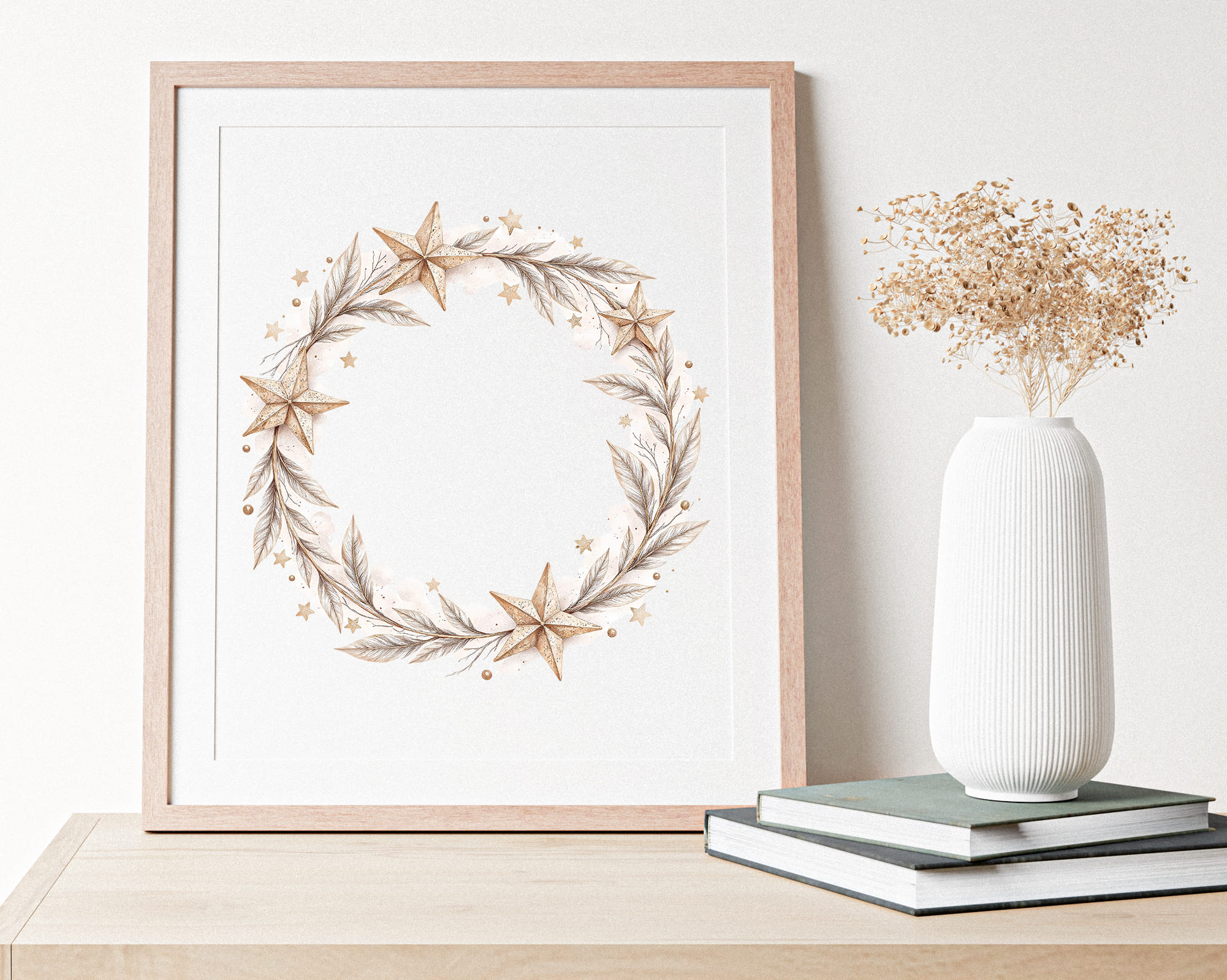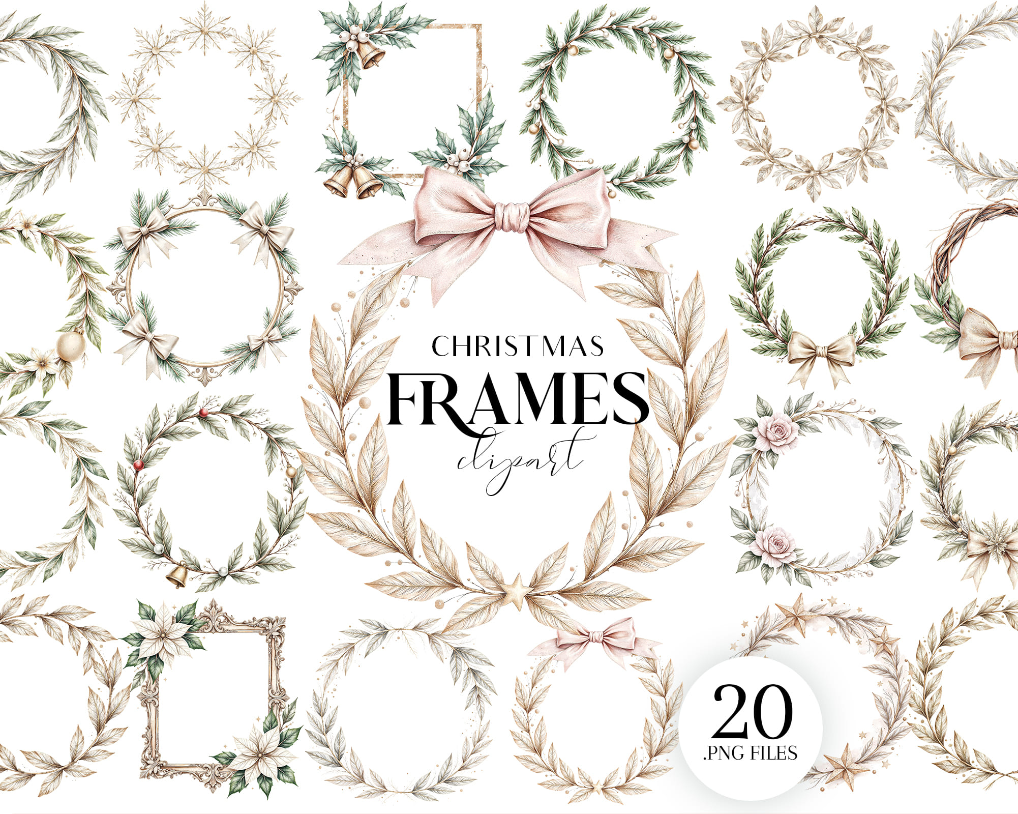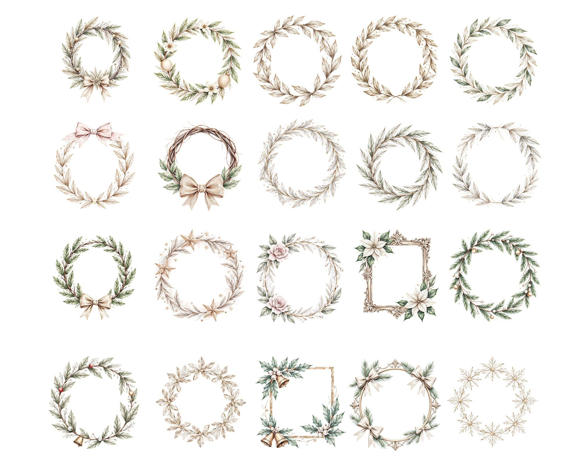 Vintage Christmas Frames Clipart includes 20 beautiful beige and golden toned wreath designs in PNG format. Transparent backgrounds and high resolution (300 DPI) make them perfect for both print and digital use.
