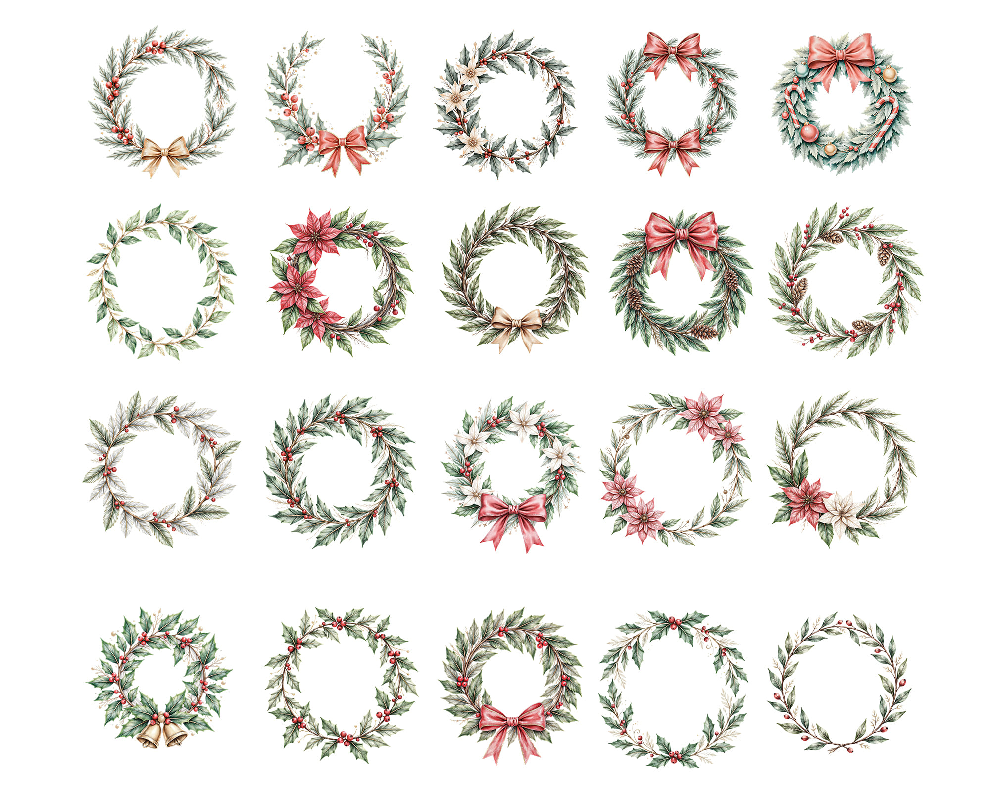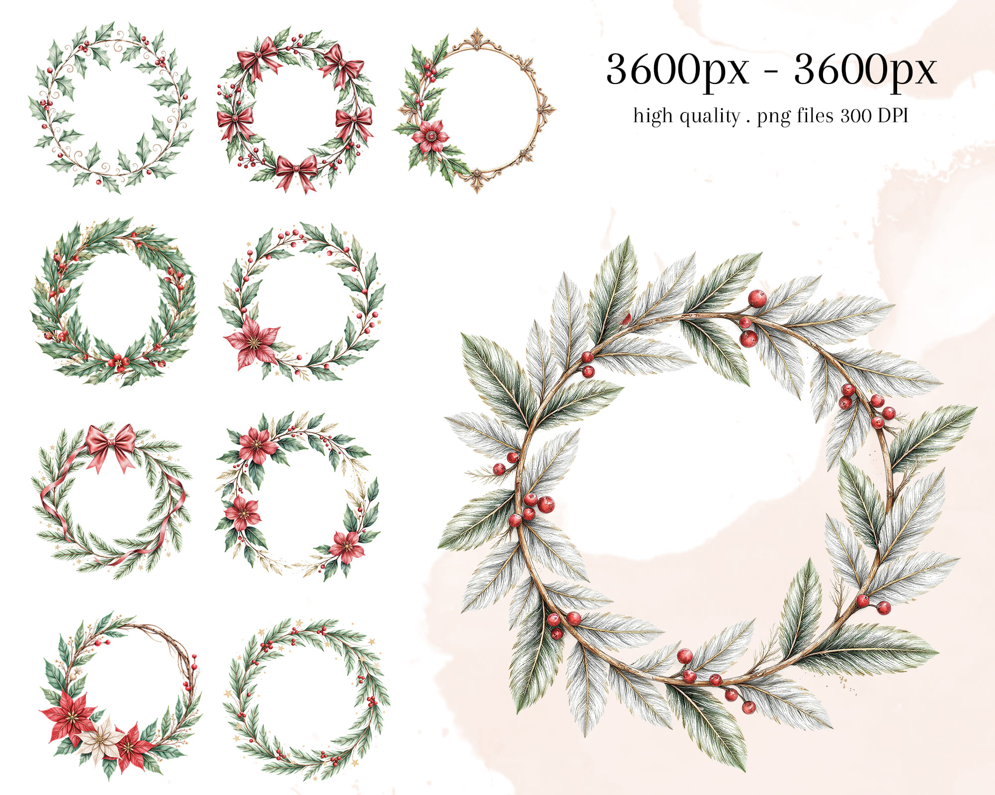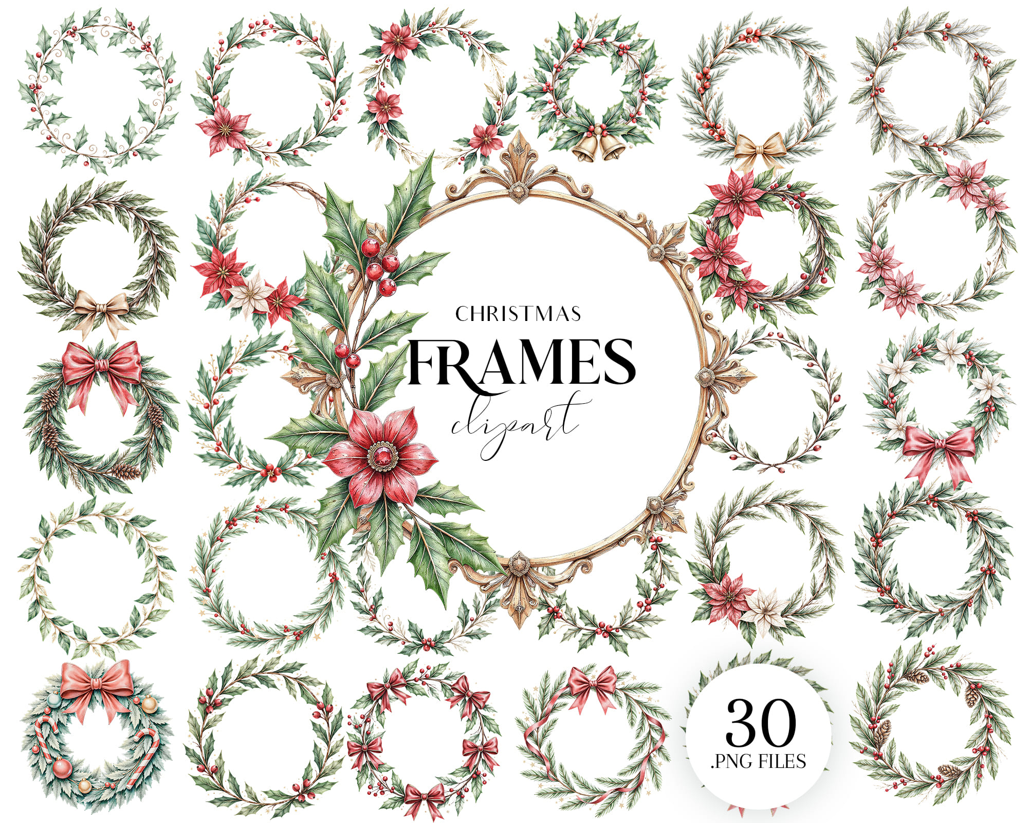 Vintage Christmas Frames Clipart is a festive collection of 30 elegant wreath designs in PNG format. All illustrations come with transparent backgrounds, 300 DPI resolution, and approximately 3600×3600 pixels size.