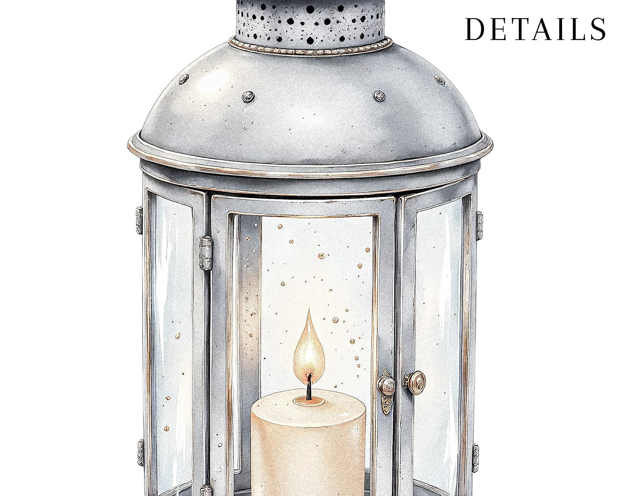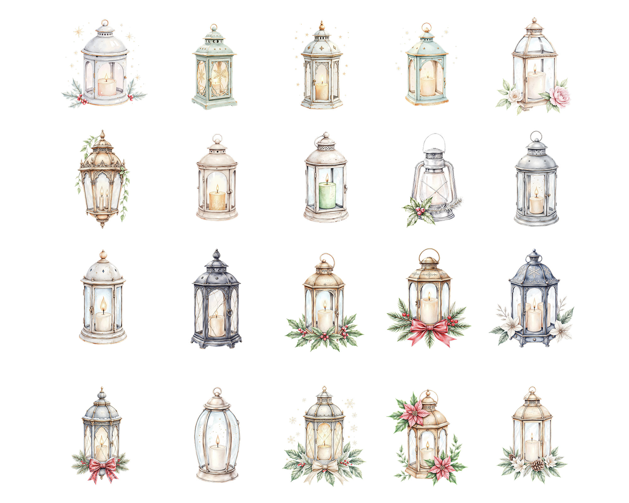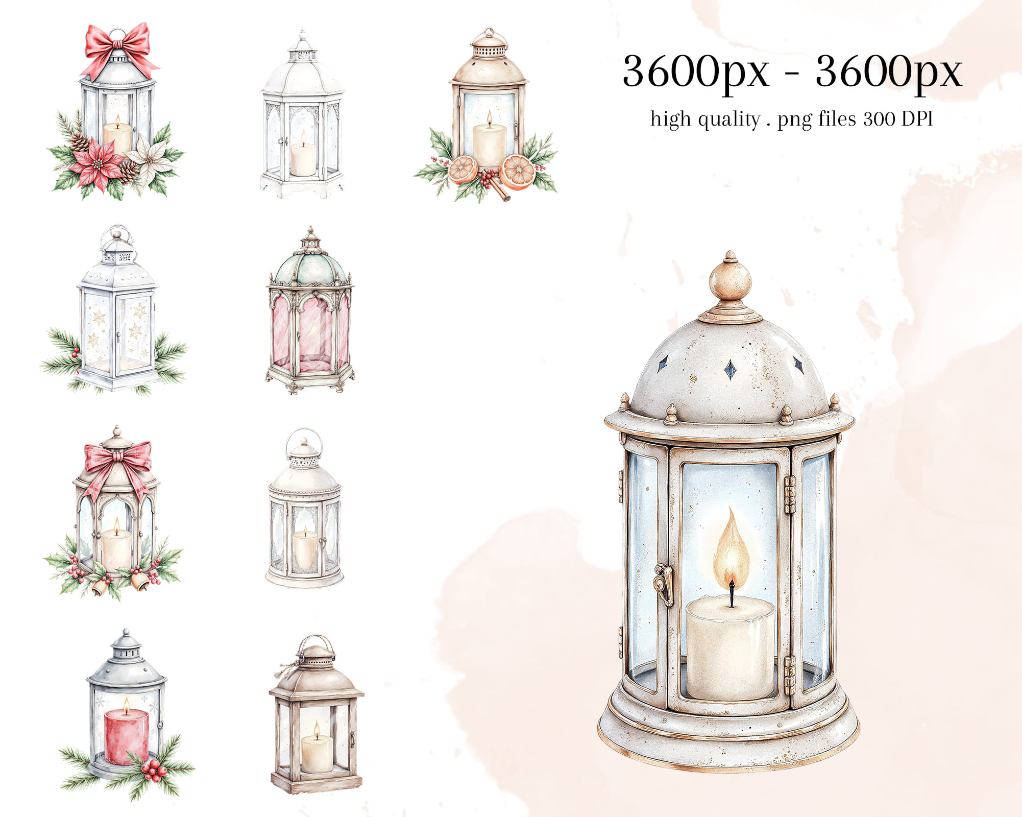 Vintage Lantern Clipart includes 30 elegant lantern illustrations with candles, bows, and festive details. All files are PNG format, 300 DPI, with transparent background.