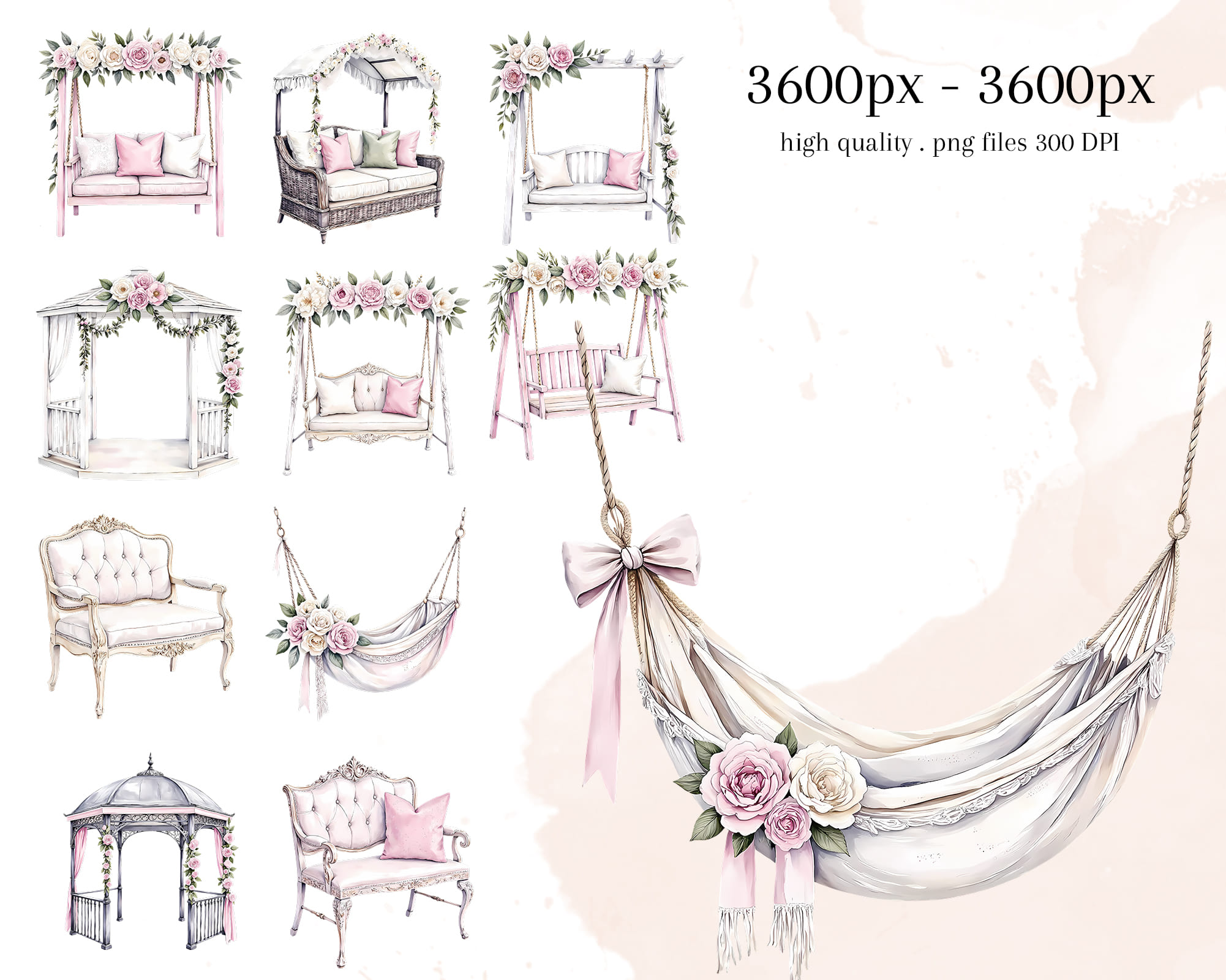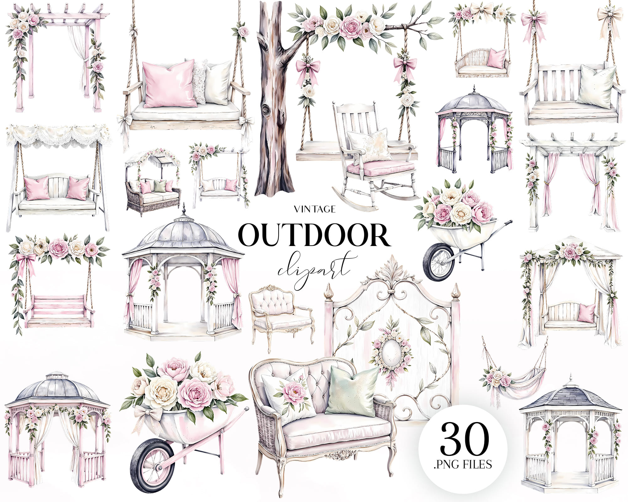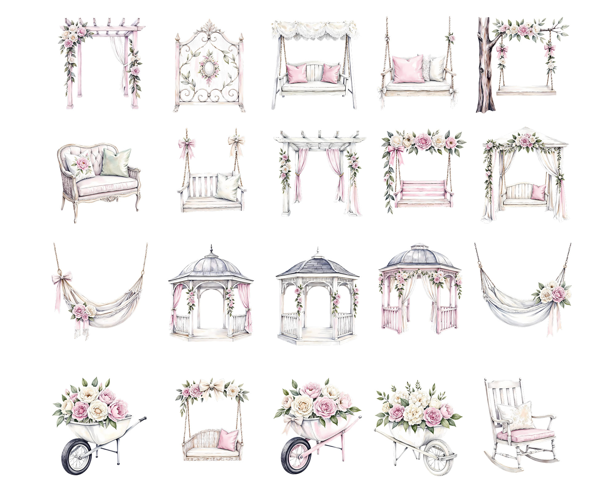 Create dreamy outdoor scenes with this Vintage Outdoor Clipart Set. Featuring 30 PNG files of gazebos, swings, pergolas, and floral garden décor in shabby chic pastel tones, this collection is ideal for invitations, garden party designs, digital scrapbooking, wedding stationery, and romantic branding projects.