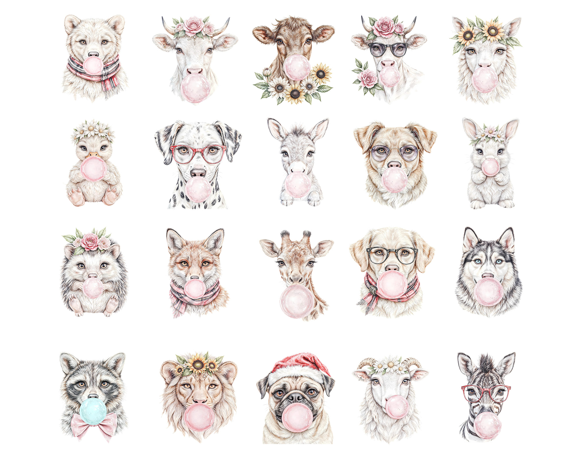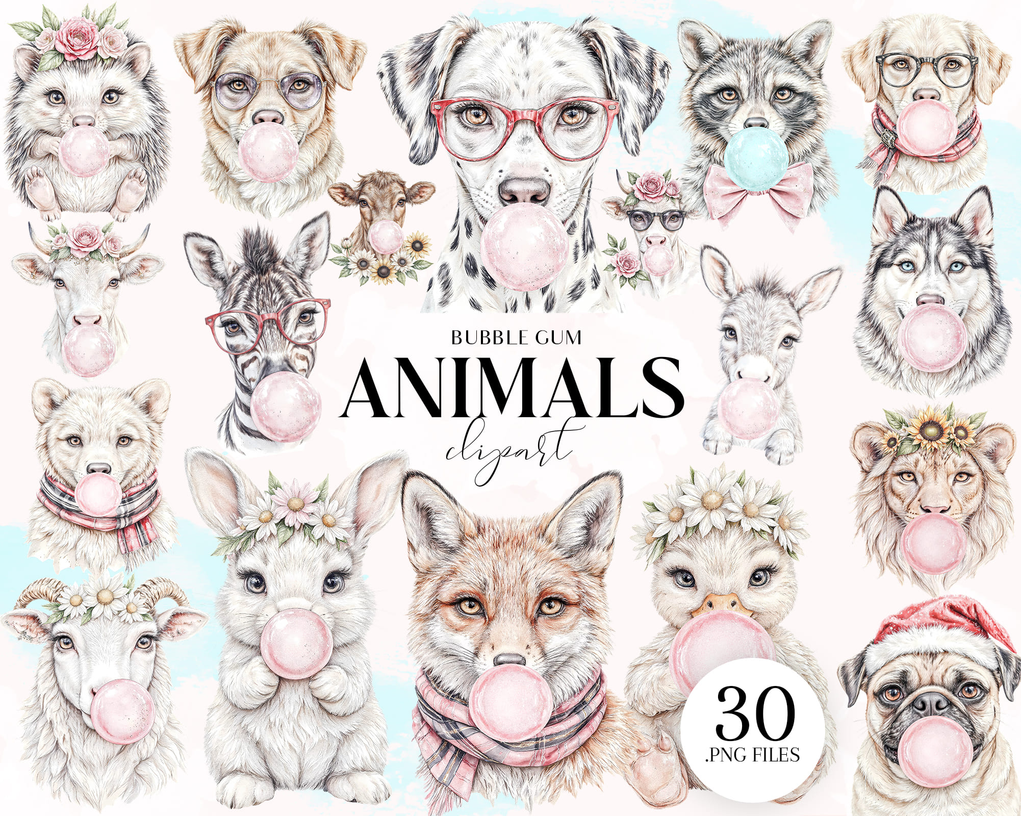 Add playful charm to your designs with this Bubble Gum Animals Clipart Set 🐶🐮. This pack includes 20 hand-painted watercolor PNGs featuring adorable animals blowing bubble gum, some with glasses and floral crowns. Perfect for kids’ room decor, t-shirt designs, stickers, invitations, and sublimation projects.