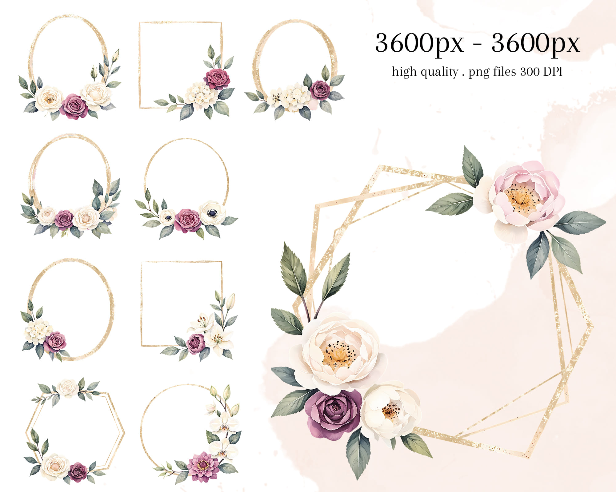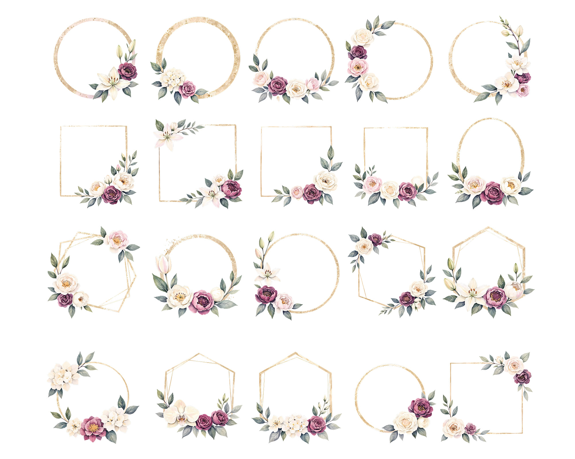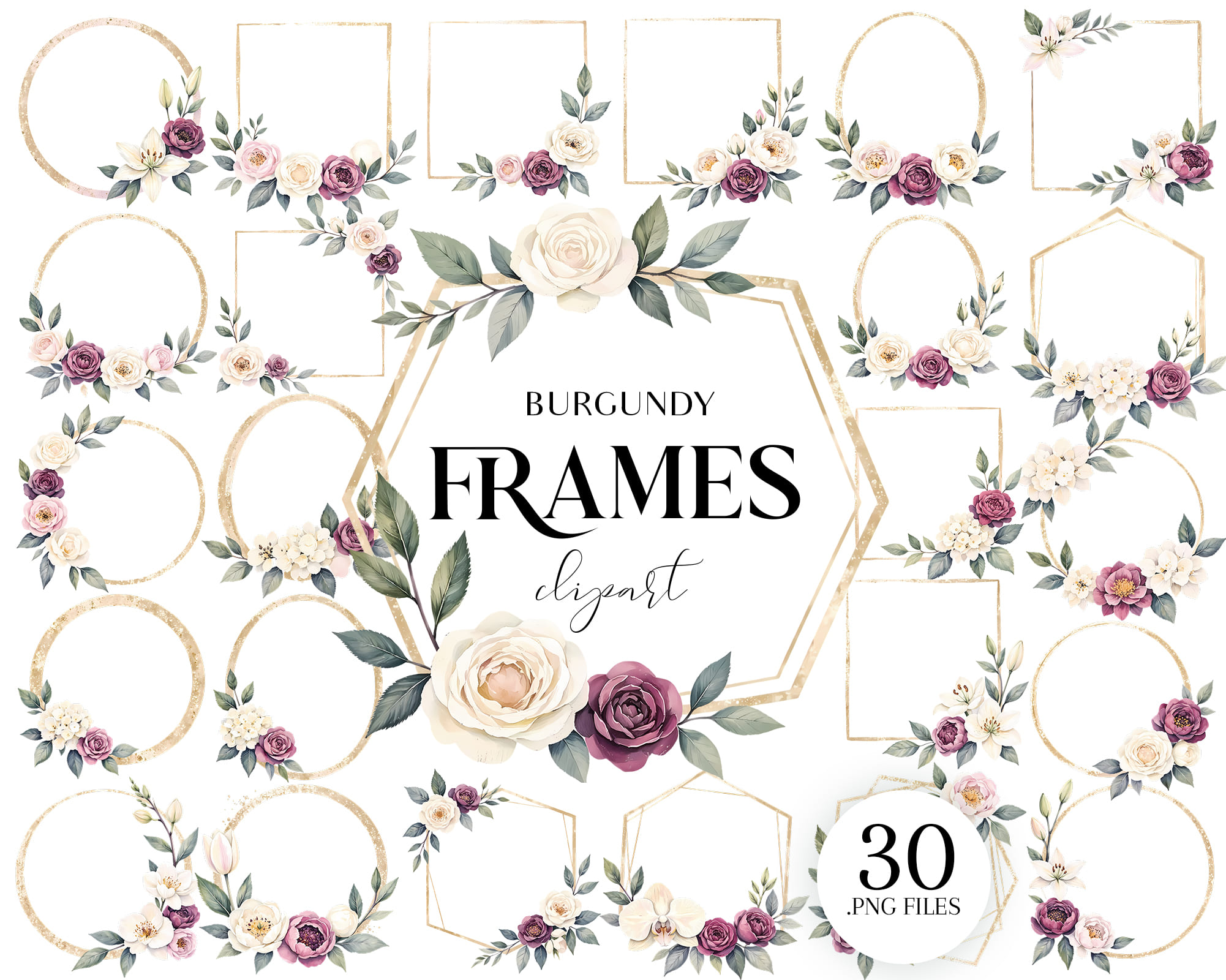 Bring sophistication to your projects with this Burgundy Frames Clipart Set 🌹✨. Featuring 30 PNG illustrations of floral geometric frames with roses, peonies, and greenery, this set is perfect for wedding invitations, logos, stationery, sublimation, and elegant branding.