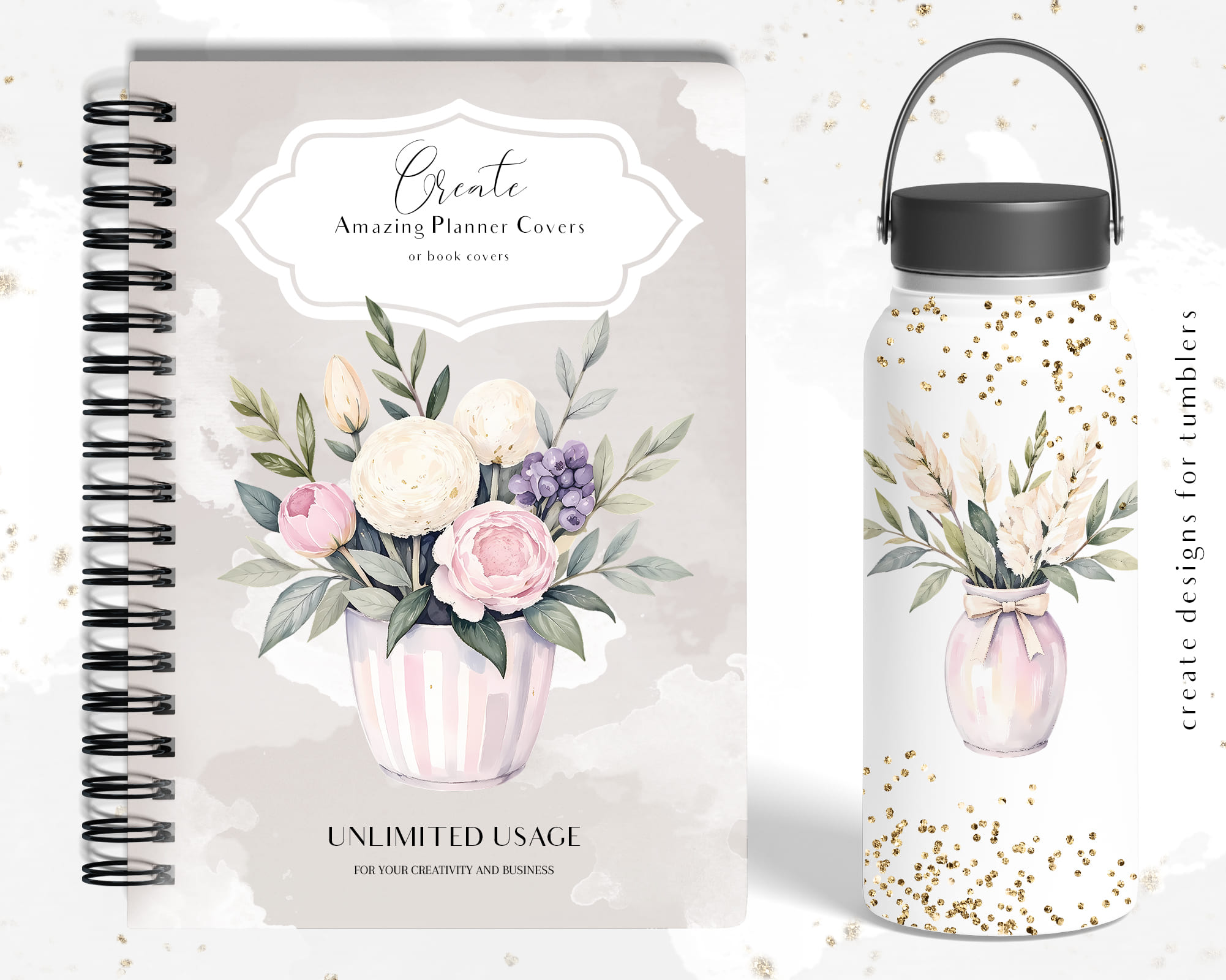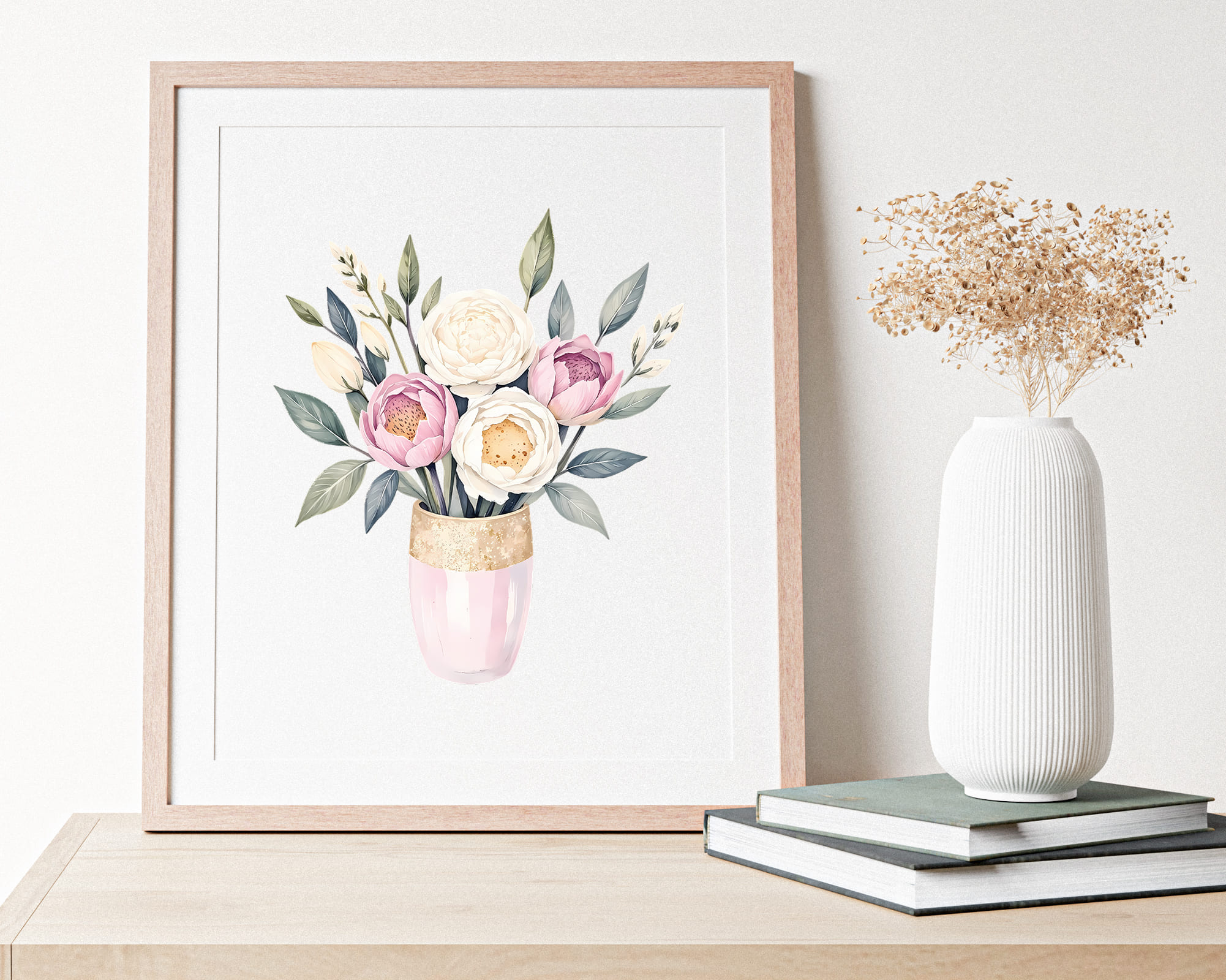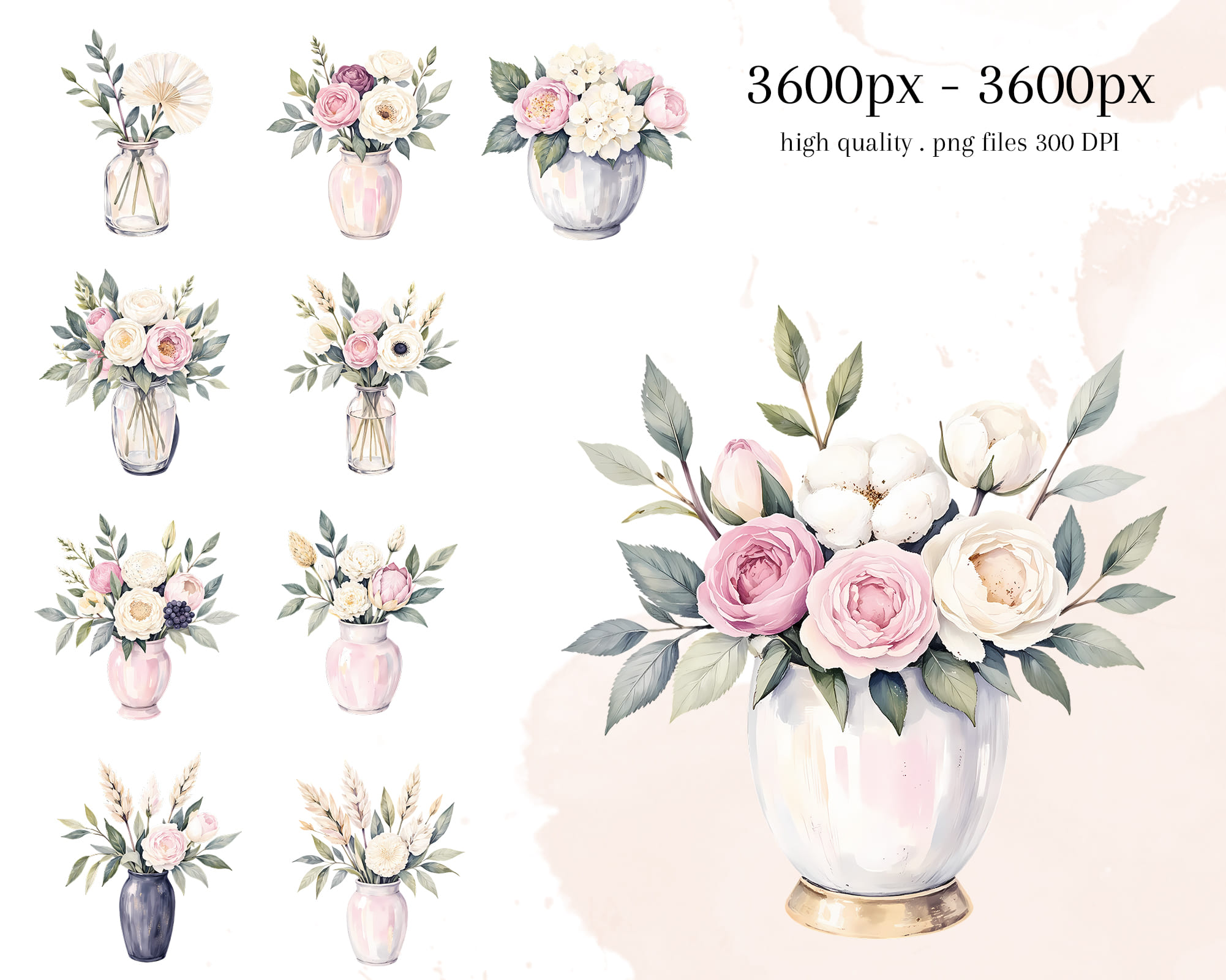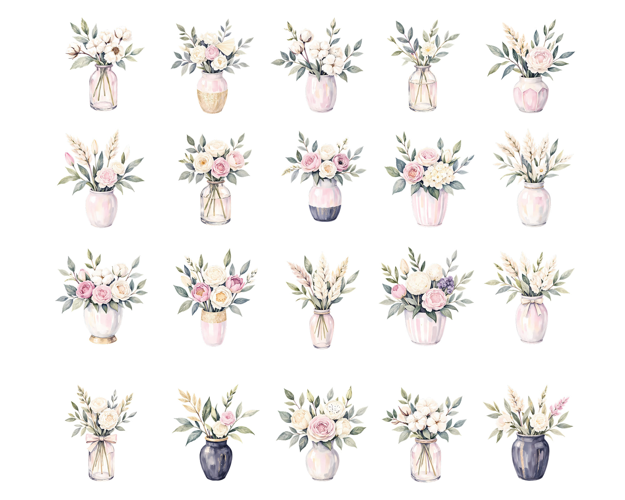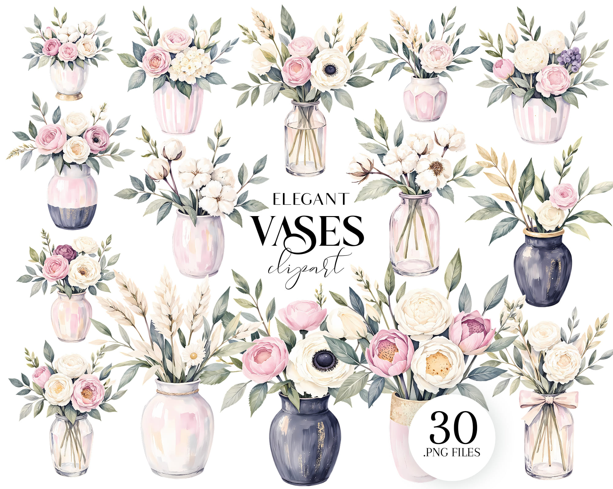 This Elegant Vases Clipart Set 💐✨ features 30 PNG illustrations of pastel bouquets in stylish vases. Perfect for wedding invitations, branding, wall art, sublimation, stickers, and home decor designs.