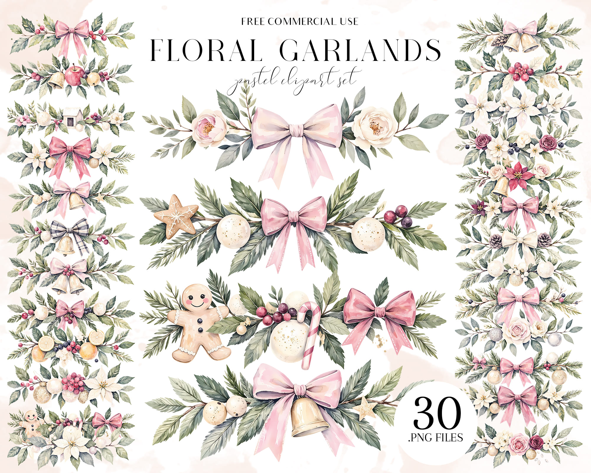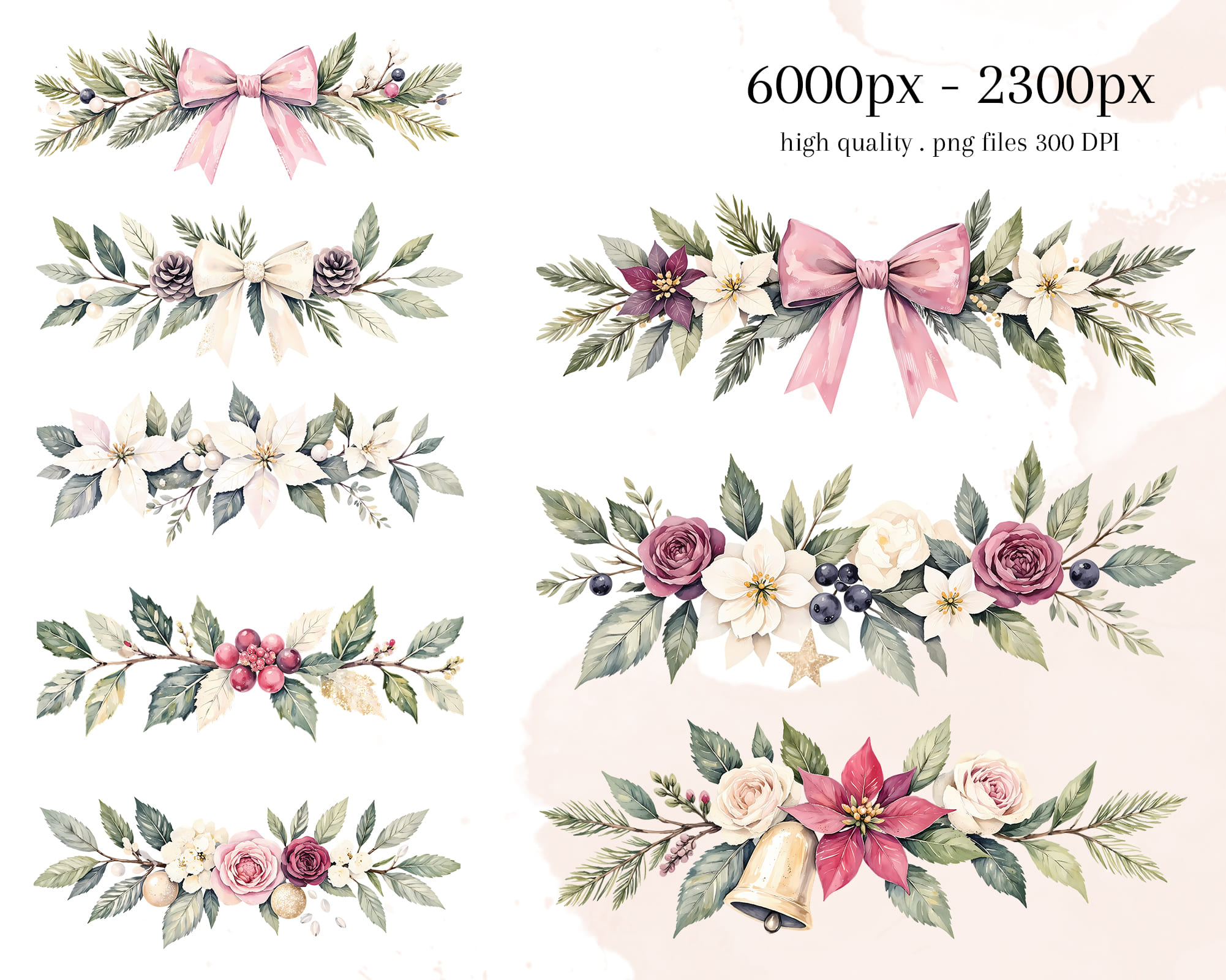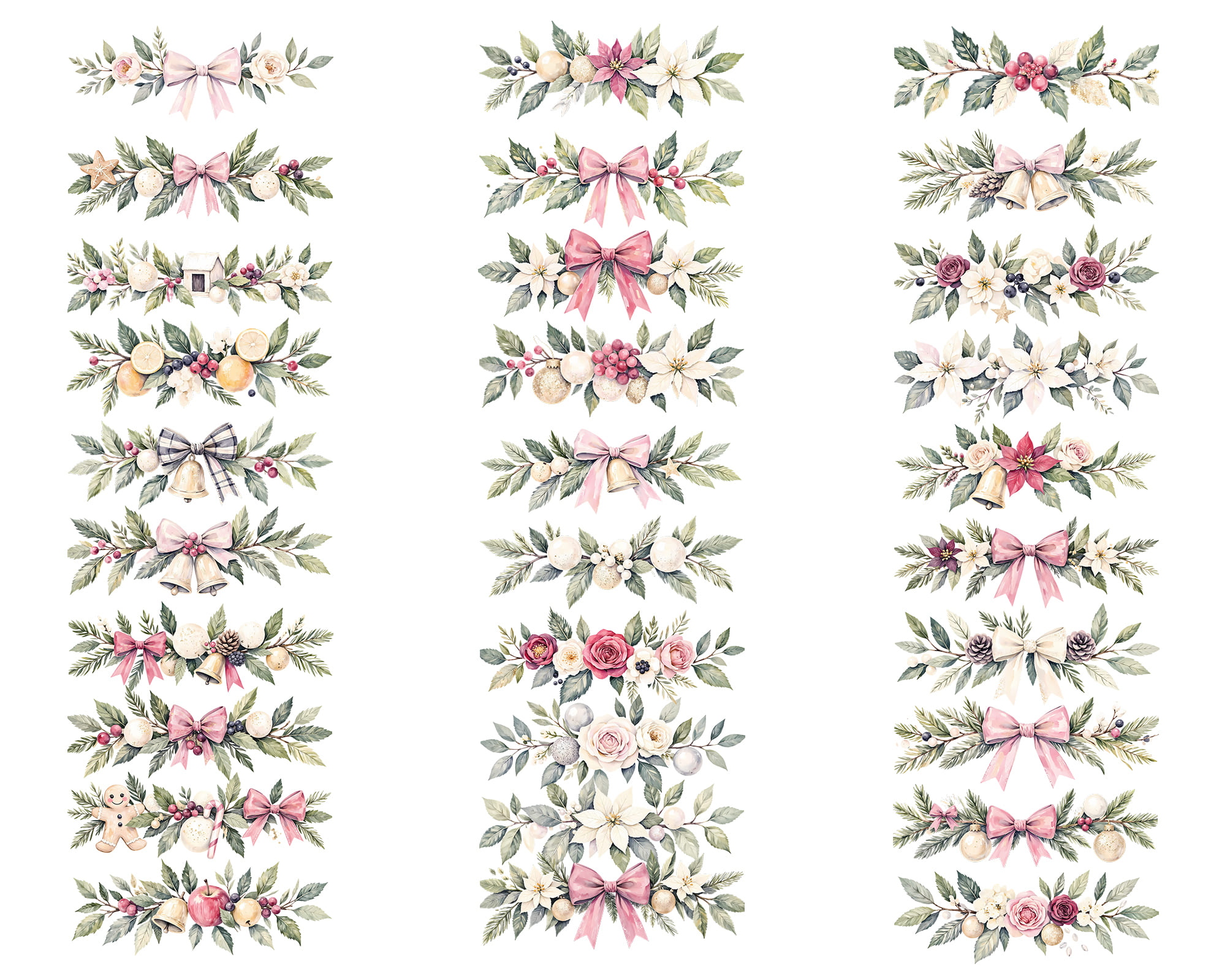 Festive and elegant, this Floral Garlands Clipart Set 🎀✨ includes 30 high-resolution PNG illustrations of bows, florals, bells, gingerbread, and greenery. Perfect for Christmas cards, invitations, winter crafts, sublimation, and scrapbooking.