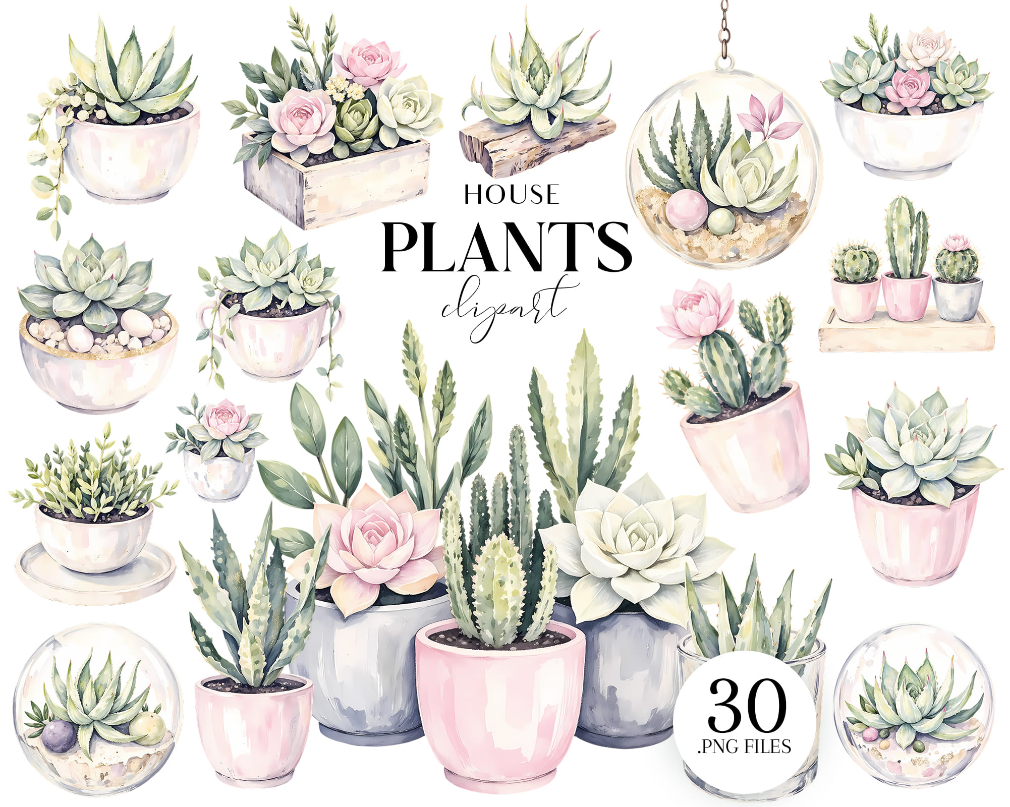 Bring greenery into your designs with this Houseplants Clipart Set 🌿✨. Includes 30 pastel PNG illustrations of succulents, potted plants, floral boxes, and terrariums. Perfect for planners, stickers, wall art, invitations, sublimation, and eco-friendly projects.