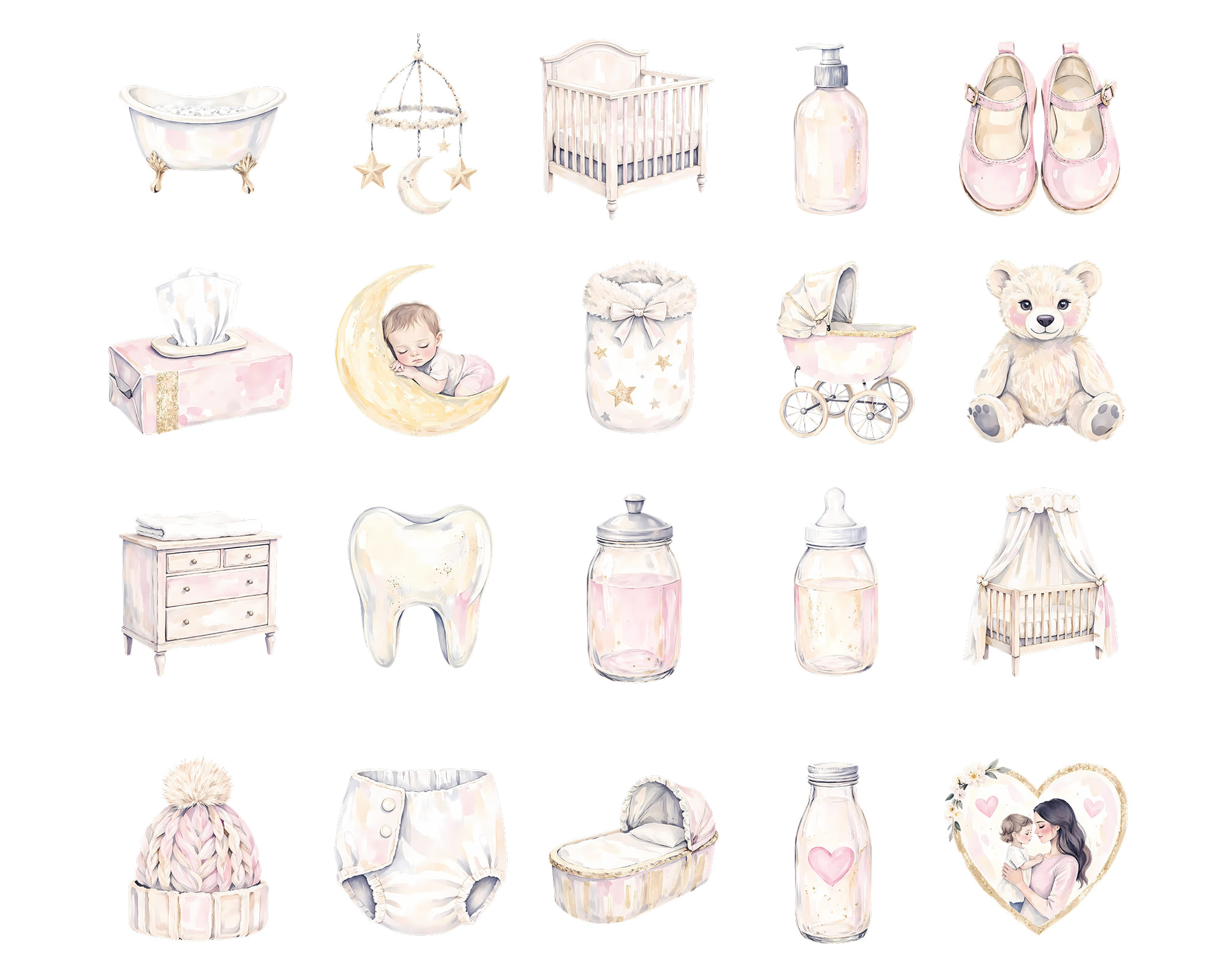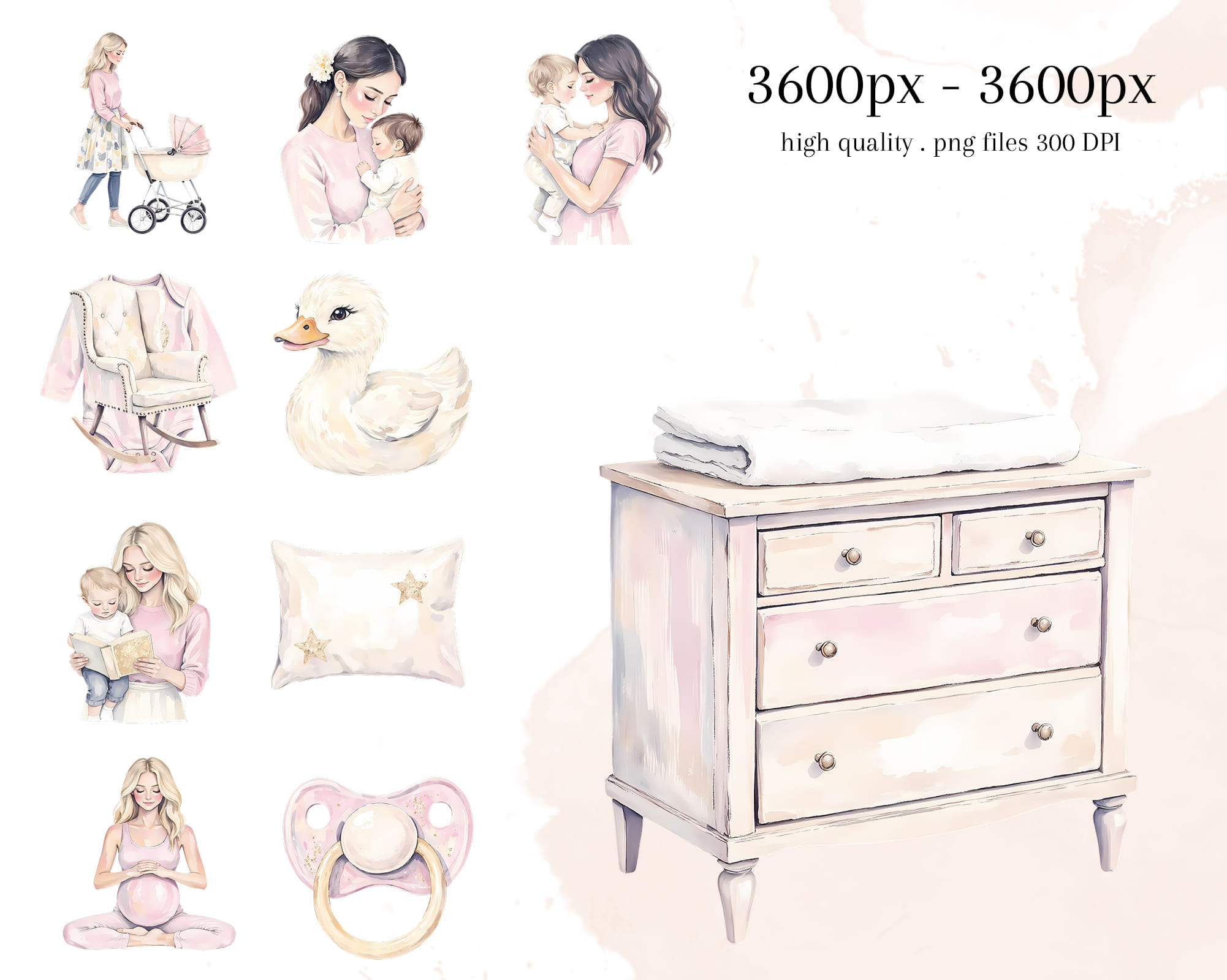 Celebrate the sweetness of motherhood with this Newborn Clipart Set 👶💖. This collection includes 30 high-resolution PNGs with mother & baby, strollers, cribs, baby shoes, and delicate nursery details. Perfect for baby shower invitations, birth announcements, scrapbooking, and nursery decor.