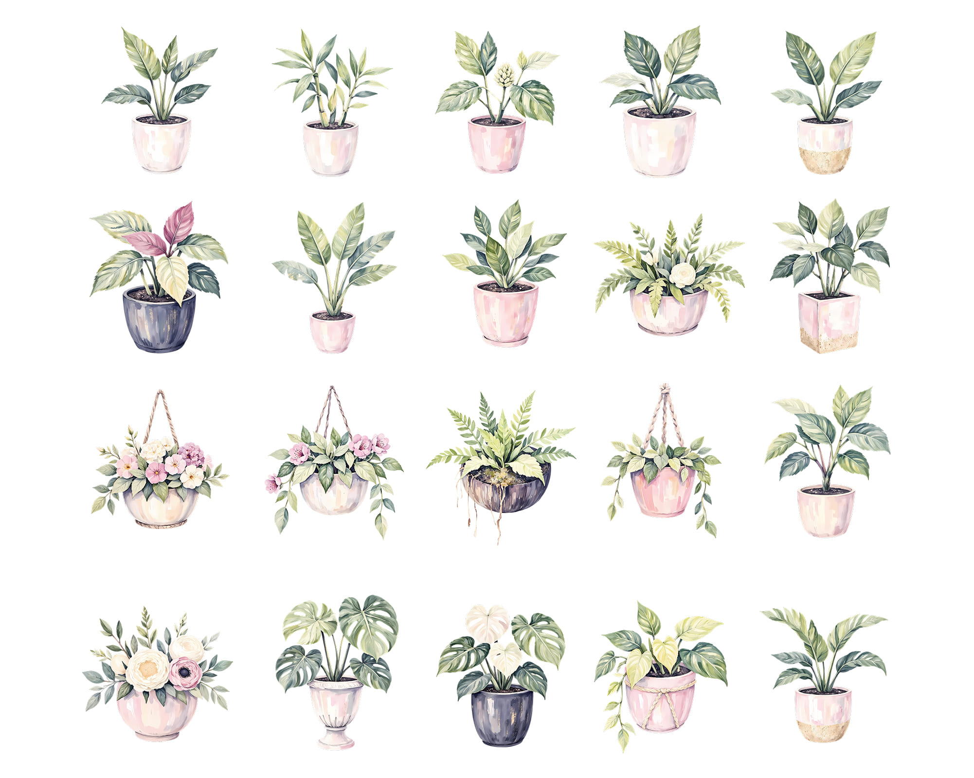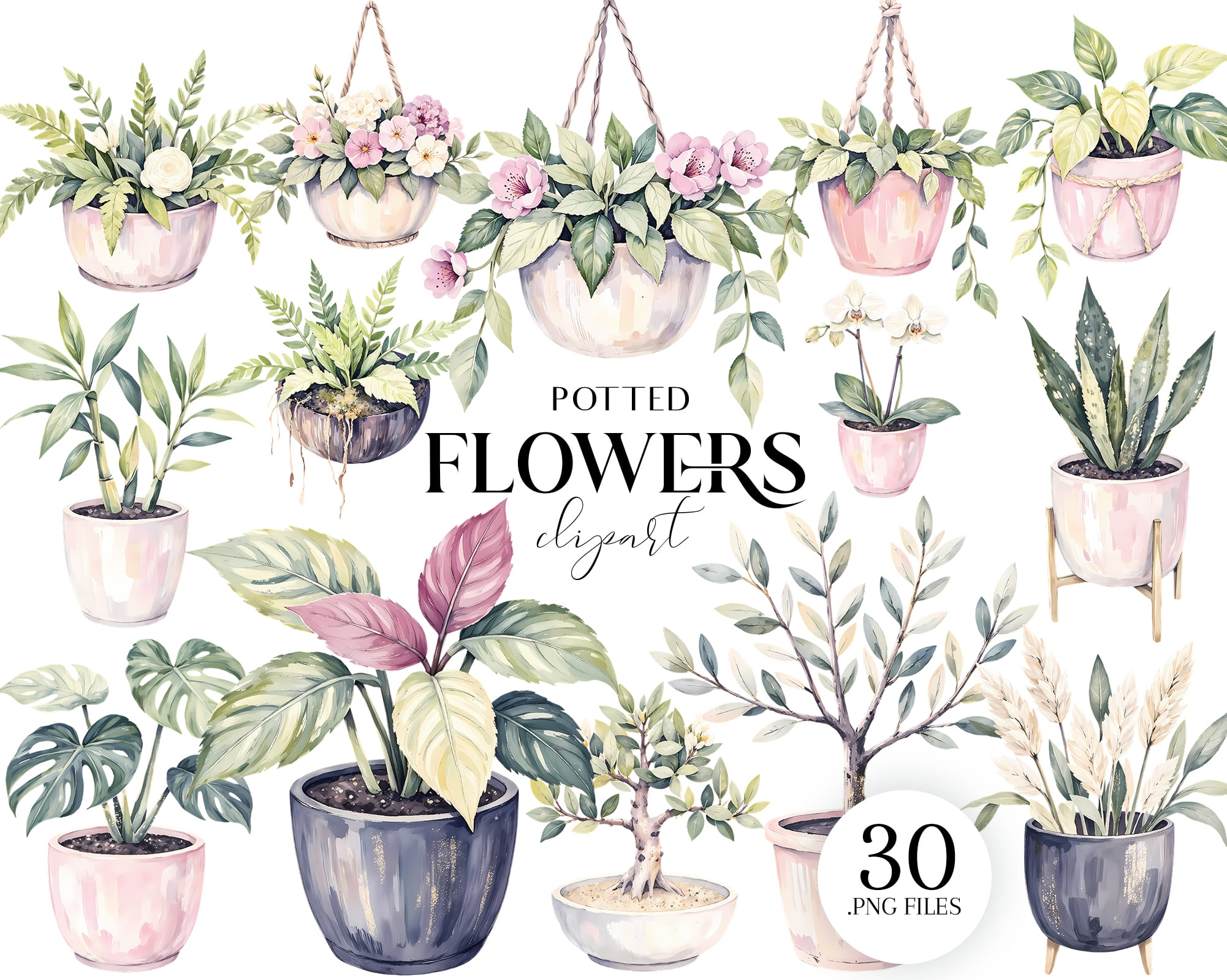 Brighten your projects with this Potted Flowers Clipart Set 🌺🌿. Includes 30 PNG illustrations of pastel plants and decorative flower pots. Perfect for scrapbooking, invitations, branding, stickers, and eco-friendly sublimation projects.