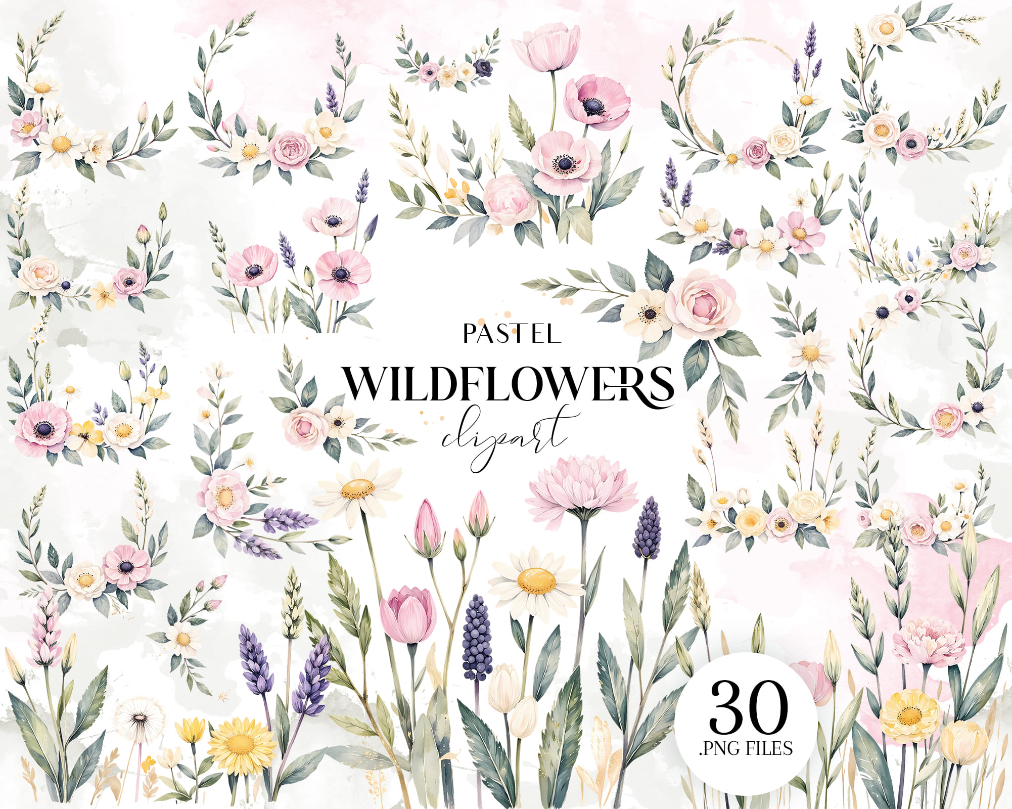 Add a natural touch to your projects with this Wildflowers Clipart Set 🌿🌸. Featuring 30 watercolor PNGs of delicate flowers including daisies, tulips, lavender, and more. Perfect for invitations, wall art, sublimation, stickers, and scrapbooking.