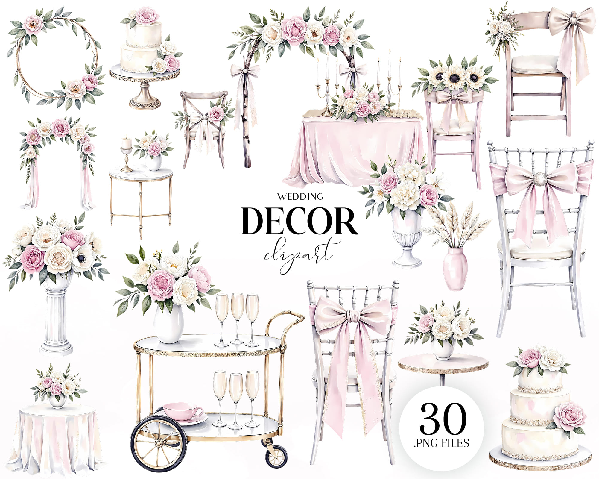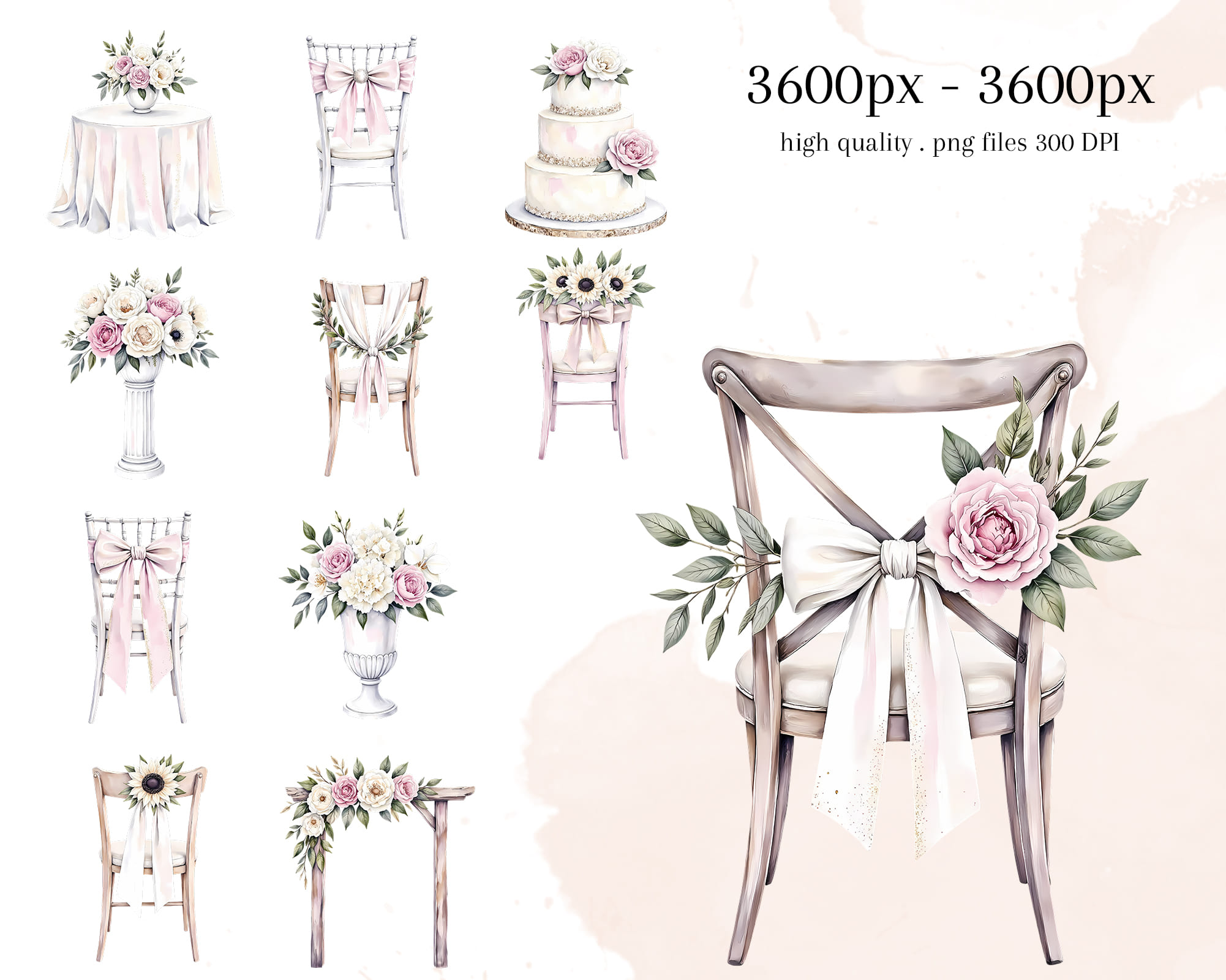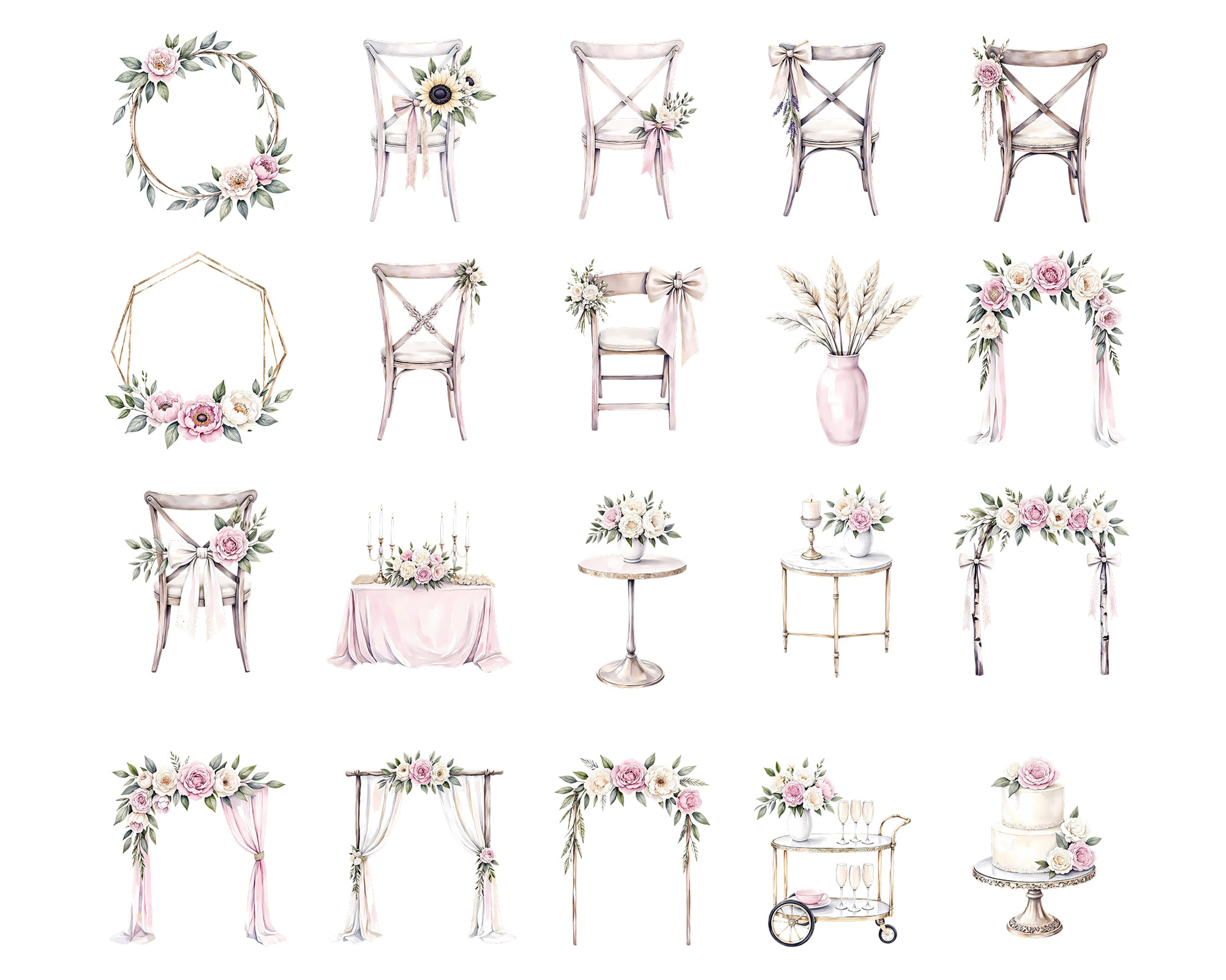 Elegant pastel Wedding Decor clipart set featuring decorated chairs, sunflowers, bows, floral wreaths, and vases. Perfect for wedding invitations, bridal shower crafts, planners, scrapbooking, and event design. Includes 30 PNG files with transparent backgrounds.